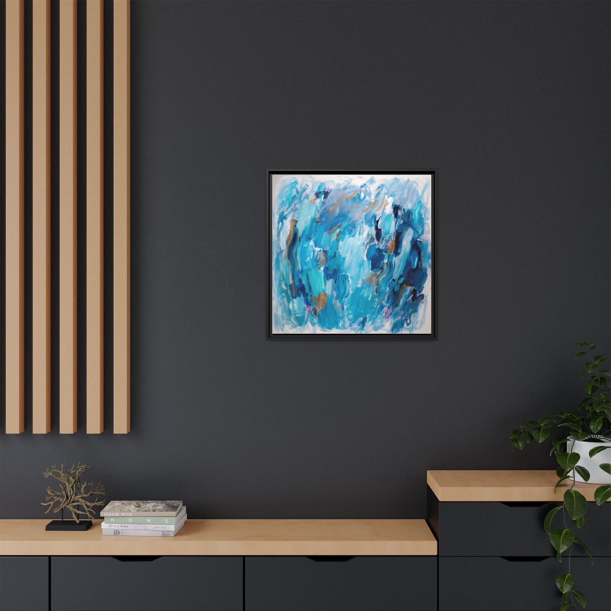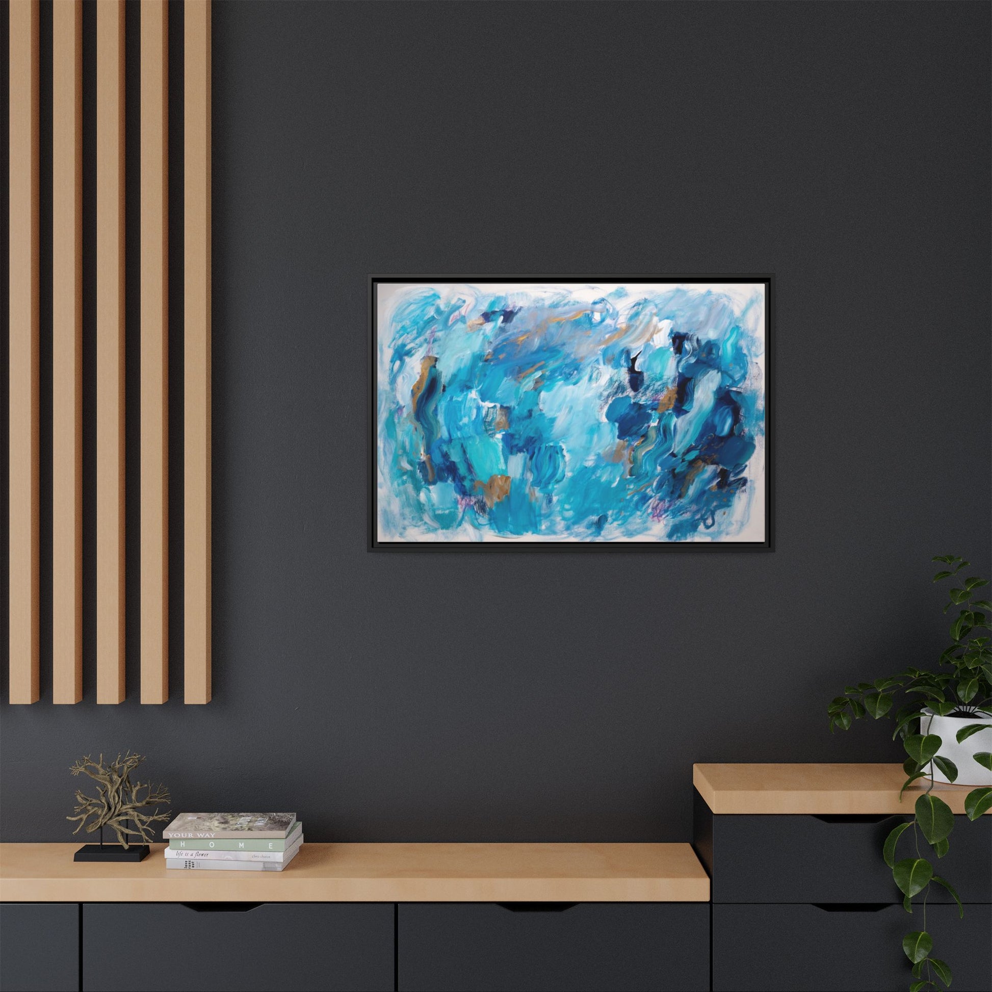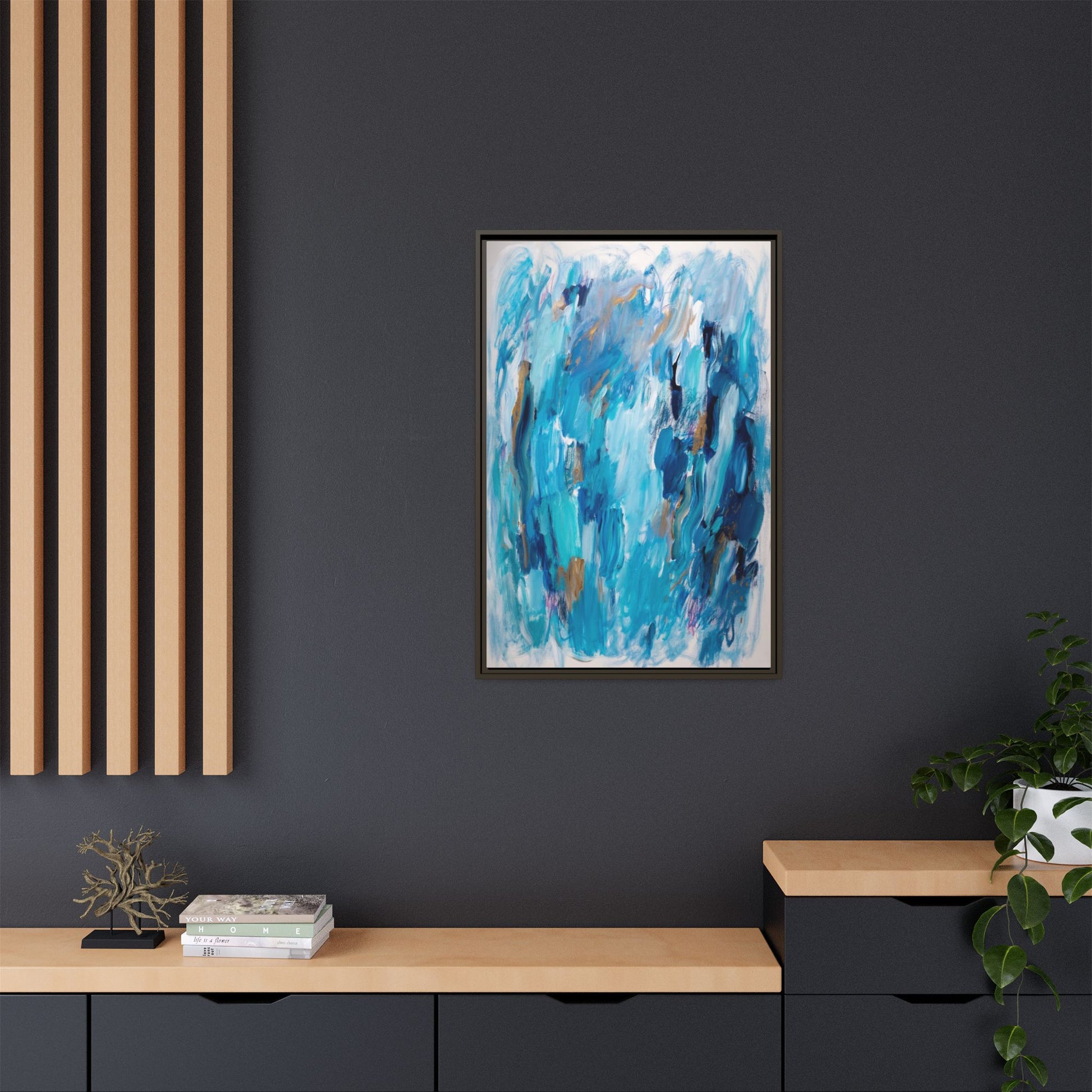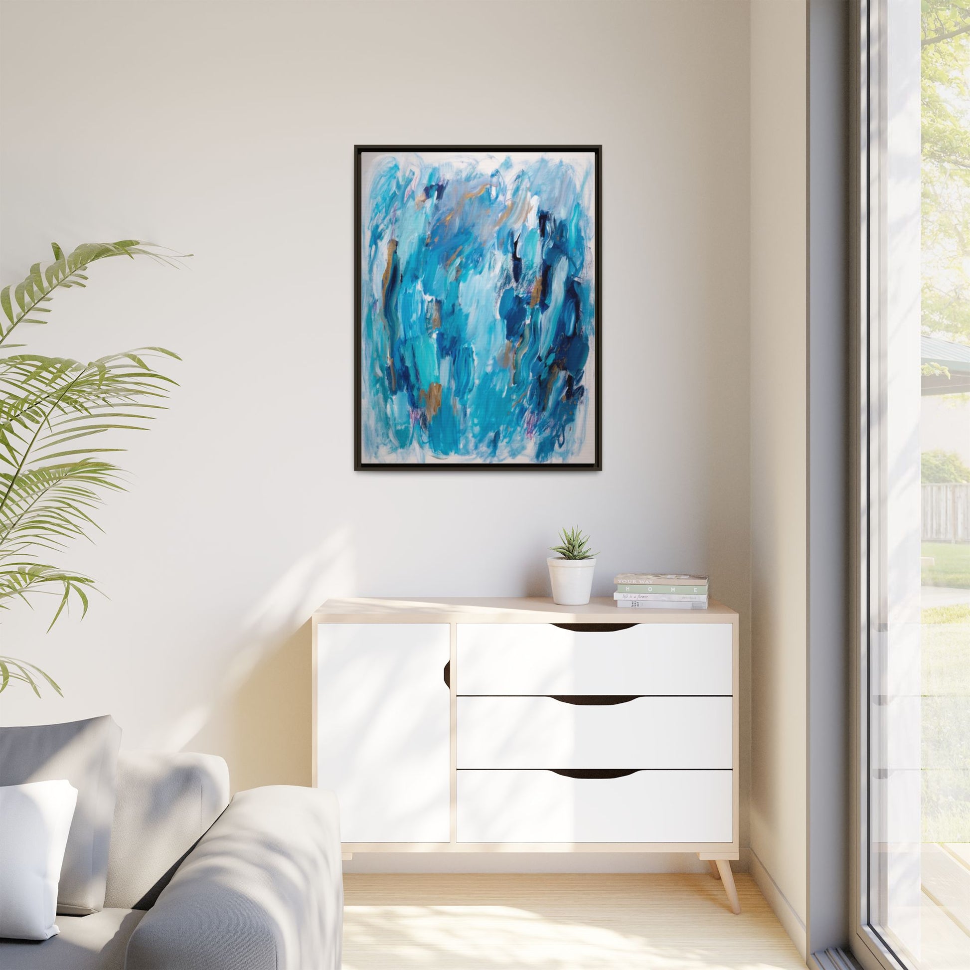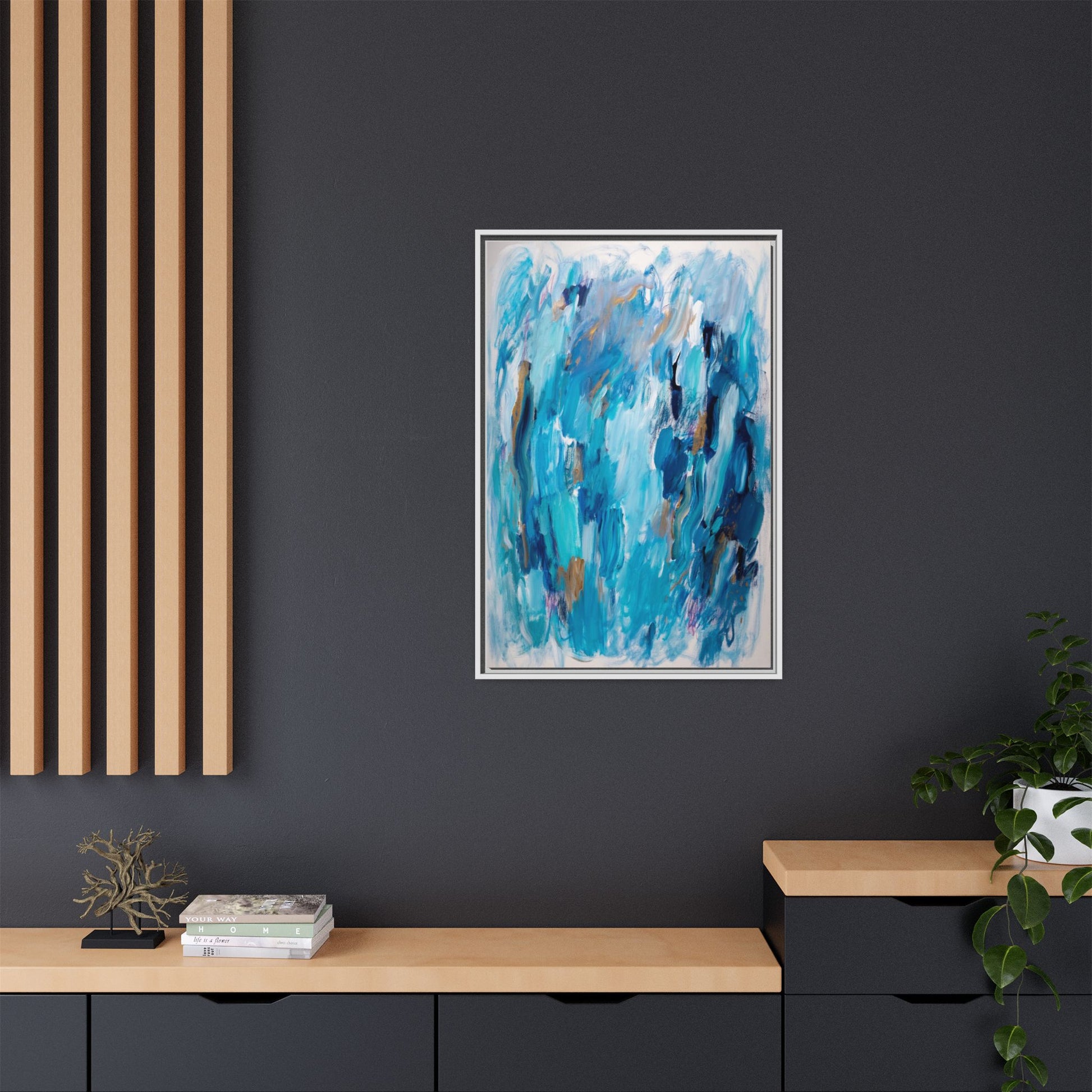 This vibrant abstract painting is a mesmerizing composition dominated by shades of blue, turquoise, and white. The artwork features fluid, dynamic brushstrokes that create a sense of movement and energy across the canvas. Splashes of golden and bronze tones peek through the predominantly cool-toned palette, adding depth and contrast to the piece. The painting's style appears to be gestural and spontaneous, with sweeping, organic shapes that seem to flow and blend into one another. The texture is rich and layered, with visible brush and palette knife marks that create a sense of dimensionality and emotional intensity.
