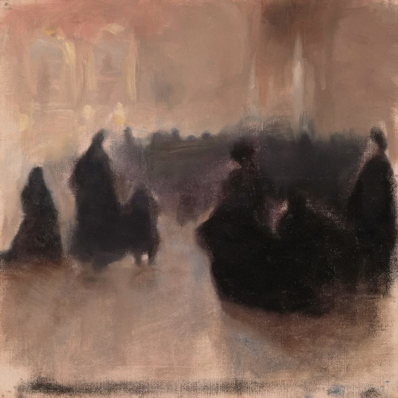 Blurred silhouettes emerge in a hazy, ethereal space, evoking a feeling of mystery and quiet introspection.