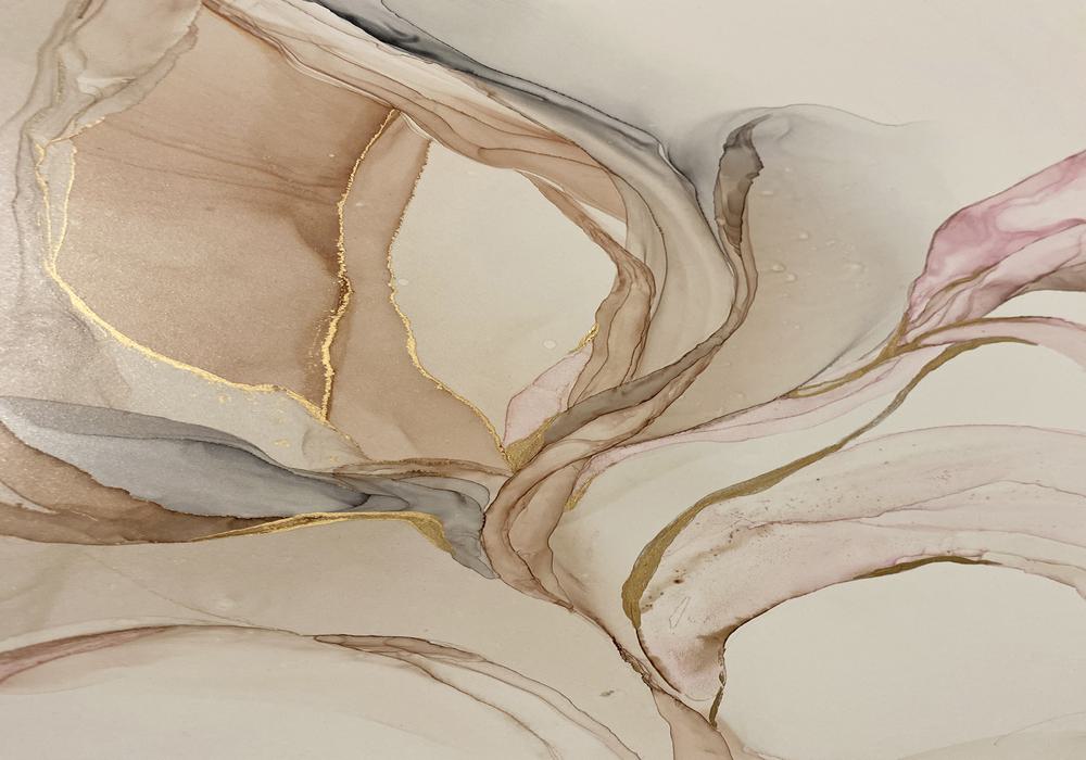 Gentle flows of translucent waves and delicate golden veins create a serene dance on canvas, whispering of nature's grace and elegance.