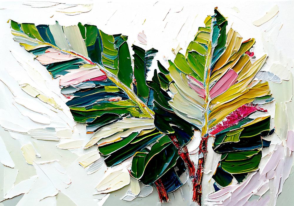 An exploration of nature's exuberance, vibrant leaves burst with life against a textured backdrop, capturing the dance of color and form.
