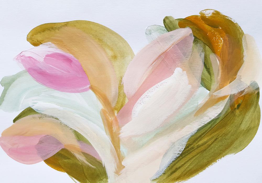 Swirling hues of muted greens and gentle pinks dance in a harmonious symphony, capturing the essence of nature's gentle caress.