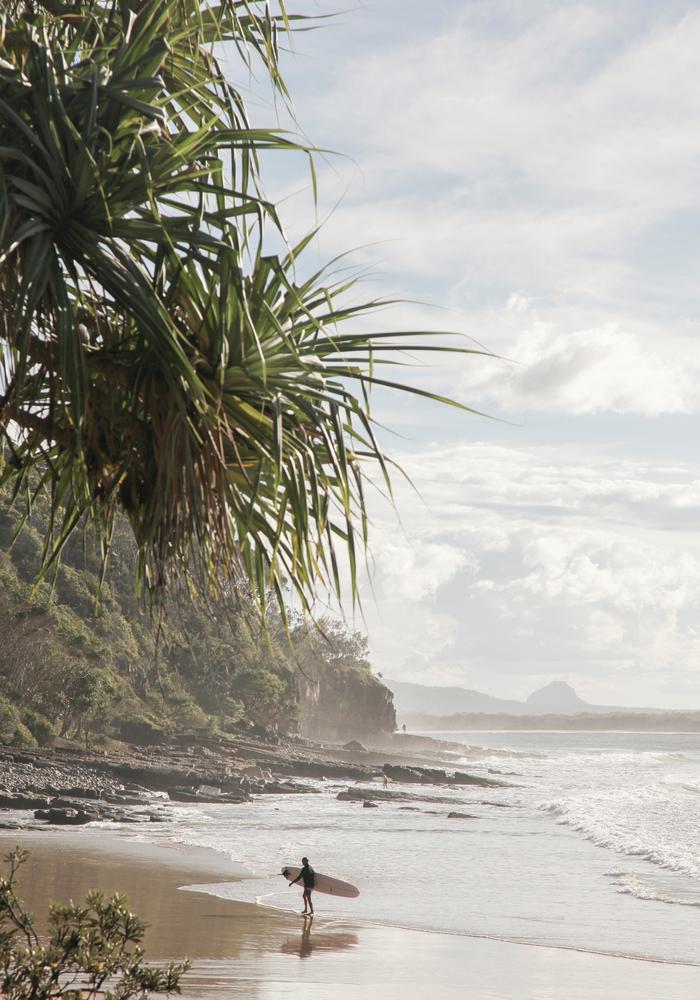A solitary figure stands at the shoreline, a world where land gently meets the sea. Verdant leaves frame the scene as mist lingers in the air, evoking a sense of calm anticipation.