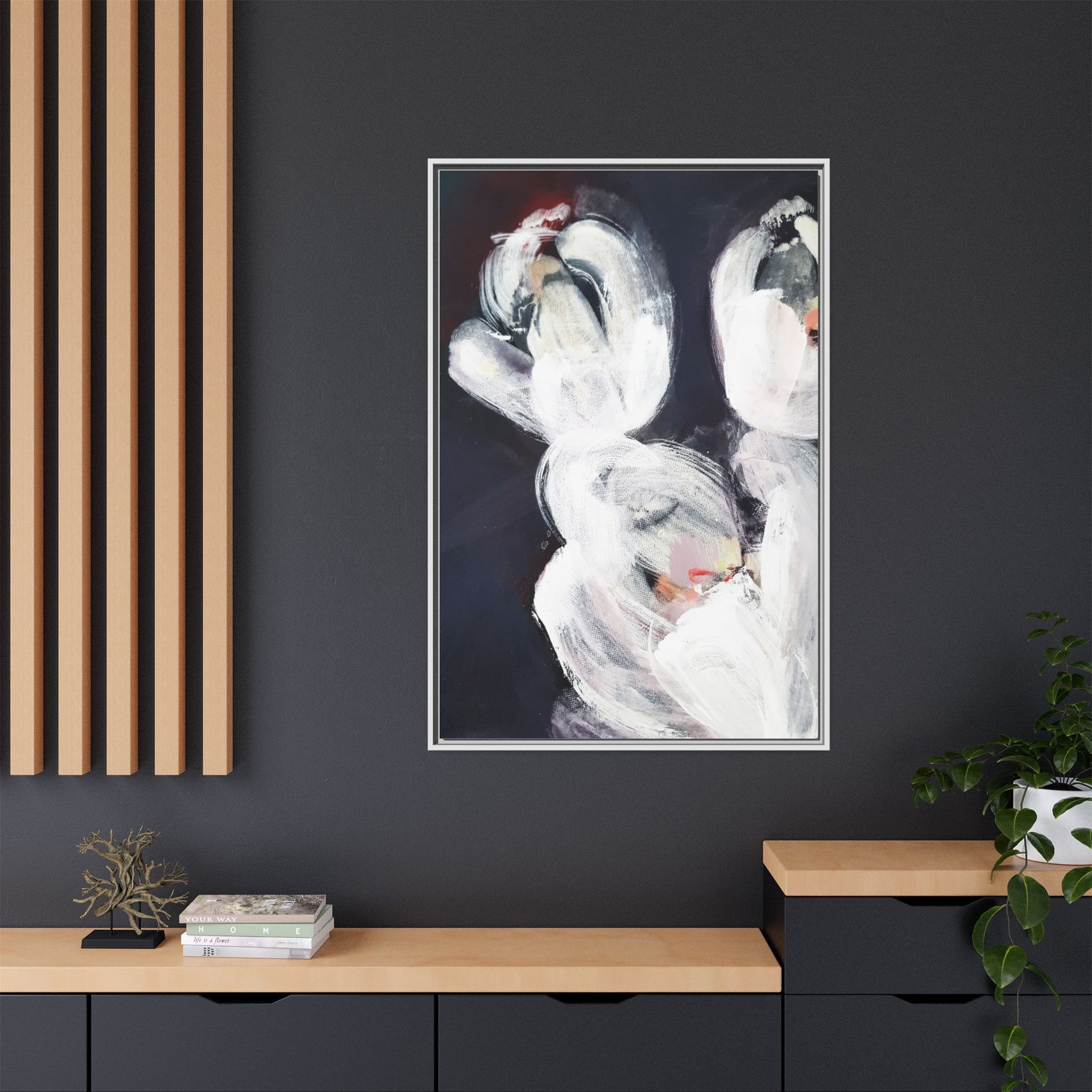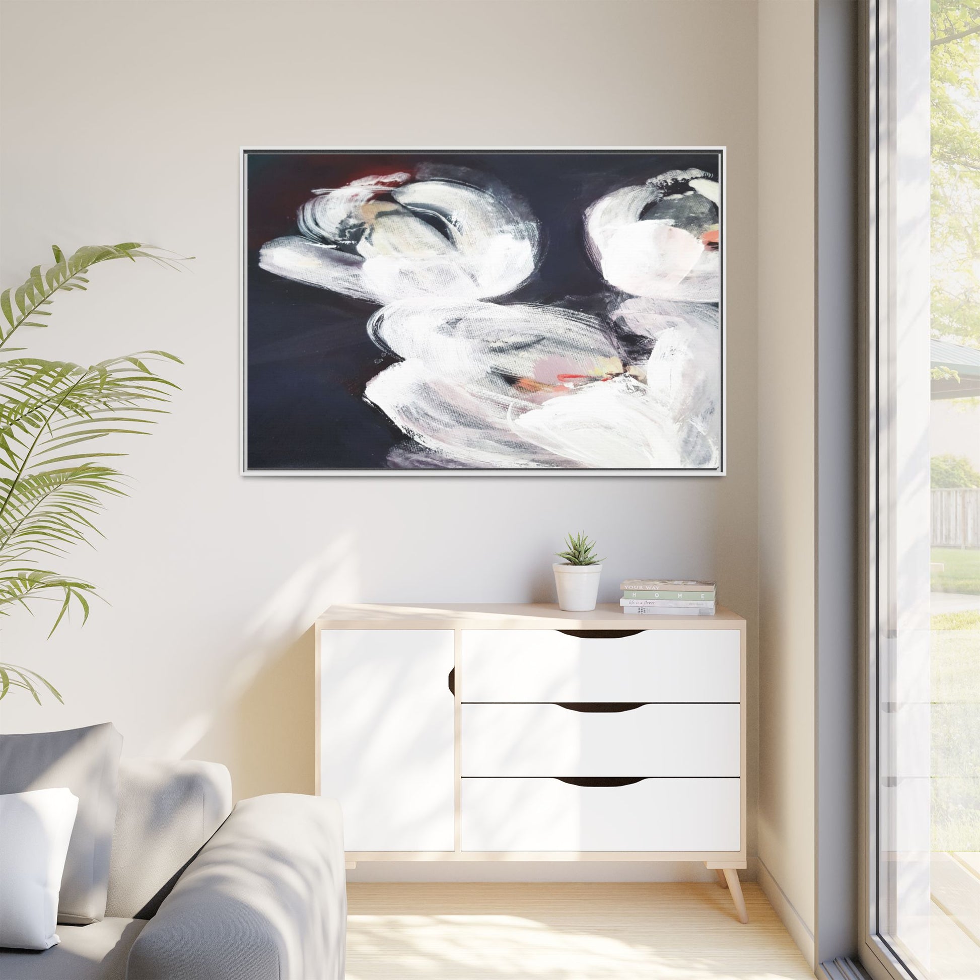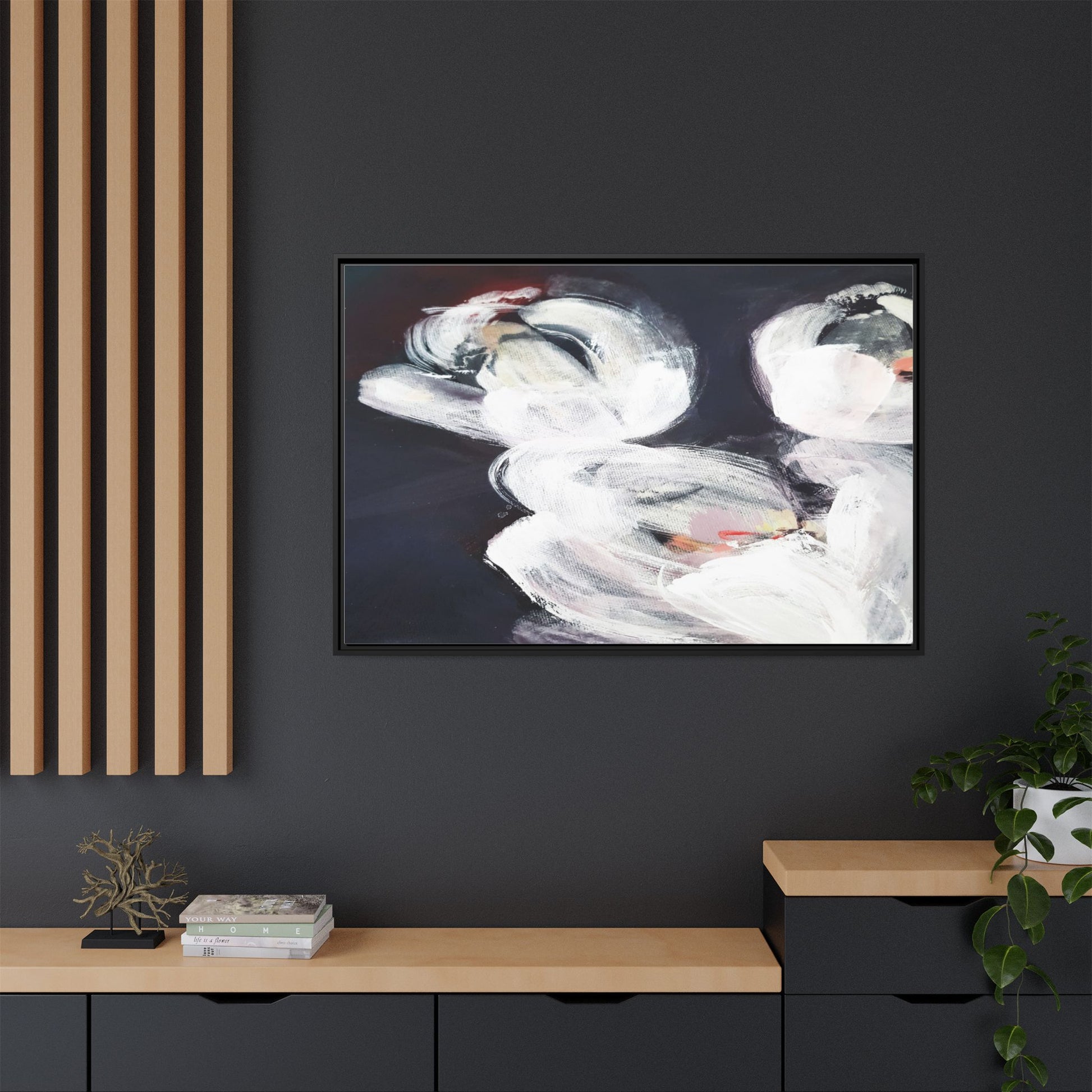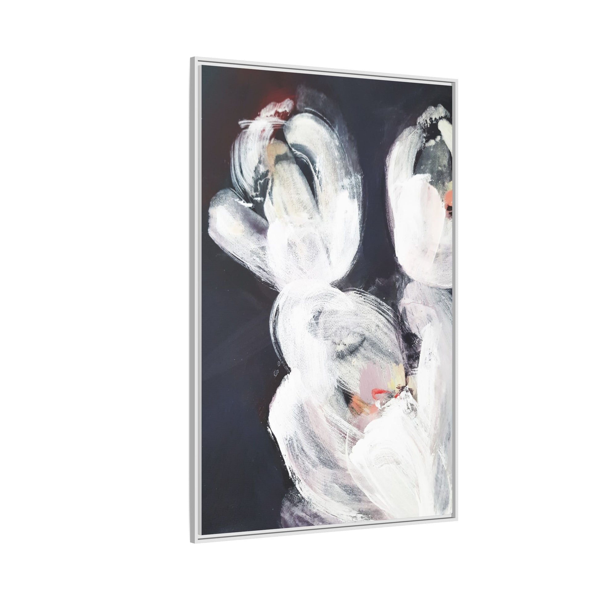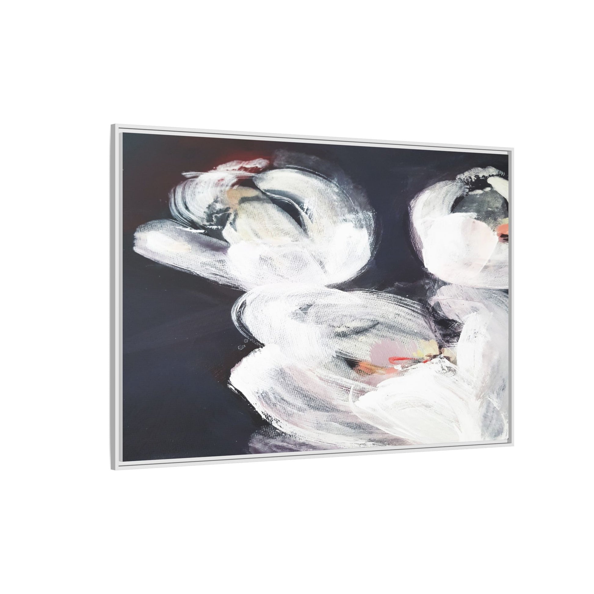 This captivating artwork is an abstract painting featuring soft, flowing white and gray forms against a dark background. The piece appears to be created using a blend of brushstrokes and blurred techniques, giving the image a sense of movement and ethereal quality. Predominantly white and light gray tones dominate the composition, with subtle hints of pale pink and red accents adding depth and intrigue. The brushwork is loose and expressive, creating organic shapes that seem to blend and flow into one another. The painting has a dreamy, almost impressionistic style that invites viewers to interpret the forms freely and emotionally.