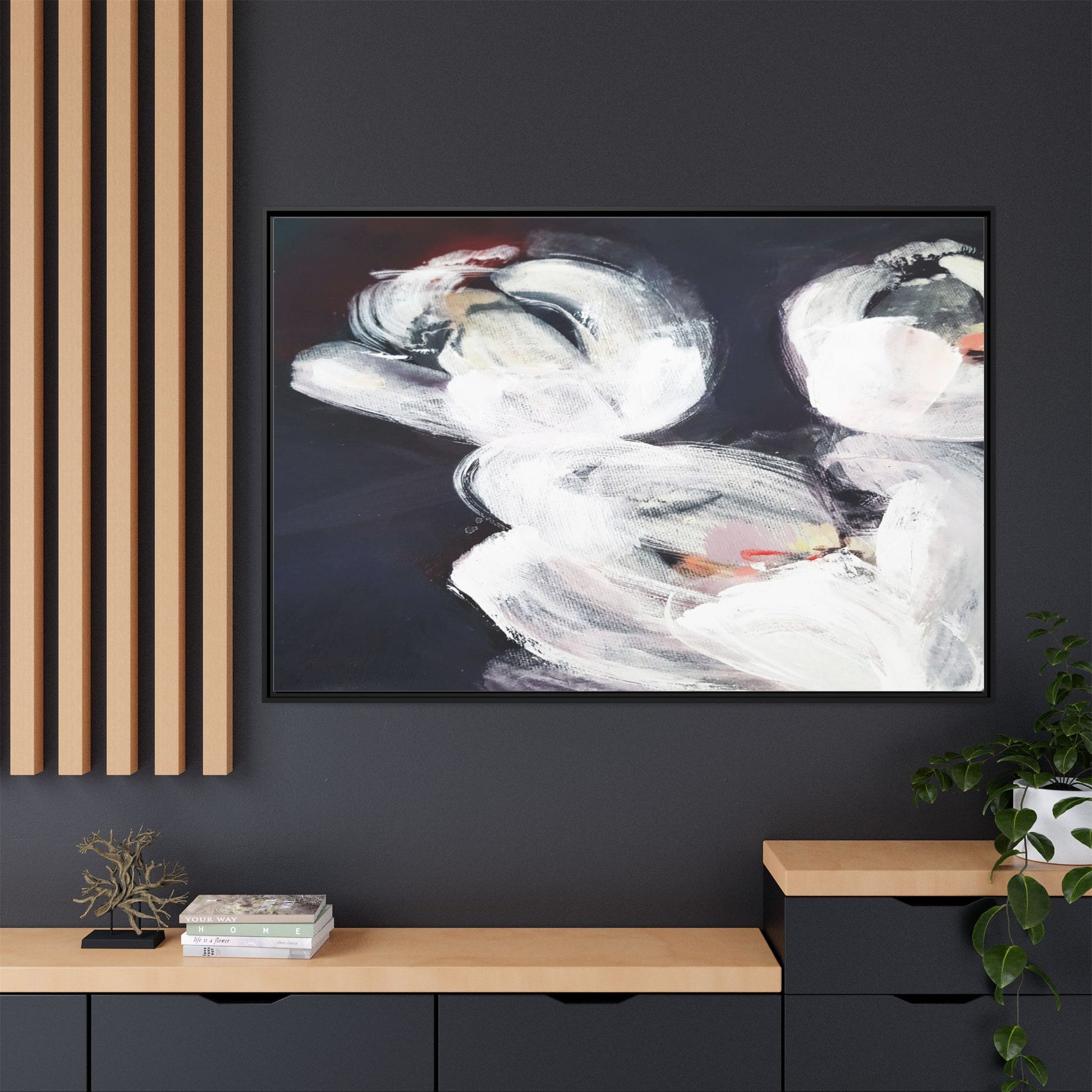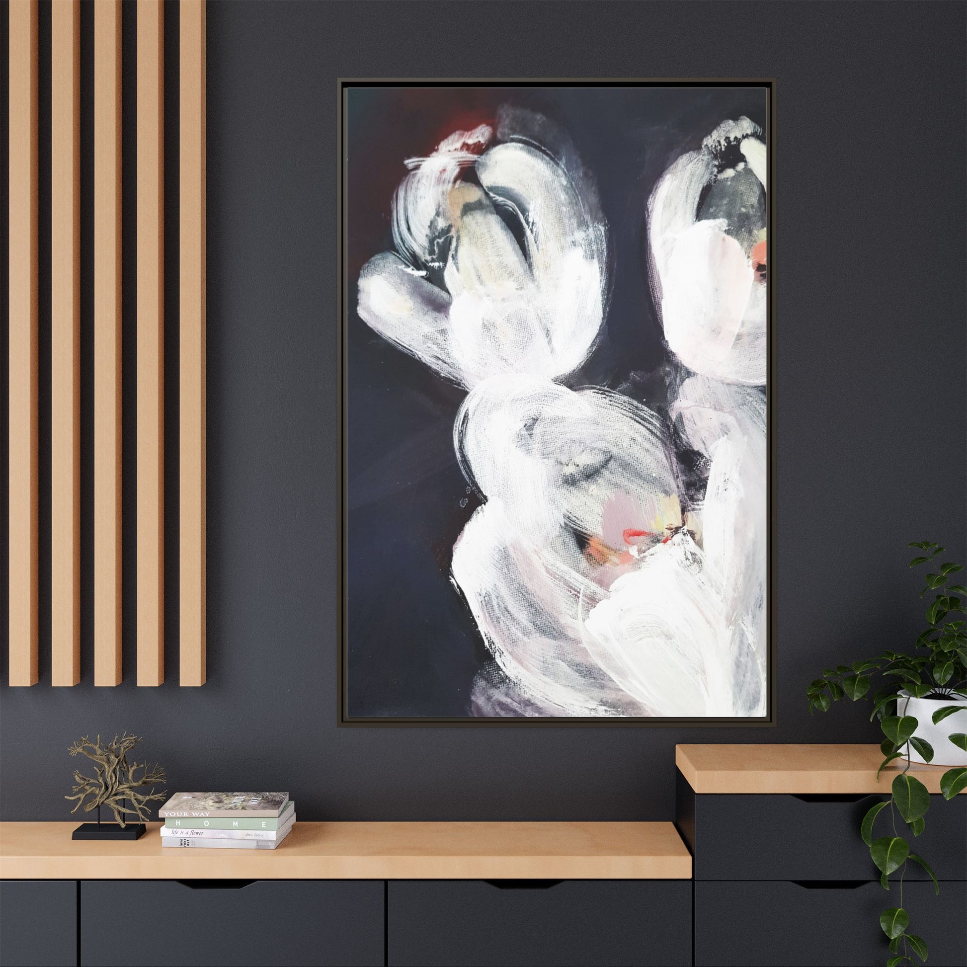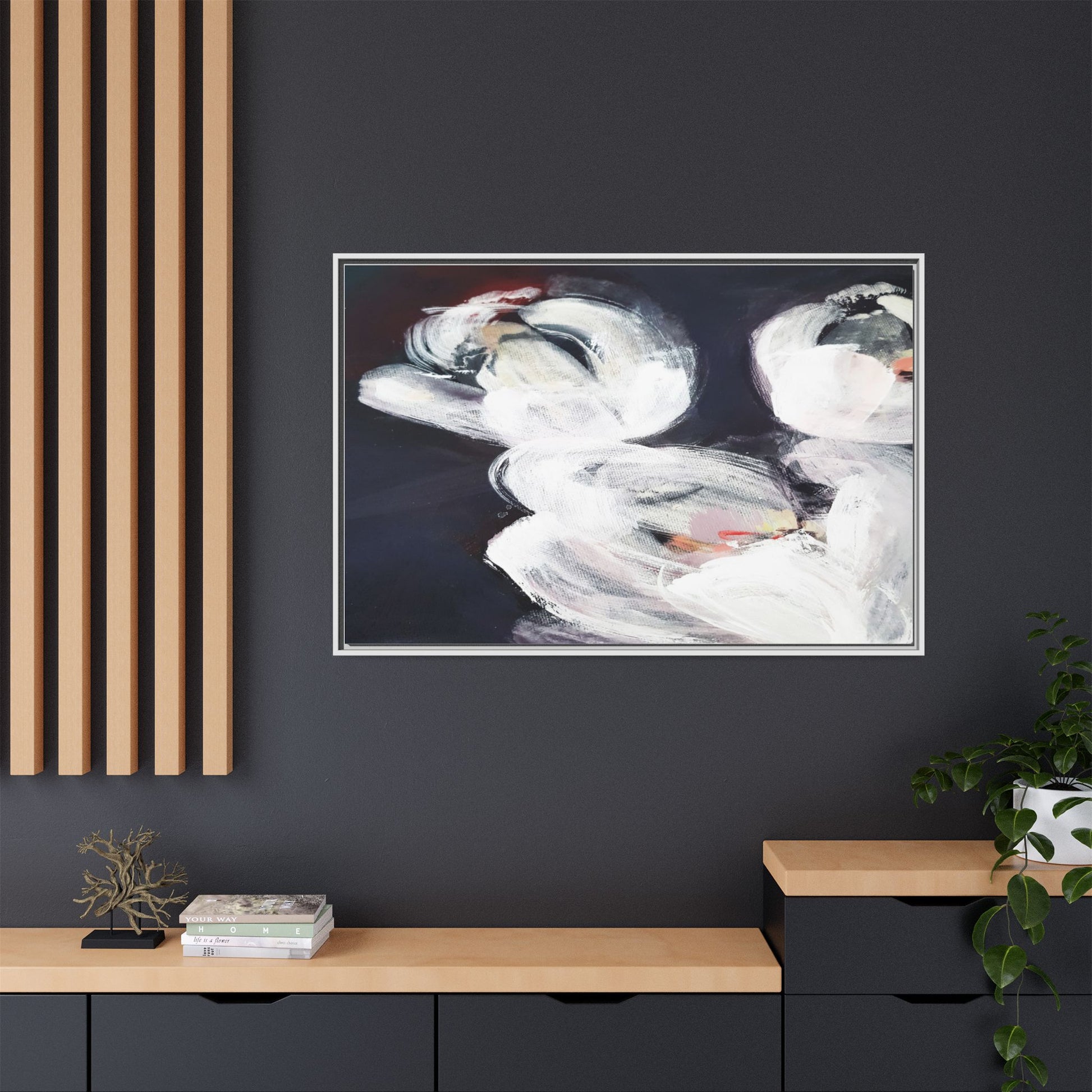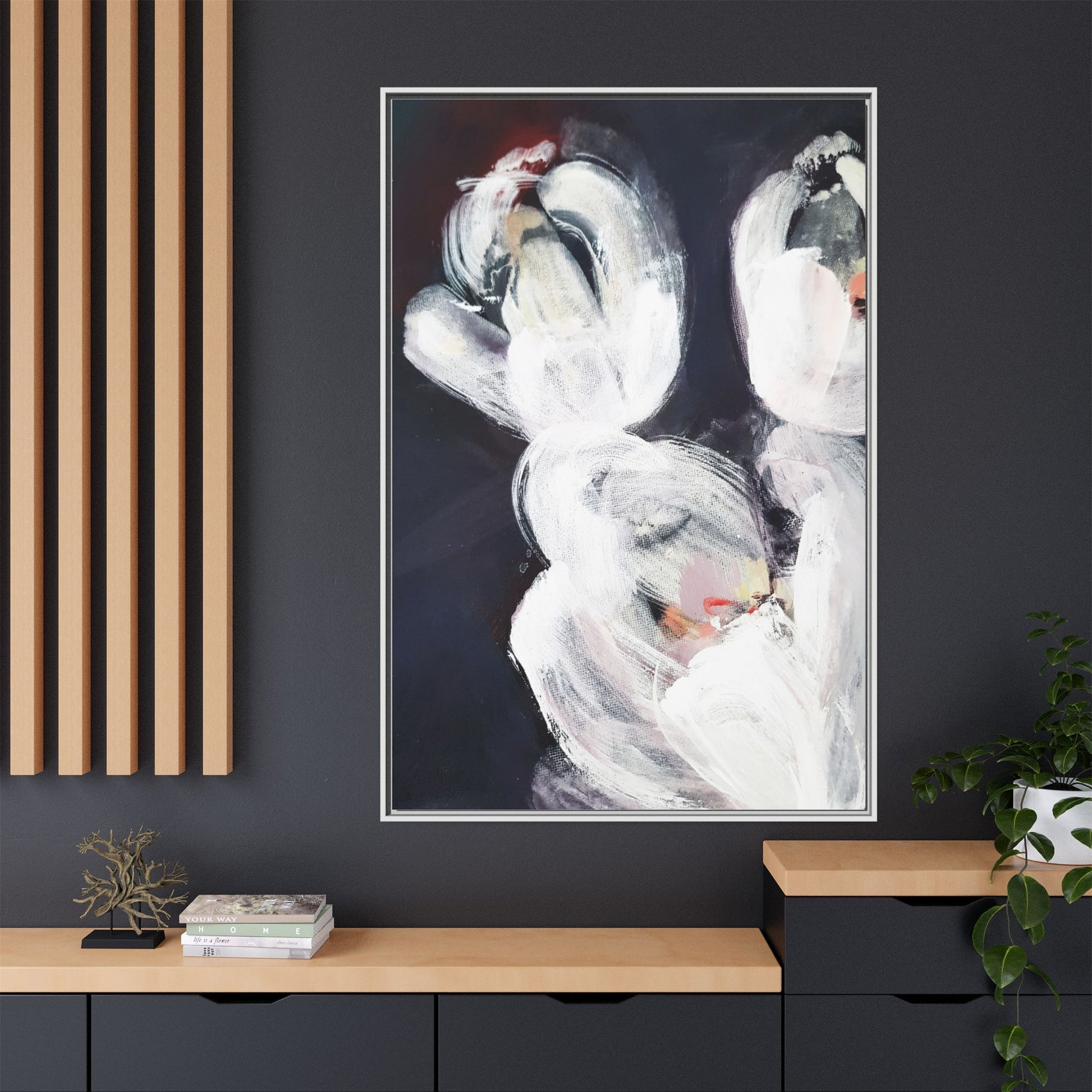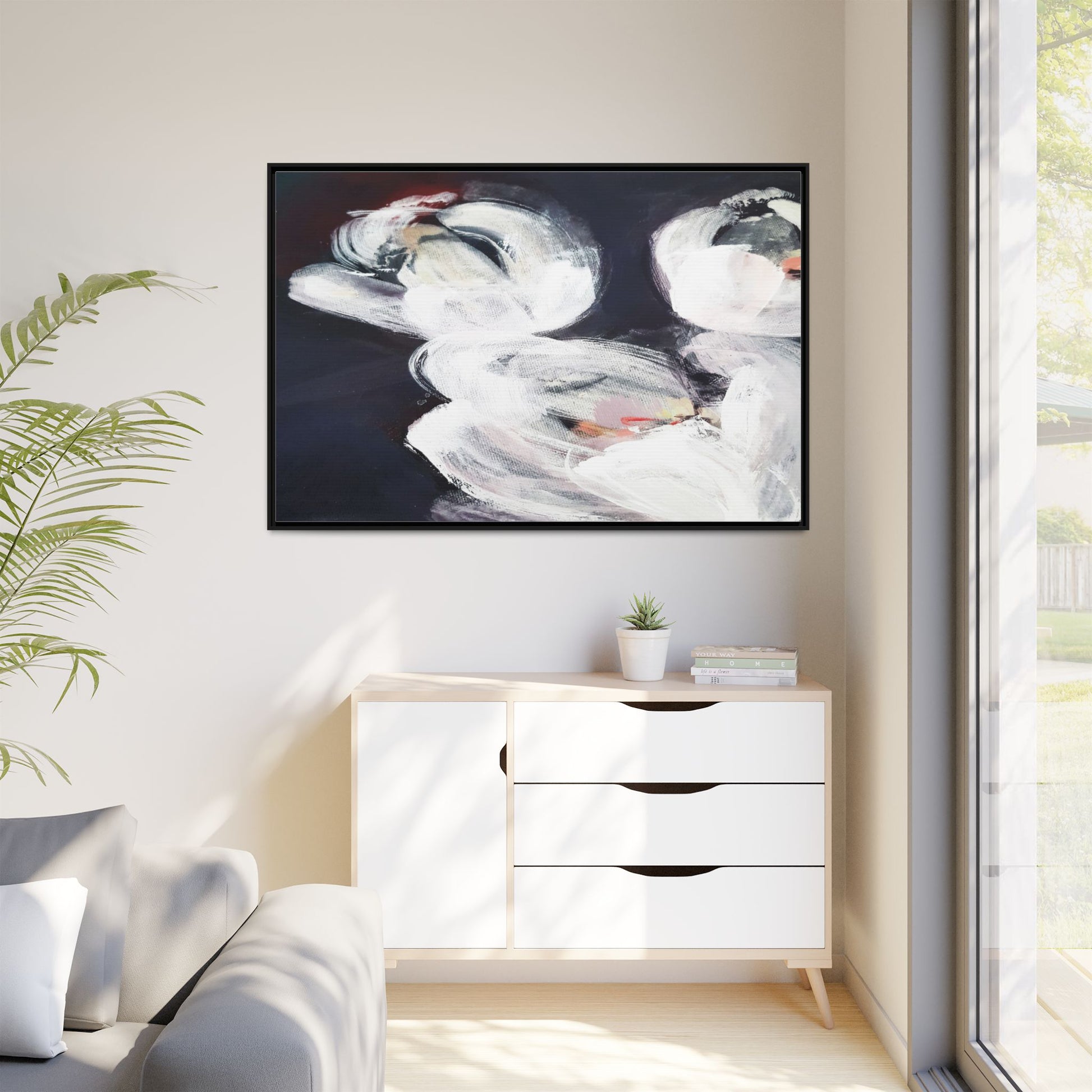 This captivating artwork is an abstract painting featuring soft, flowing white and gray forms against a dark background. The piece appears to be created using a blend of brushstrokes and blurred techniques, giving the image a sense of movement and ethereal quality. Predominantly white and light gray tones dominate the composition, with subtle hints of pale pink and red accents adding depth and intrigue. The brushwork is loose and expressive, creating organic shapes that seem to blend and flow into one another. The painting has a dreamy, almost impressionistic style that invites viewers to interpret the forms freely and emotionally.