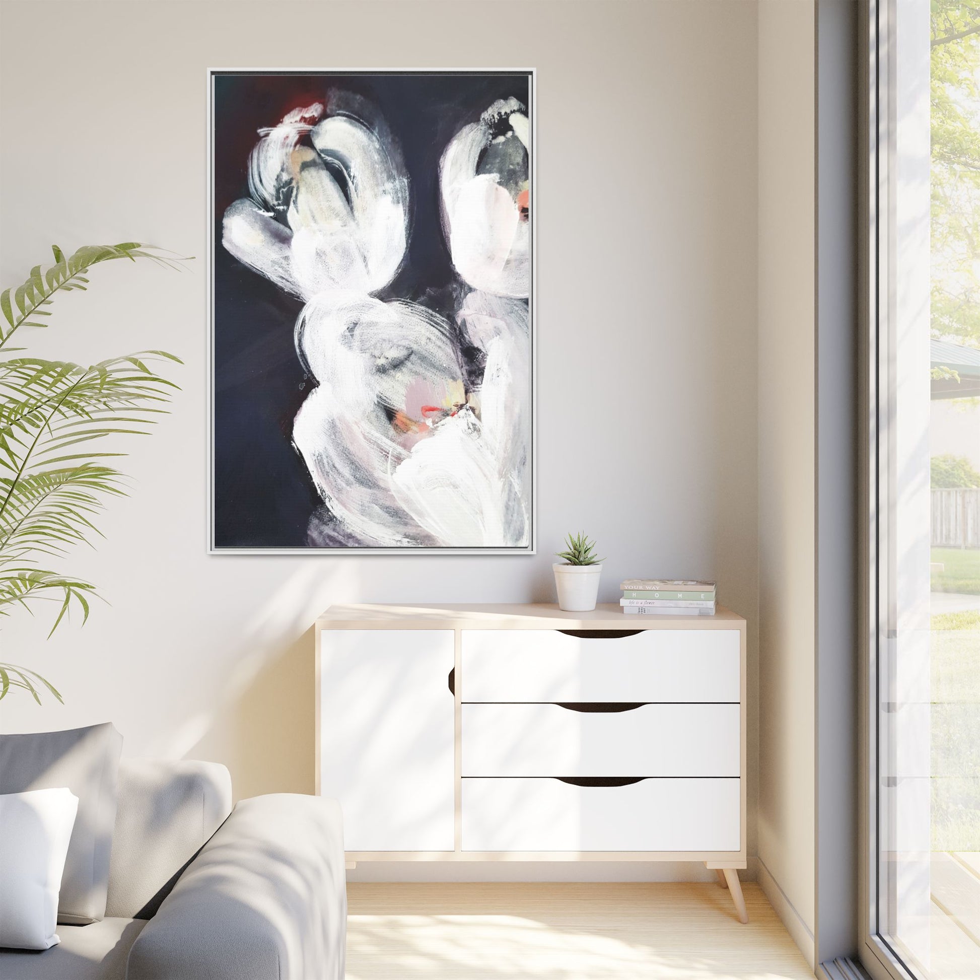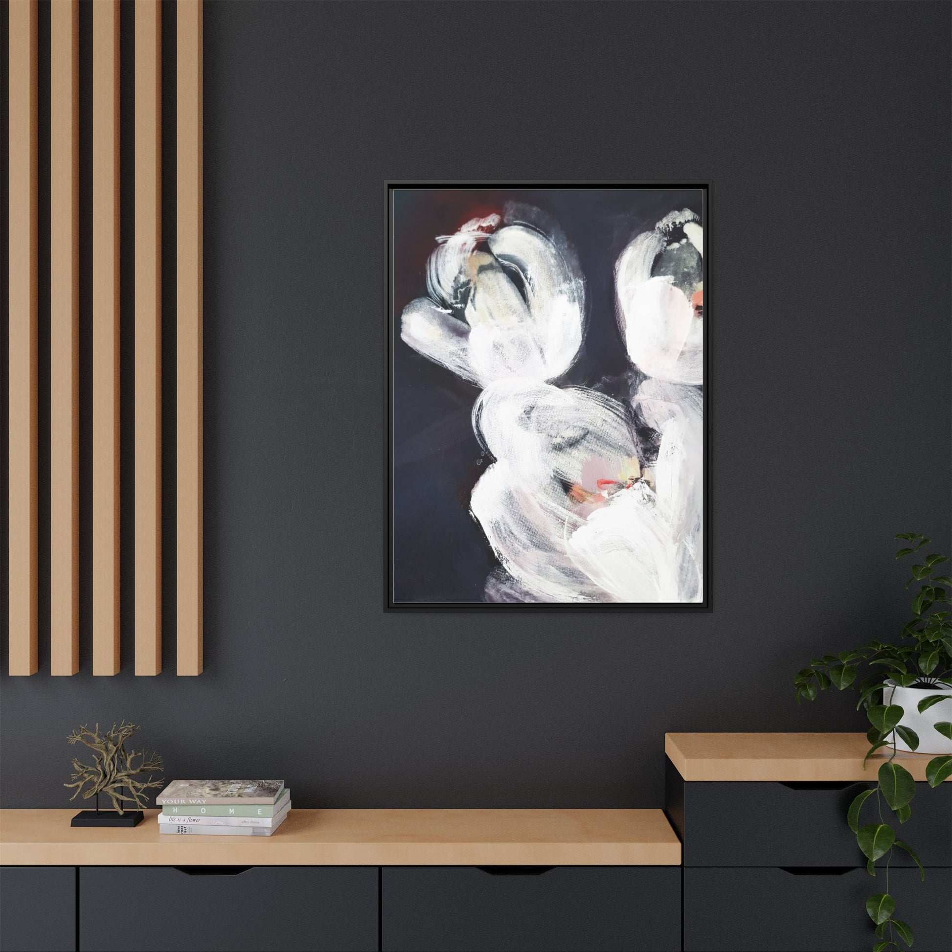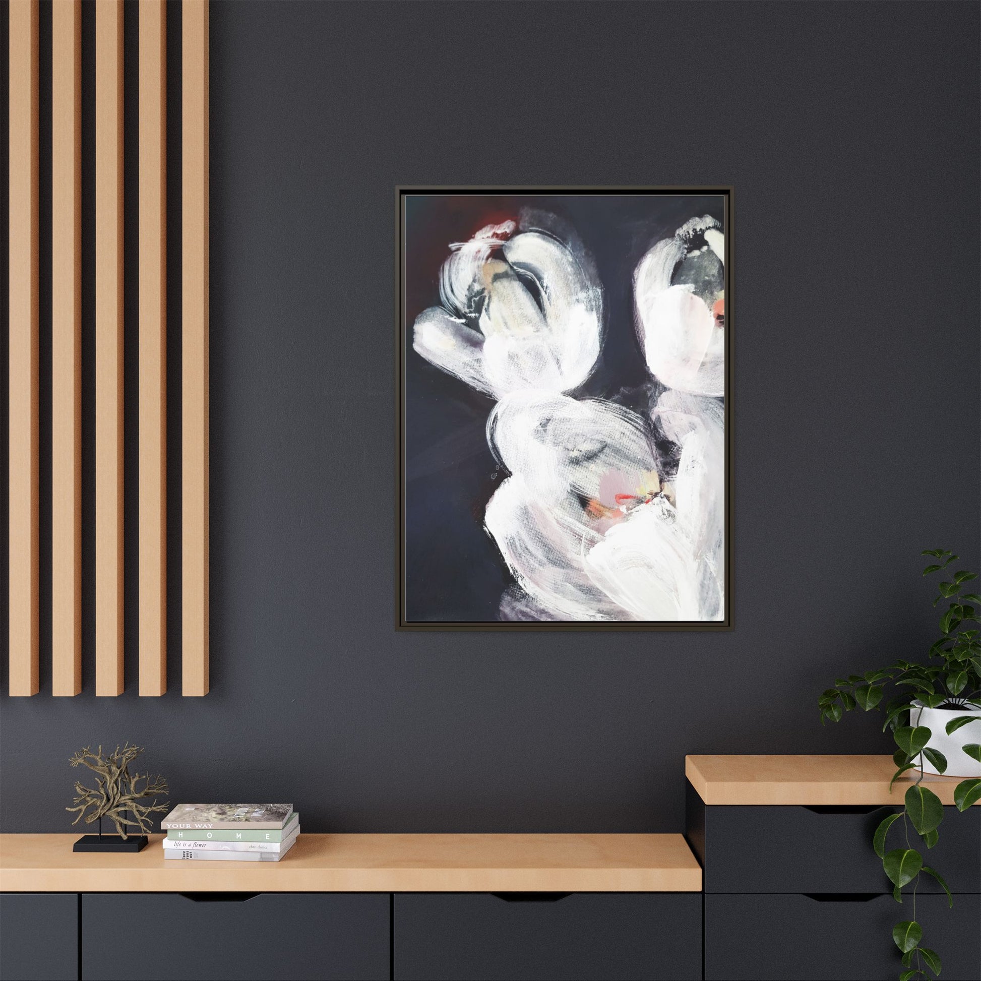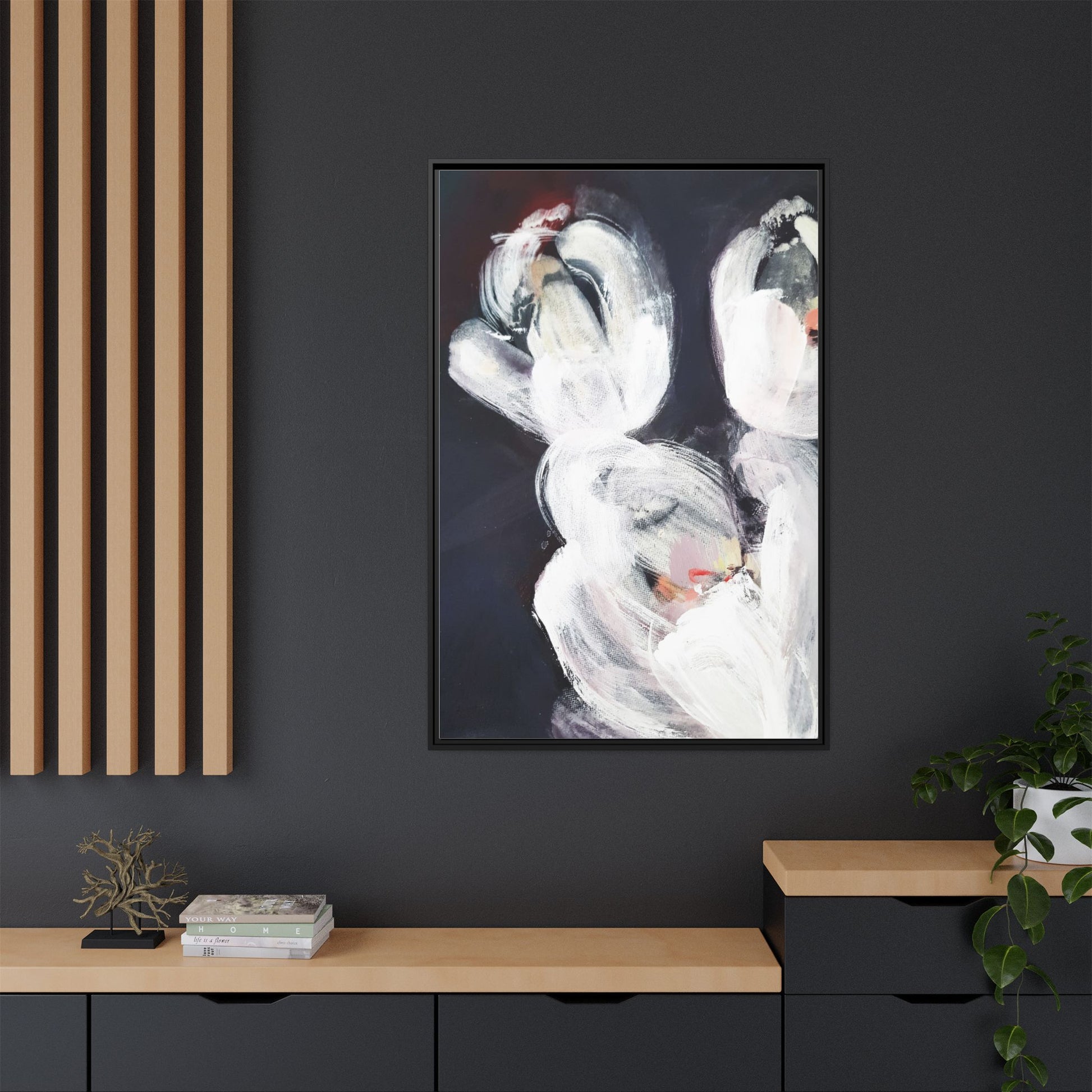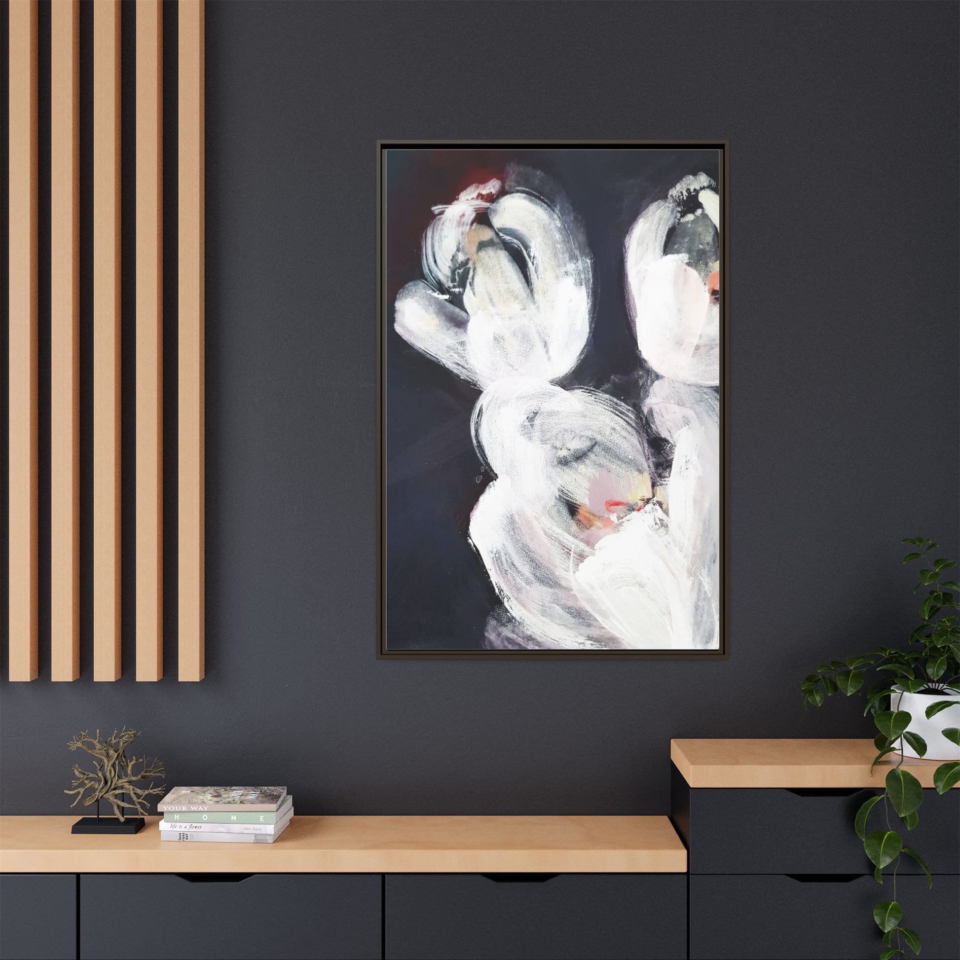 This captivating artwork is an abstract painting featuring soft, flowing white and gray forms against a dark background. The piece appears to be created using a blend of brushstrokes and blurred techniques, giving the image a sense of movement and ethereal quality. Predominantly white and light gray tones dominate the composition, with subtle hints of pale pink and red accents adding depth and intrigue. The brushwork is loose and expressive, creating organic shapes that seem to blend and flow into one another. The painting has a dreamy, almost impressionistic style that invites viewers to interpret the forms freely and emotionally.