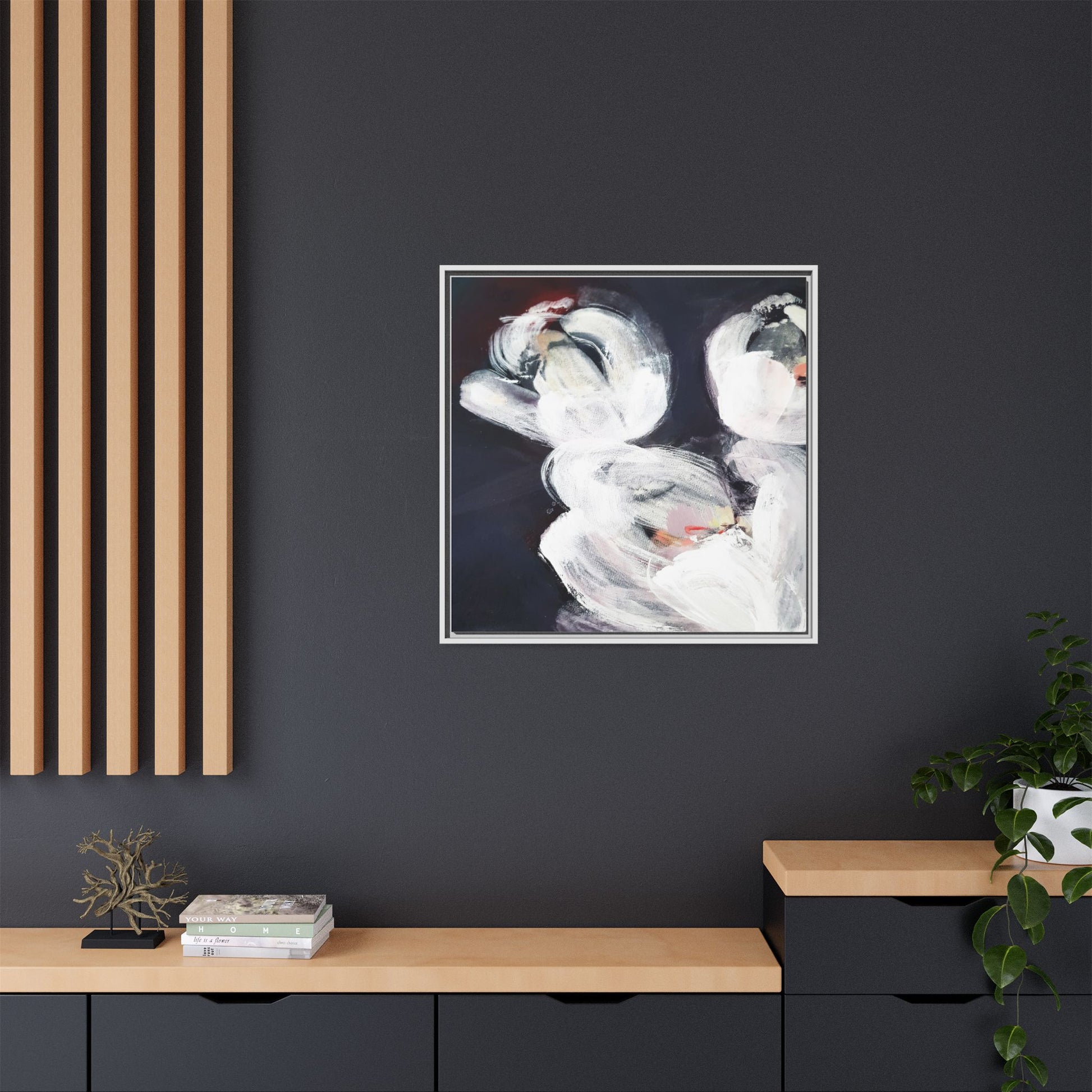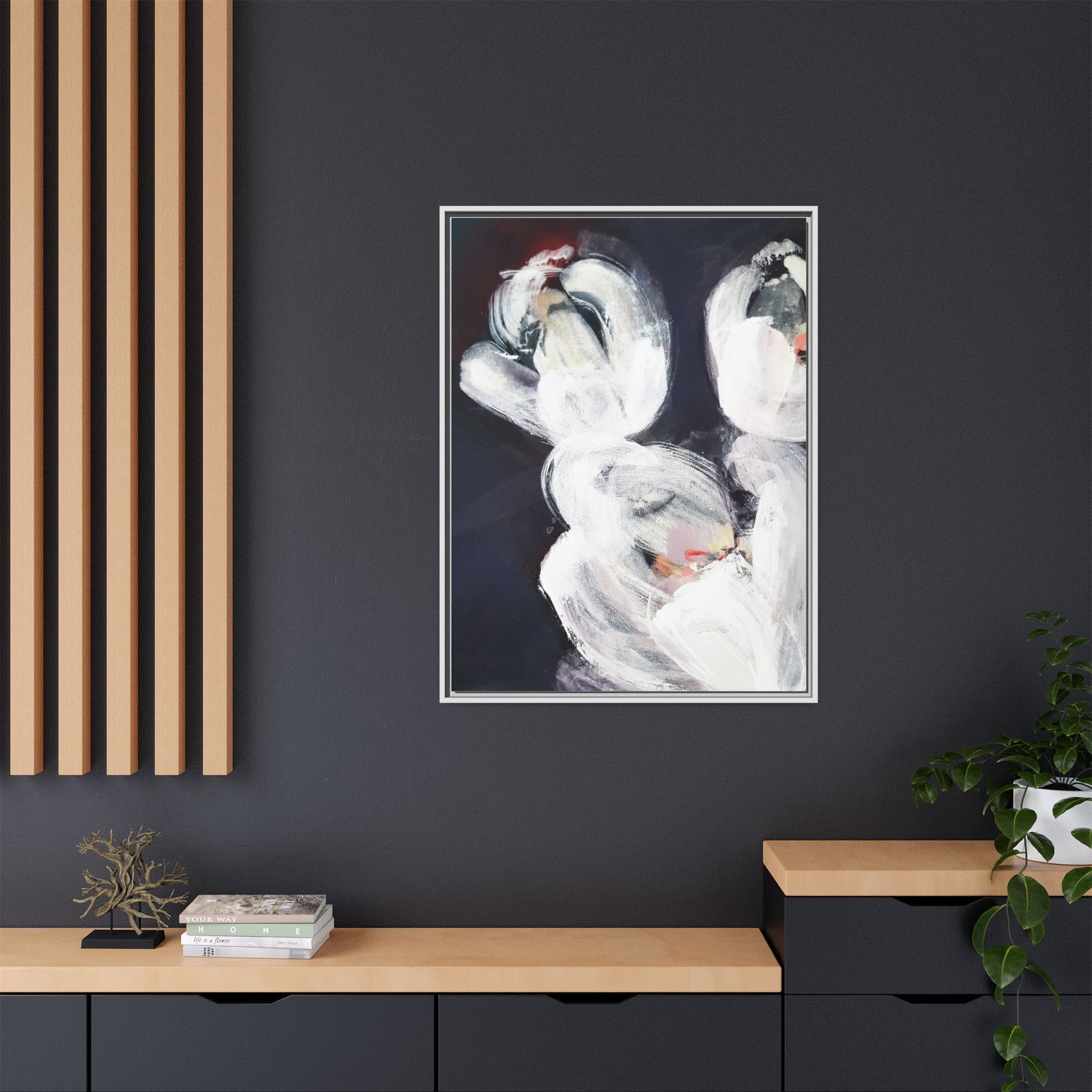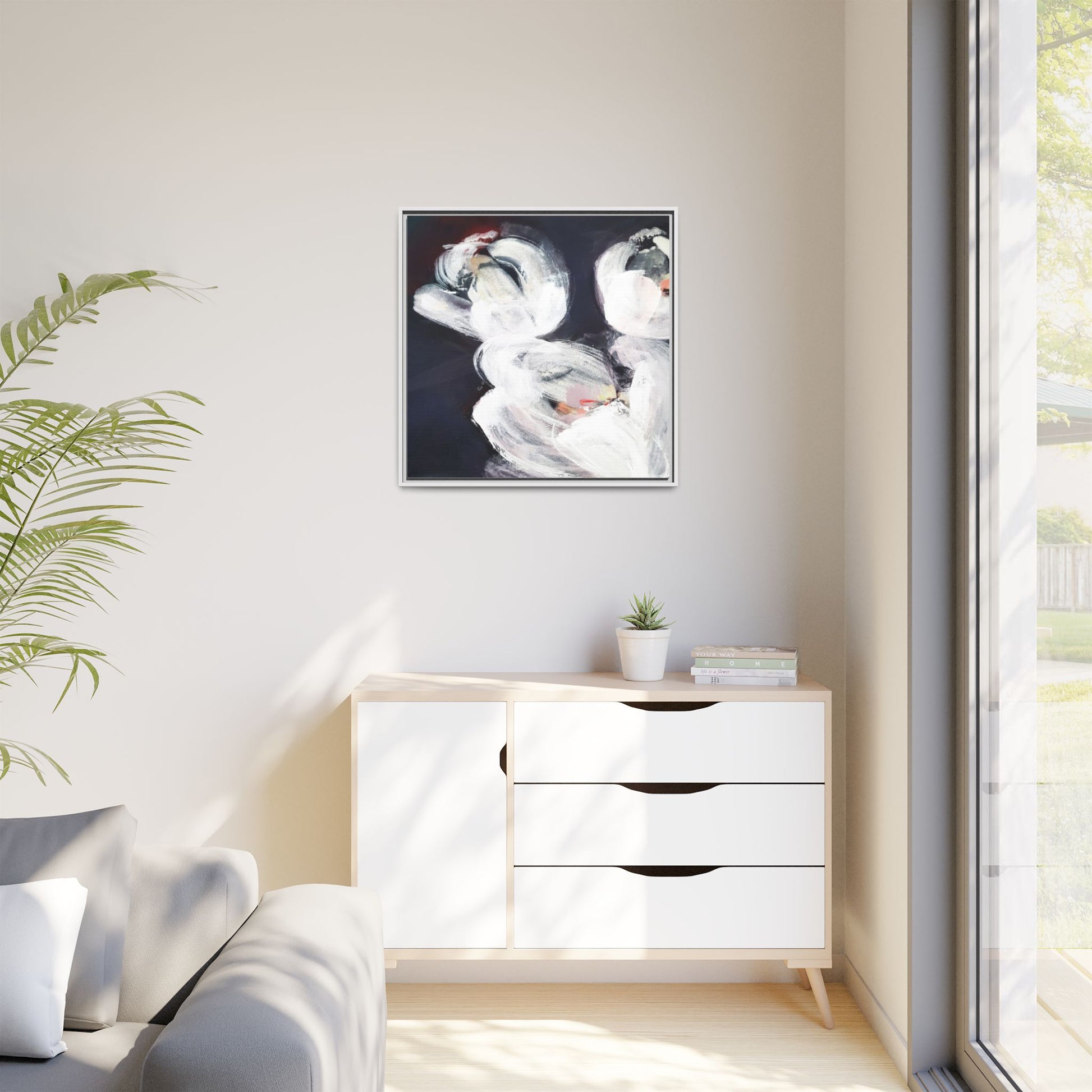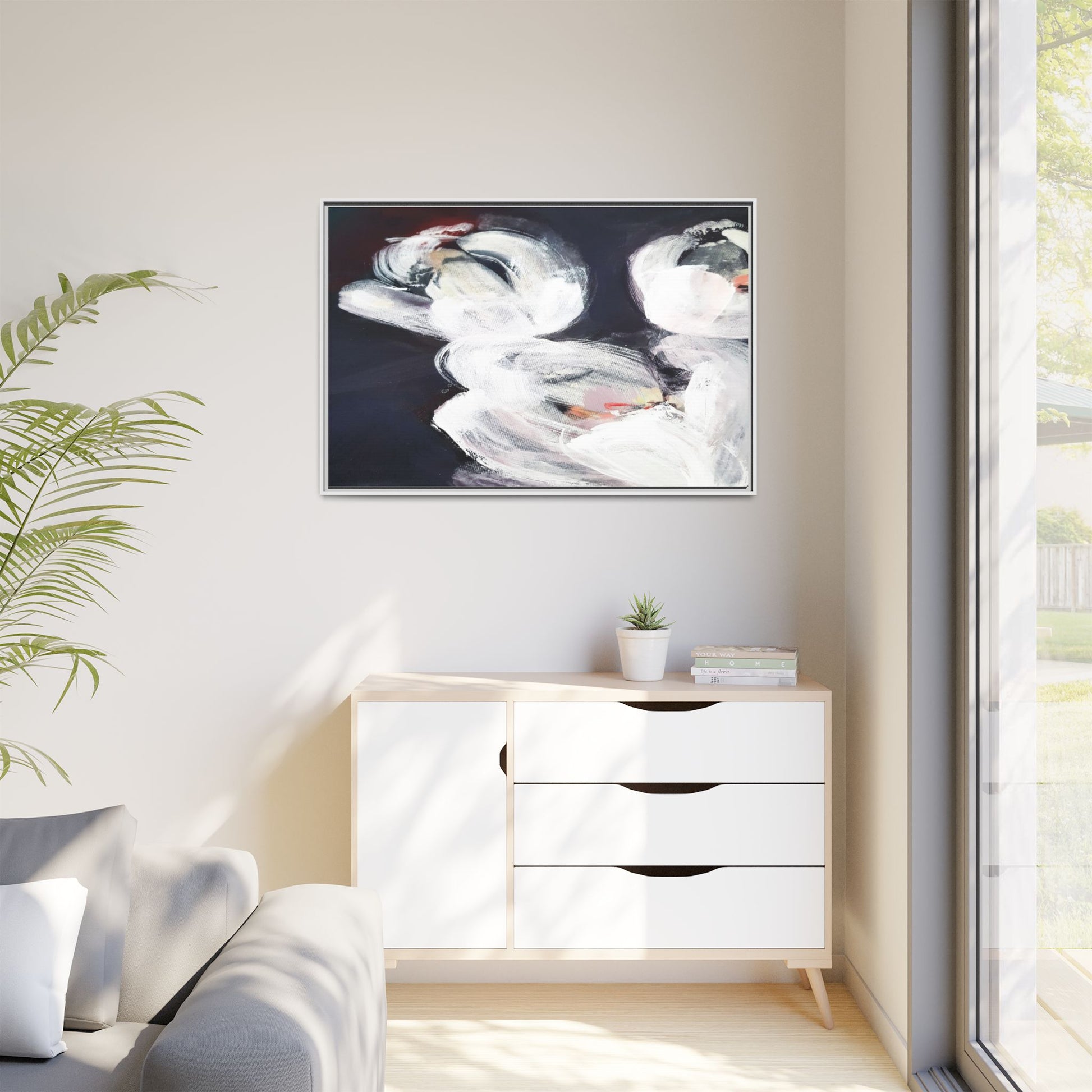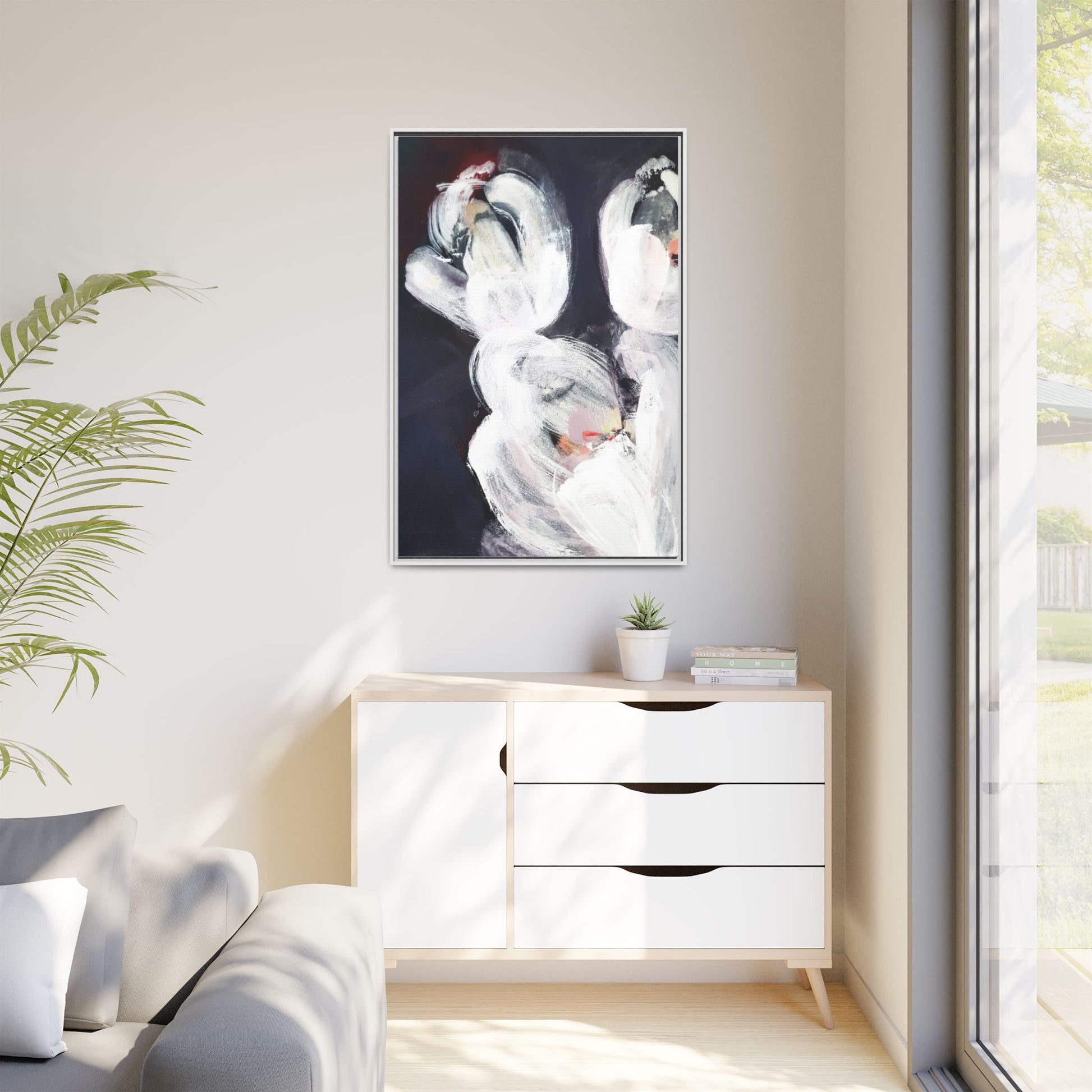 This captivating artwork is an abstract painting featuring soft, flowing white and gray forms against a dark background. The piece appears to be created using a blend of brushstrokes and blurred techniques, giving the image a sense of movement and ethereal quality. Predominantly white and light gray tones dominate the composition, with subtle hints of pale pink and red accents adding depth and intrigue. The brushwork is loose and expressive, creating organic shapes that seem to blend and flow into one another. The painting has a dreamy, almost impressionistic style that invites viewers to interpret the forms freely and emotionally.