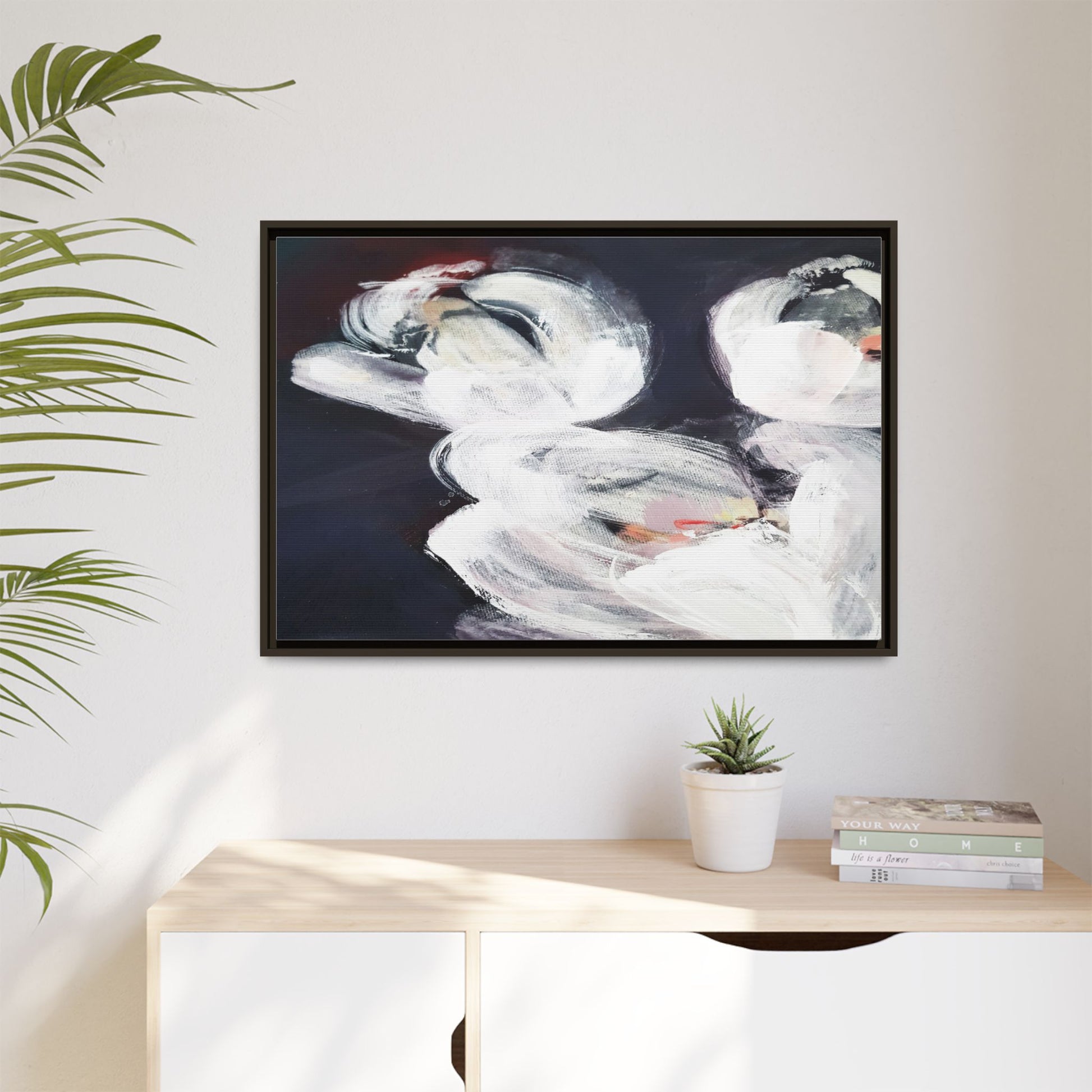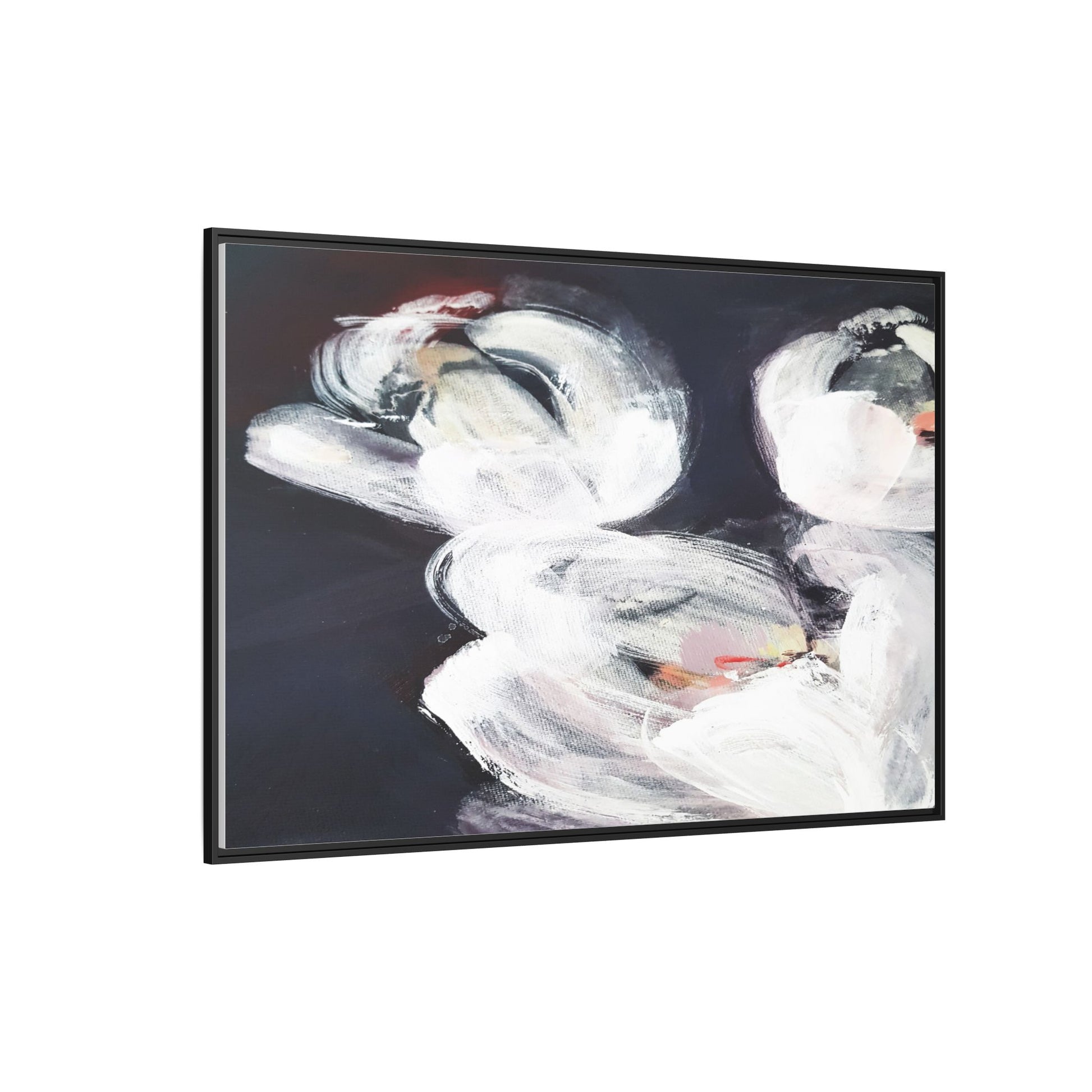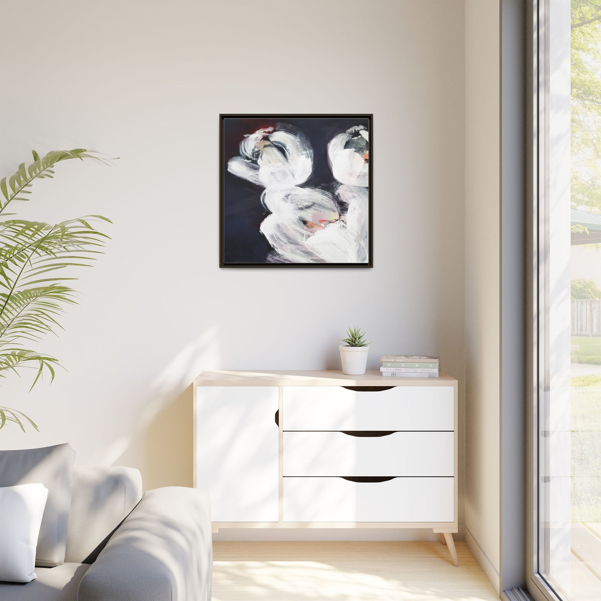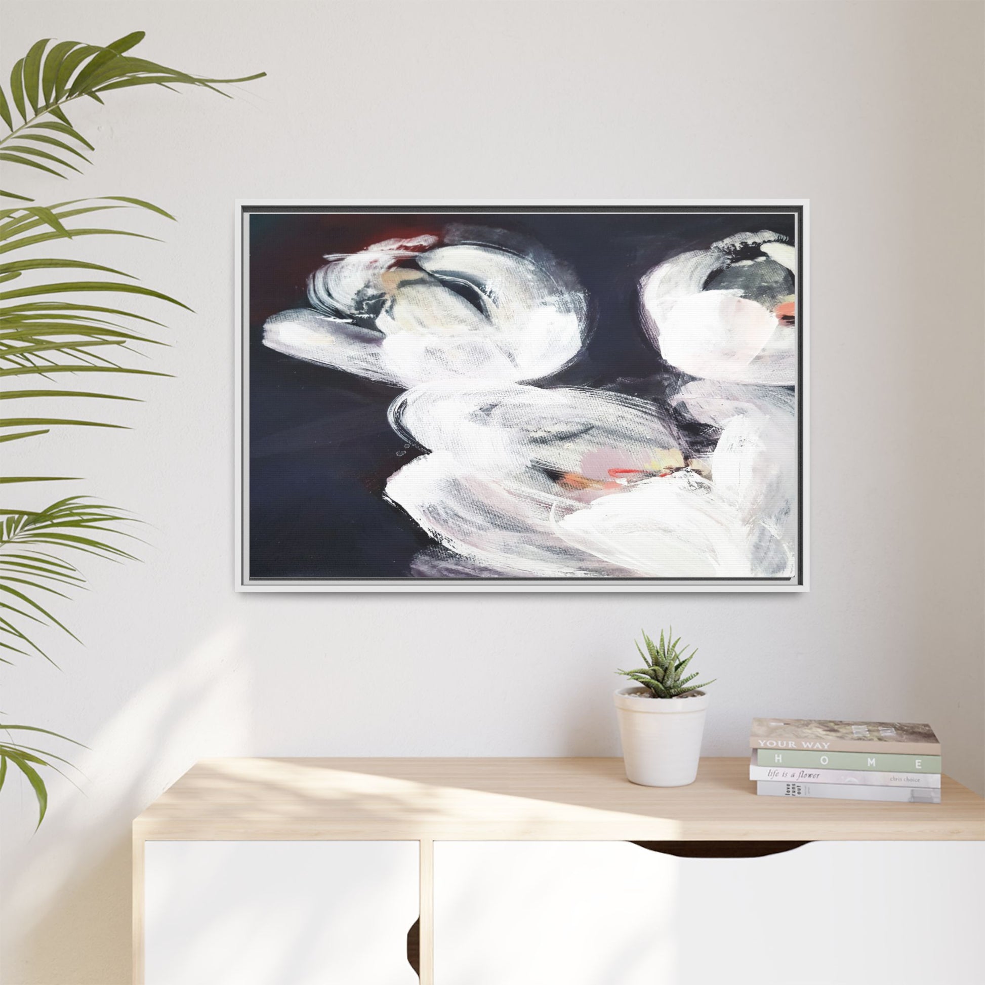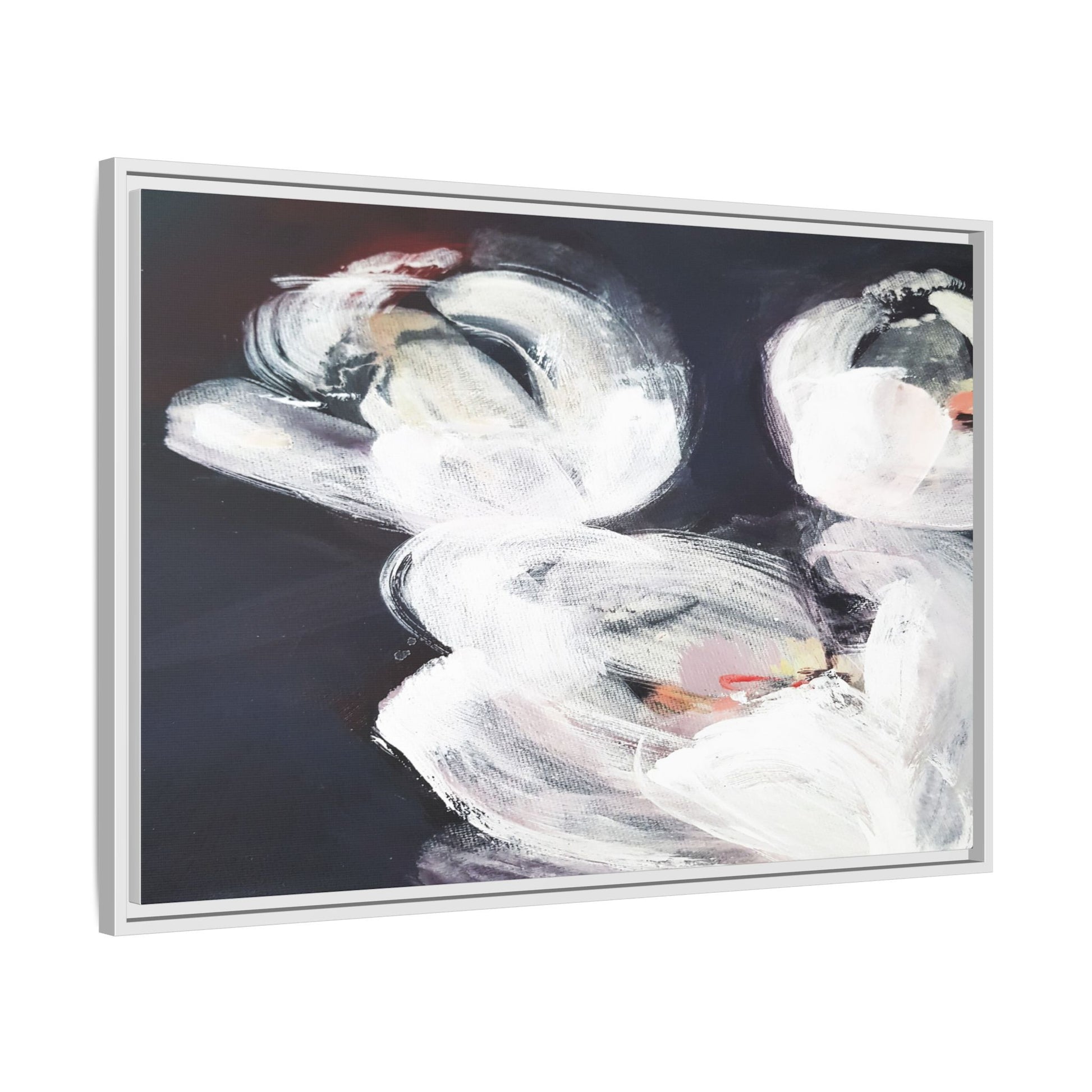 This captivating artwork is an abstract painting featuring soft, flowing white and gray forms against a dark background. The piece appears to be created using a blend of brushstrokes and blurred techniques, giving the image a sense of movement and ethereal quality. Predominantly white and light gray tones dominate the composition, with subtle hints of pale pink and red accents adding depth and intrigue. The brushwork is loose and expressive, creating organic shapes that seem to blend and flow into one another. The painting has a dreamy, almost impressionistic style that invites viewers to interpret the forms freely and emotionally.