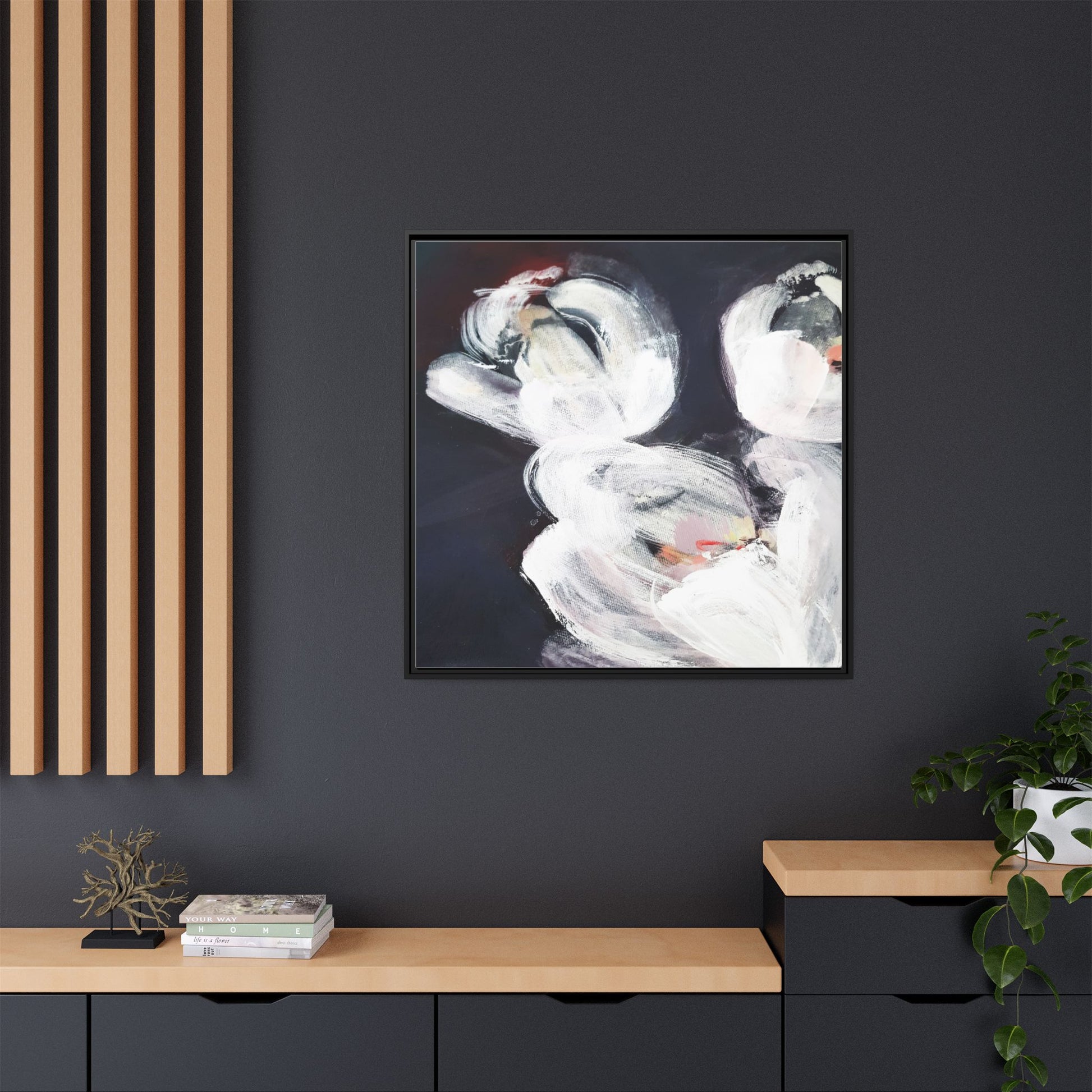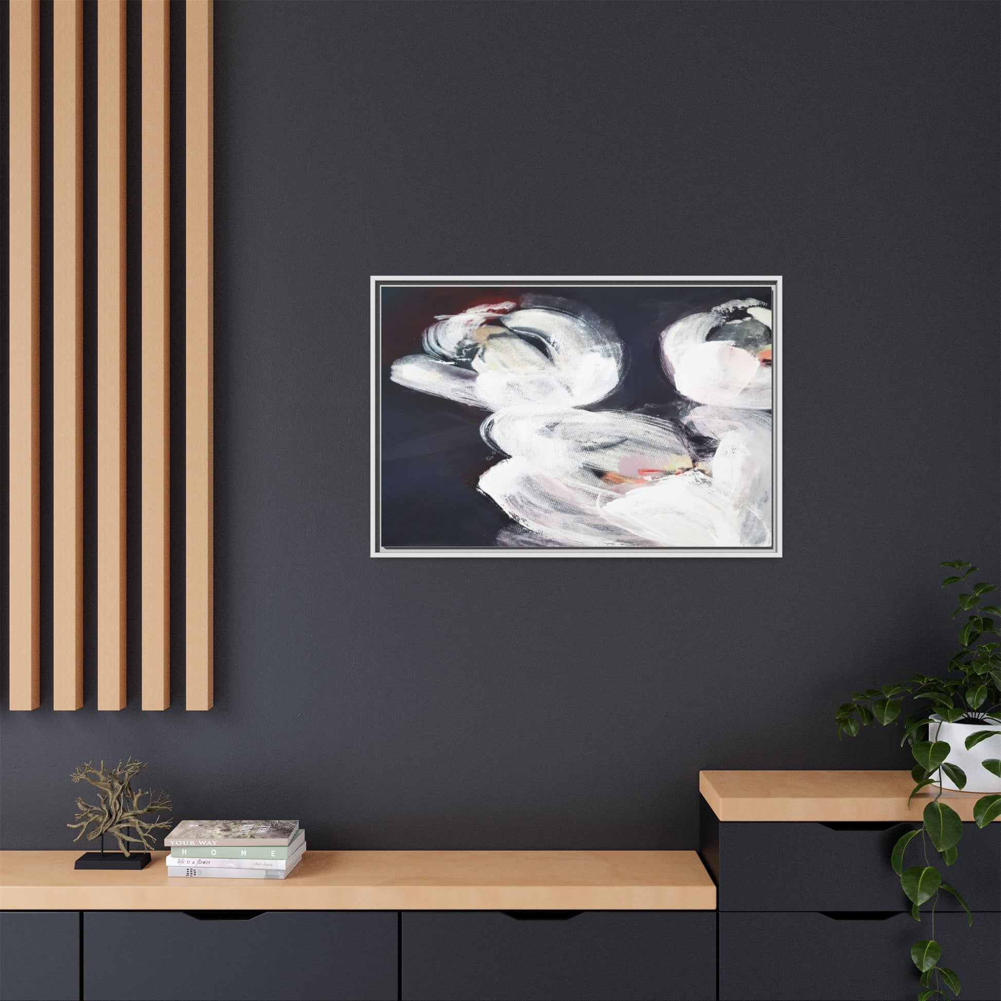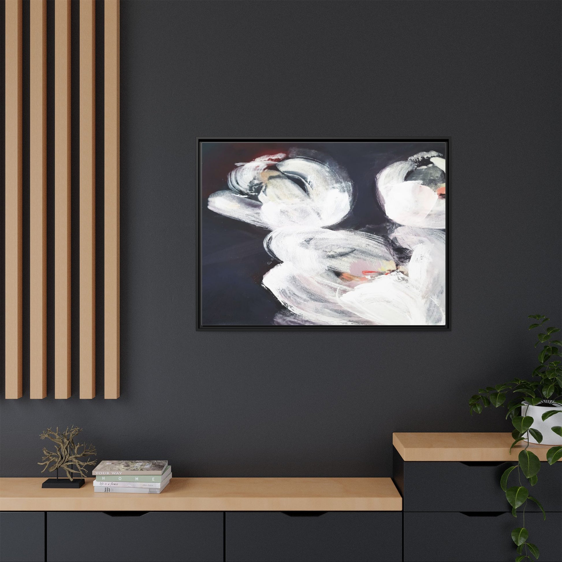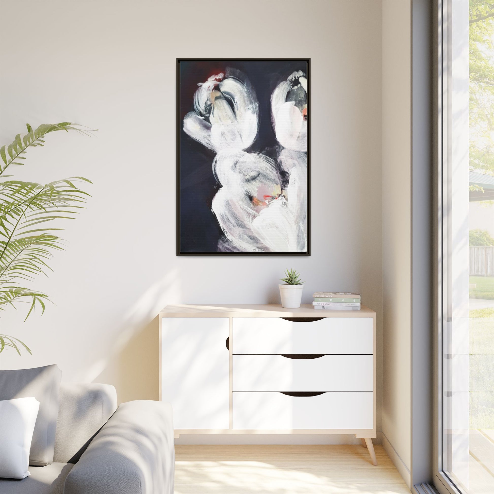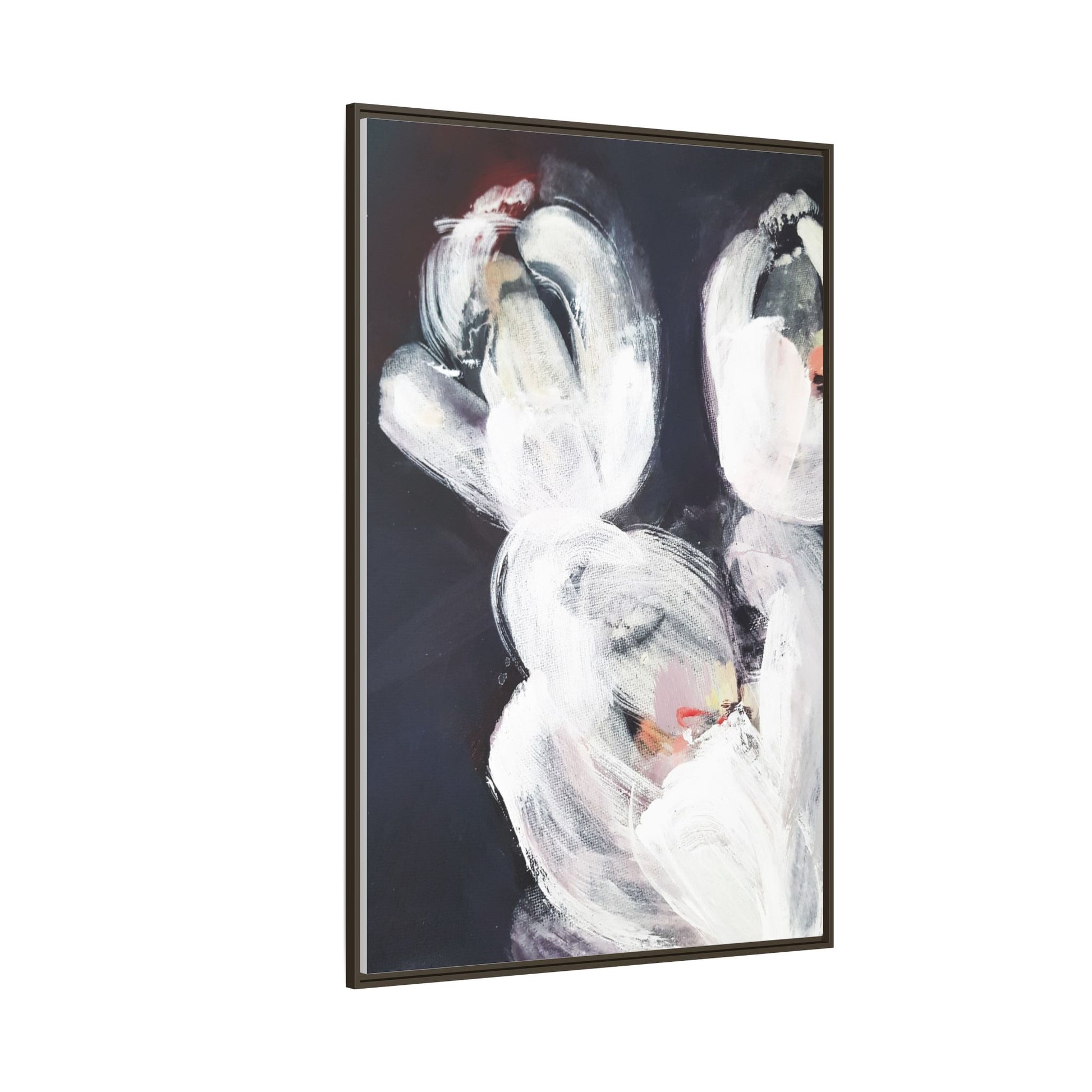 This captivating artwork is an abstract painting featuring soft, flowing white and gray forms against a dark background. The piece appears to be created using a blend of brushstrokes and blurred techniques, giving the image a sense of movement and ethereal quality. Predominantly white and light gray tones dominate the composition, with subtle hints of pale pink and red accents adding depth and intrigue. The brushwork is loose and expressive, creating organic shapes that seem to blend and flow into one another. The painting has a dreamy, almost impressionistic style that invites viewers to interpret the forms freely and emotionally.