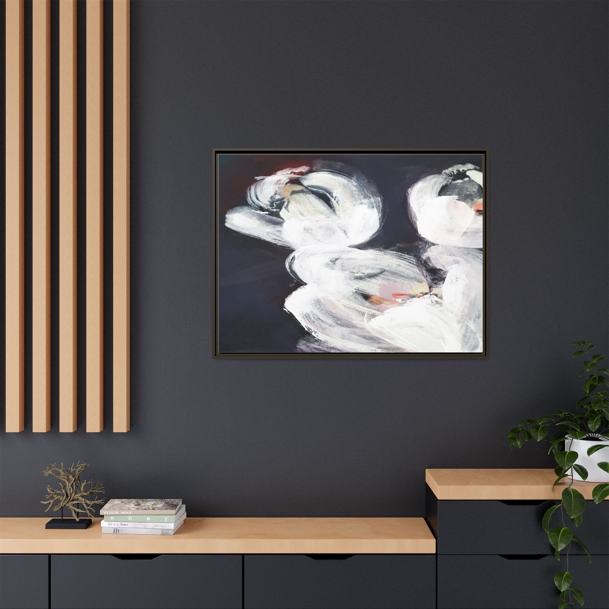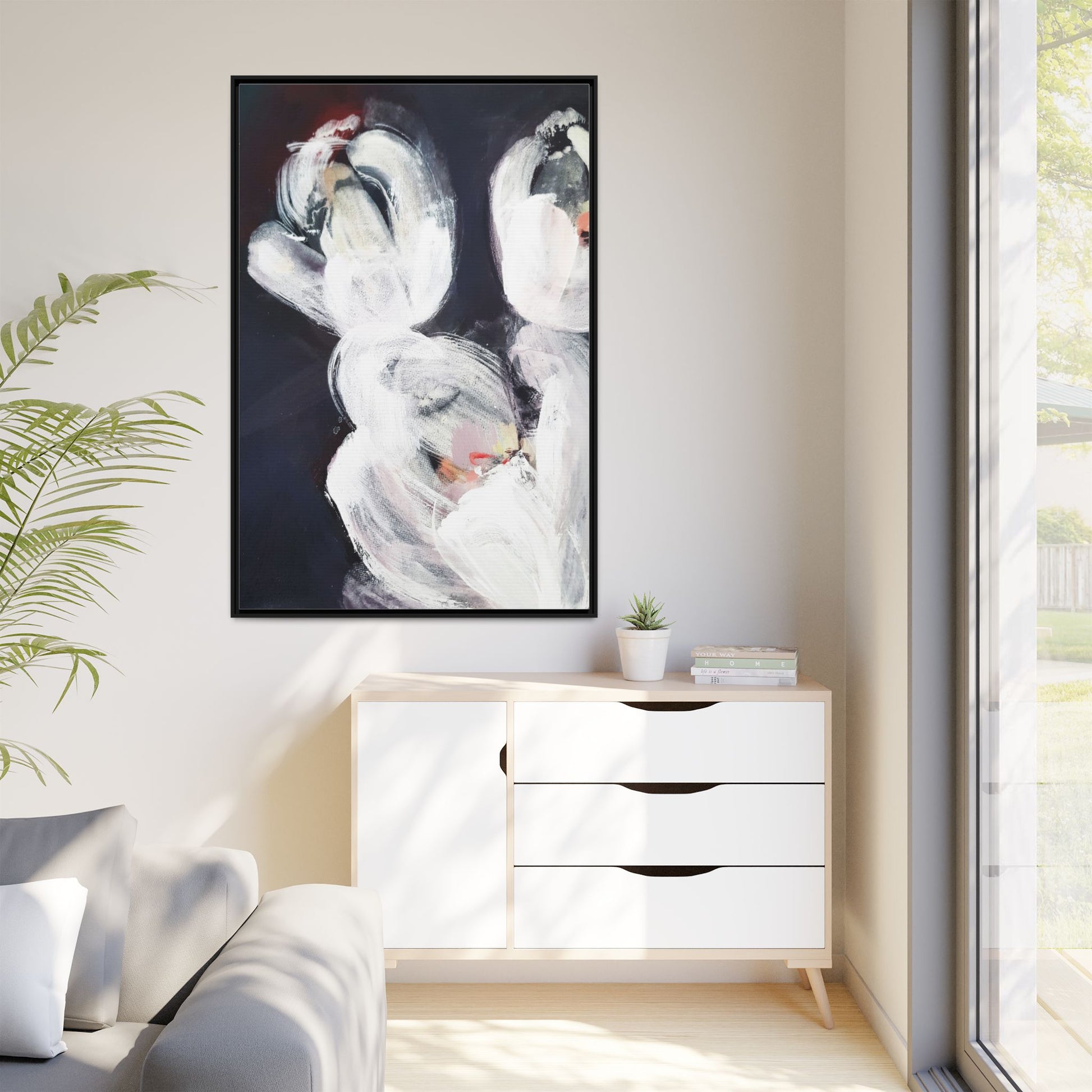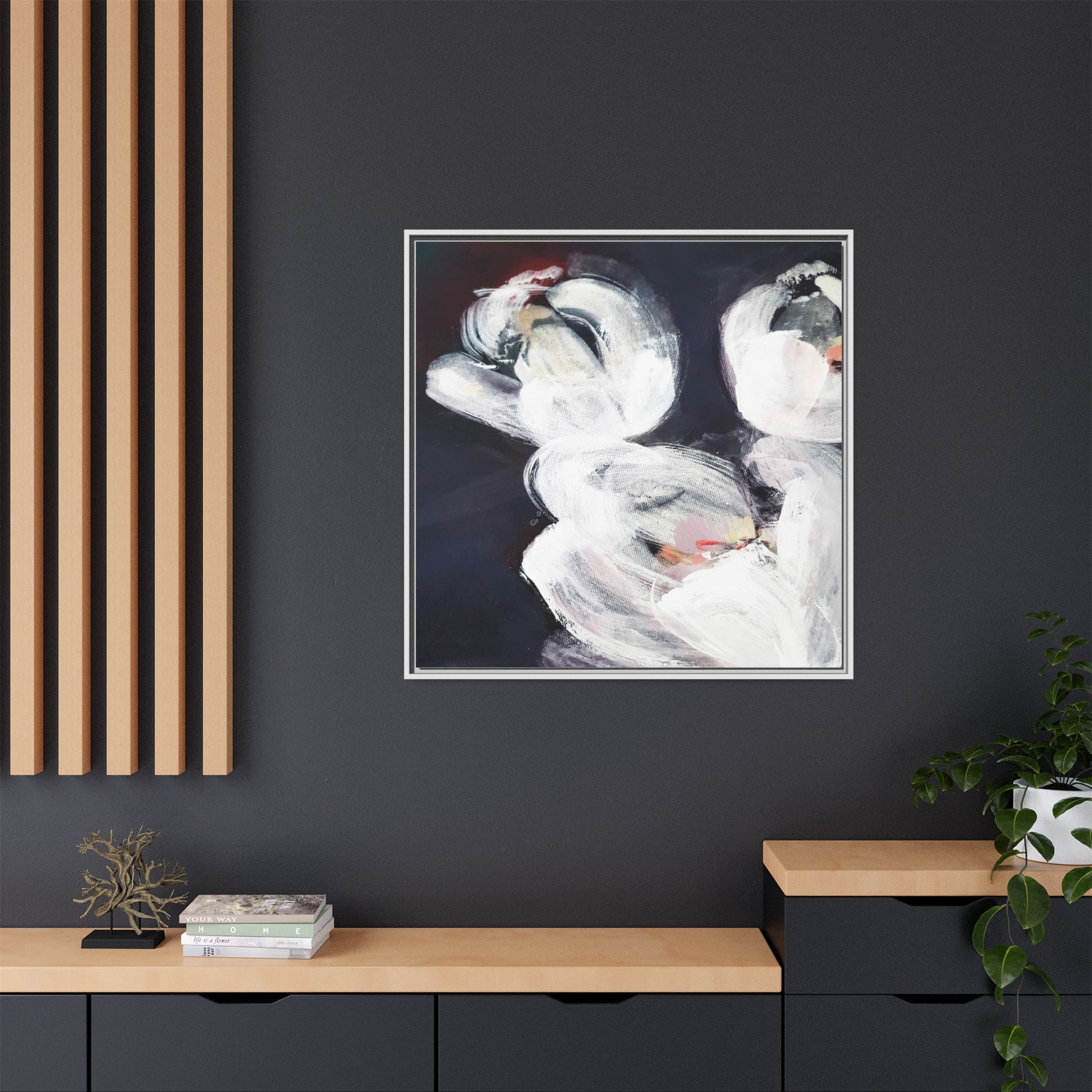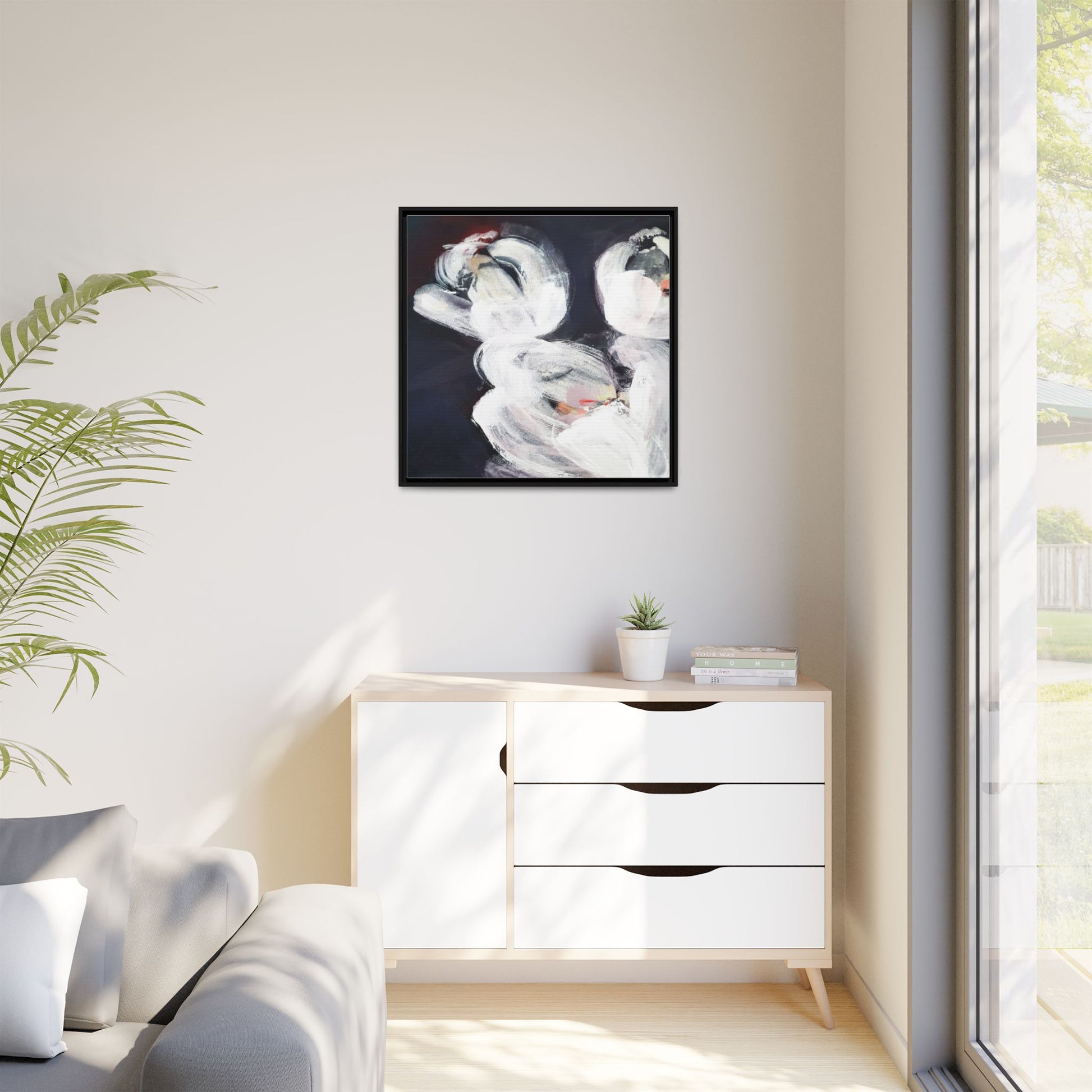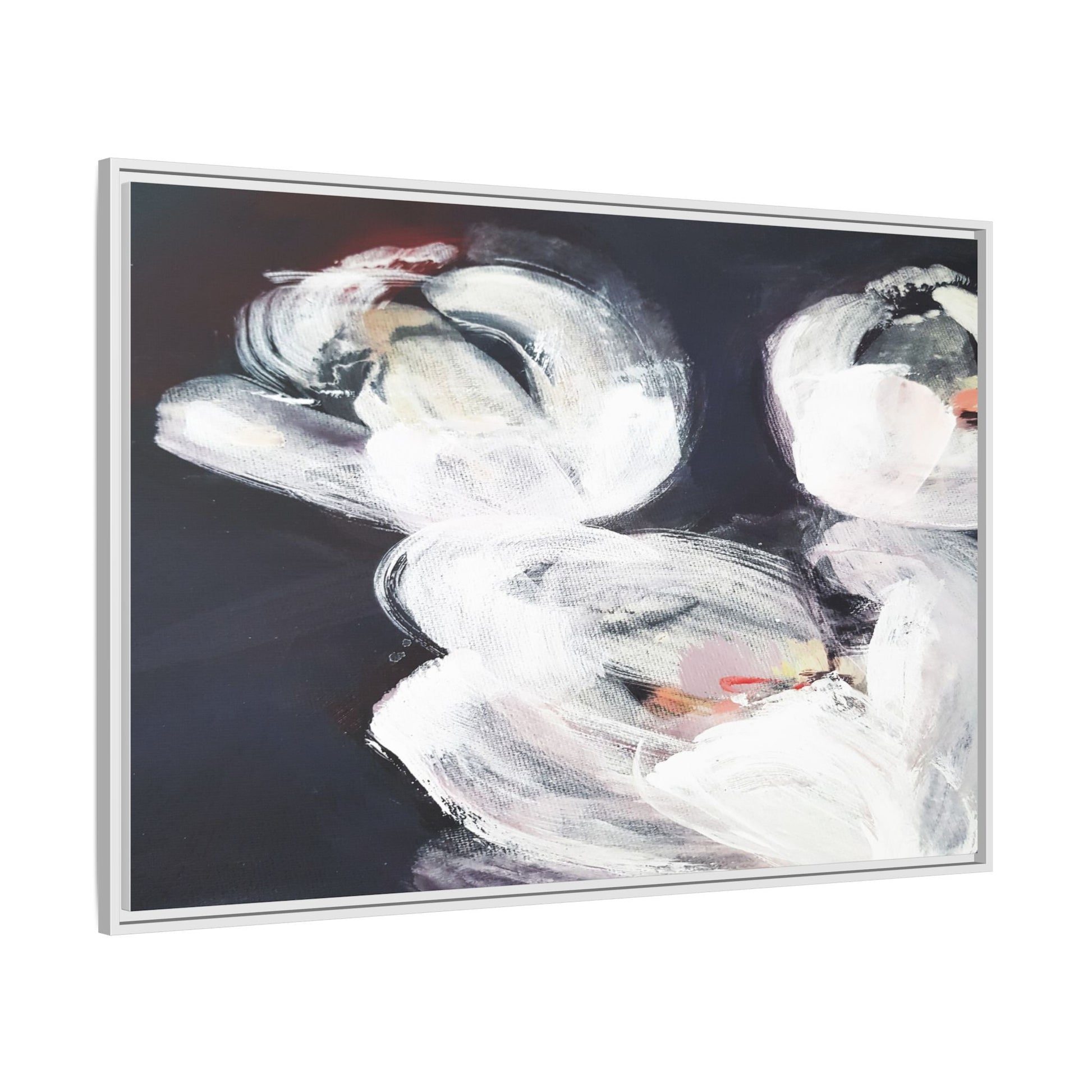 This captivating artwork is an abstract painting featuring soft, flowing white and gray forms against a dark background. The piece appears to be created using a blend of brushstrokes and blurred techniques, giving the image a sense of movement and ethereal quality. Predominantly white and light gray tones dominate the composition, with subtle hints of pale pink and red accents adding depth and intrigue. The brushwork is loose and expressive, creating organic shapes that seem to blend and flow into one another. The painting has a dreamy, almost impressionistic style that invites viewers to interpret the forms freely and emotionally.