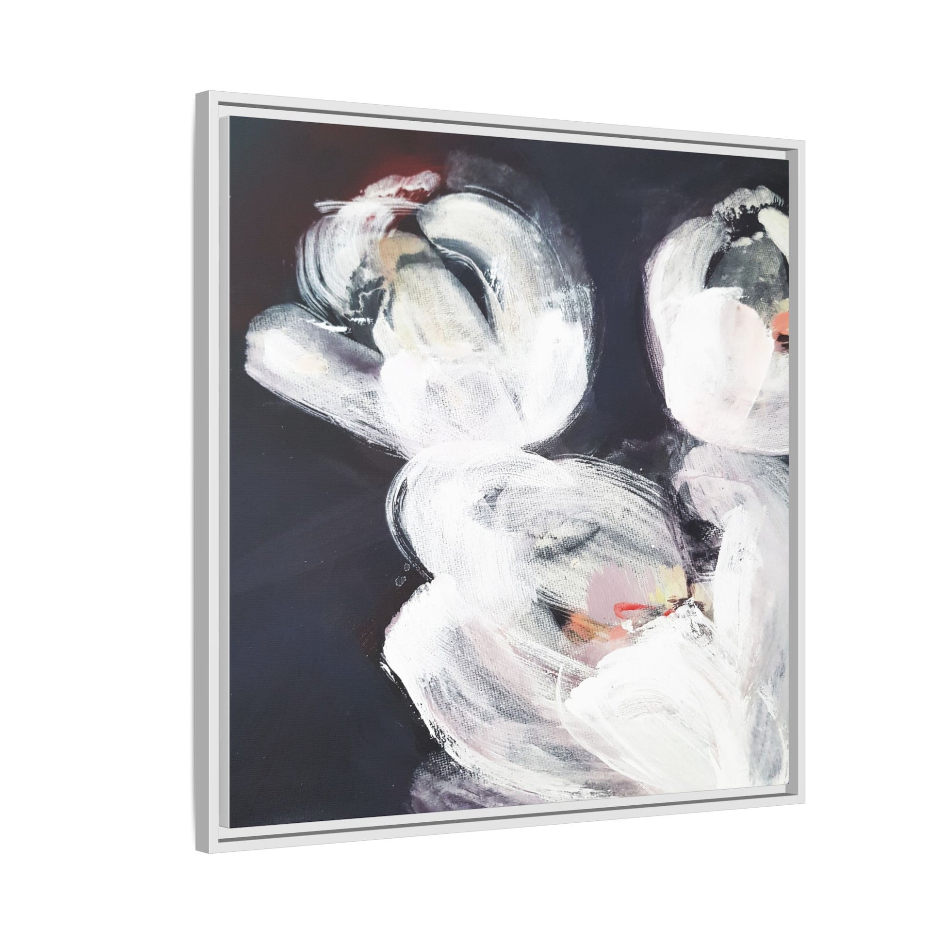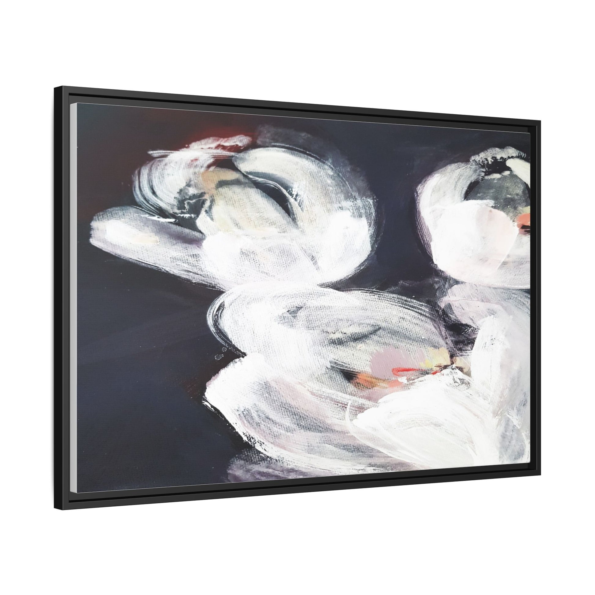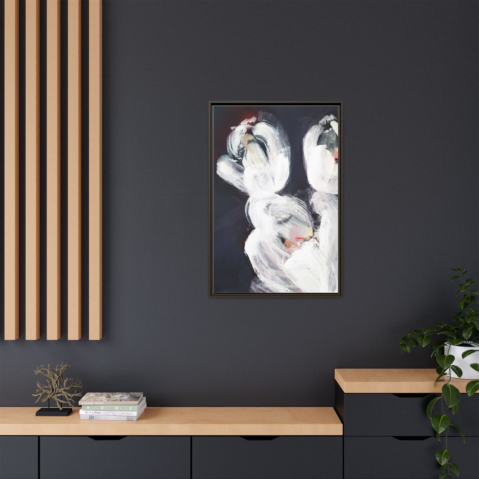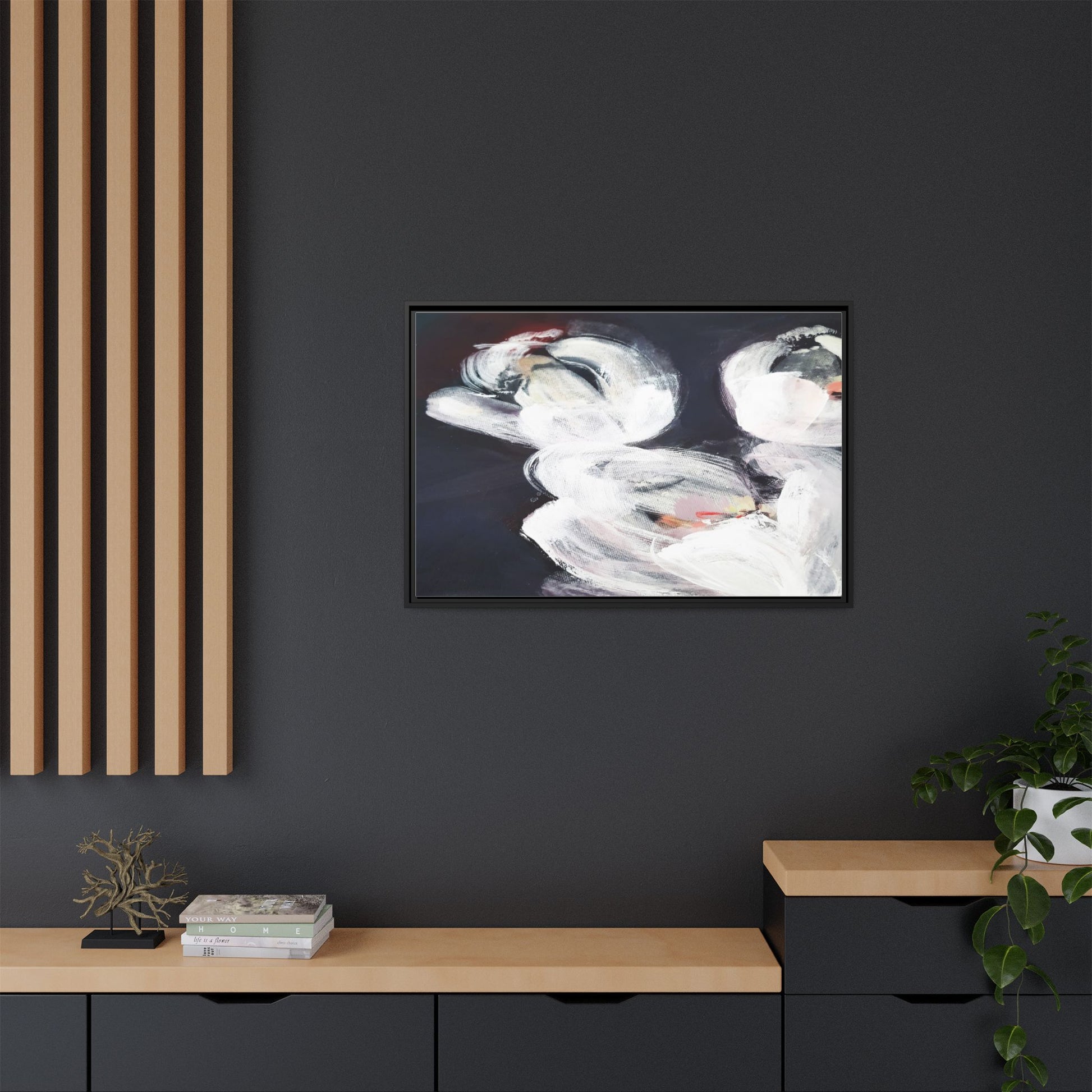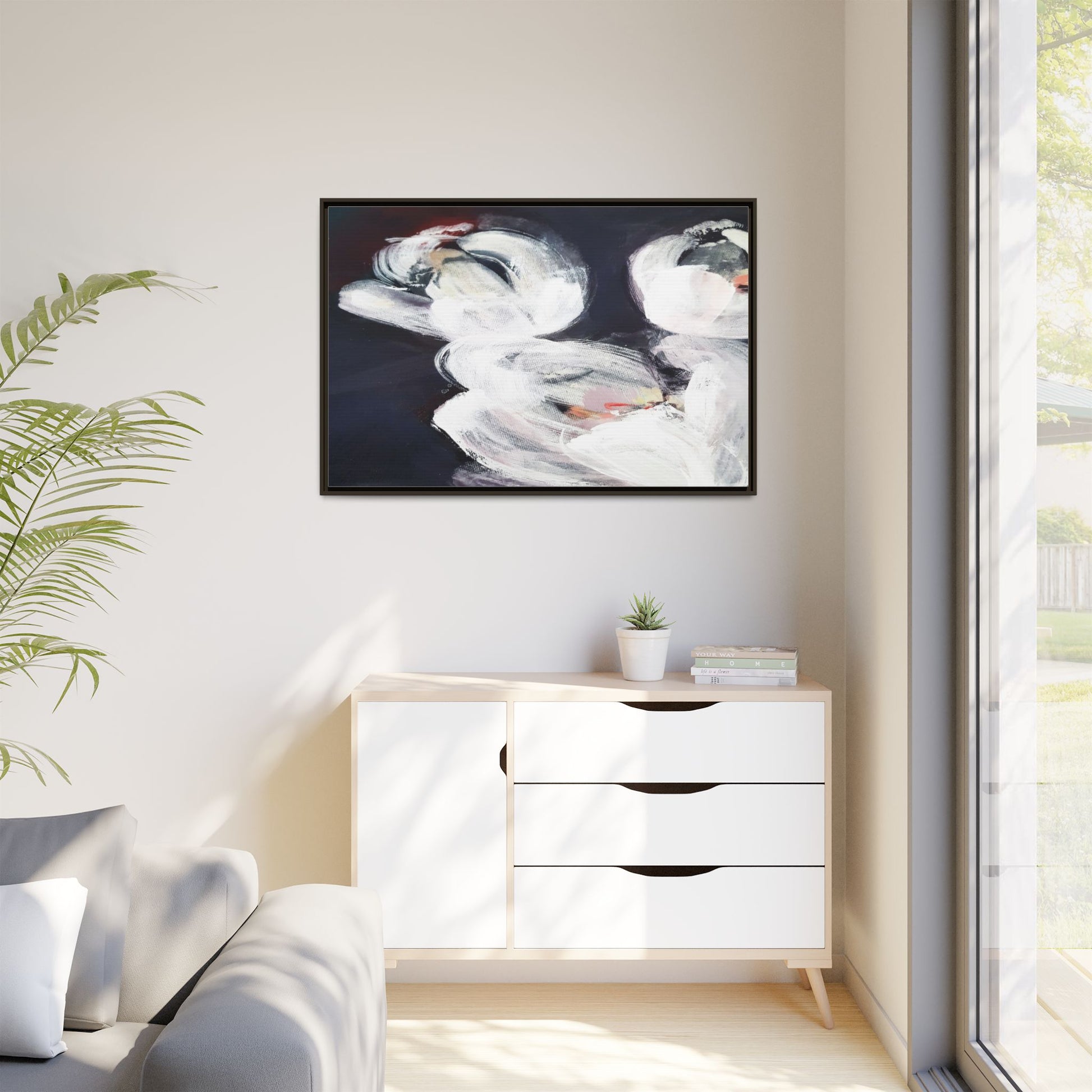 This captivating artwork is an abstract painting featuring soft, flowing white and gray forms against a dark background. The piece appears to be created using a blend of brushstrokes and blurred techniques, giving the image a sense of movement and ethereal quality. Predominantly white and light gray tones dominate the composition, with subtle hints of pale pink and red accents adding depth and intrigue. The brushwork is loose and expressive, creating organic shapes that seem to blend and flow into one another. The painting has a dreamy, almost impressionistic style that invites viewers to interpret the forms freely and emotionally.