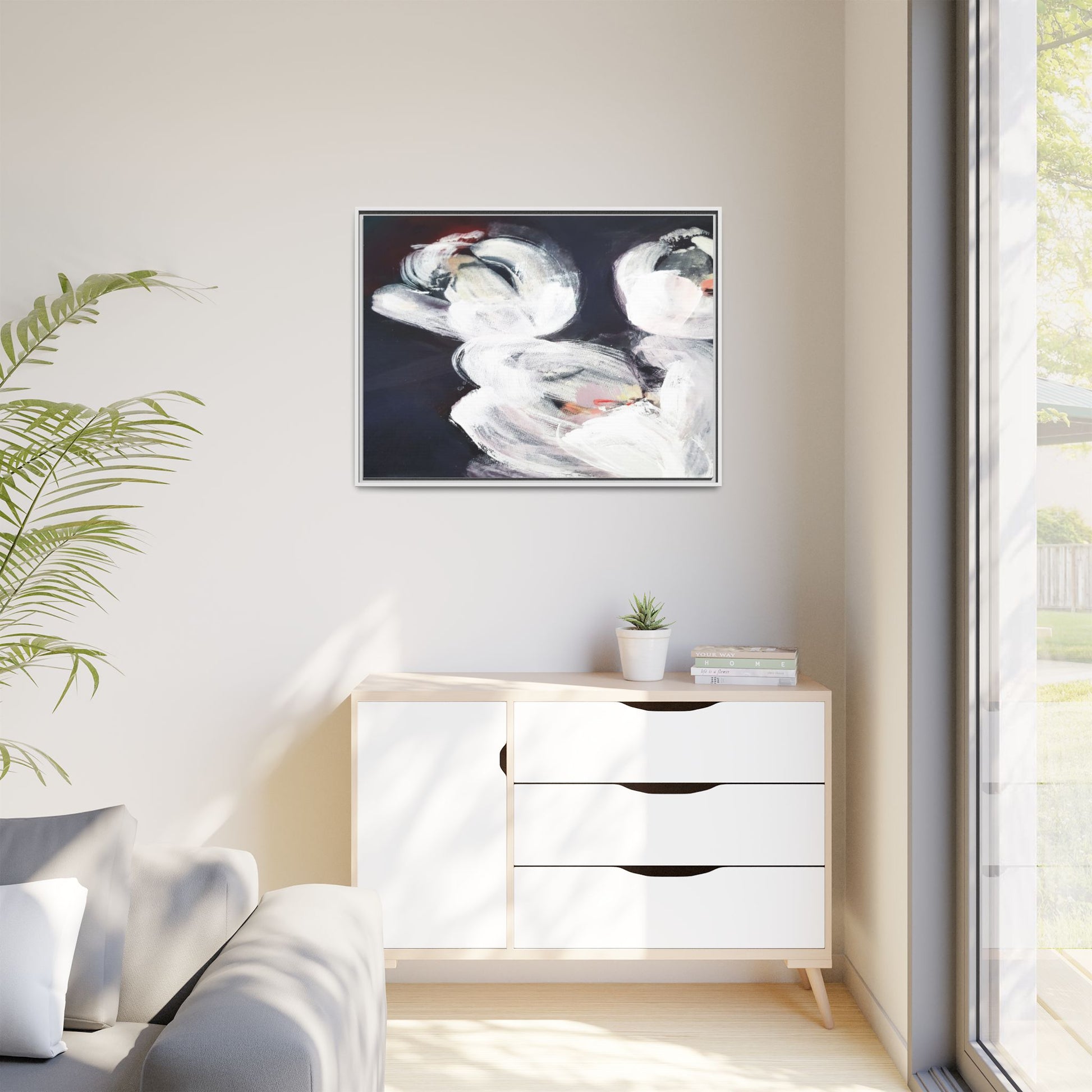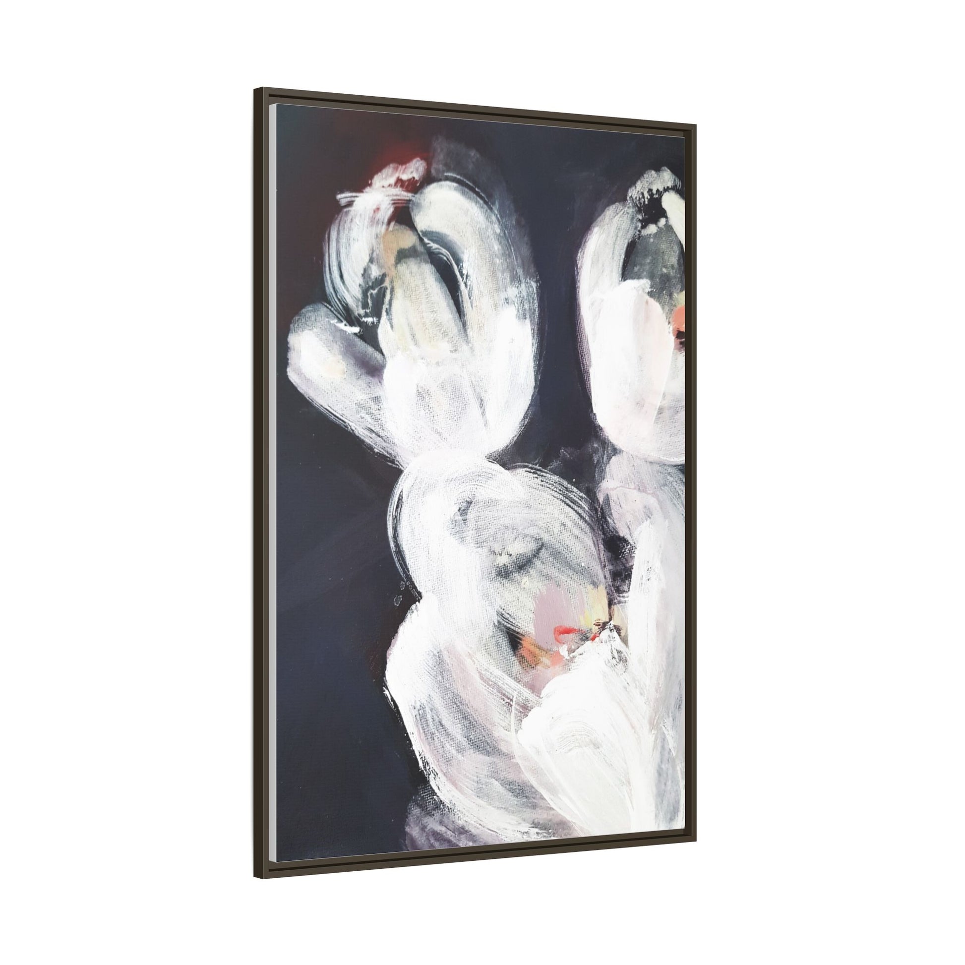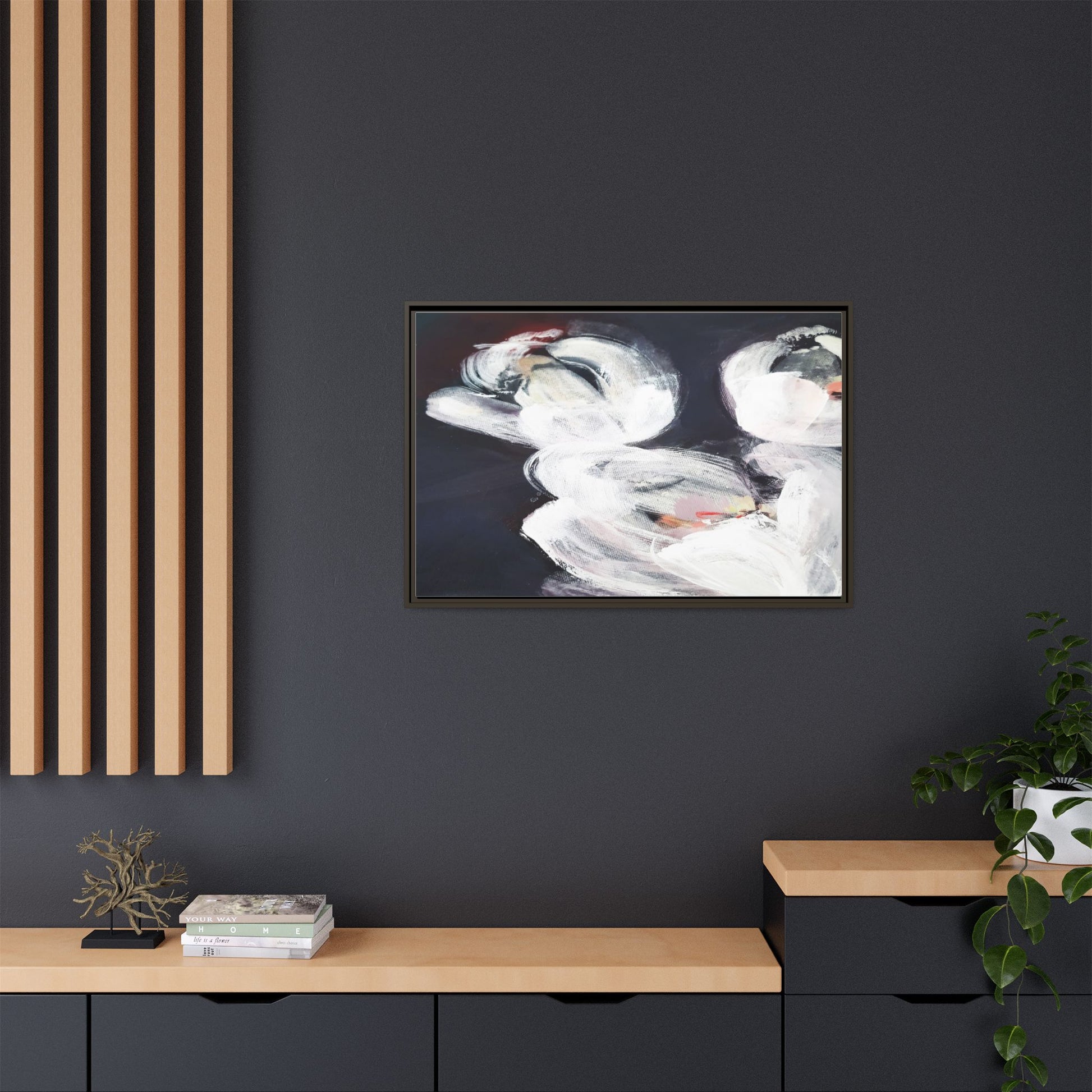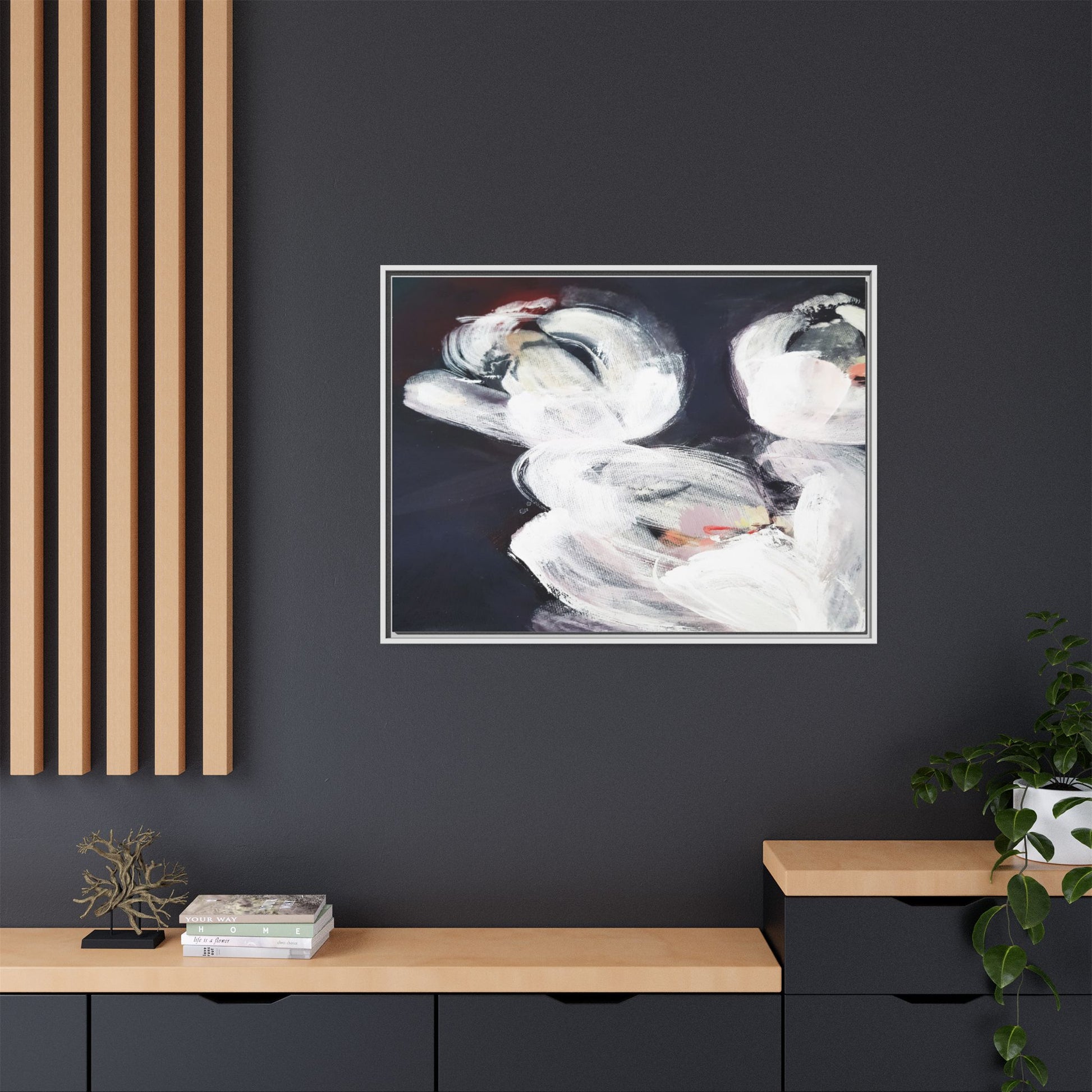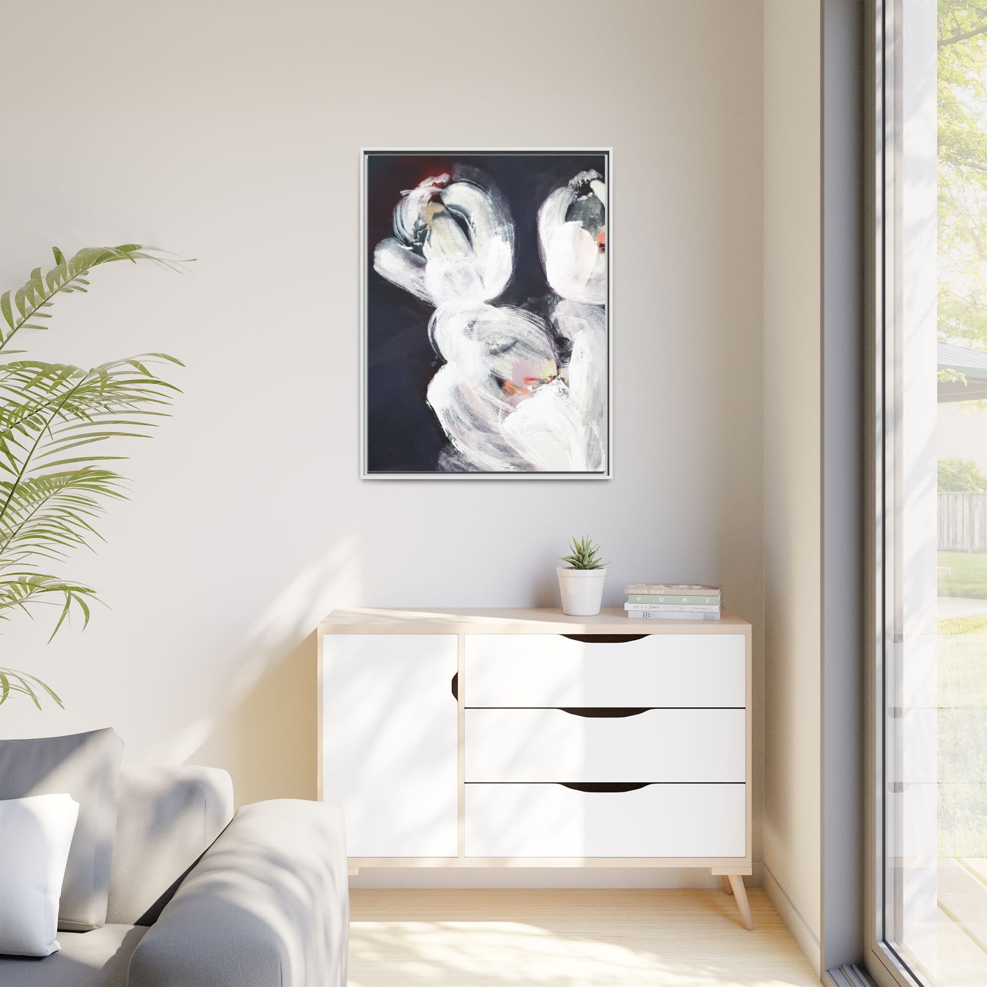 This captivating artwork is an abstract painting featuring soft, flowing white and gray forms against a dark background. The piece appears to be created using a blend of brushstrokes and blurred techniques, giving the image a sense of movement and ethereal quality. Predominantly white and light gray tones dominate the composition, with subtle hints of pale pink and red accents adding depth and intrigue. The brushwork is loose and expressive, creating organic shapes that seem to blend and flow into one another. The painting has a dreamy, almost impressionistic style that invites viewers to interpret the forms freely and emotionally.