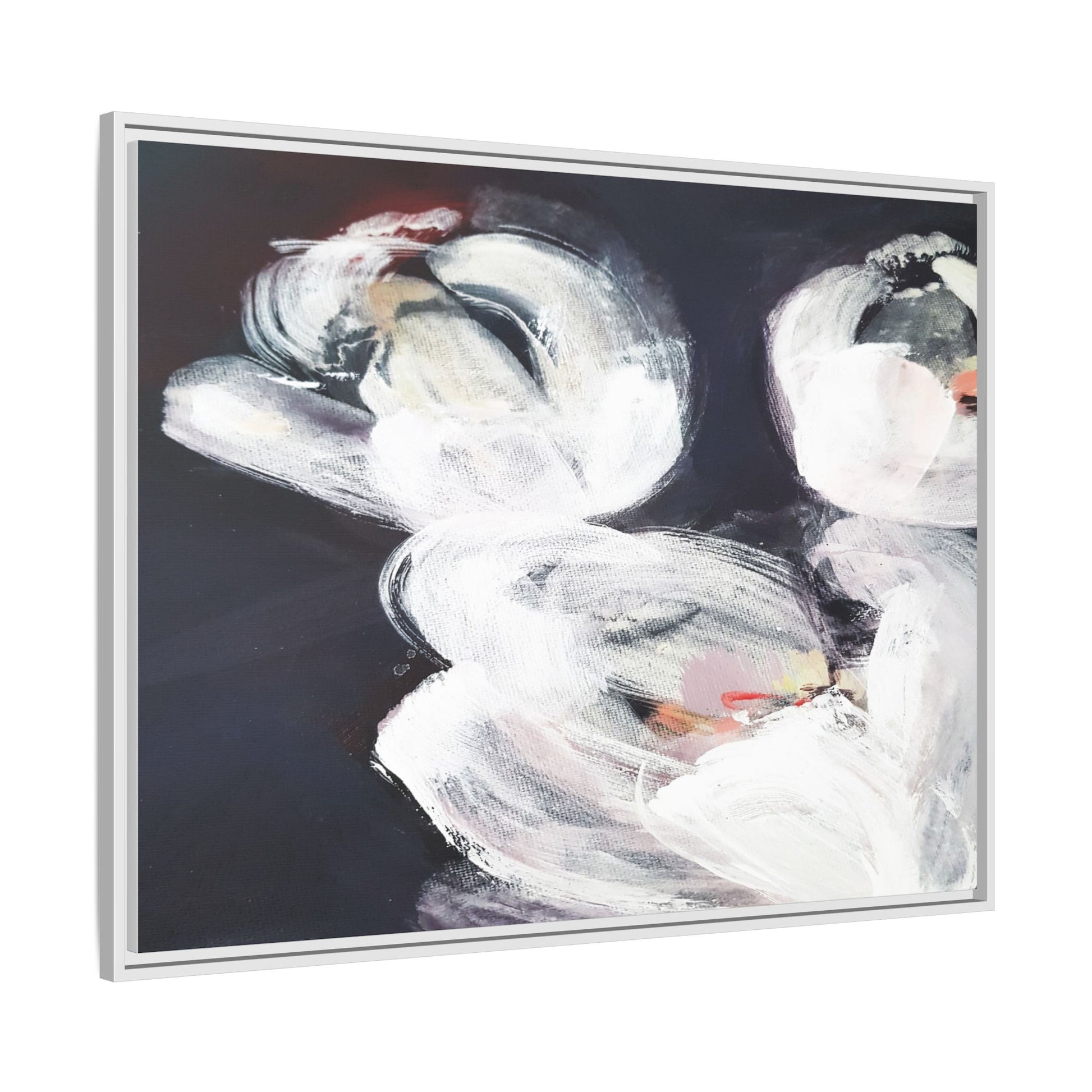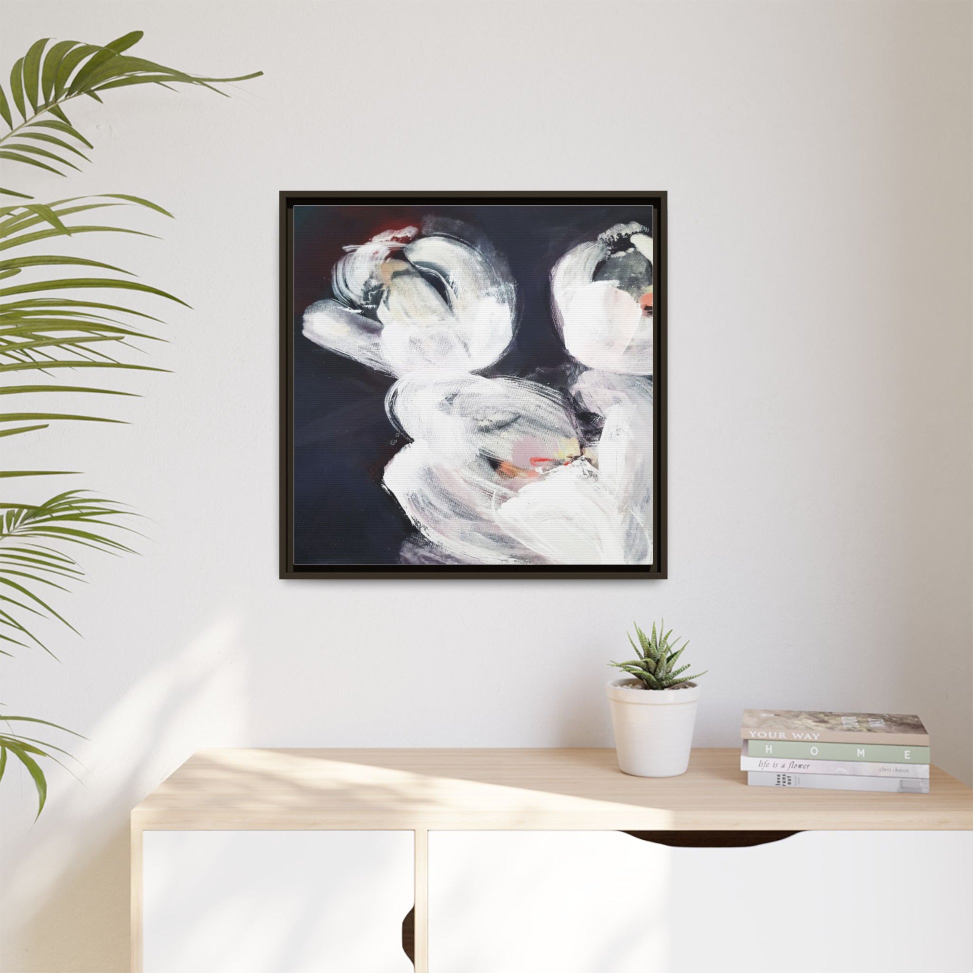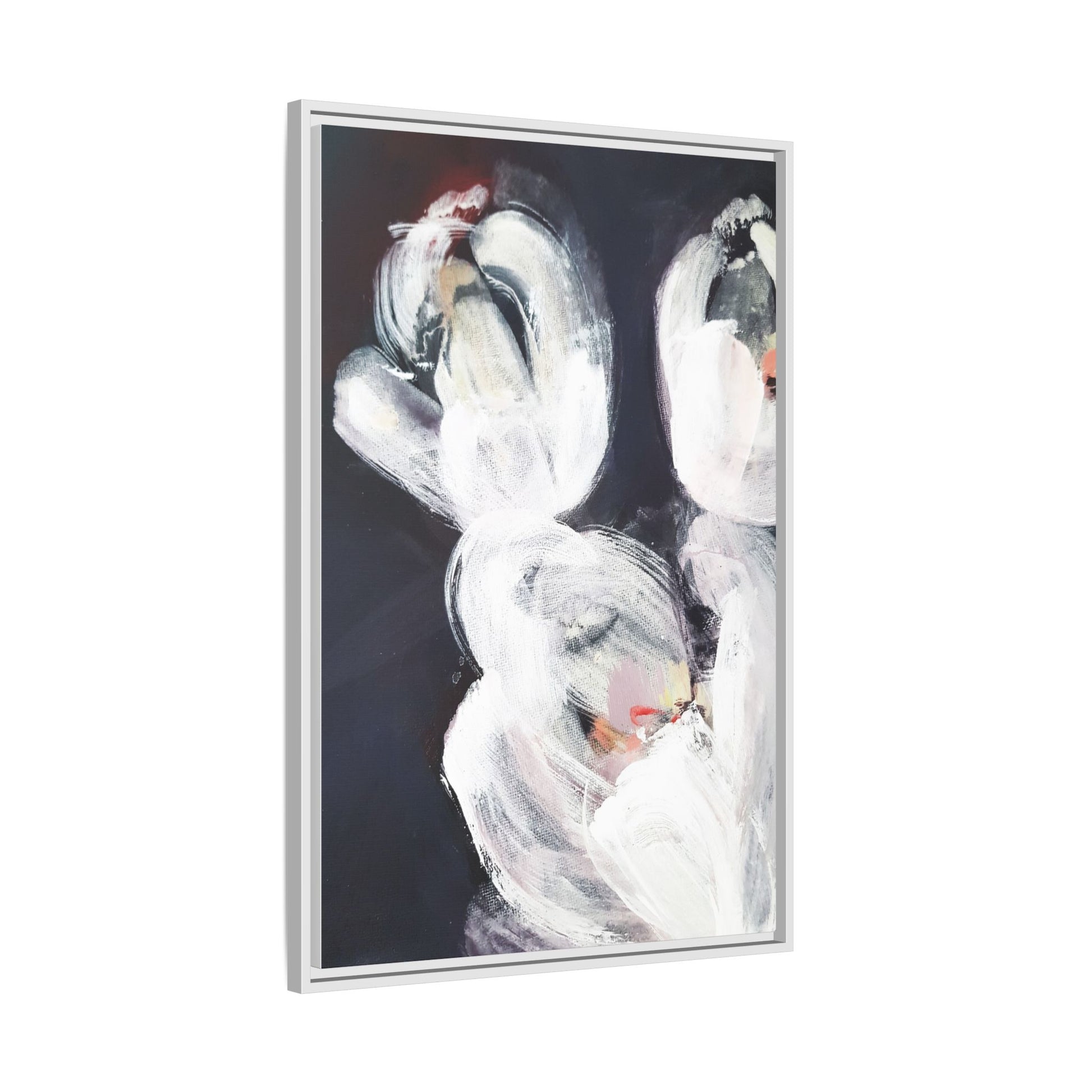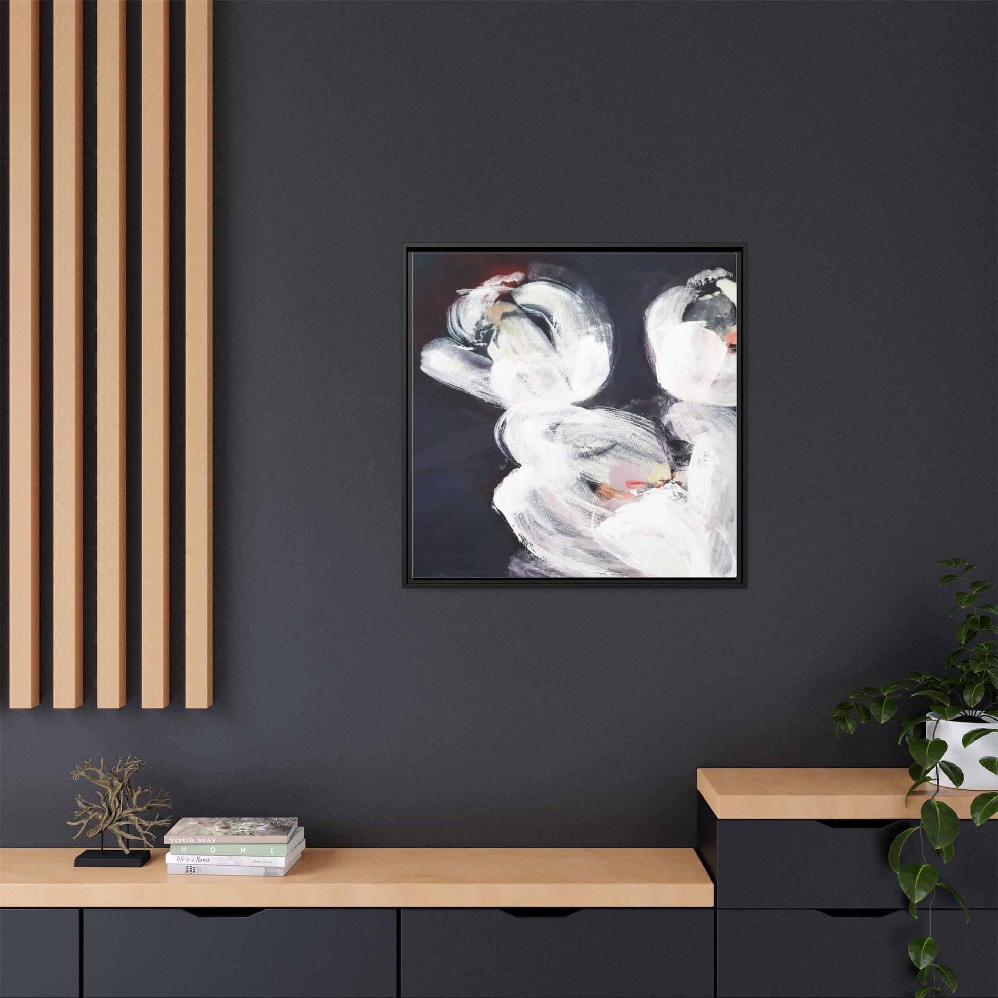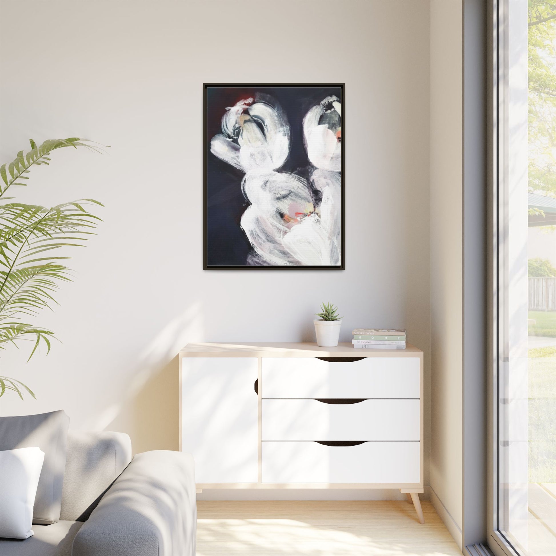 This captivating artwork is an abstract painting featuring soft, flowing white and gray forms against a dark background. The piece appears to be created using a blend of brushstrokes and blurred techniques, giving the image a sense of movement and ethereal quality. Predominantly white and light gray tones dominate the composition, with subtle hints of pale pink and red accents adding depth and intrigue. The brushwork is loose and expressive, creating organic shapes that seem to blend and flow into one another. The painting has a dreamy, almost impressionistic style that invites viewers to interpret the forms freely and emotionally.