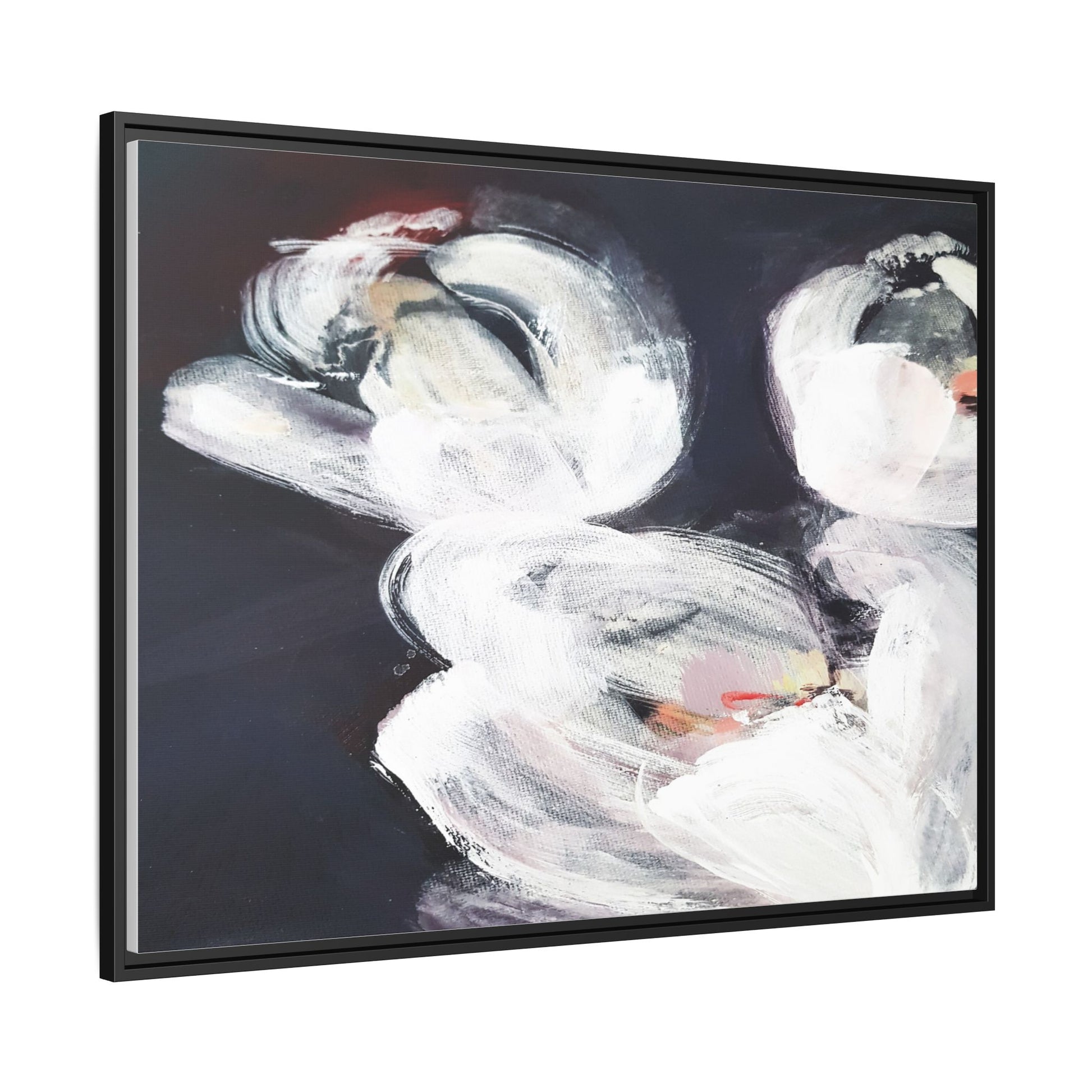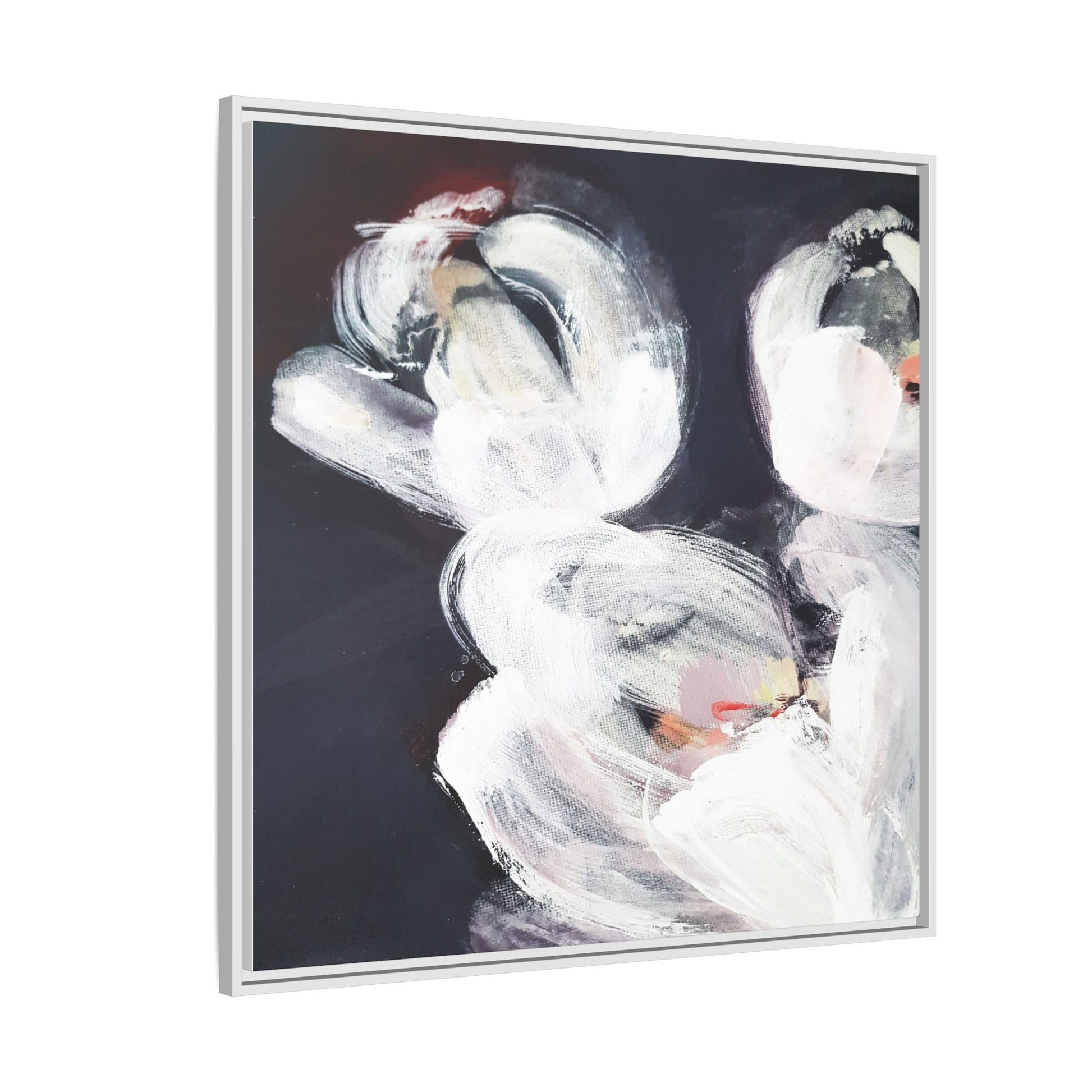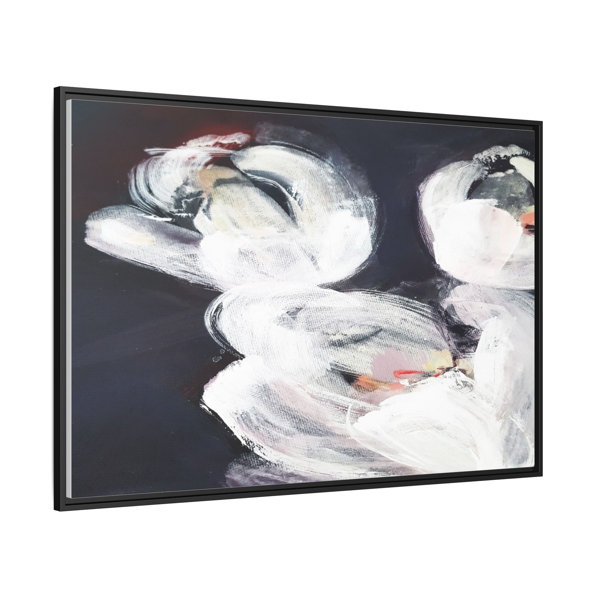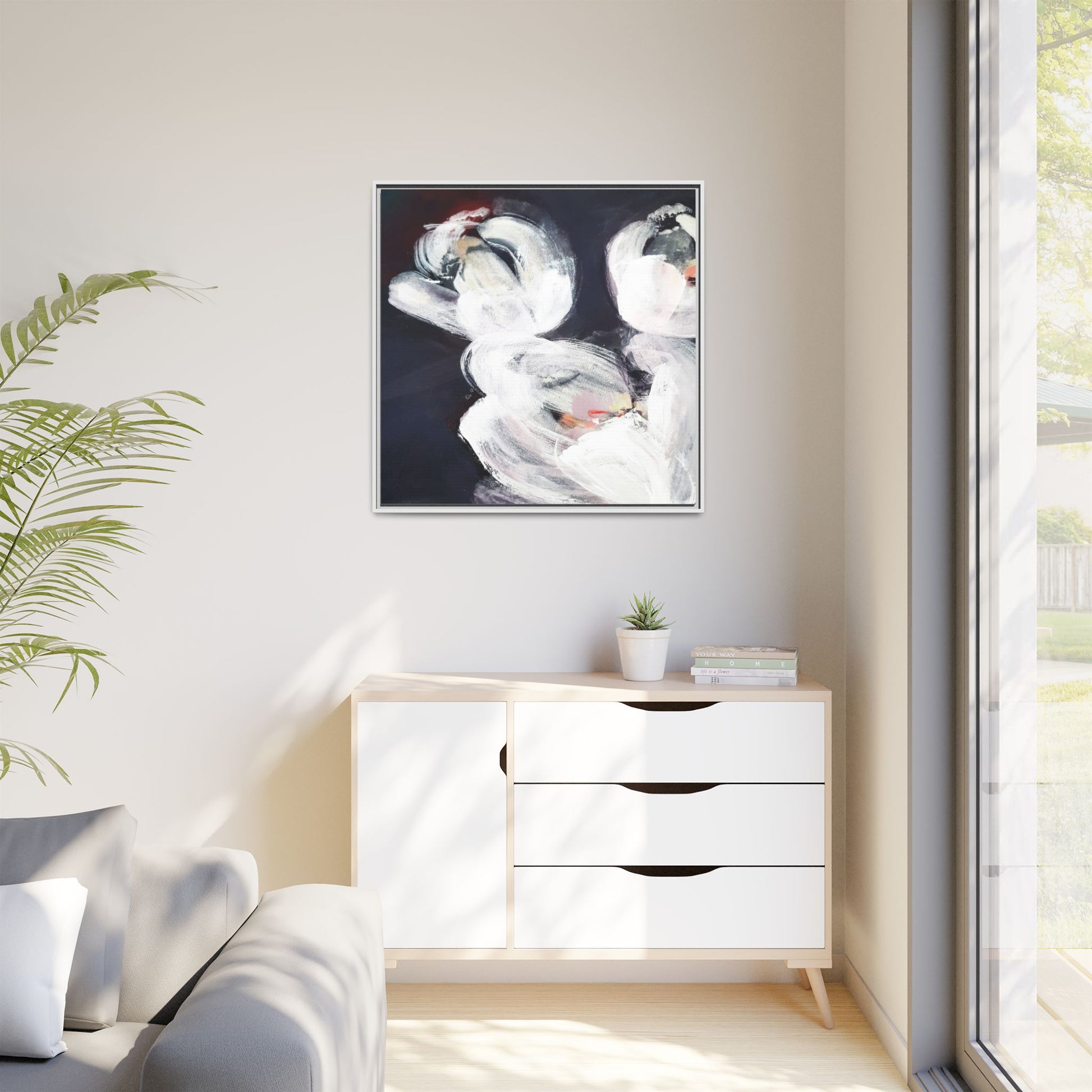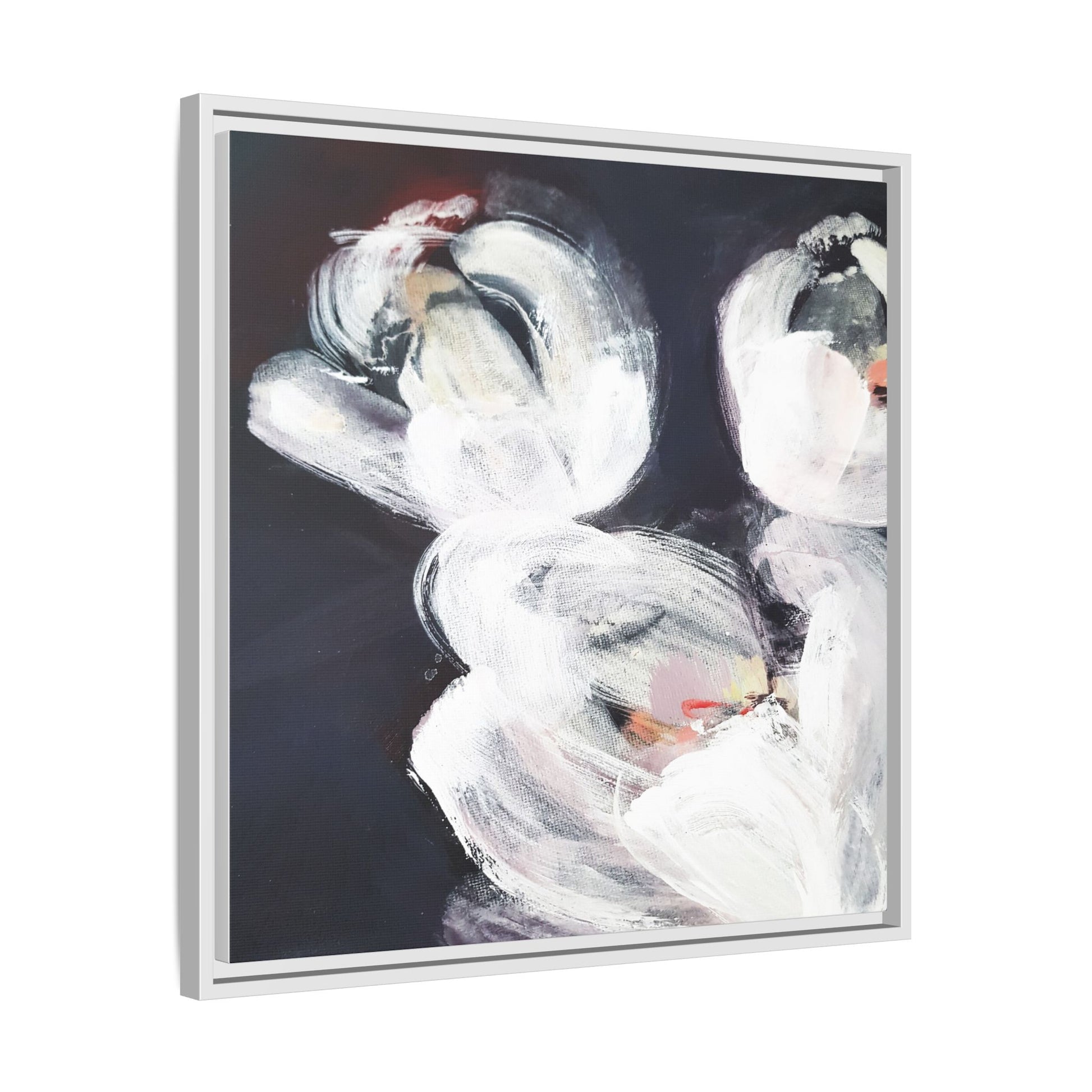 This captivating artwork is an abstract painting featuring soft, flowing white and gray forms against a dark background. The piece appears to be created using a blend of brushstrokes and blurred techniques, giving the image a sense of movement and ethereal quality. Predominantly white and light gray tones dominate the composition, with subtle hints of pale pink and red accents adding depth and intrigue. The brushwork is loose and expressive, creating organic shapes that seem to blend and flow into one another. The painting has a dreamy, almost impressionistic style that invites viewers to interpret the forms freely and emotionally.