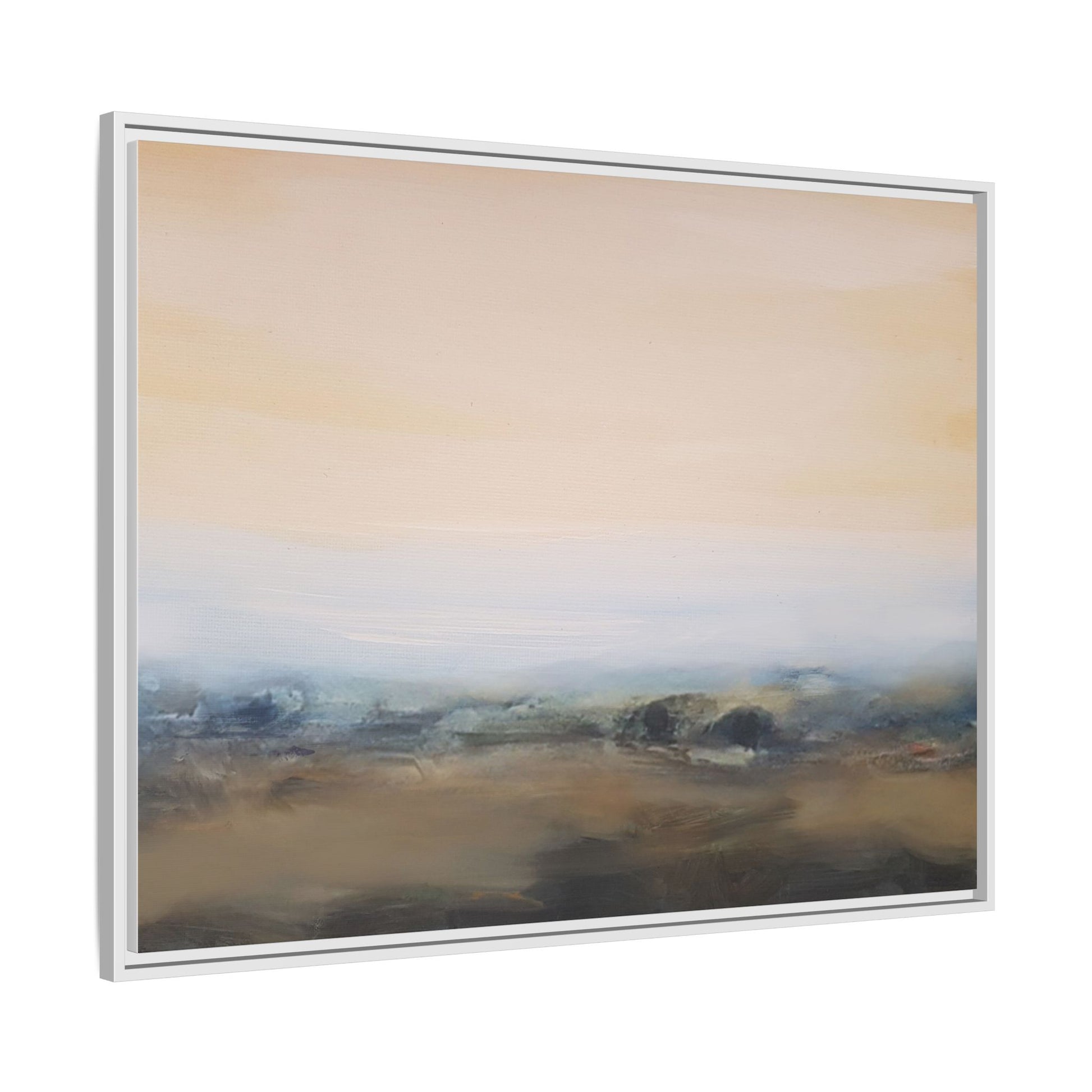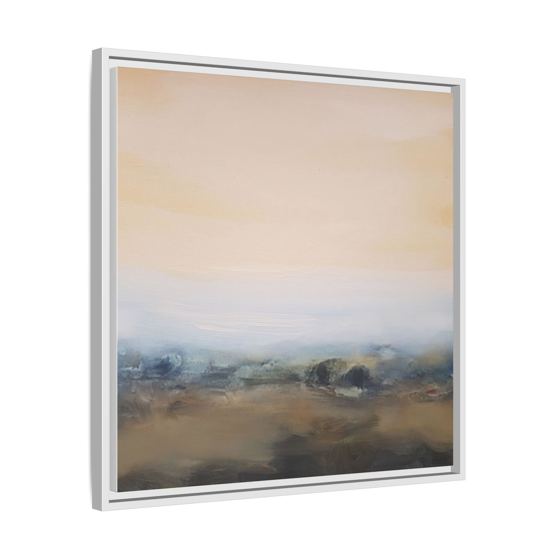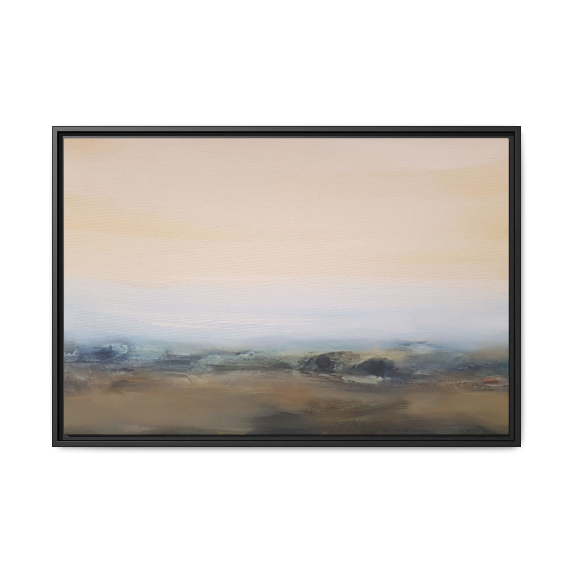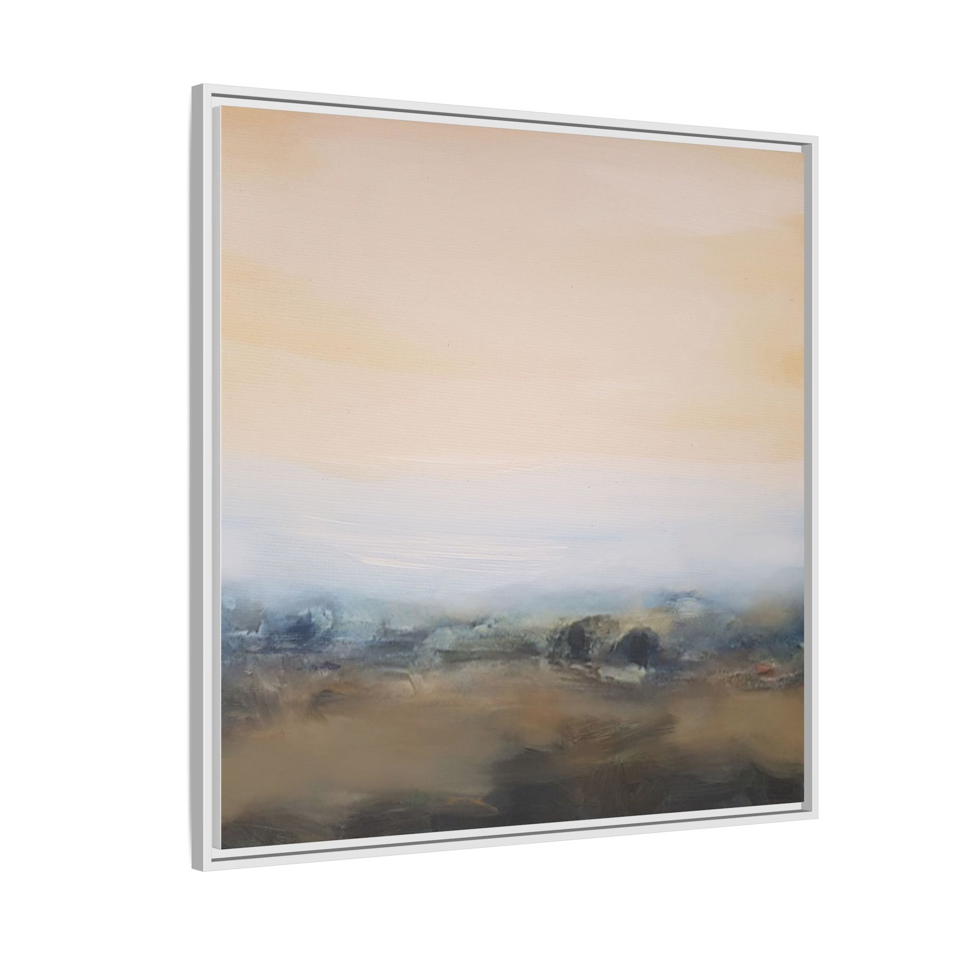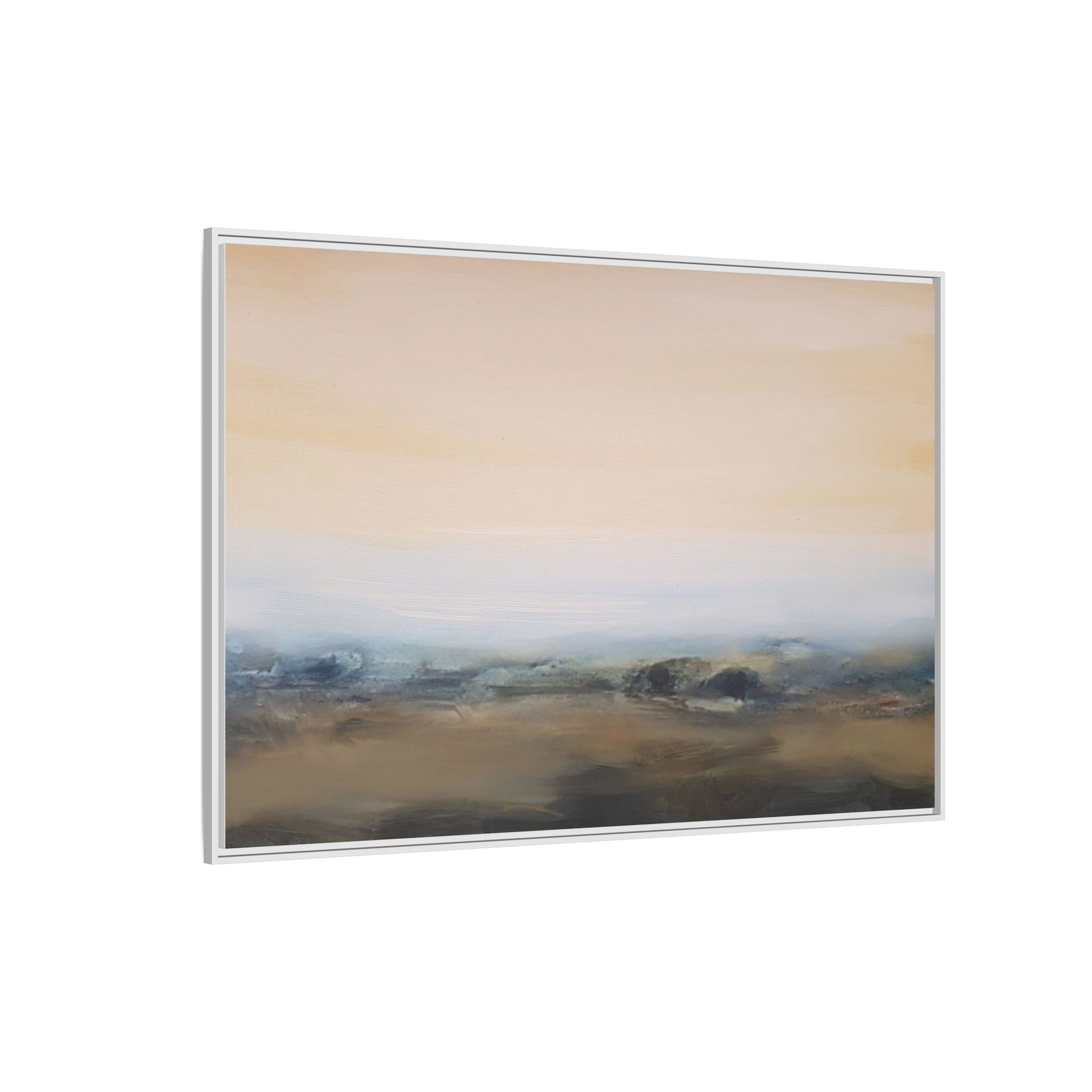 This evocative landscape painting captures a misty, ethereal scene characterized by soft, blended colors and a sense of atmospheric depth. The artwork features a muted color palette dominated by warm beiges, cool grays, and subtle blue-green tones that create a serene and contemplative mood. The composition is divided horizontally, with a pale, expansive sky occupying the upper two-thirds of the canvas and a hazy, undefined landscape stretching across the bottom third. Subtle brushstrokes and gentle color transitions give the painting a dreamlike quality, blurring the lines between sky, horizon, and land. The abstract nature of the piece invites viewers to interpret the landscape through their own emotional lens, suggesting a sense of tranquility and vast, open space.