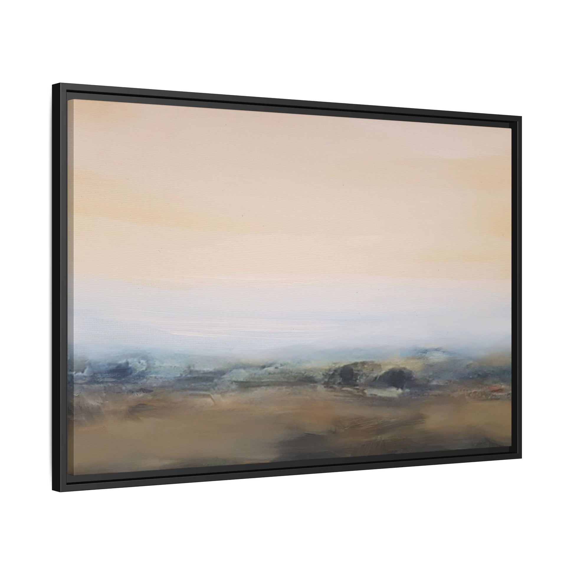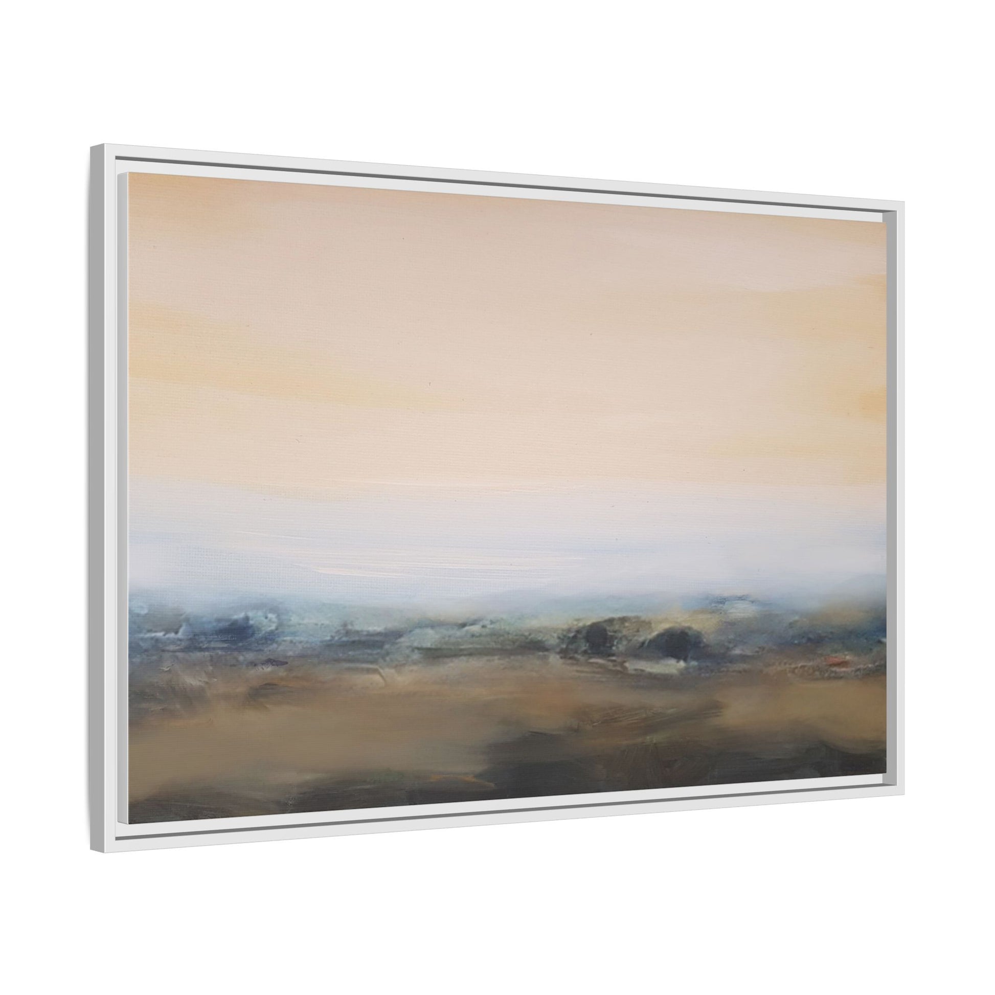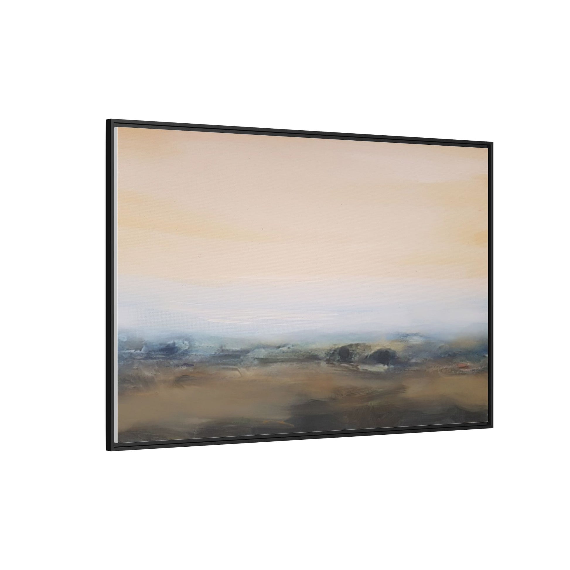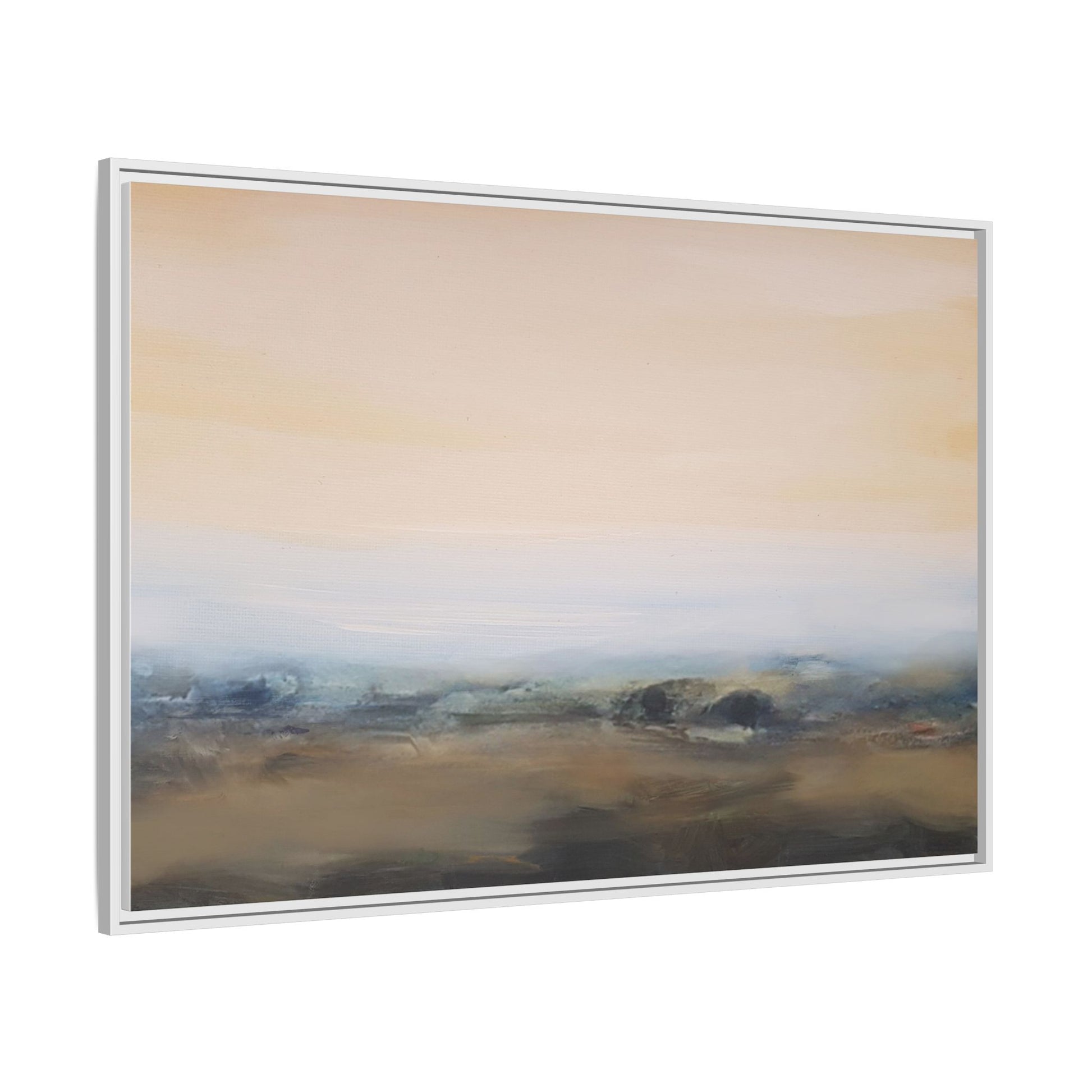This evocative landscape painting captures a misty, ethereal scene characterized by soft, blended colors and a sense of atmospheric depth. The artwork features a muted color palette dominated by warm beiges, cool grays, and subtle blue-green tones that create a serene and contemplative mood. The composition is divided horizontally, with a pale, expansive sky occupying the upper two-thirds of the canvas and a hazy, undefined landscape stretching across the bottom third. Subtle brushstrokes and gentle color transitions give the painting a dreamlike quality, blurring the lines between sky, horizon, and land. The abstract nature of the piece invites viewers to interpret the landscape through their own emotional lens, suggesting a sense of tranquility and vast, open space.
