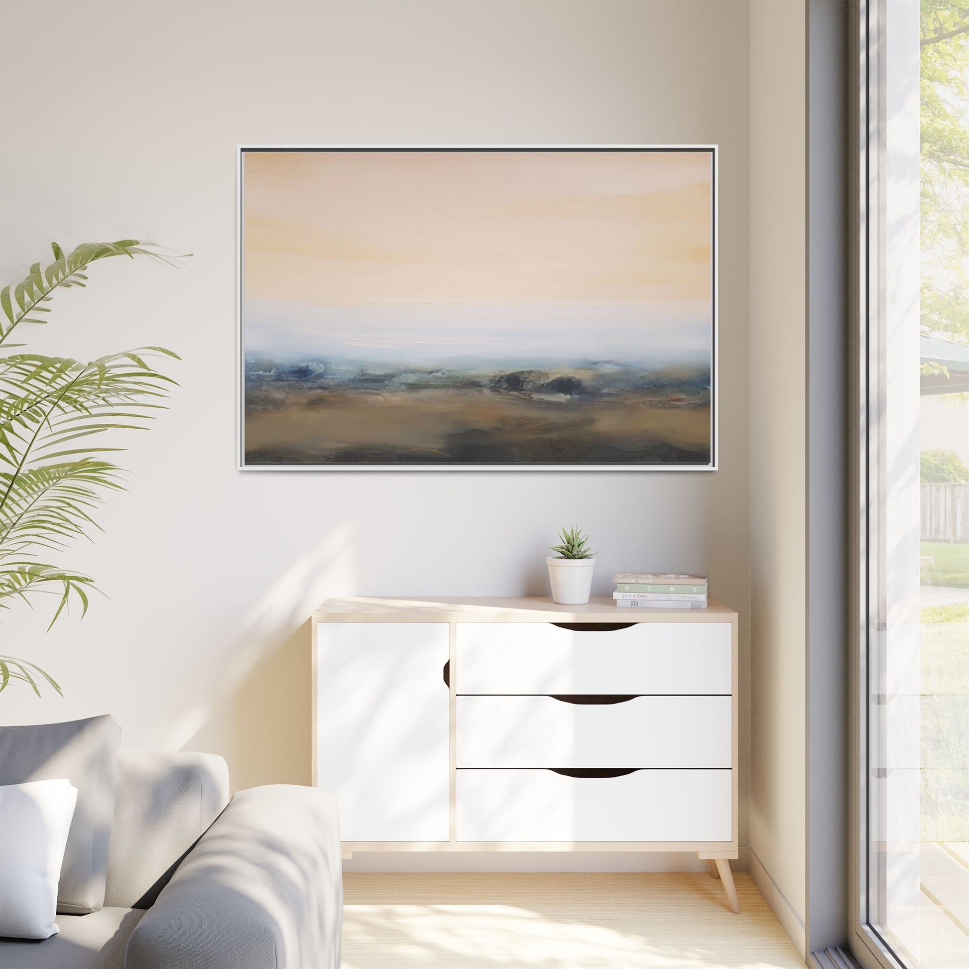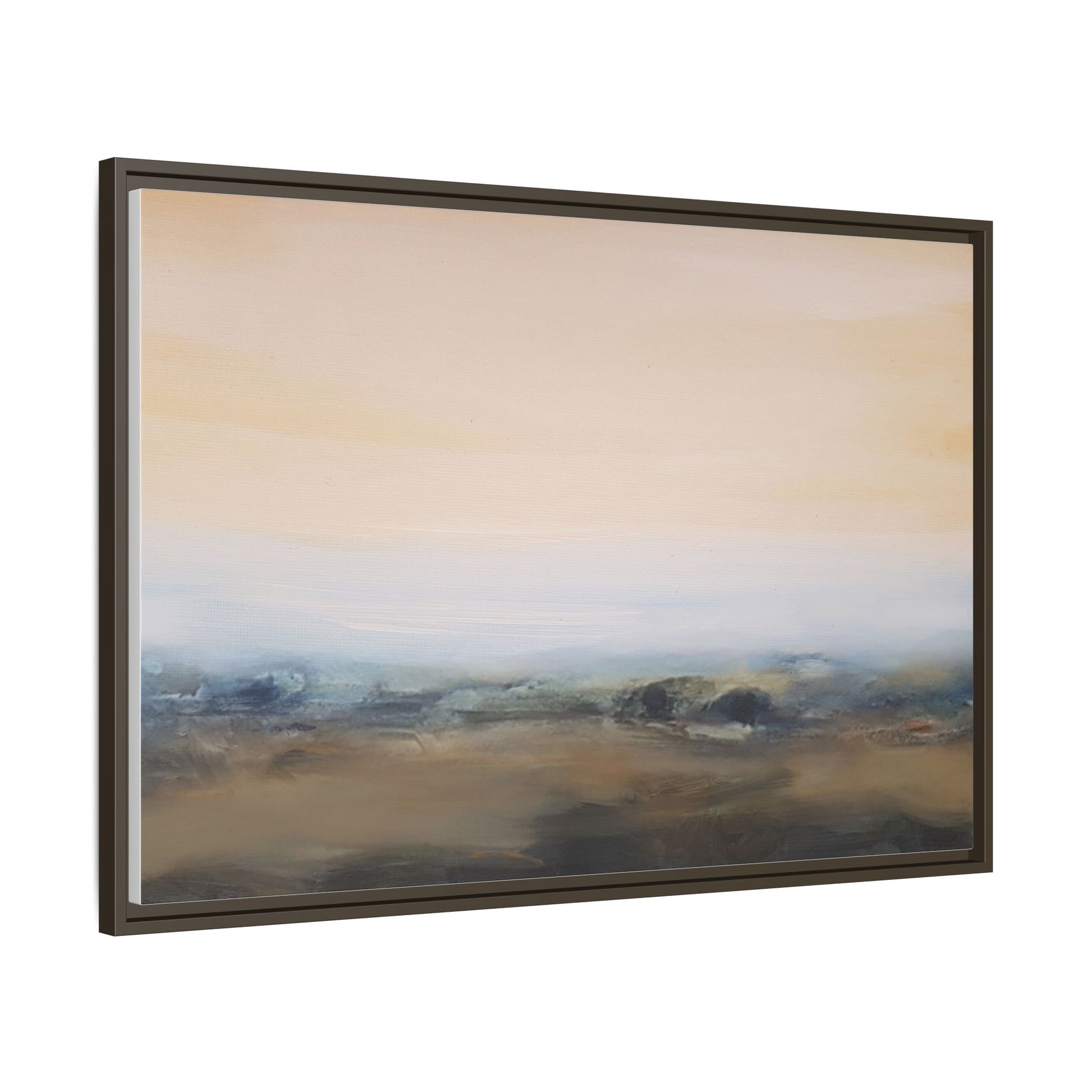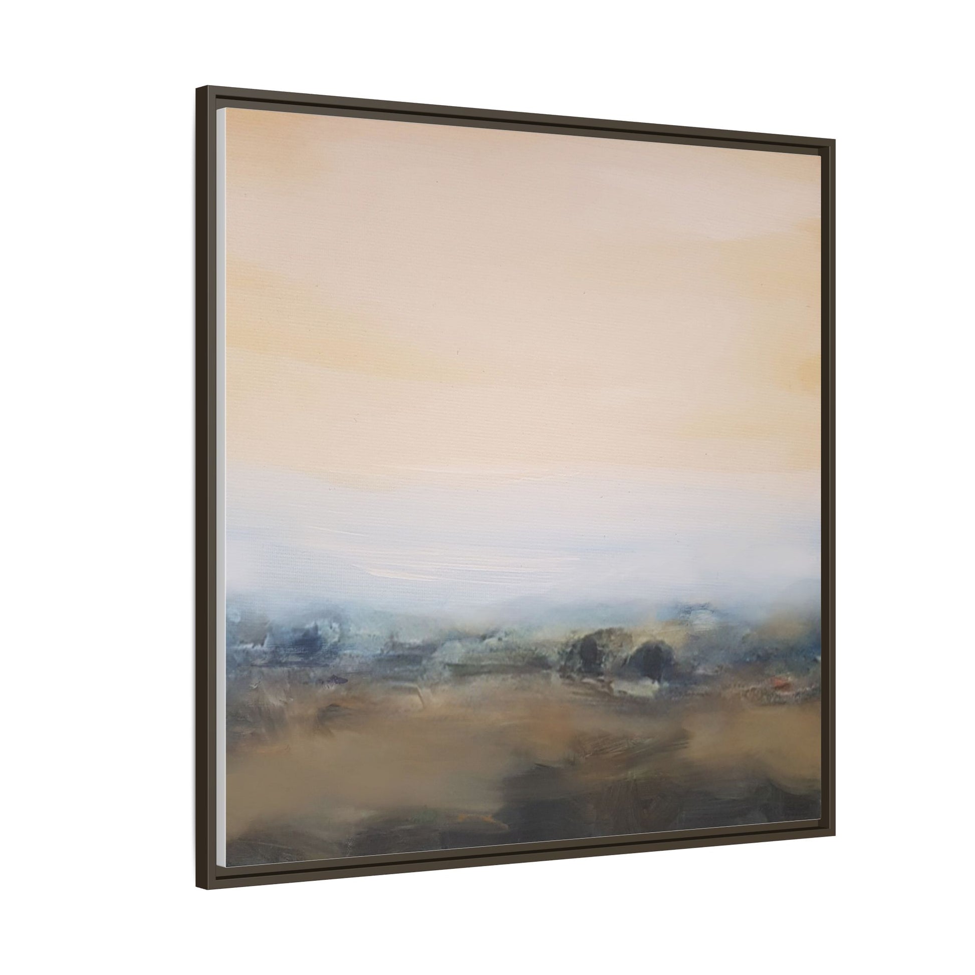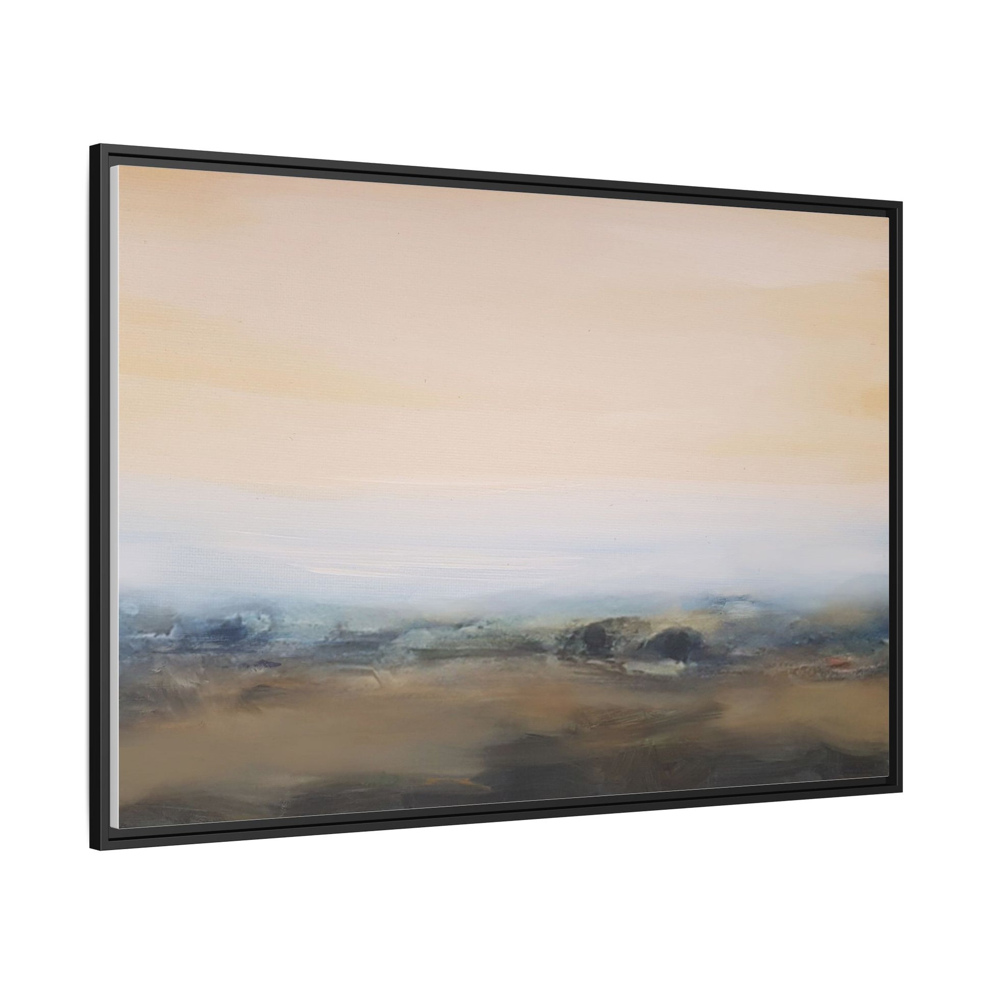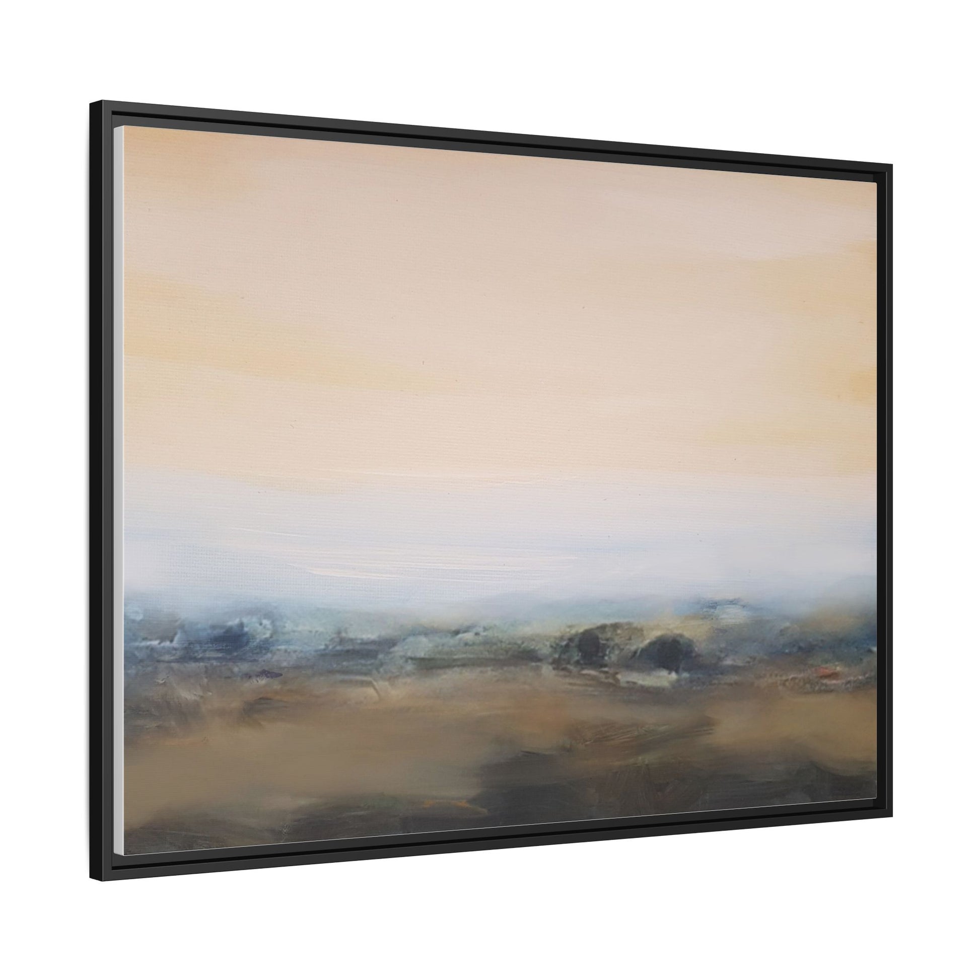 This evocative landscape painting captures a misty, ethereal scene characterized by soft, blended colors and a sense of atmospheric depth. The artwork features a muted color palette dominated by warm beiges, cool grays, and subtle blue-green tones that create a serene and contemplative mood. The composition is divided horizontally, with a pale, expansive sky occupying the upper two-thirds of the canvas and a hazy, undefined landscape stretching across the bottom third. Subtle brushstrokes and gentle color transitions give the painting a dreamlike quality, blurring the lines between sky, horizon, and land. The abstract nature of the piece invites viewers to interpret the landscape through their own emotional lens, suggesting a sense of tranquility and vast, open space.