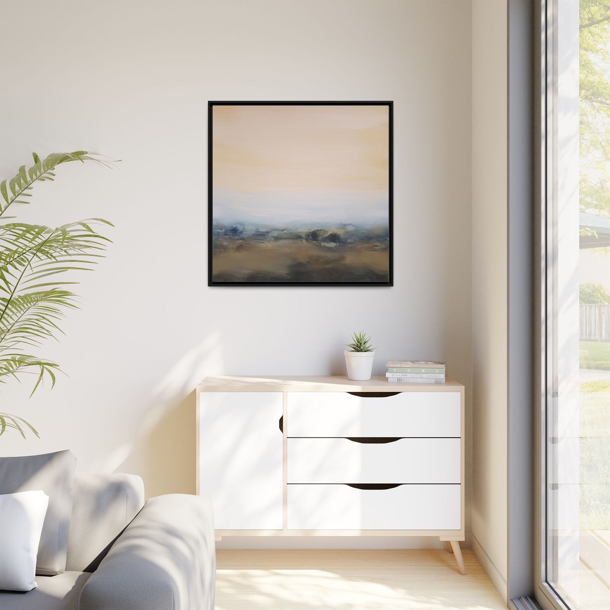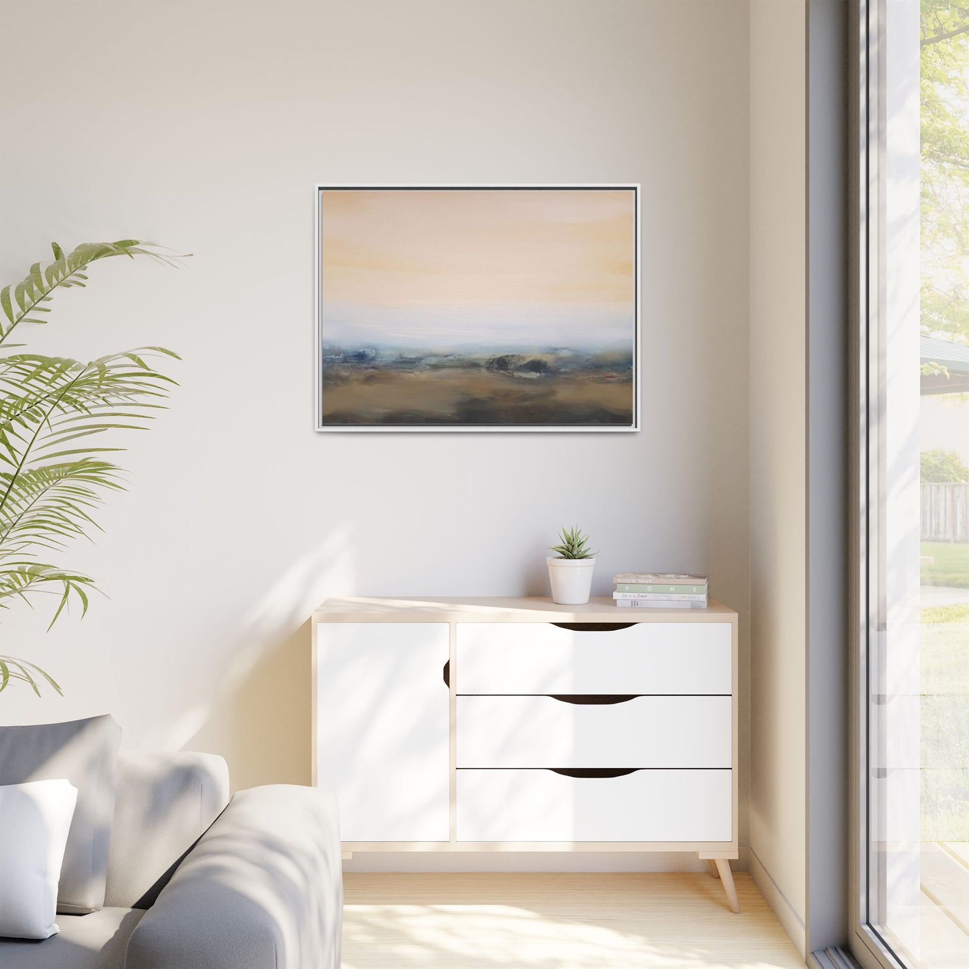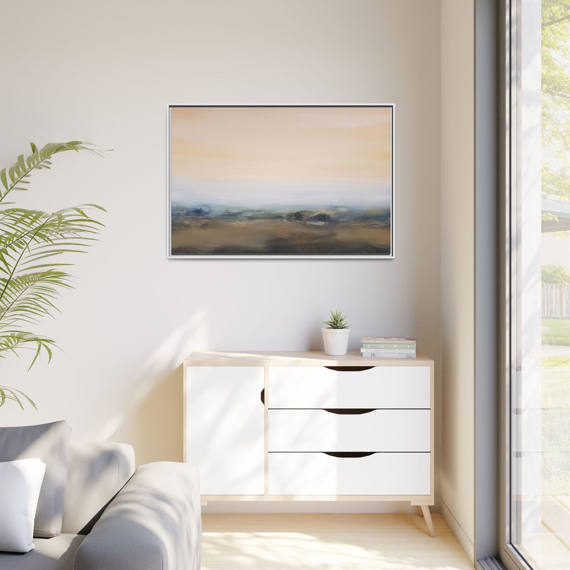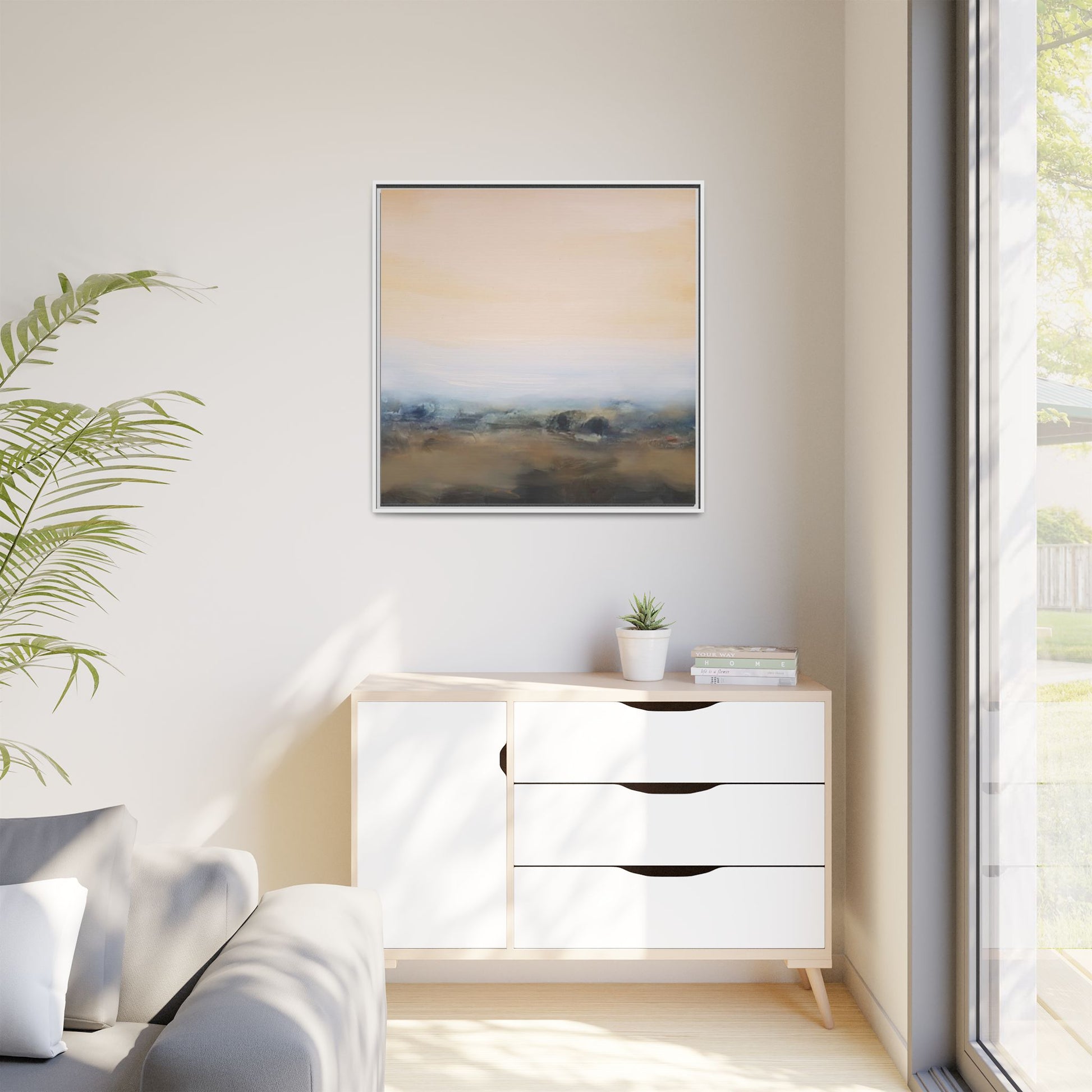 This evocative landscape painting captures a misty, ethereal scene characterized by soft, blended colors and a sense of atmospheric depth. The artwork features a muted color palette dominated by warm beiges, cool grays, and subtle blue-green tones that create a serene and contemplative mood. The composition is divided horizontally, with a pale, expansive sky occupying the upper two-thirds of the canvas and a hazy, undefined landscape stretching across the bottom third. Subtle brushstrokes and gentle color transitions give the painting a dreamlike quality, blurring the lines between sky, horizon, and land. The abstract nature of the piece invites viewers to interpret the landscape through their own emotional lens, suggesting a sense of tranquility and vast, open space.