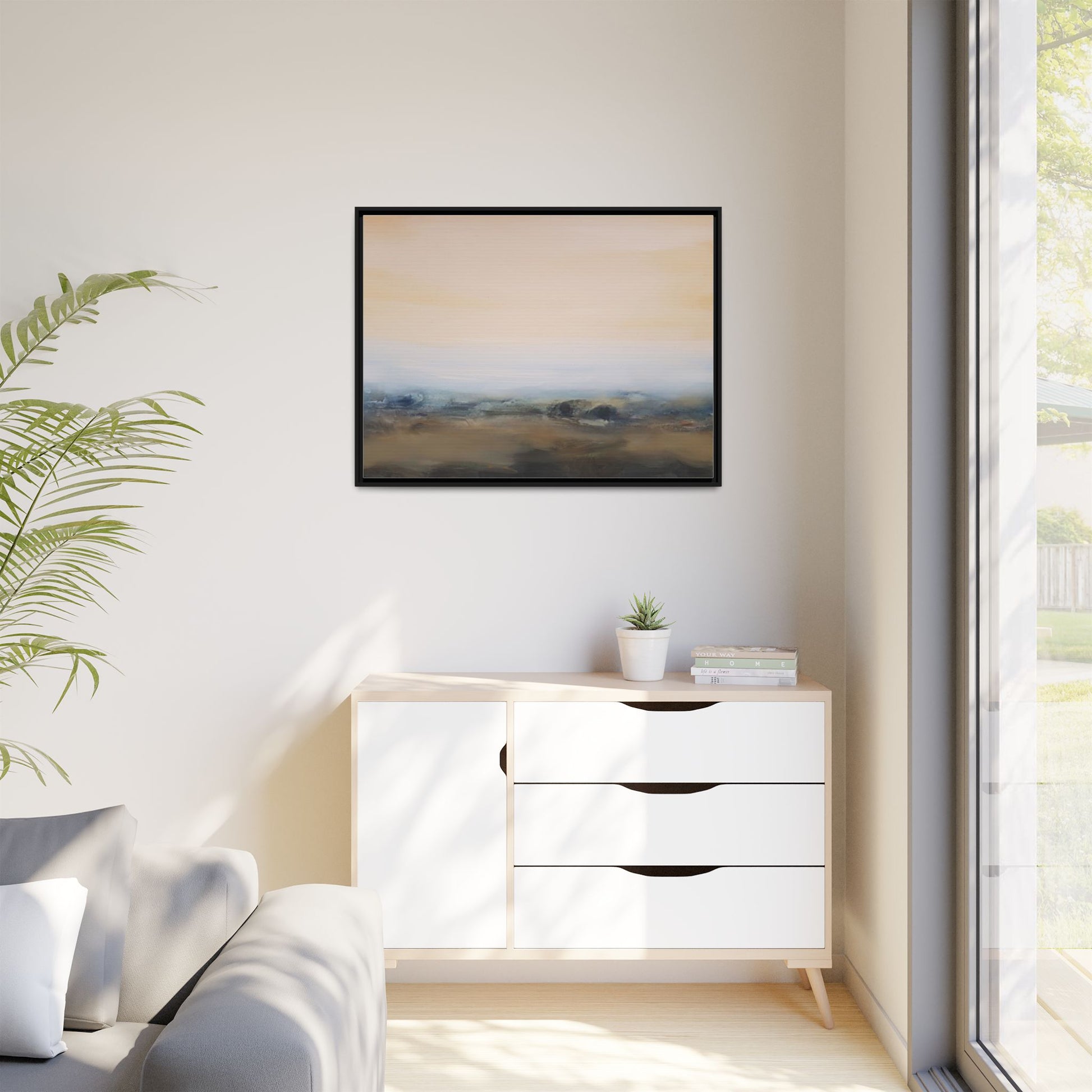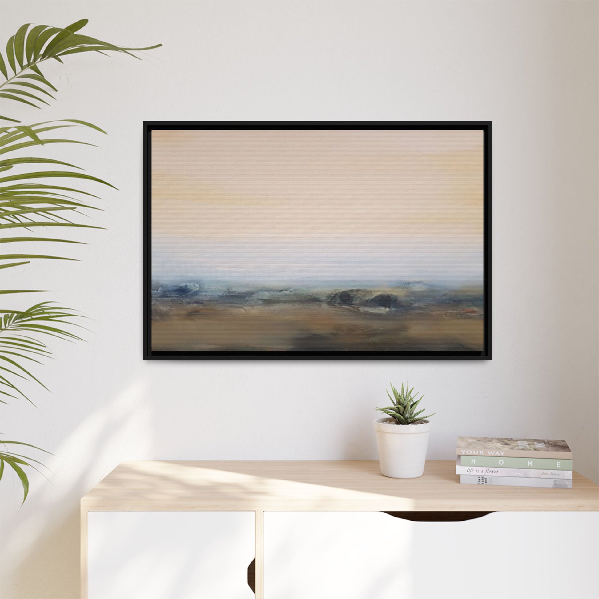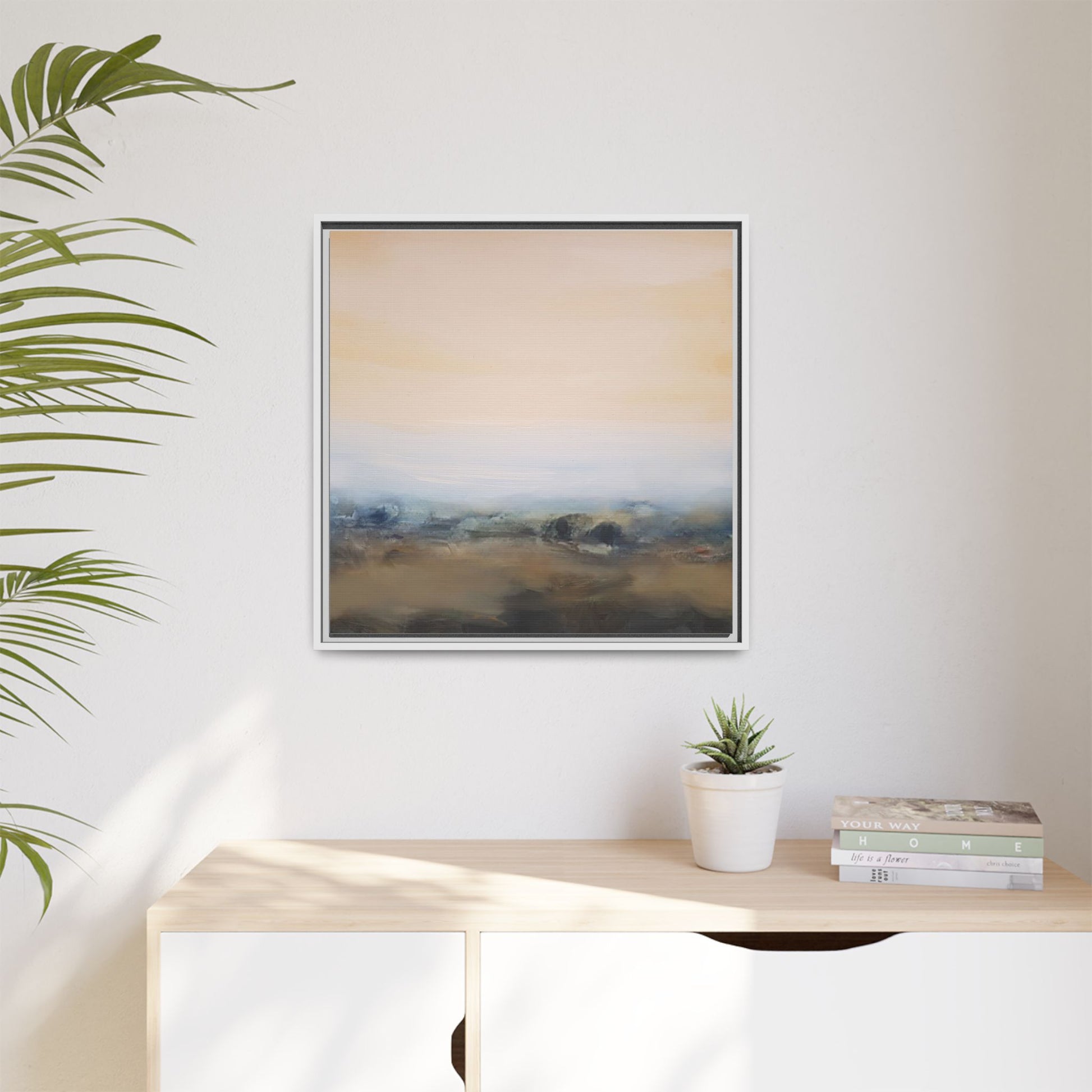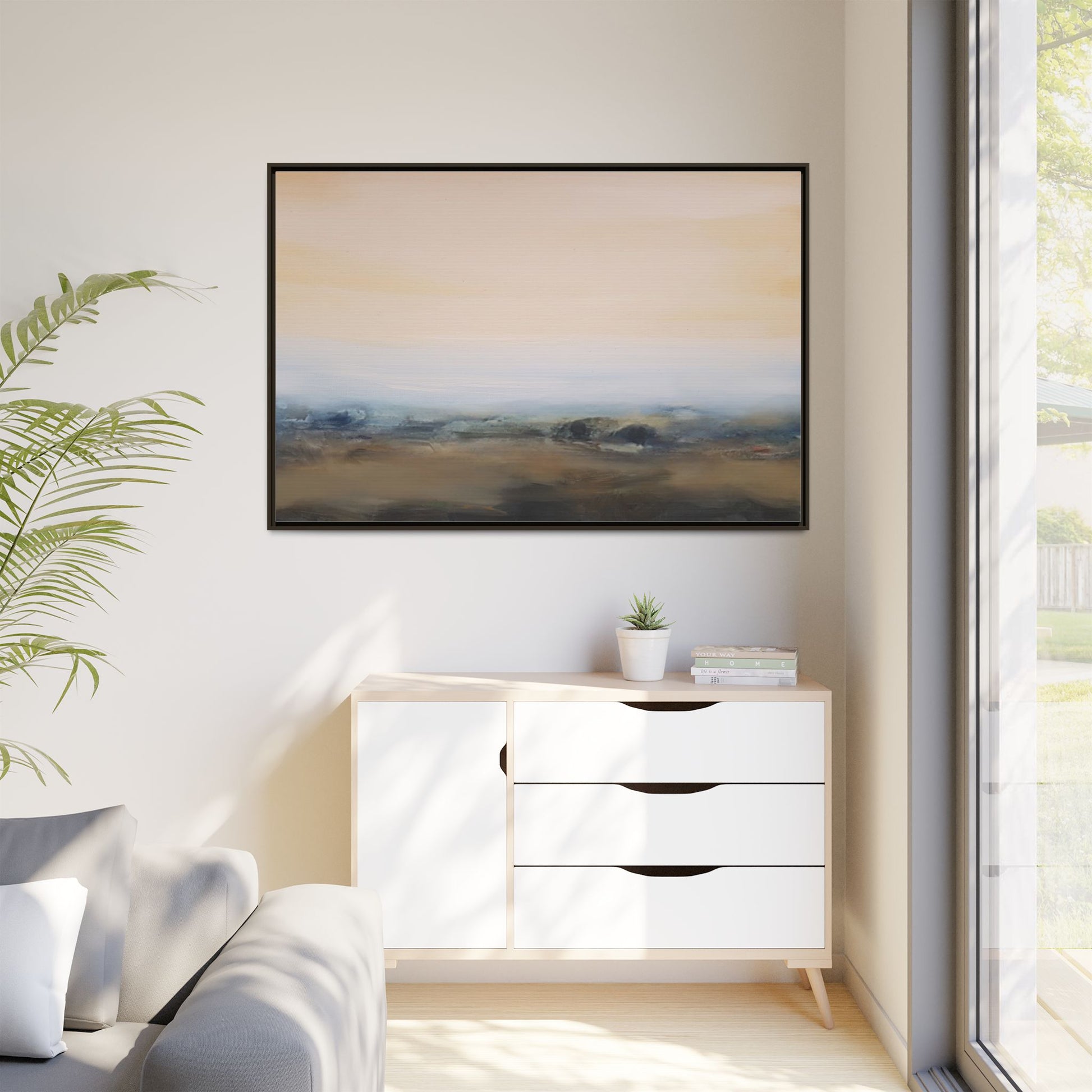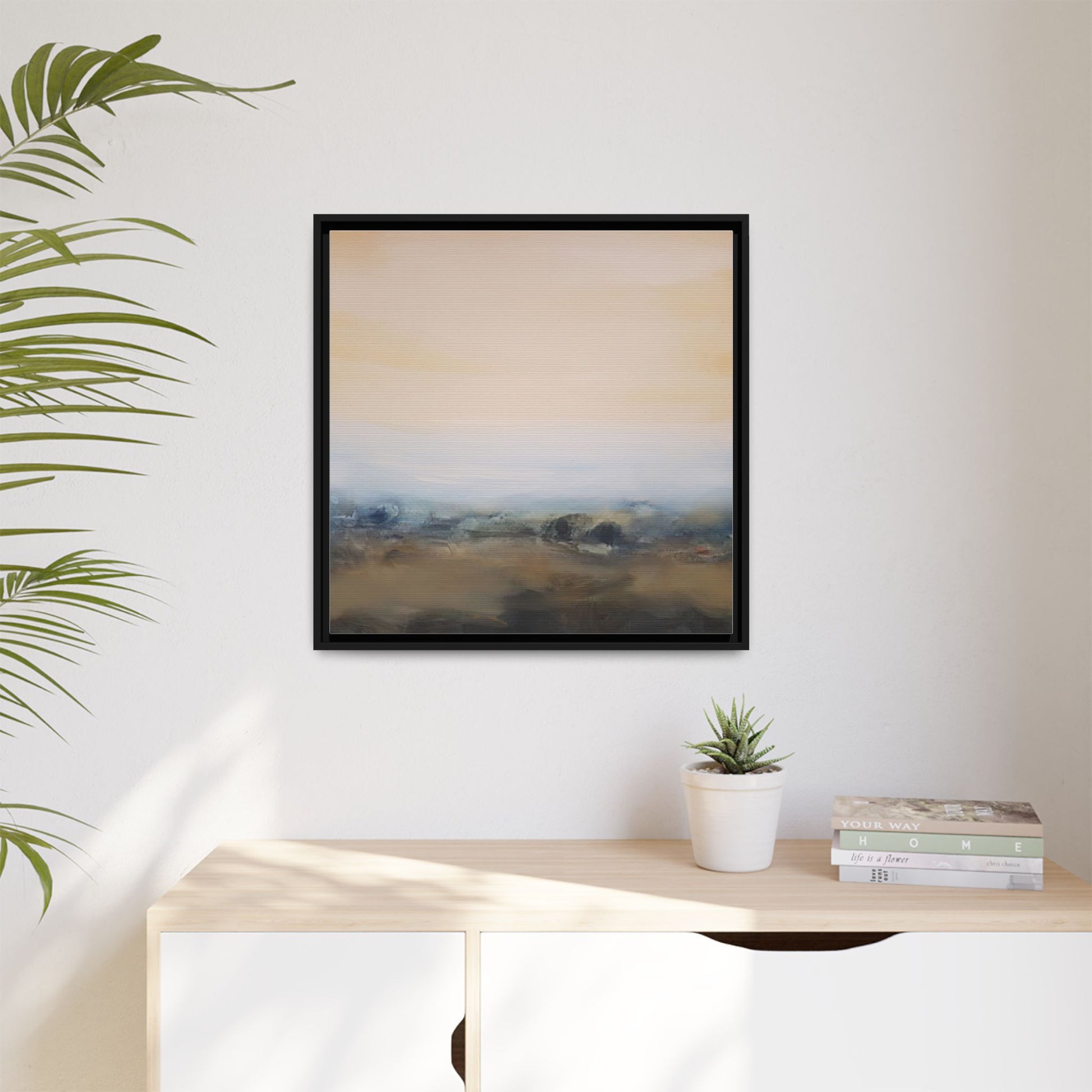 This evocative landscape painting captures a misty, ethereal scene characterized by soft, blended colors and a sense of atmospheric depth. The artwork features a muted color palette dominated by warm beiges, cool grays, and subtle blue-green tones that create a serene and contemplative mood. The composition is divided horizontally, with a pale, expansive sky occupying the upper two-thirds of the canvas and a hazy, undefined landscape stretching across the bottom third. Subtle brushstrokes and gentle color transitions give the painting a dreamlike quality, blurring the lines between sky, horizon, and land. The abstract nature of the piece invites viewers to interpret the landscape through their own emotional lens, suggesting a sense of tranquility and vast, open space.