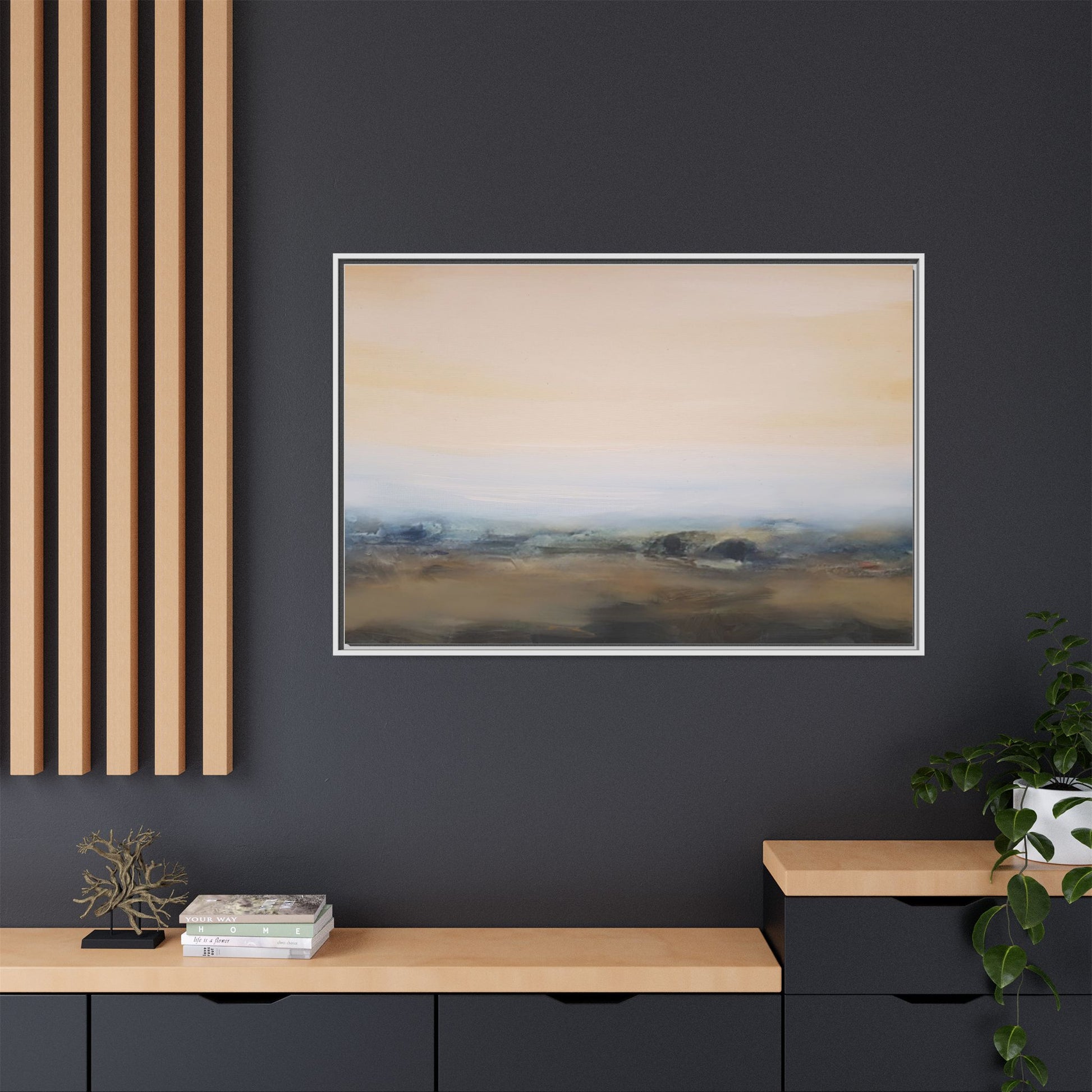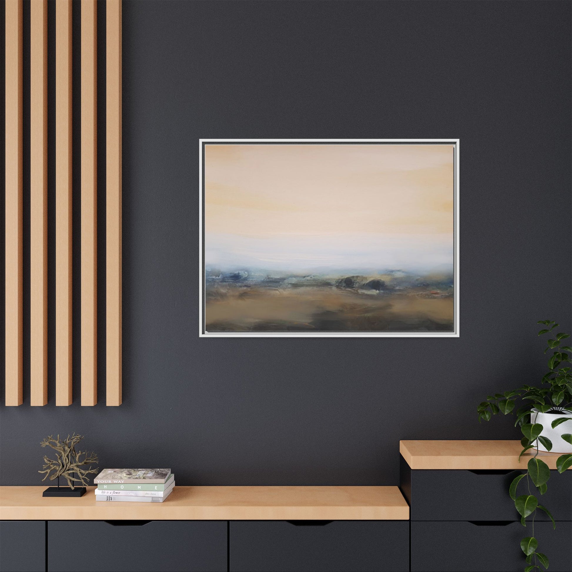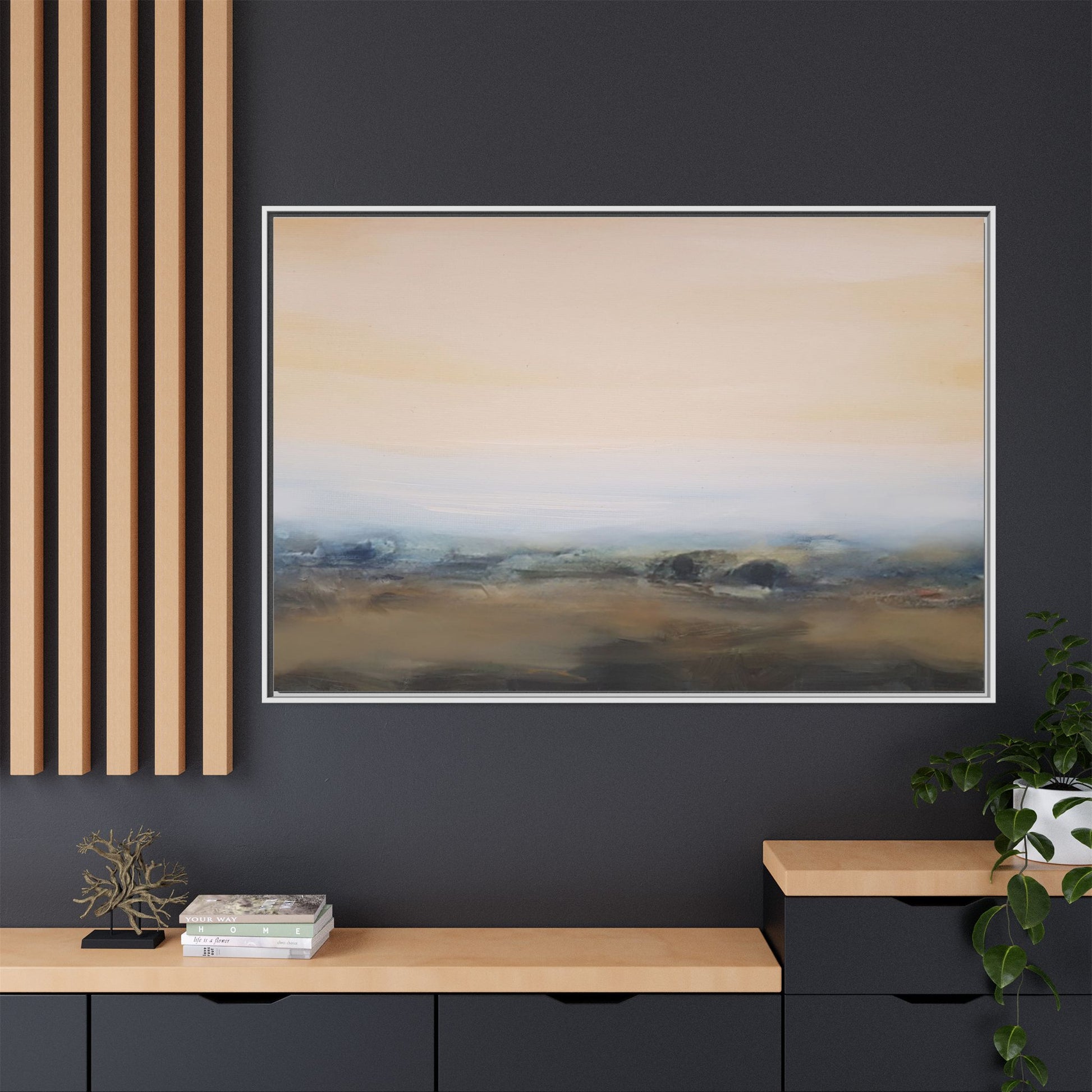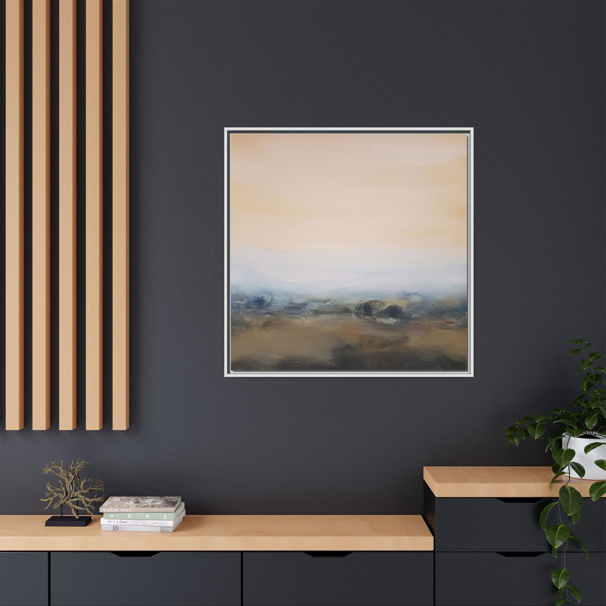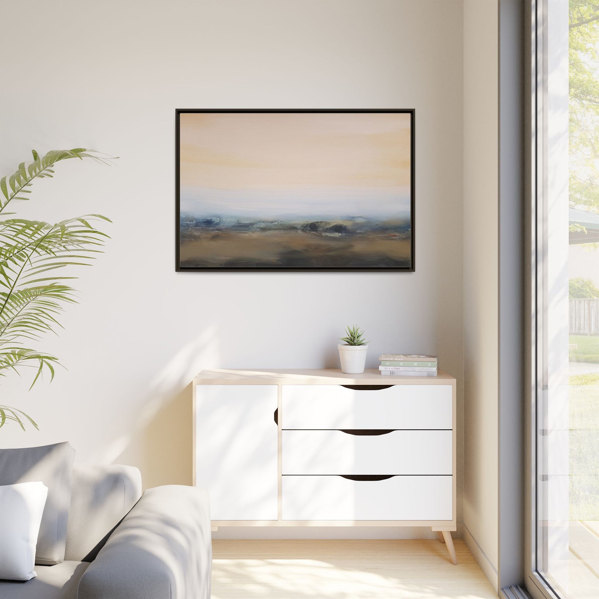 This evocative landscape painting captures a misty, ethereal scene characterized by soft, blended colors and a sense of atmospheric depth. The artwork features a muted color palette dominated by warm beiges, cool grays, and subtle blue-green tones that create a serene and contemplative mood. The composition is divided horizontally, with a pale, expansive sky occupying the upper two-thirds of the canvas and a hazy, undefined landscape stretching across the bottom third. Subtle brushstrokes and gentle color transitions give the painting a dreamlike quality, blurring the lines between sky, horizon, and land. The abstract nature of the piece invites viewers to interpret the landscape through their own emotional lens, suggesting a sense of tranquility and vast, open space.