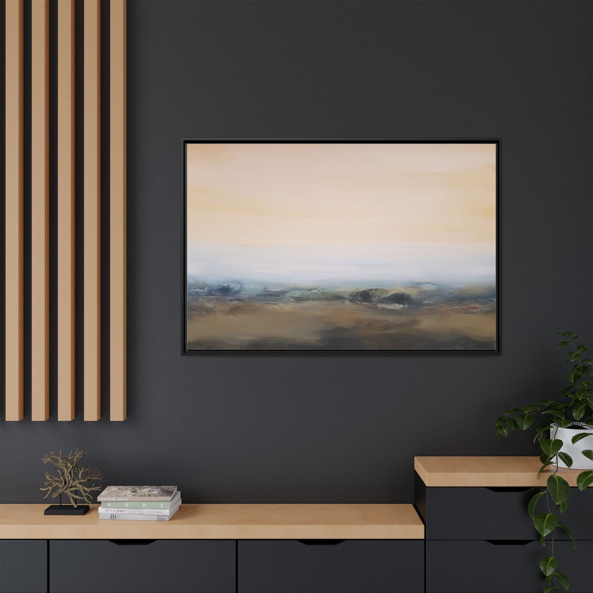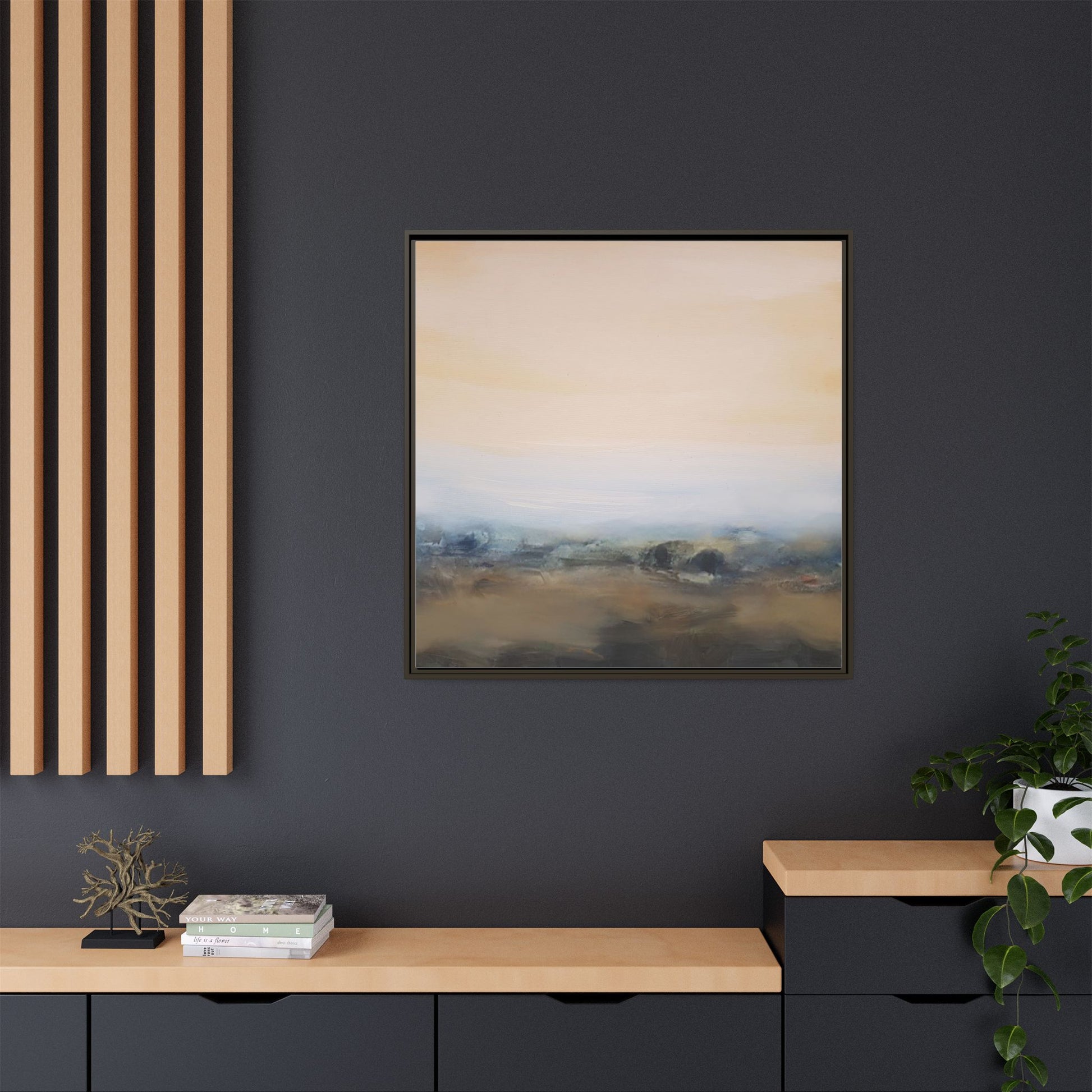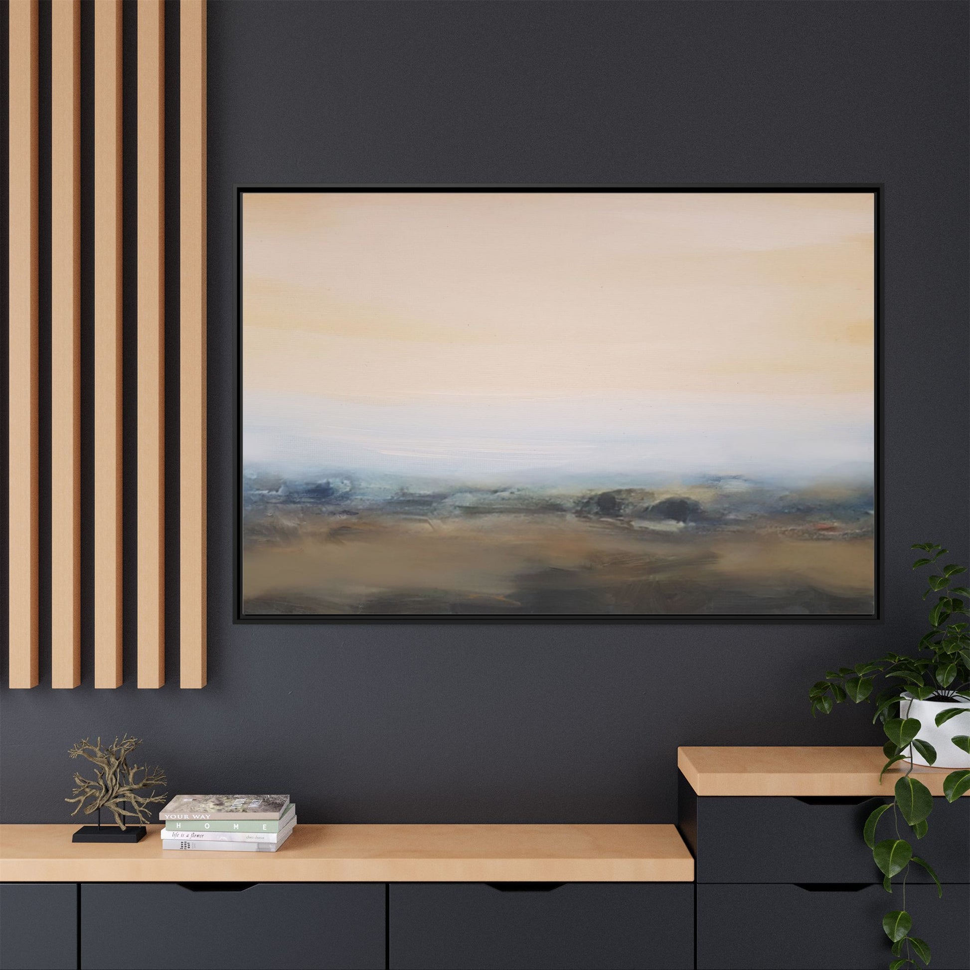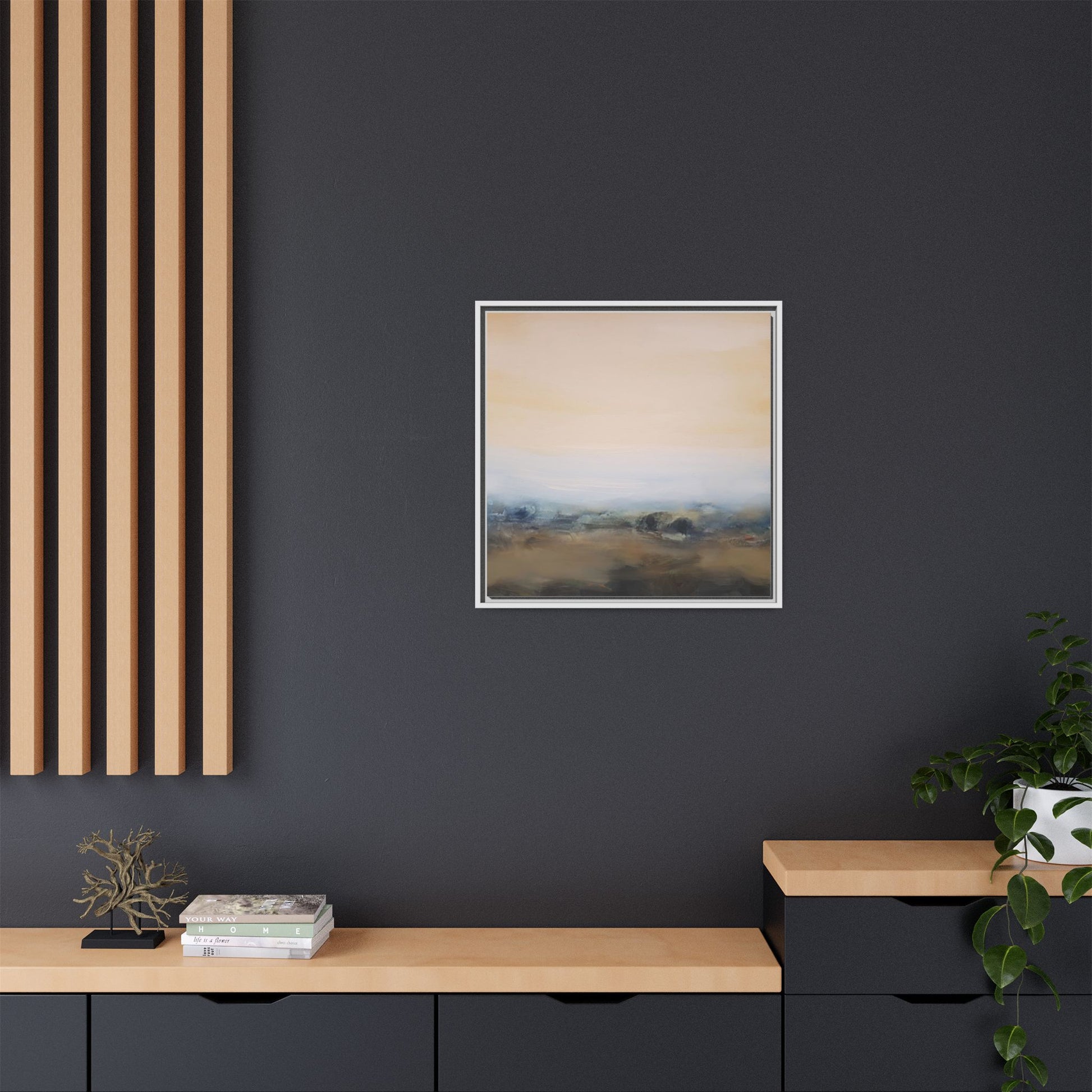 This evocative landscape painting captures a misty, ethereal scene characterized by soft, blended colors and a sense of atmospheric depth. The artwork features a muted color palette dominated by warm beiges, cool grays, and subtle blue-green tones that create a serene and contemplative mood. The composition is divided horizontally, with a pale, expansive sky occupying the upper two-thirds of the canvas and a hazy, undefined landscape stretching across the bottom third. Subtle brushstrokes and gentle color transitions give the painting a dreamlike quality, blurring the lines between sky, horizon, and land. The abstract nature of the piece invites viewers to interpret the landscape through their own emotional lens, suggesting a sense of tranquility and vast, open space.