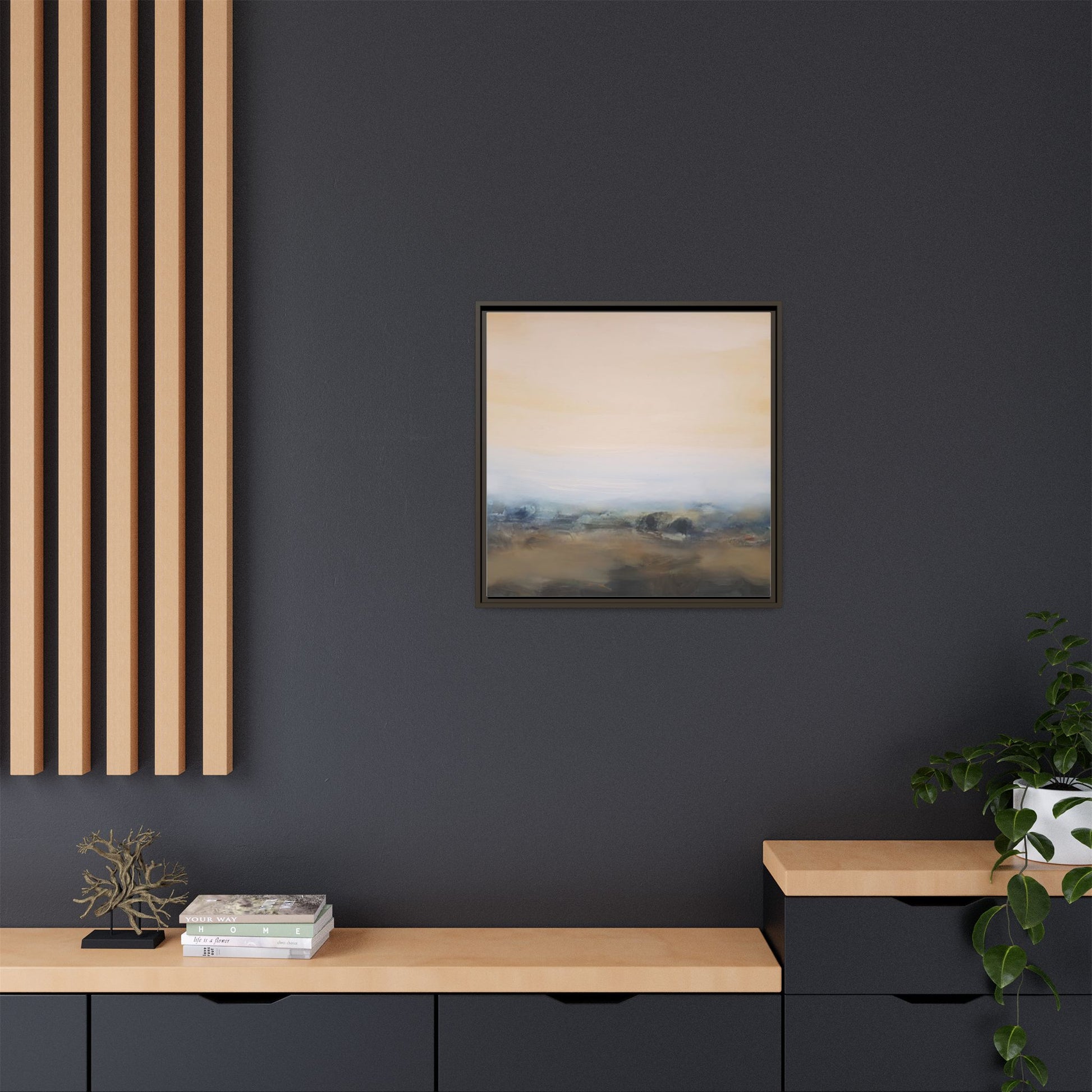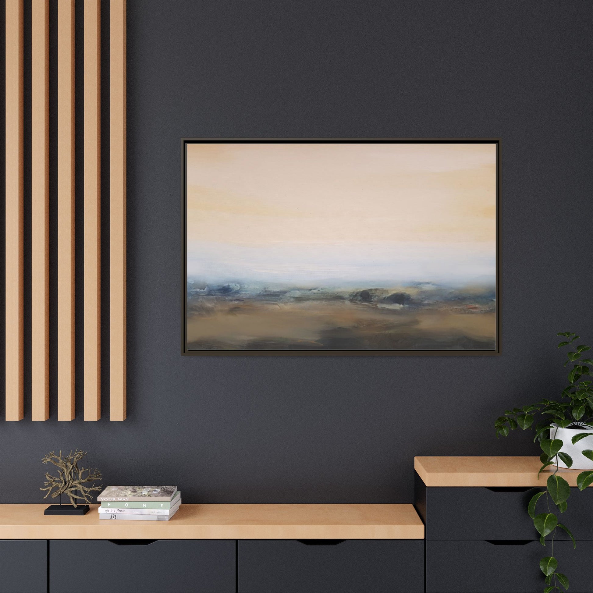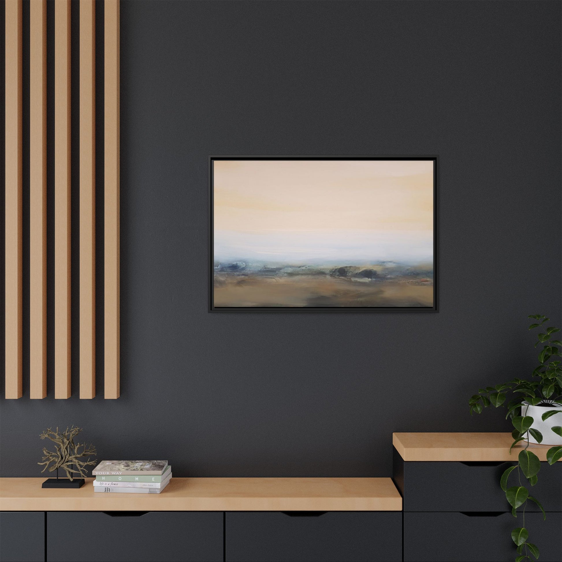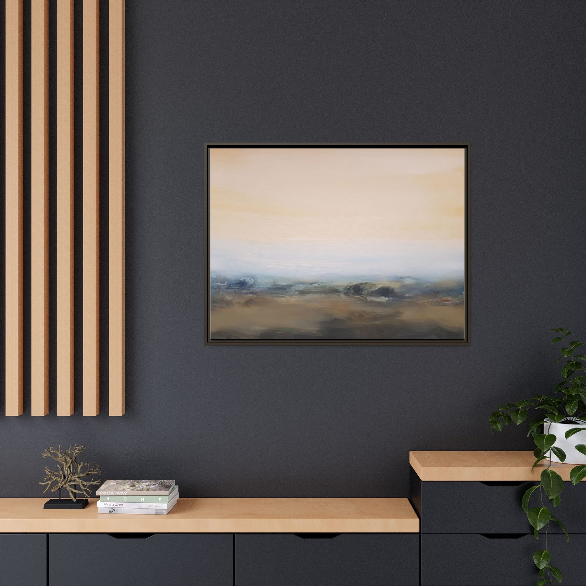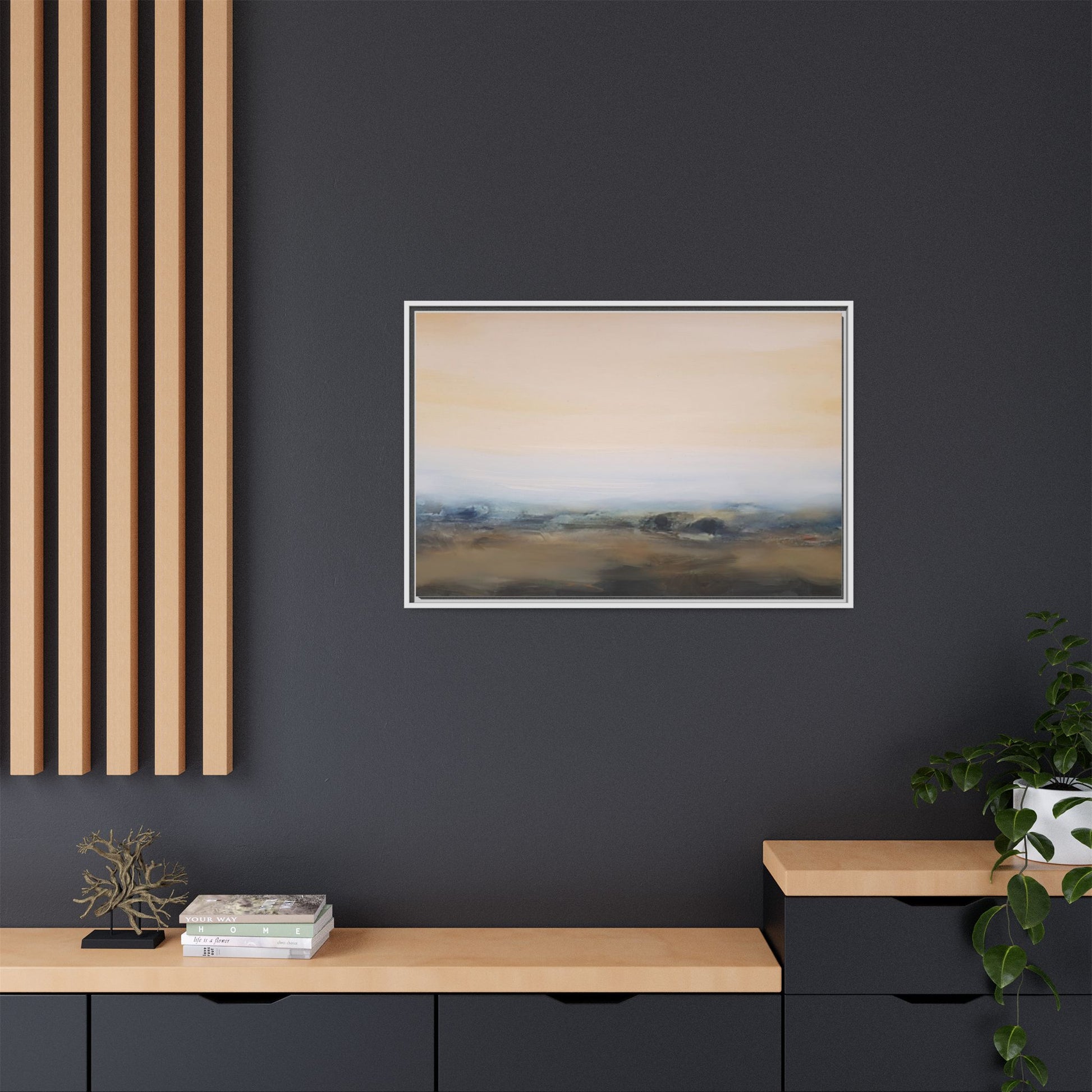 This evocative landscape painting captures a misty, ethereal scene characterized by soft, blended colors and a sense of atmospheric depth. The artwork features a muted color palette dominated by warm beiges, cool grays, and subtle blue-green tones that create a serene and contemplative mood. The composition is divided horizontally, with a pale, expansive sky occupying the upper two-thirds of the canvas and a hazy, undefined landscape stretching across the bottom third. Subtle brushstrokes and gentle color transitions give the painting a dreamlike quality, blurring the lines between sky, horizon, and land. The abstract nature of the piece invites viewers to interpret the landscape through their own emotional lens, suggesting a sense of tranquility and vast, open space.