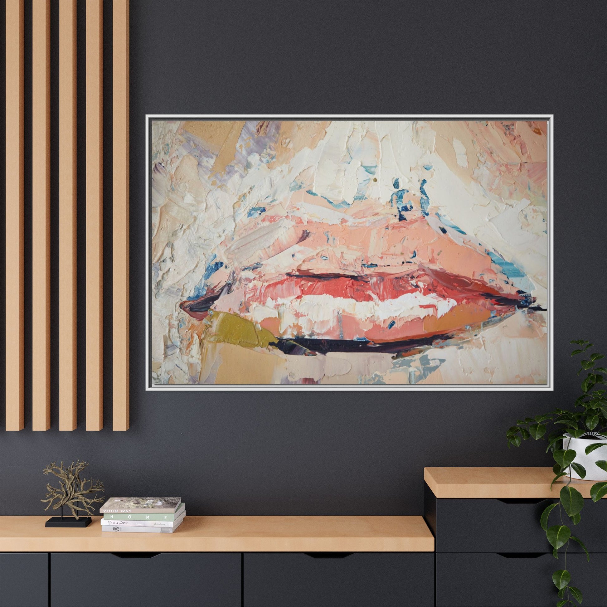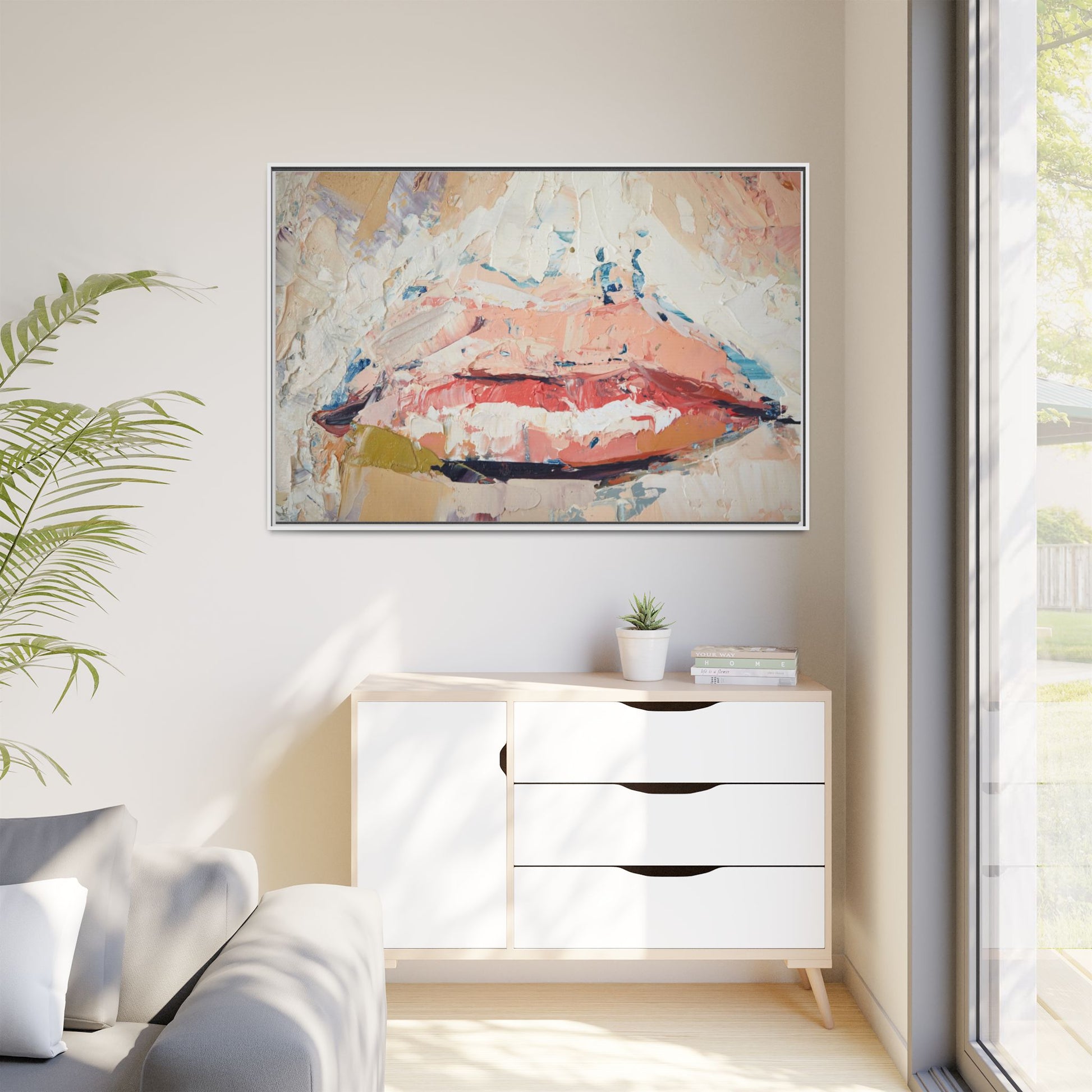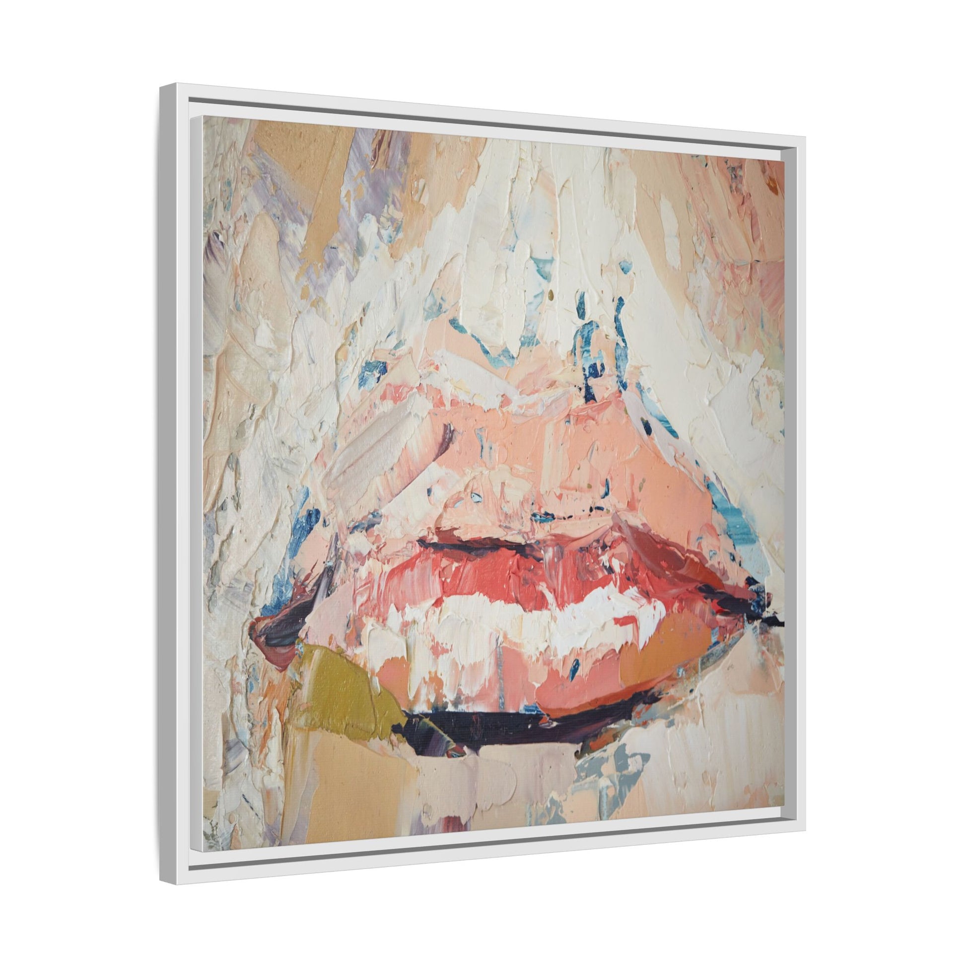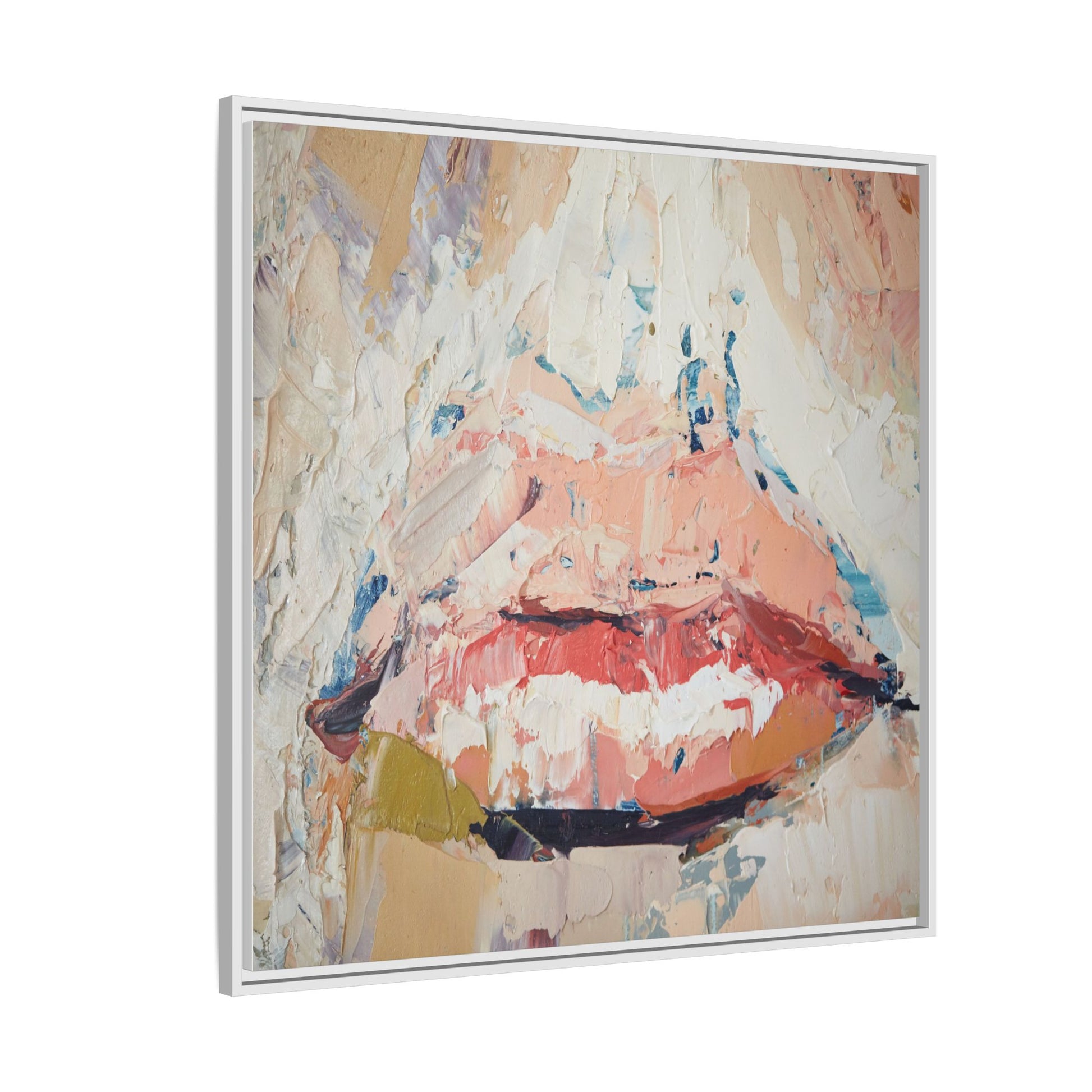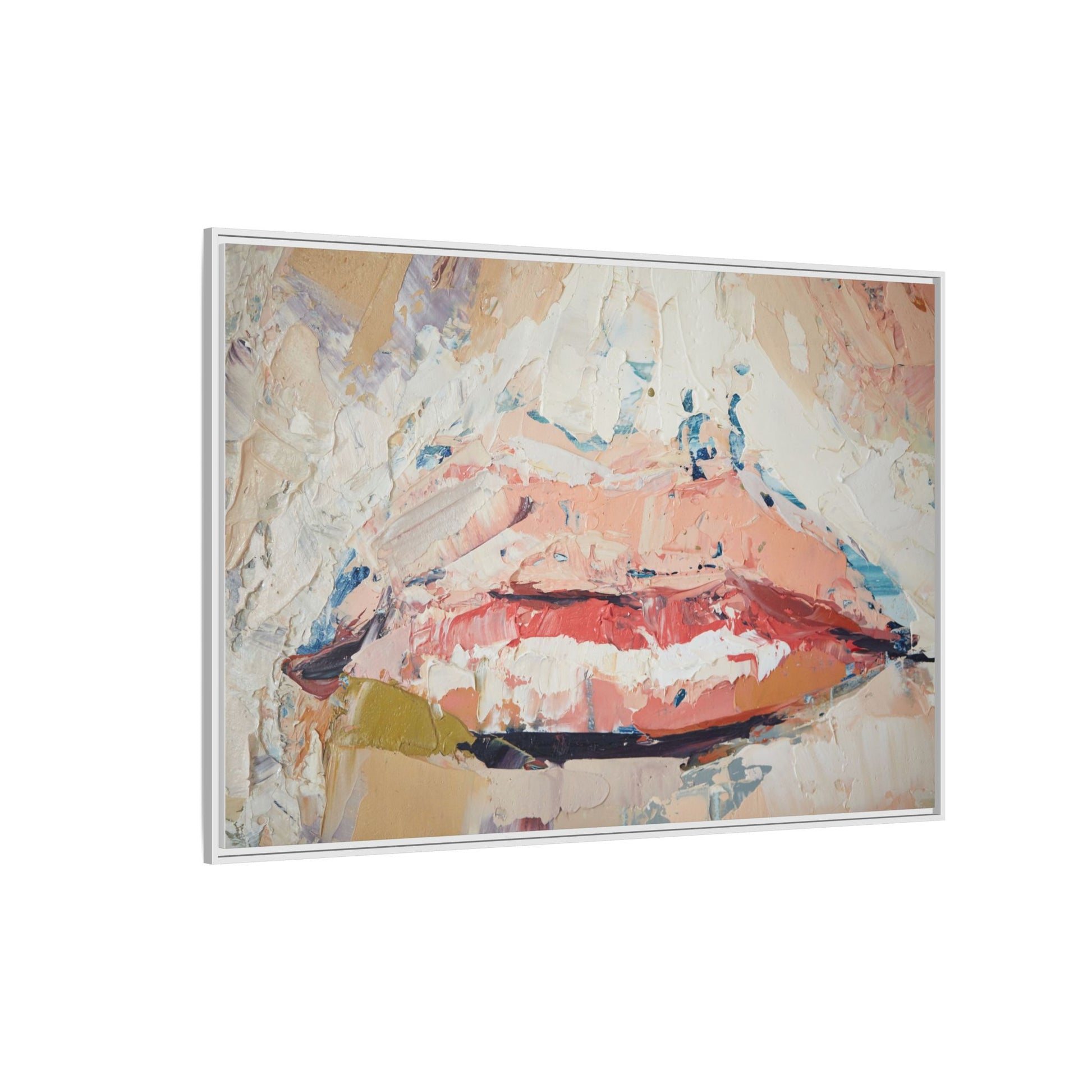 This vibrant abstract painting captures a close-up of lips rendered in an expressive, textured style characteristic of impasto technique. The artwork features bold brushstrokes in a palette of coral, white, red, and hints of blue and yellow, creating a dynamic and dimensional representation of lips. The painting's surface is heavily textured, with thick layers of paint applied in sweeping, gestural movements that give the image a sense of movement and emotional intensity. Soft, blended background tones of beige, white, and pale pink provide a subtle contrast to the more vivid lip coloration. The style suggests an intimate, emotional portrayal that goes beyond mere physical representation, instead capturing the essence and energy of the subject.