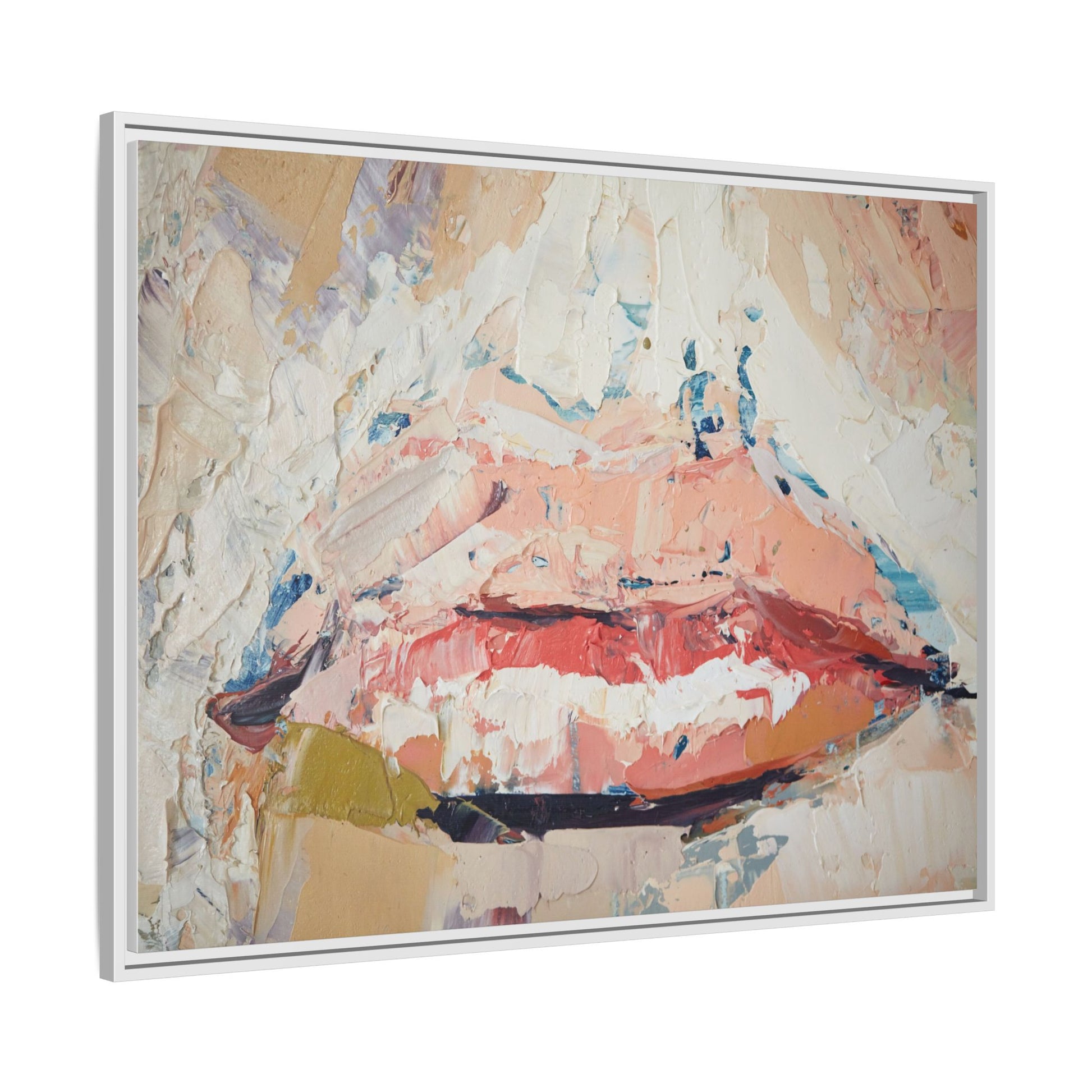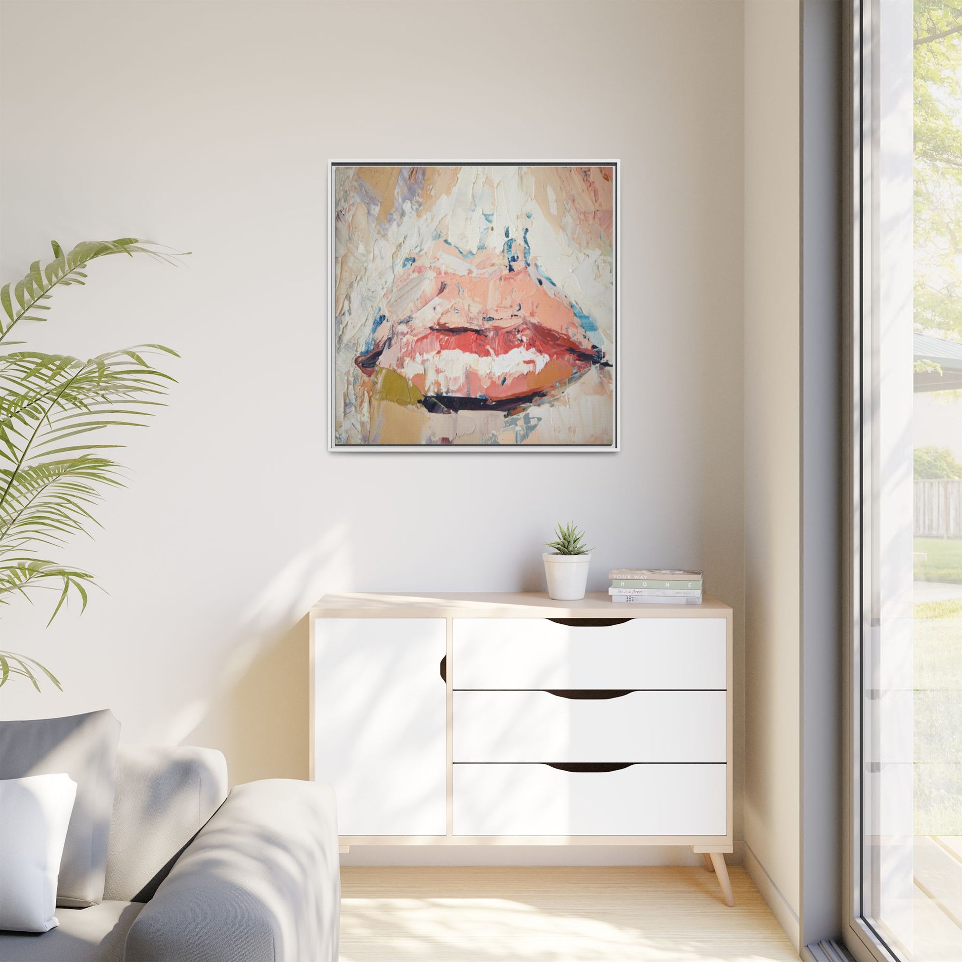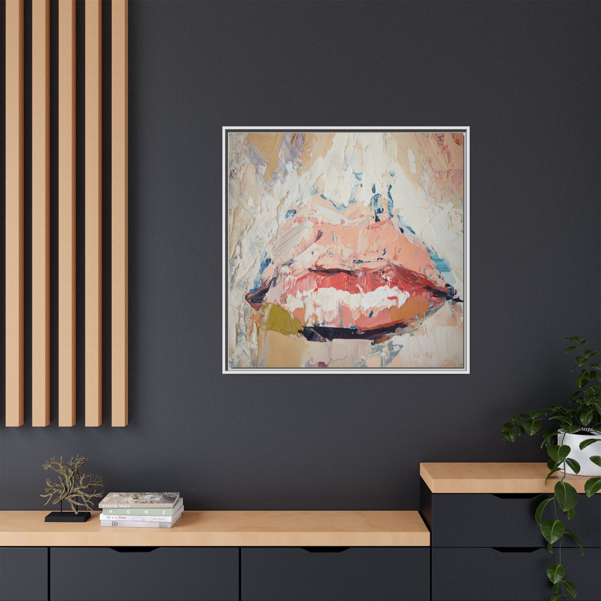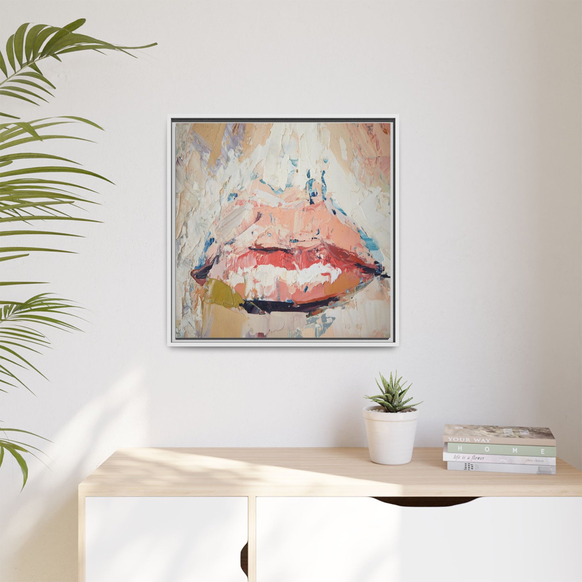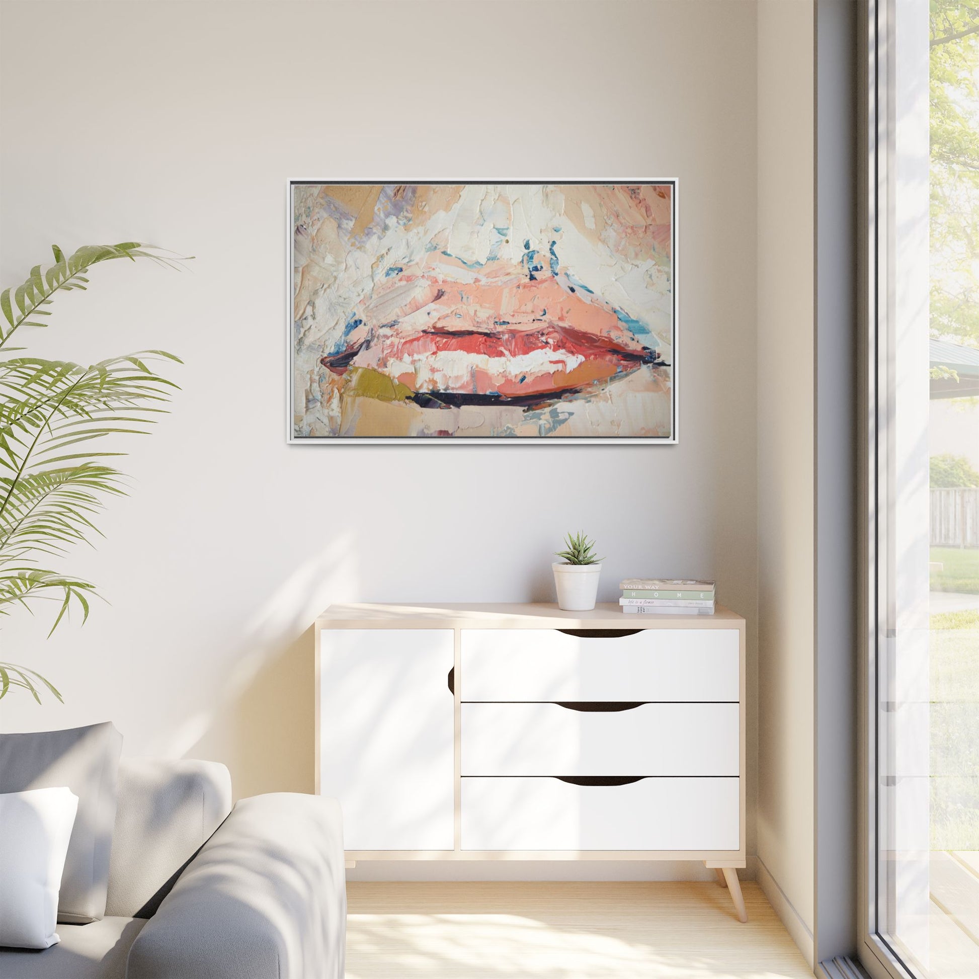 This vibrant abstract painting captures a close-up of lips rendered in an expressive, textured style characteristic of impasto technique. The artwork features bold brushstrokes in a palette of coral, white, red, and hints of blue and yellow, creating a dynamic and dimensional representation of lips. The painting's surface is heavily textured, with thick layers of paint applied in sweeping, gestural movements that give the image a sense of movement and emotional intensity. Soft, blended background tones of beige, white, and pale pink provide a subtle contrast to the more vivid lip coloration. The style suggests an intimate, emotional portrayal that goes beyond mere physical representation, instead capturing the essence and energy of the subject.