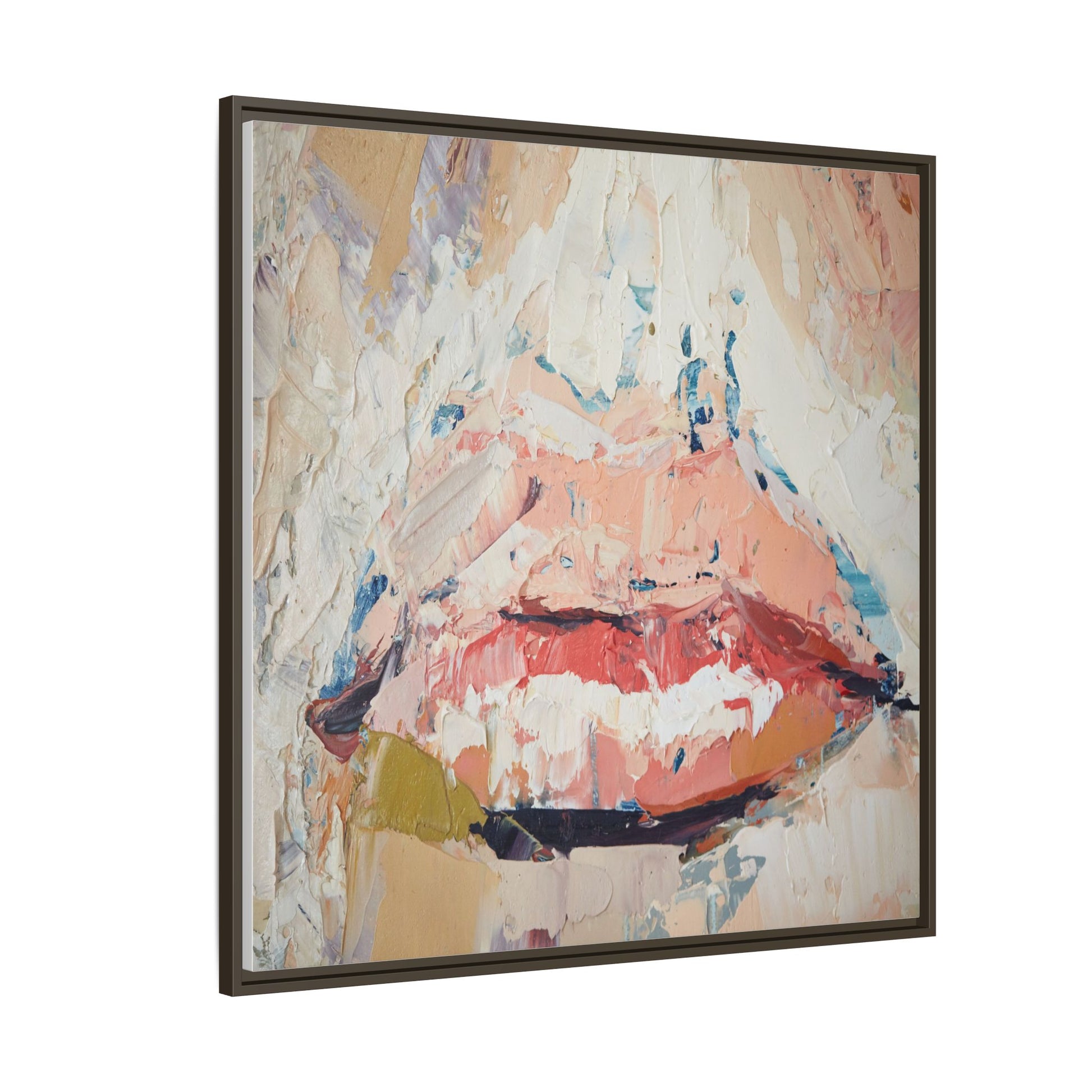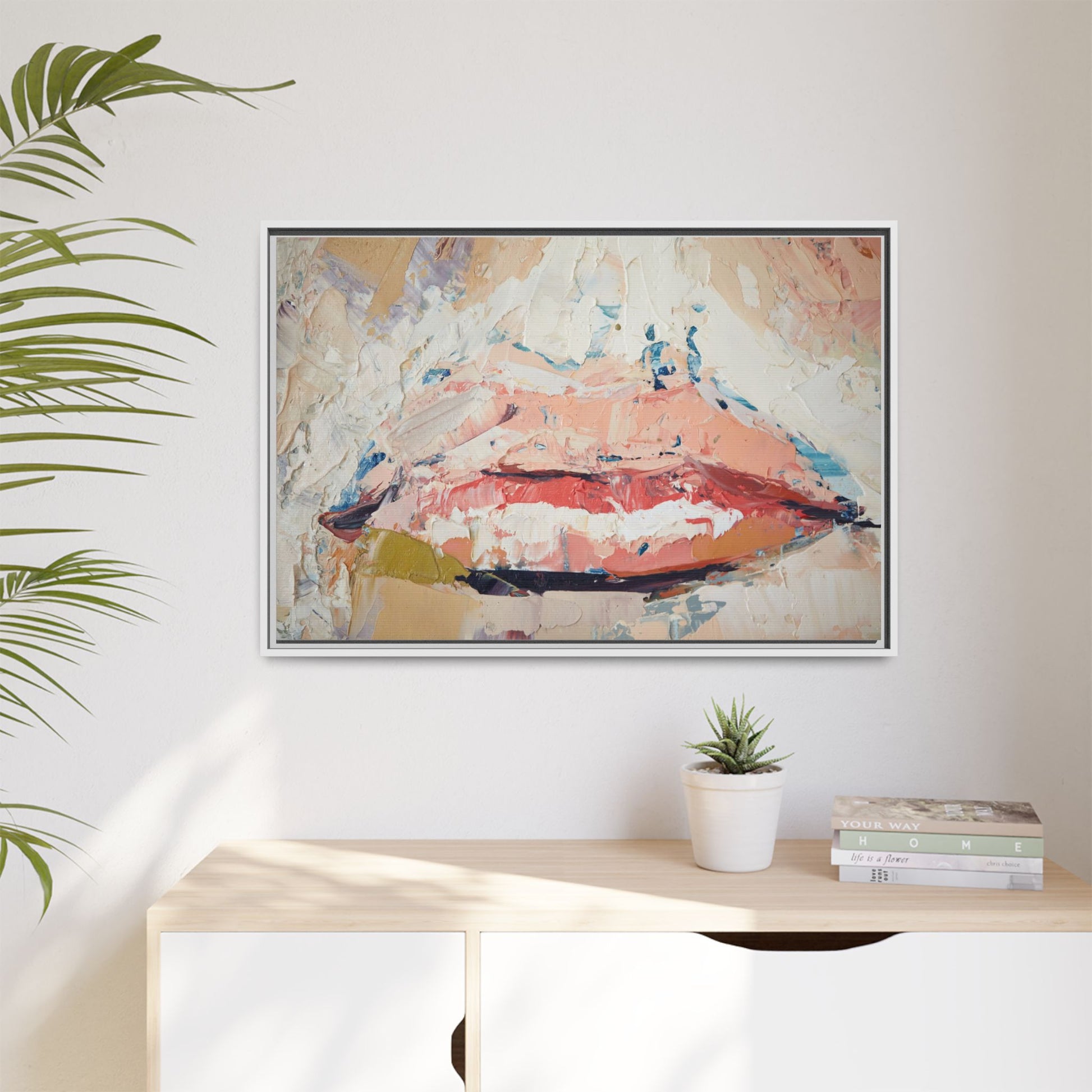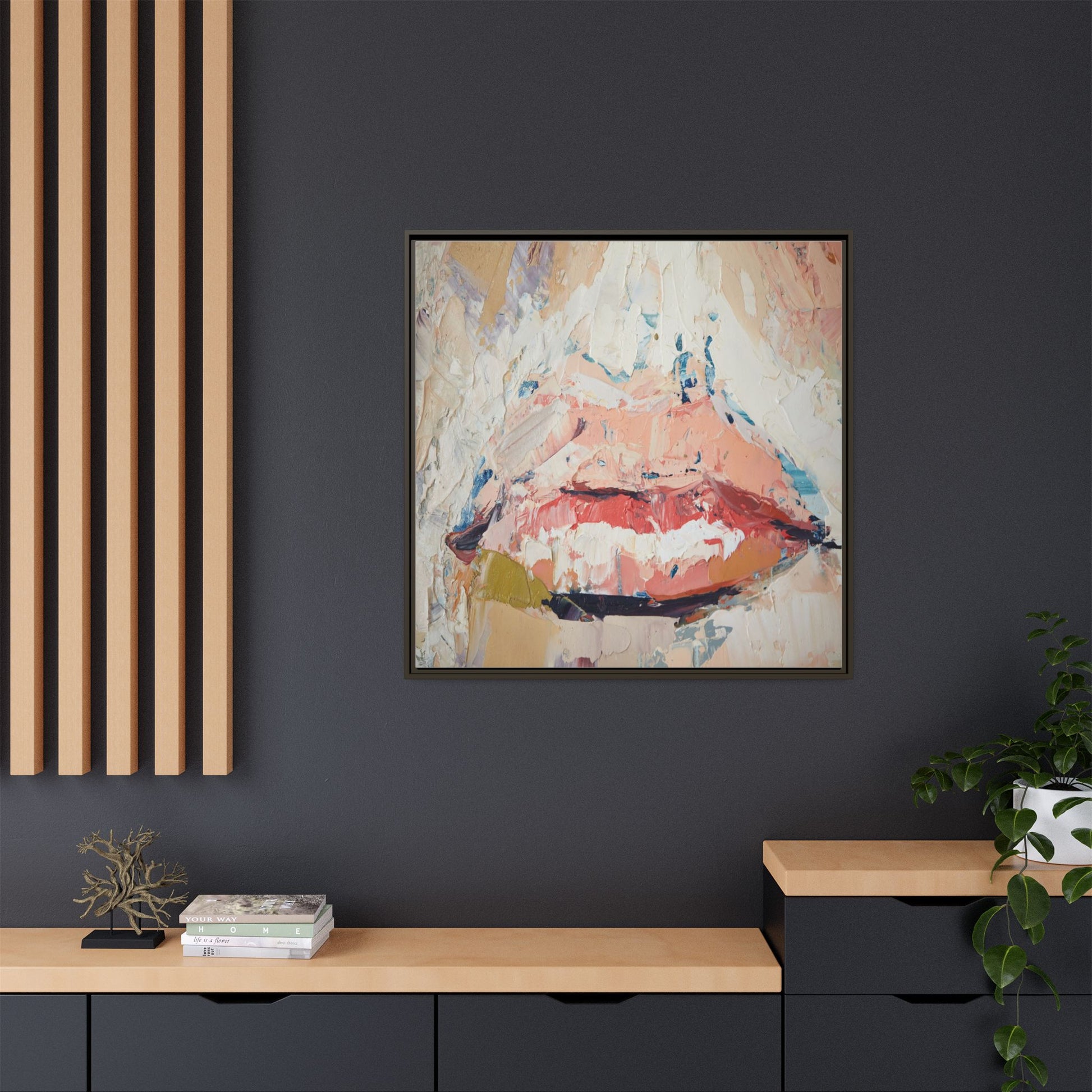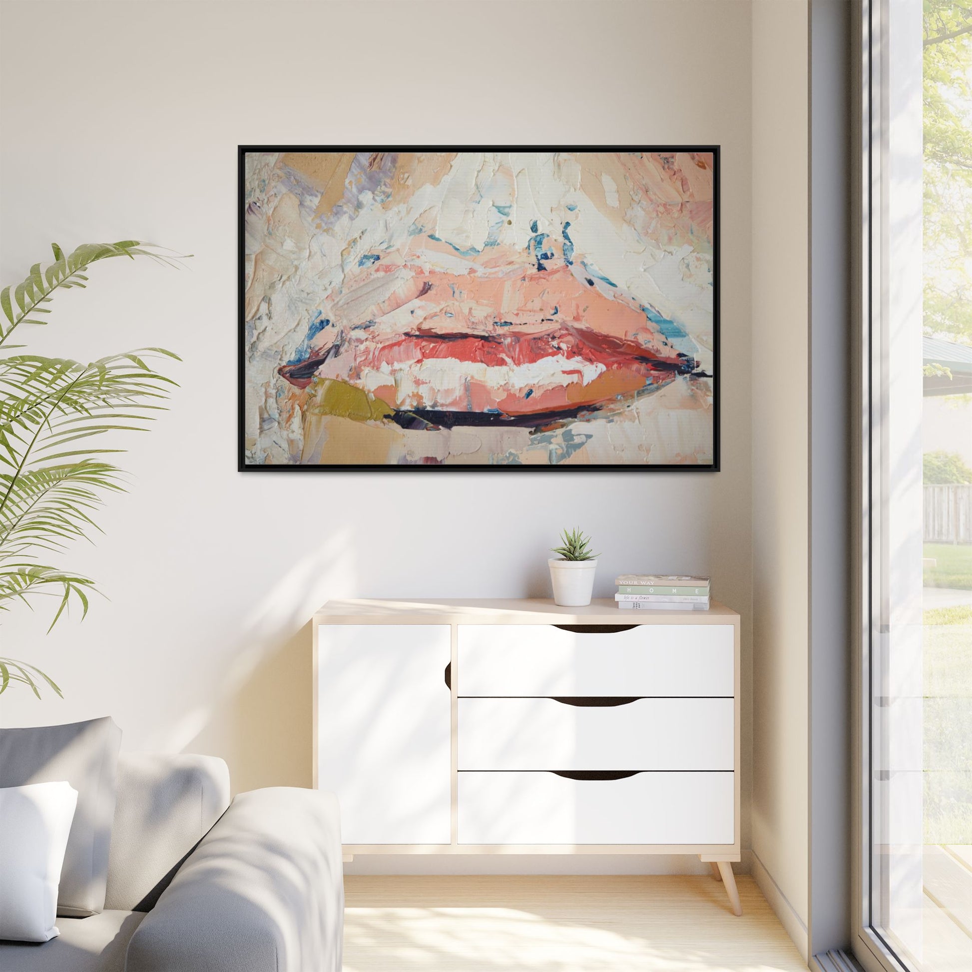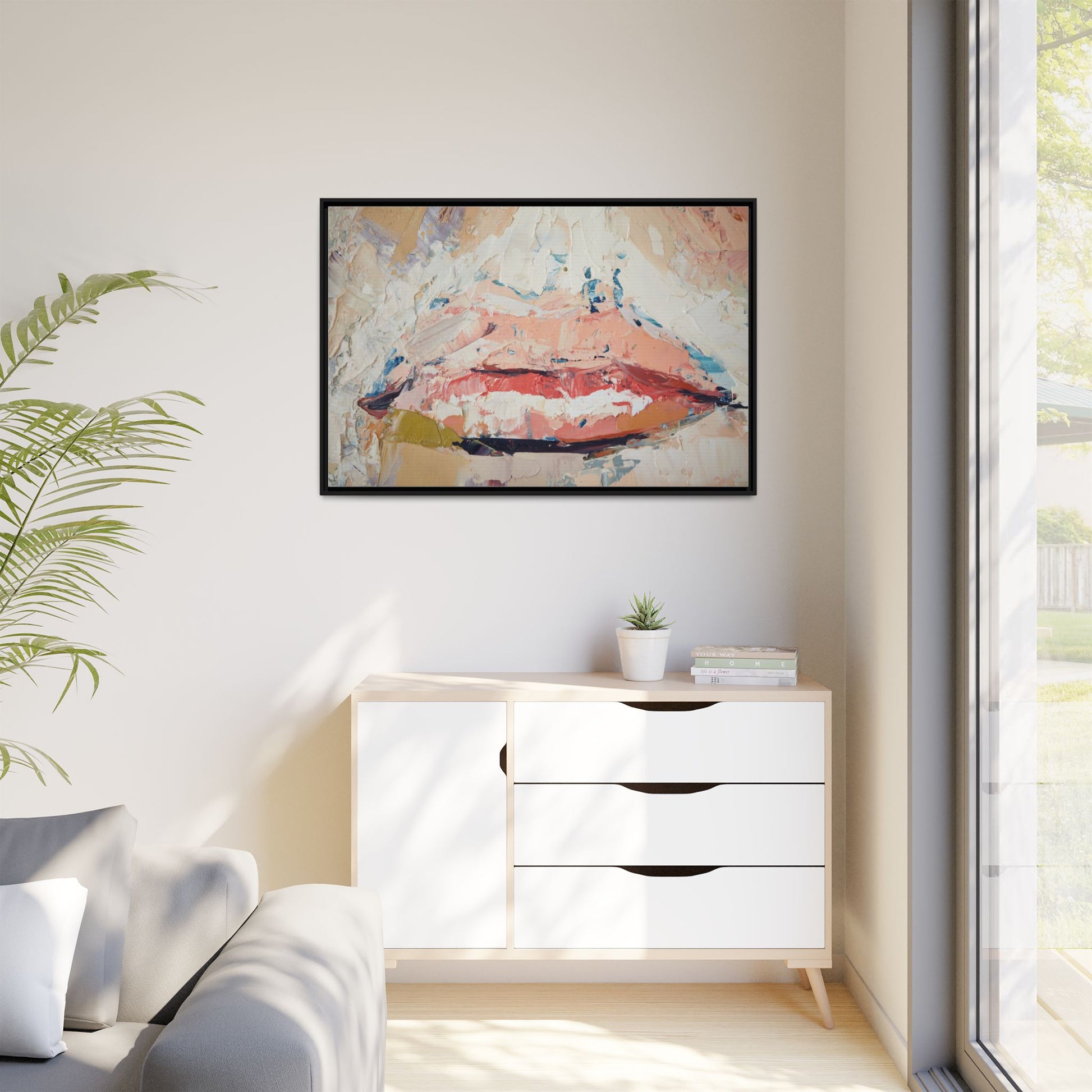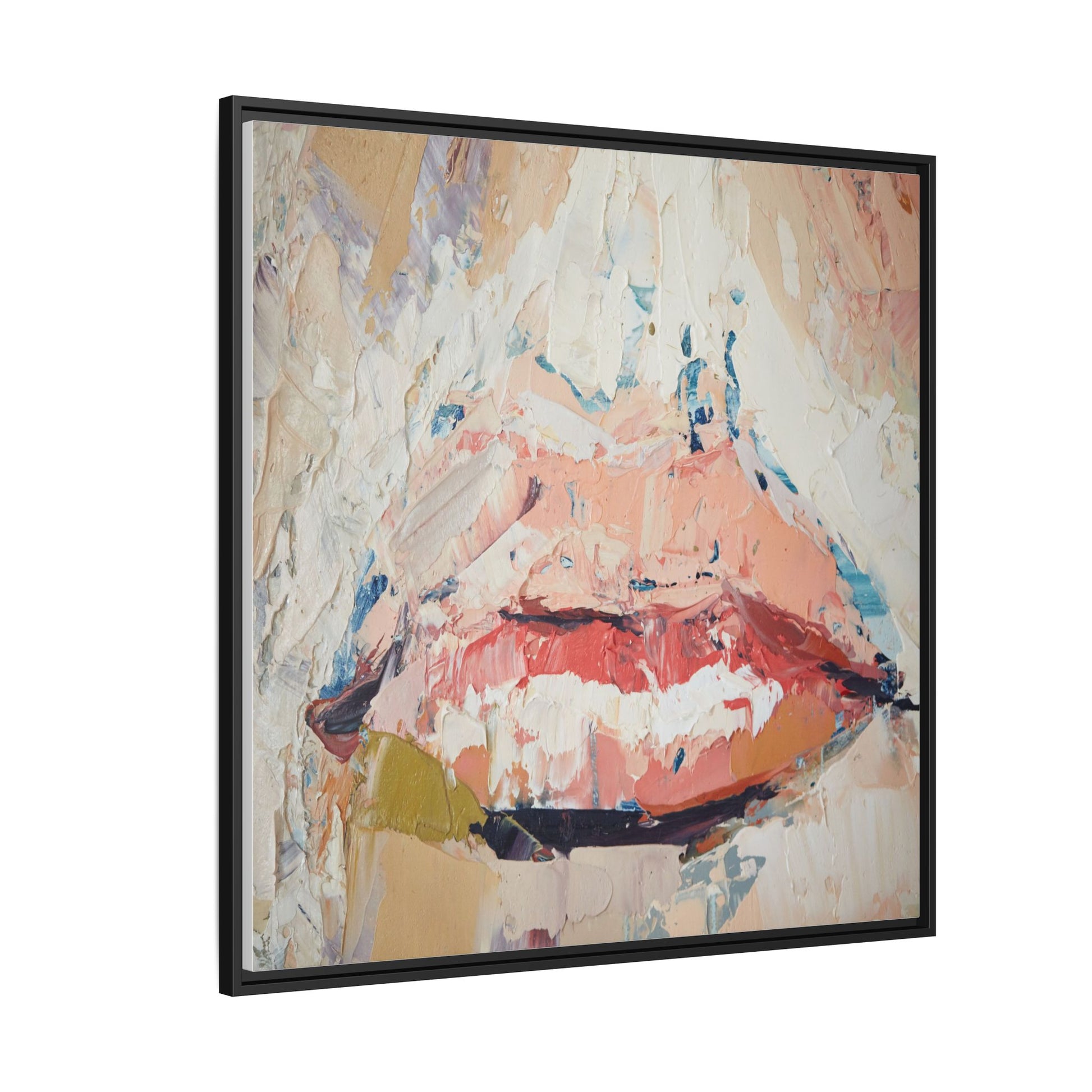 This vibrant abstract painting captures a close-up of lips rendered in an expressive, textured style characteristic of impasto technique. The artwork features bold brushstrokes in a palette of coral, white, red, and hints of blue and yellow, creating a dynamic and dimensional representation of lips. The painting's surface is heavily textured, with thick layers of paint applied in sweeping, gestural movements that give the image a sense of movement and emotional intensity. Soft, blended background tones of beige, white, and pale pink provide a subtle contrast to the more vivid lip coloration. The style suggests an intimate, emotional portrayal that goes beyond mere physical representation, instead capturing the essence and energy of the subject.