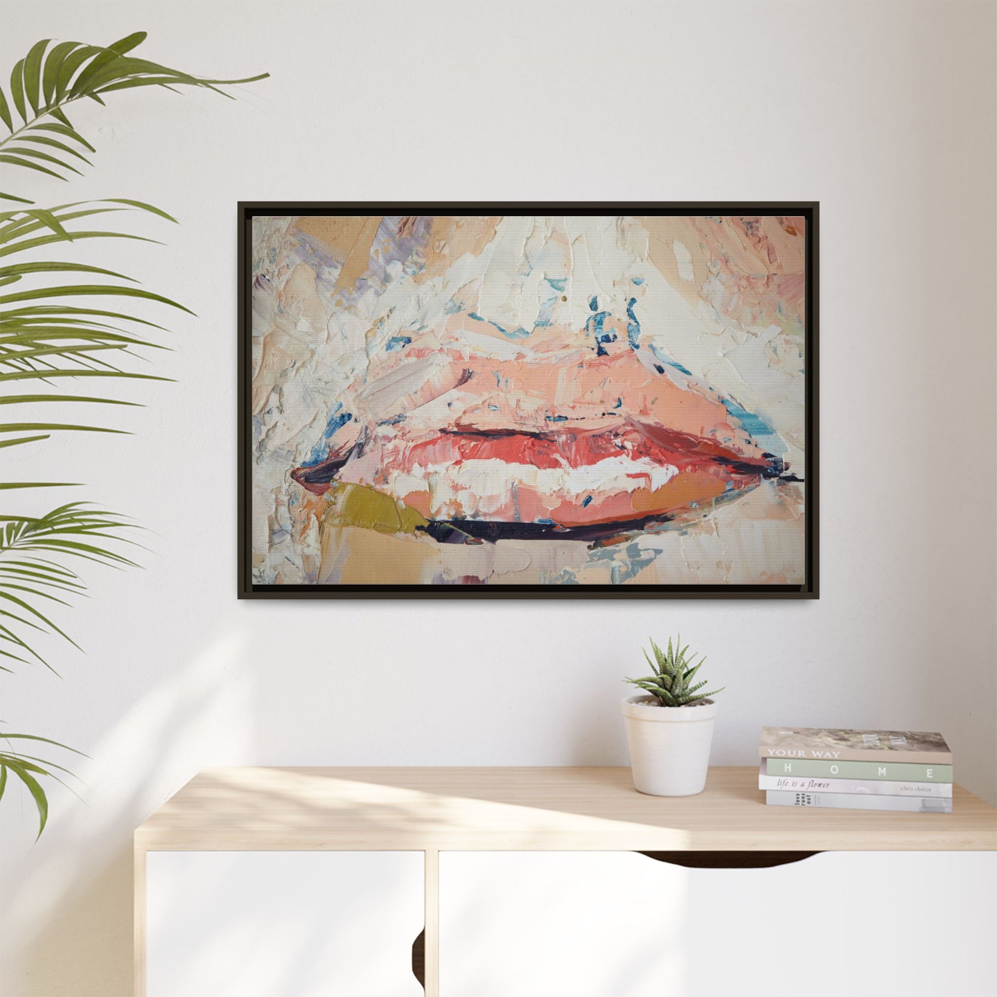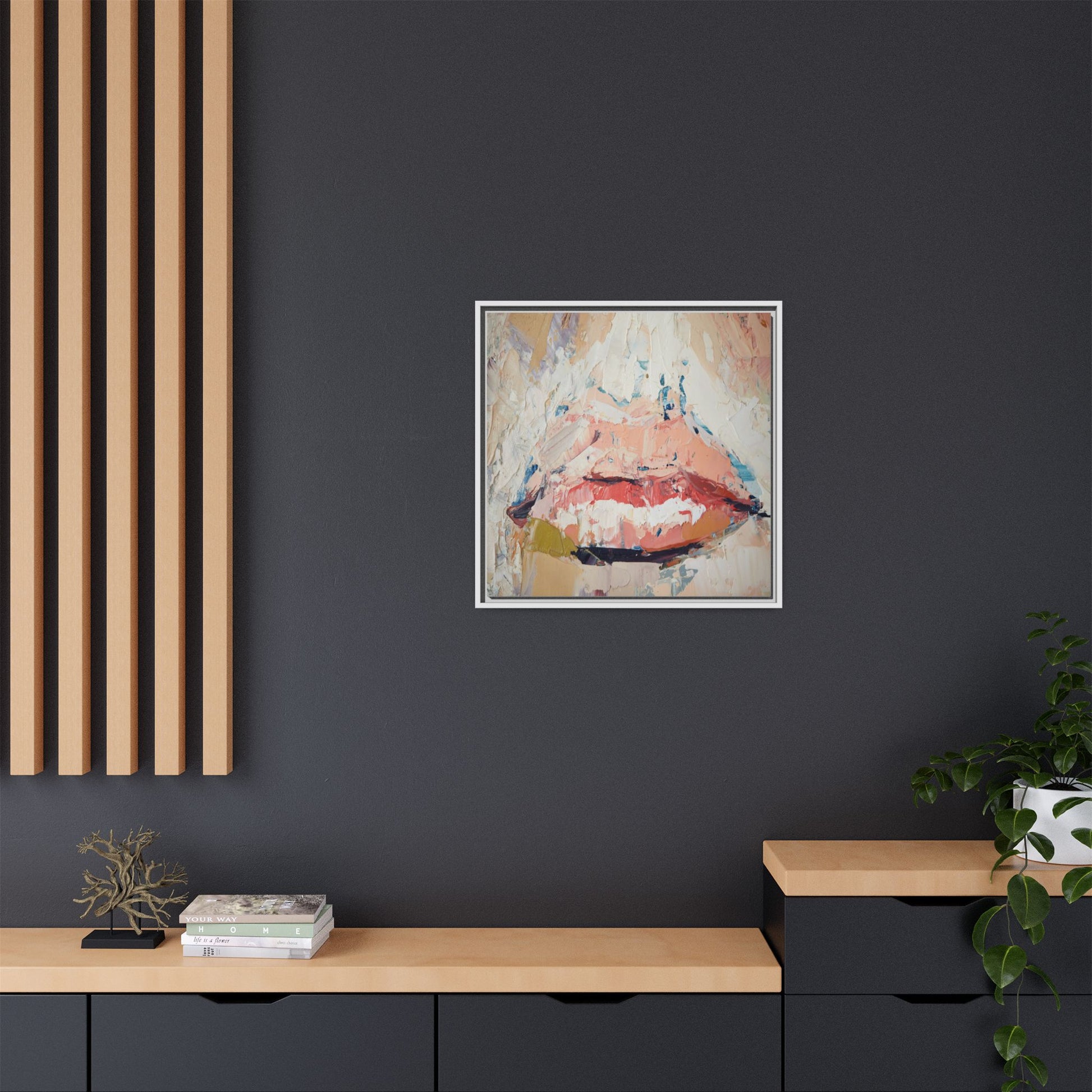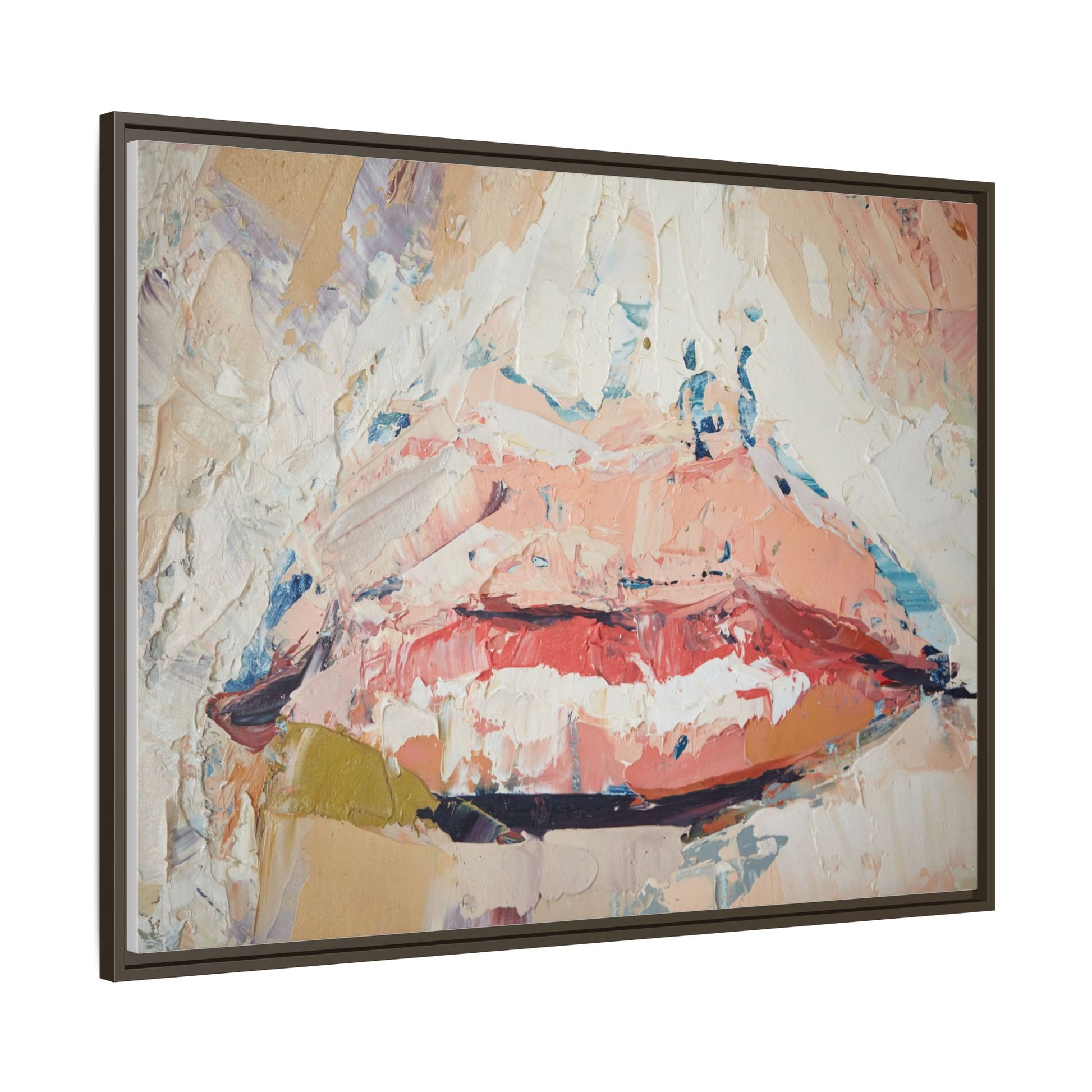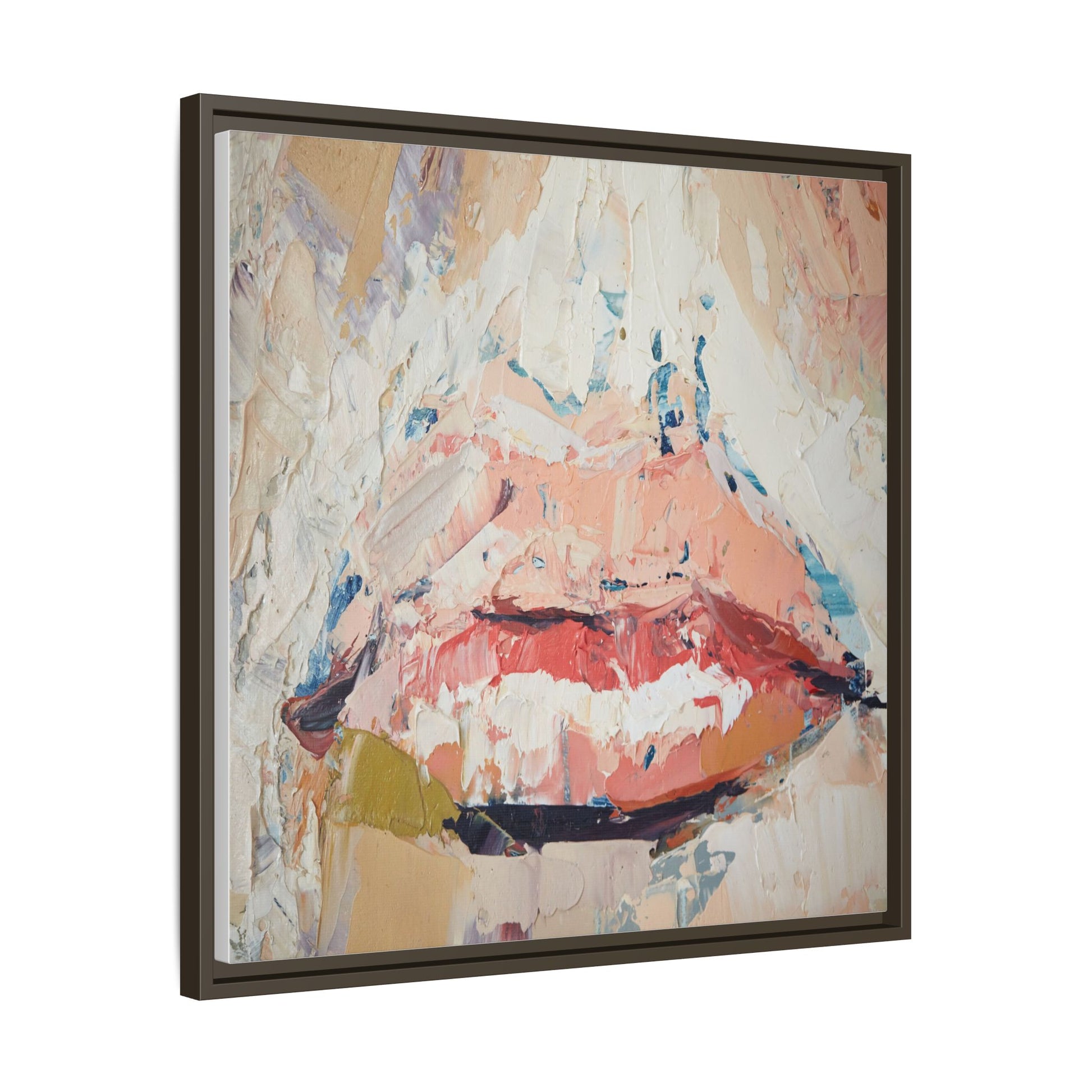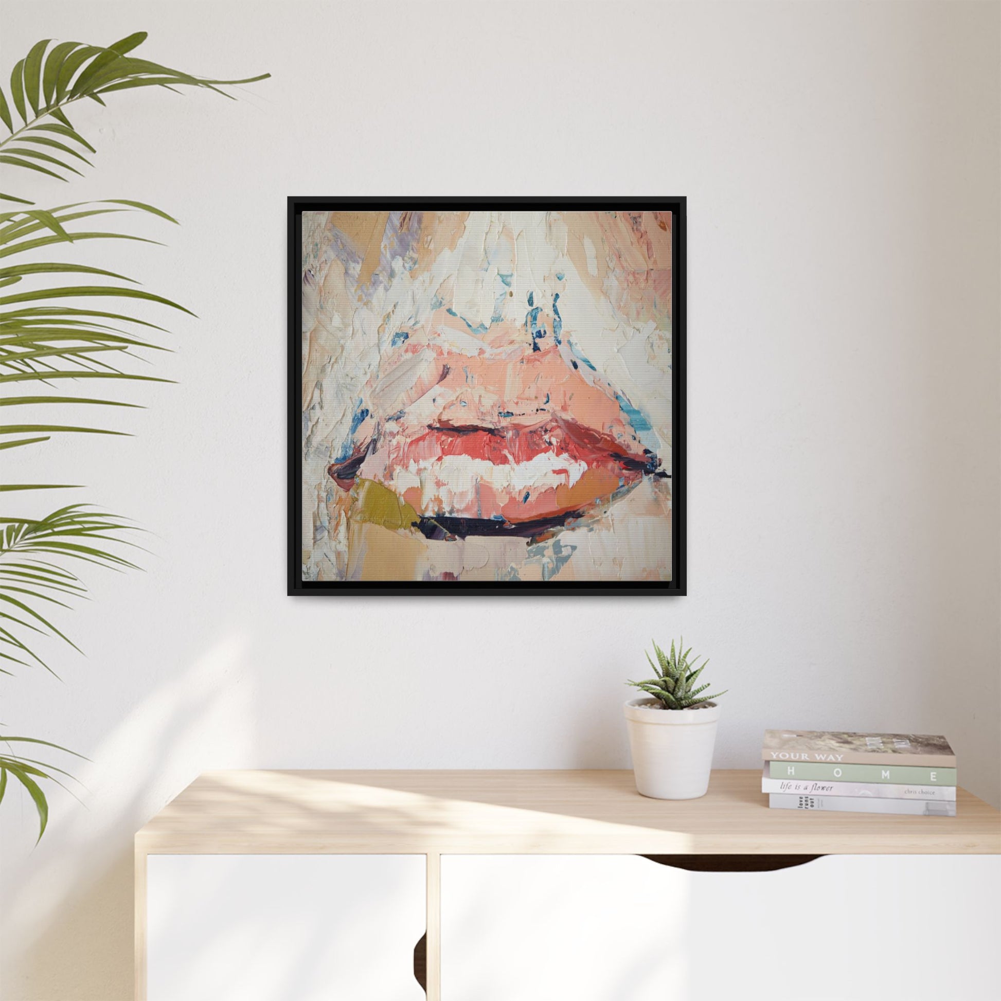 This vibrant abstract painting captures a close-up of lips rendered in an expressive, textured style characteristic of impasto technique. The artwork features bold brushstrokes in a palette of coral, white, red, and hints of blue and yellow, creating a dynamic and dimensional representation of lips. The painting's surface is heavily textured, with thick layers of paint applied in sweeping, gestural movements that give the image a sense of movement and emotional intensity. Soft, blended background tones of beige, white, and pale pink provide a subtle contrast to the more vivid lip coloration. The style suggests an intimate, emotional portrayal that goes beyond mere physical representation, instead capturing the essence and energy of the subject.