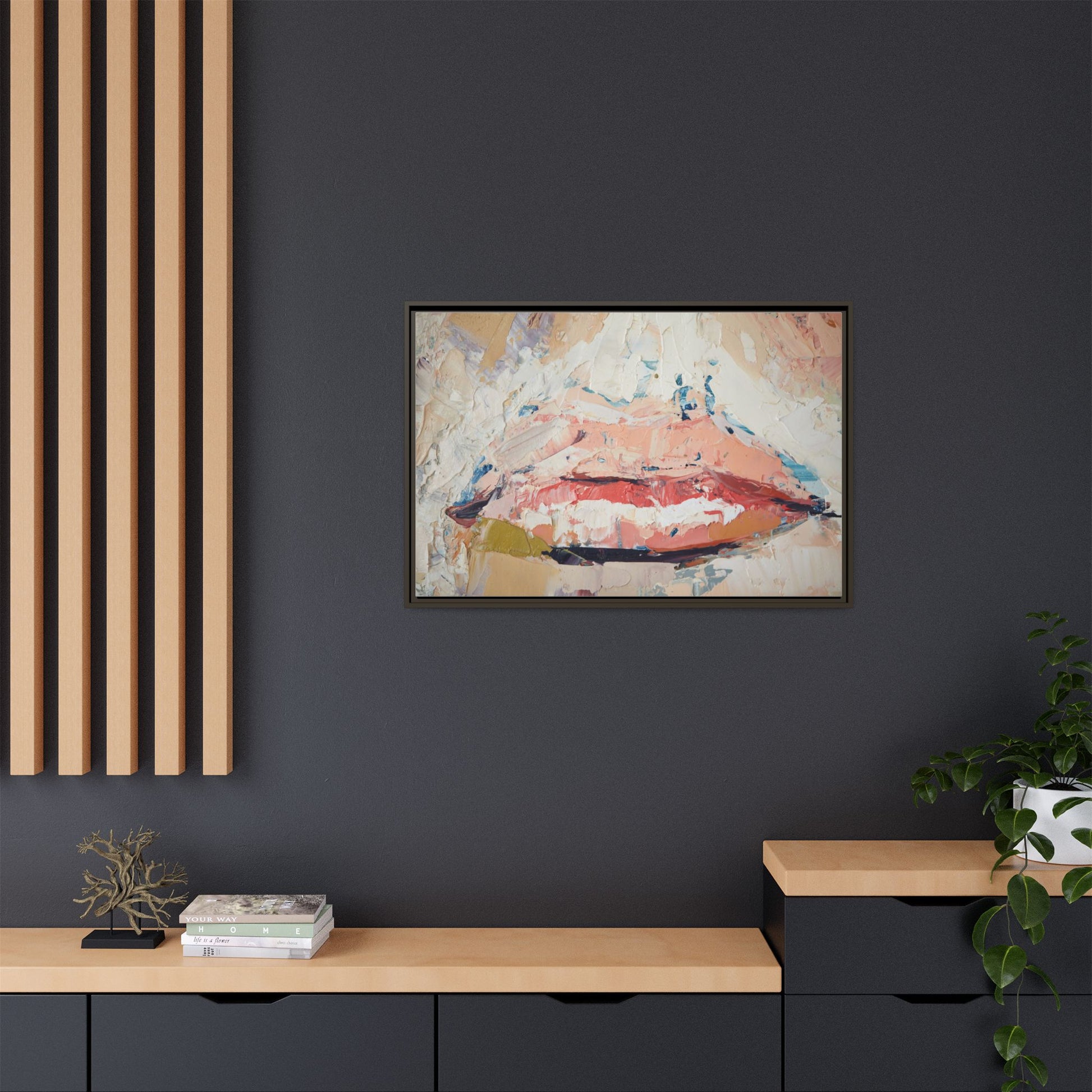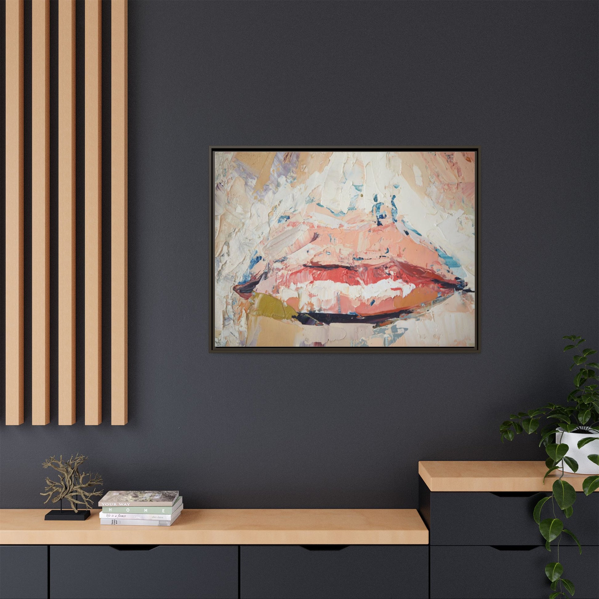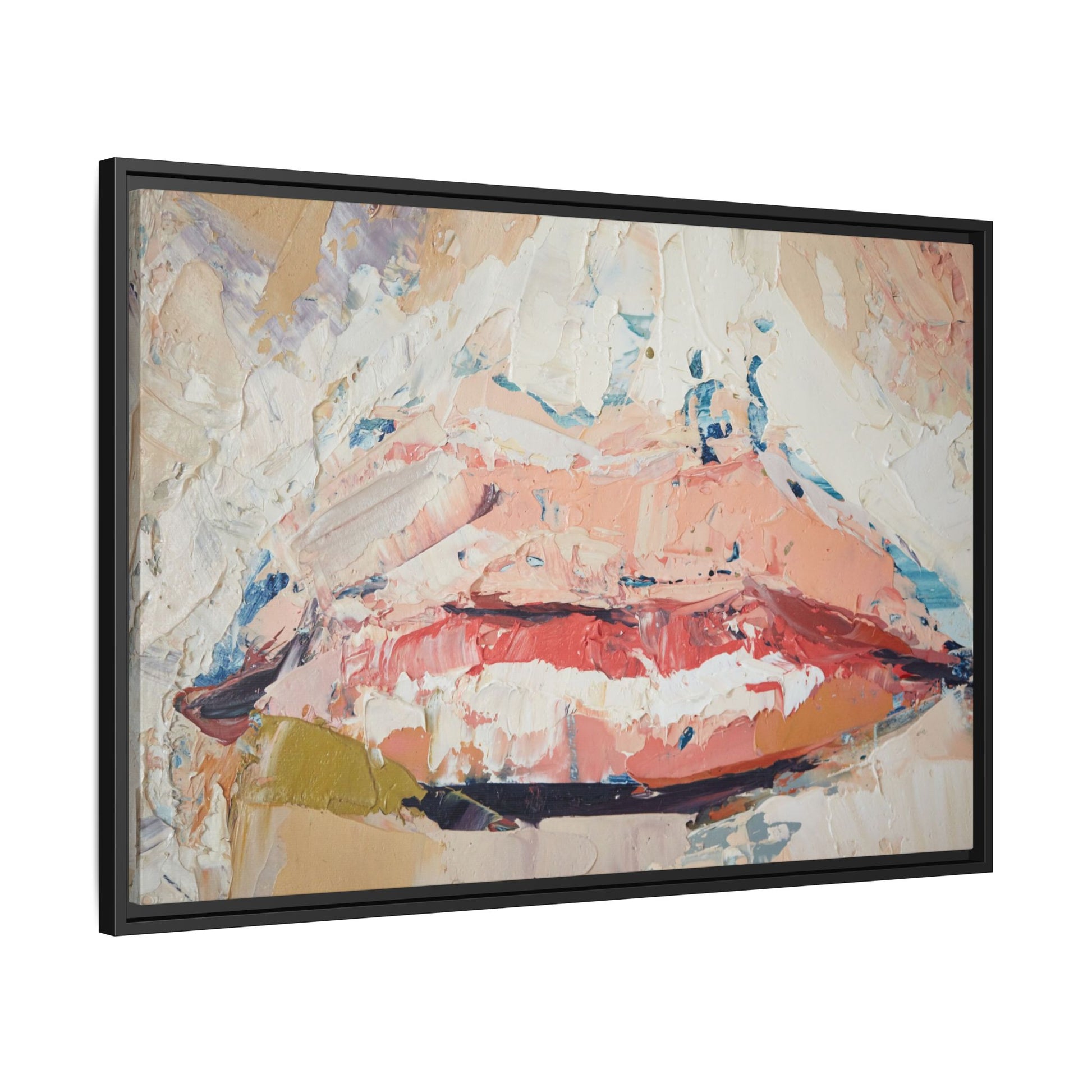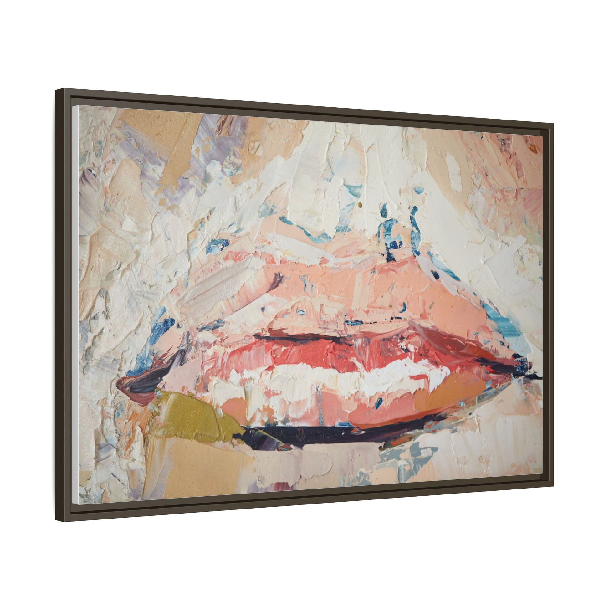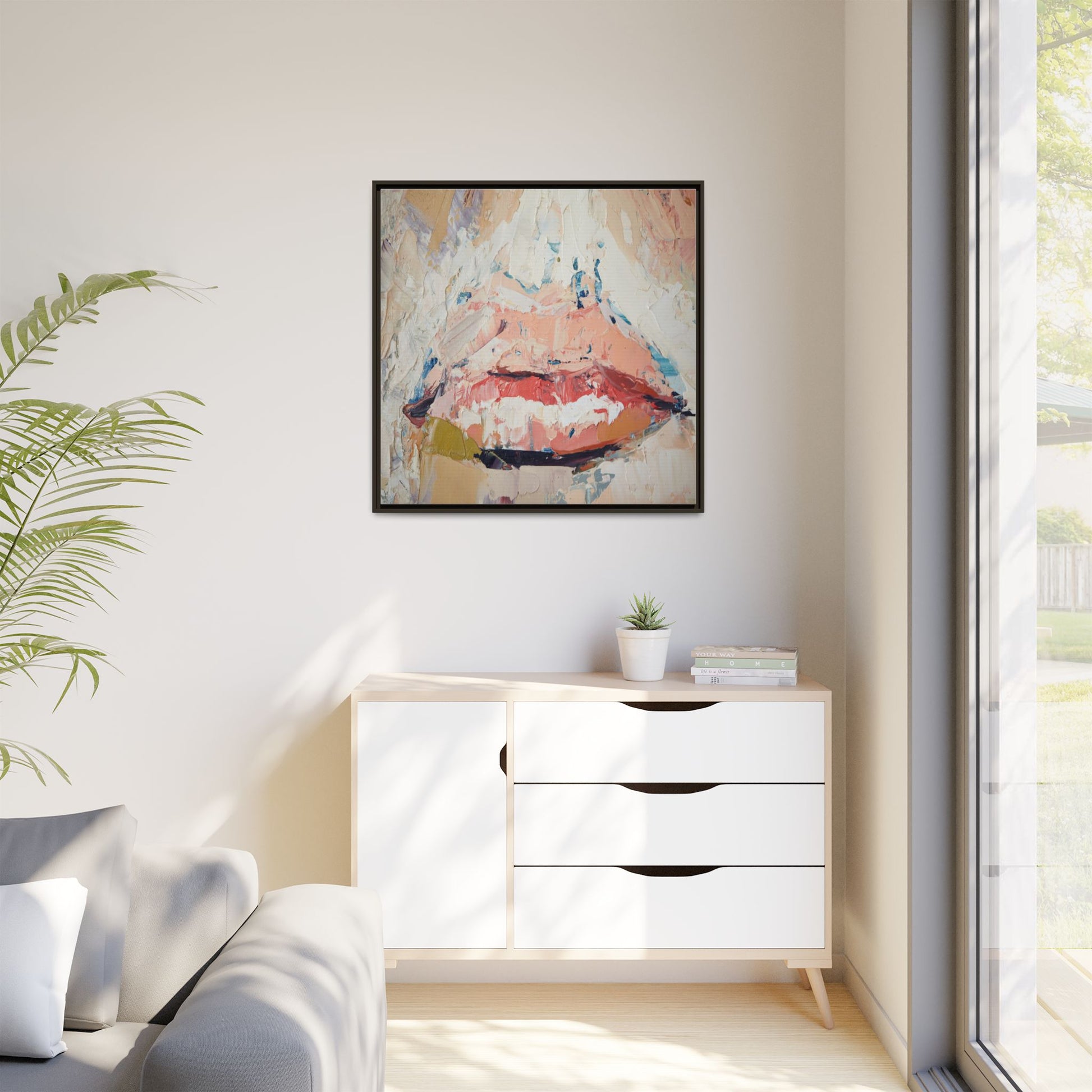 This vibrant abstract painting captures a close-up of lips rendered in an expressive, textured style characteristic of impasto technique. The artwork features bold brushstrokes in a palette of coral, white, red, and hints of blue and yellow, creating a dynamic and dimensional representation of lips. The painting's surface is heavily textured, with thick layers of paint applied in sweeping, gestural movements that give the image a sense of movement and emotional intensity. Soft, blended background tones of beige, white, and pale pink provide a subtle contrast to the more vivid lip coloration. The style suggests an intimate, emotional portrayal that goes beyond mere physical representation, instead capturing the essence and energy of the subject.