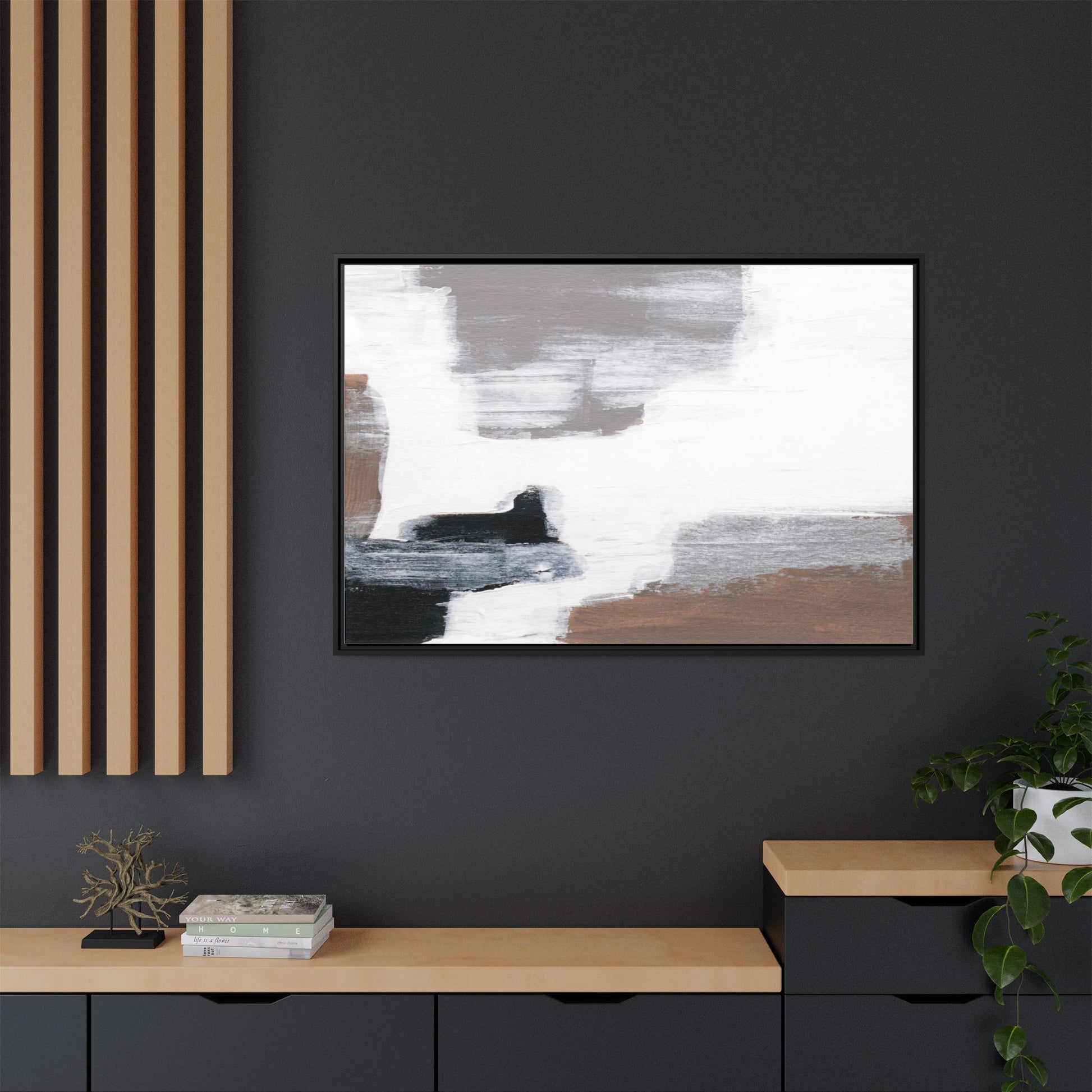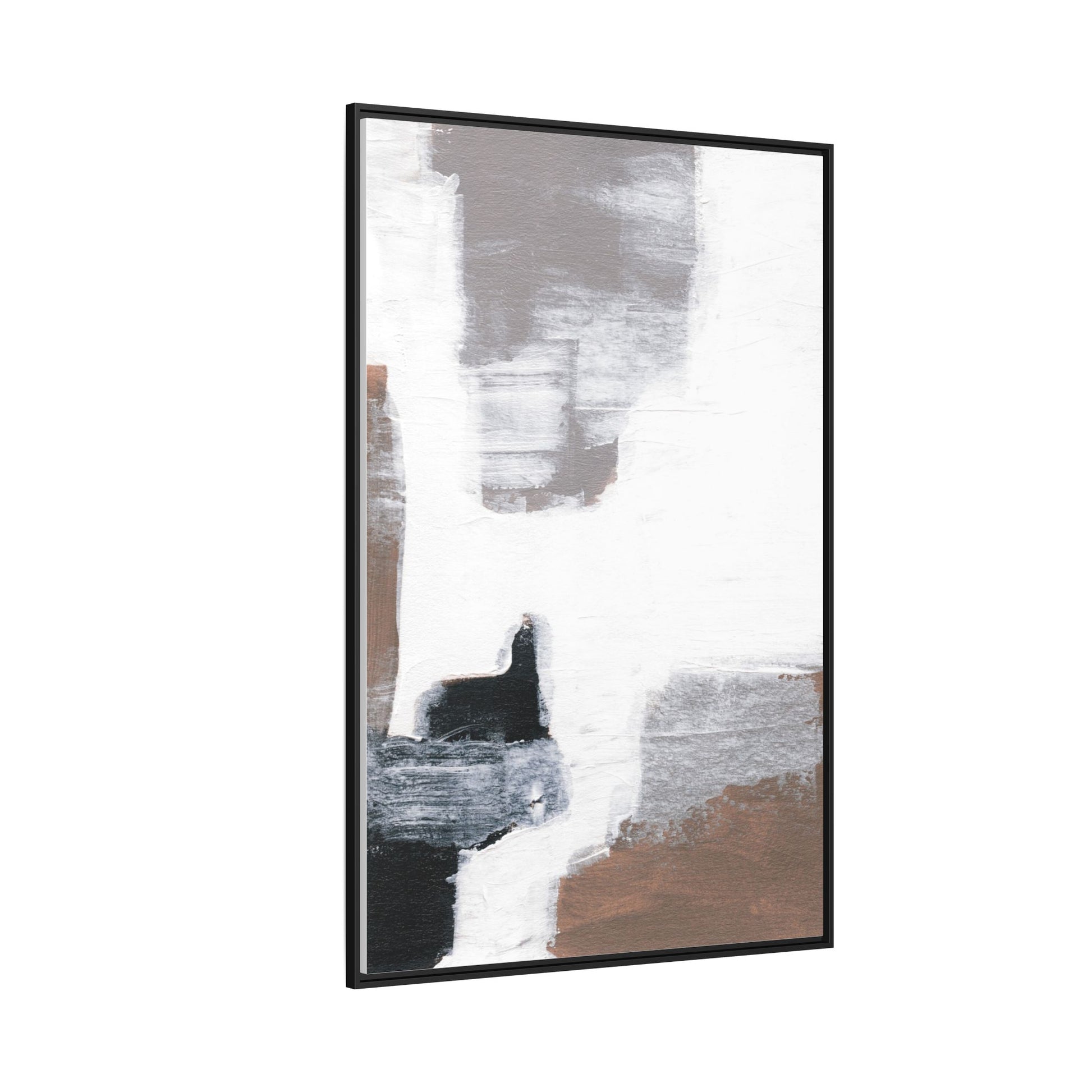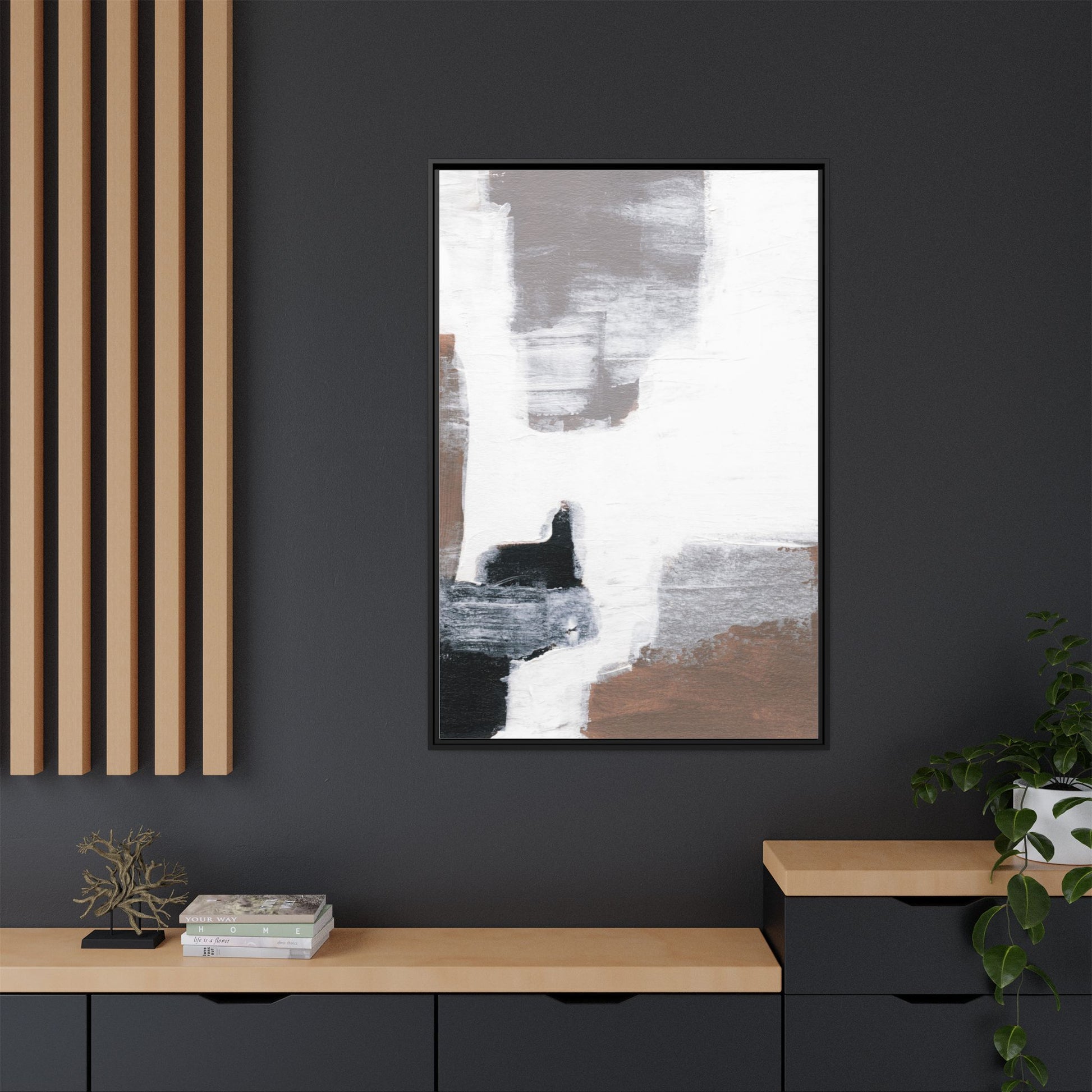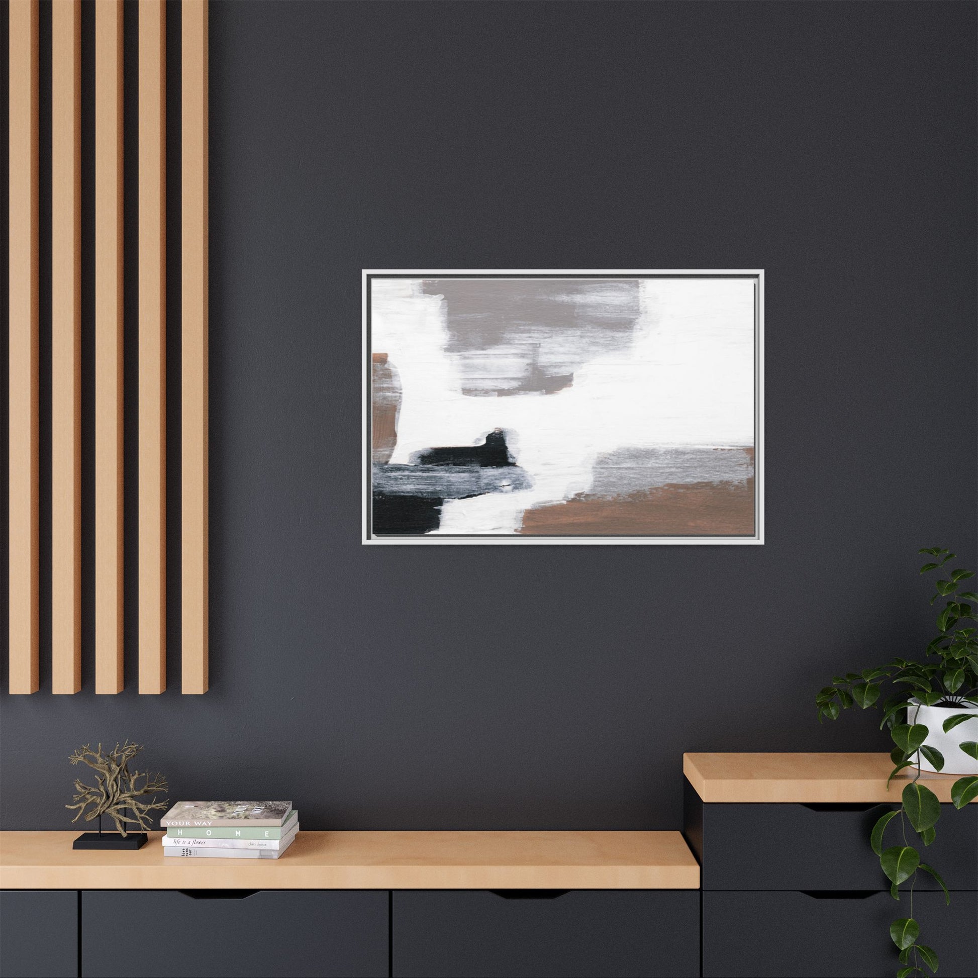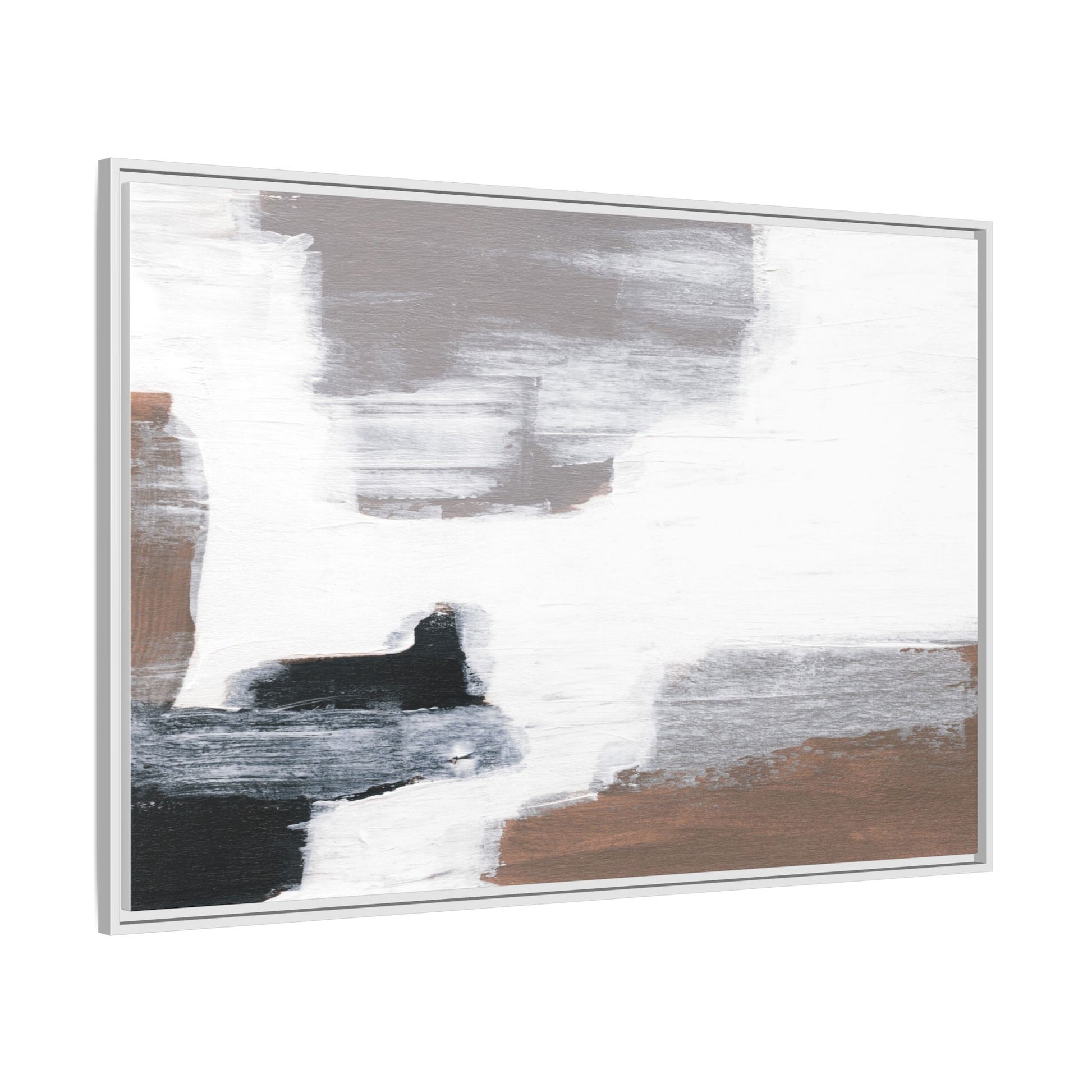 This abstract painting features a minimalist composition of gray, white, and rusty brown tones. Broad, textured brushstrokes create a layered and atmospheric effect across the canvas. A stark black brushstroke cuts through the center of the image, providing a bold contrast to the softer, more muted background colors. The painting appears to be created with acrylic or oil paint, showcasing a gestural and expressive technique. The artwork evokes a sense of depth and movement through its dynamic brush techniques and carefully balanced color palette.