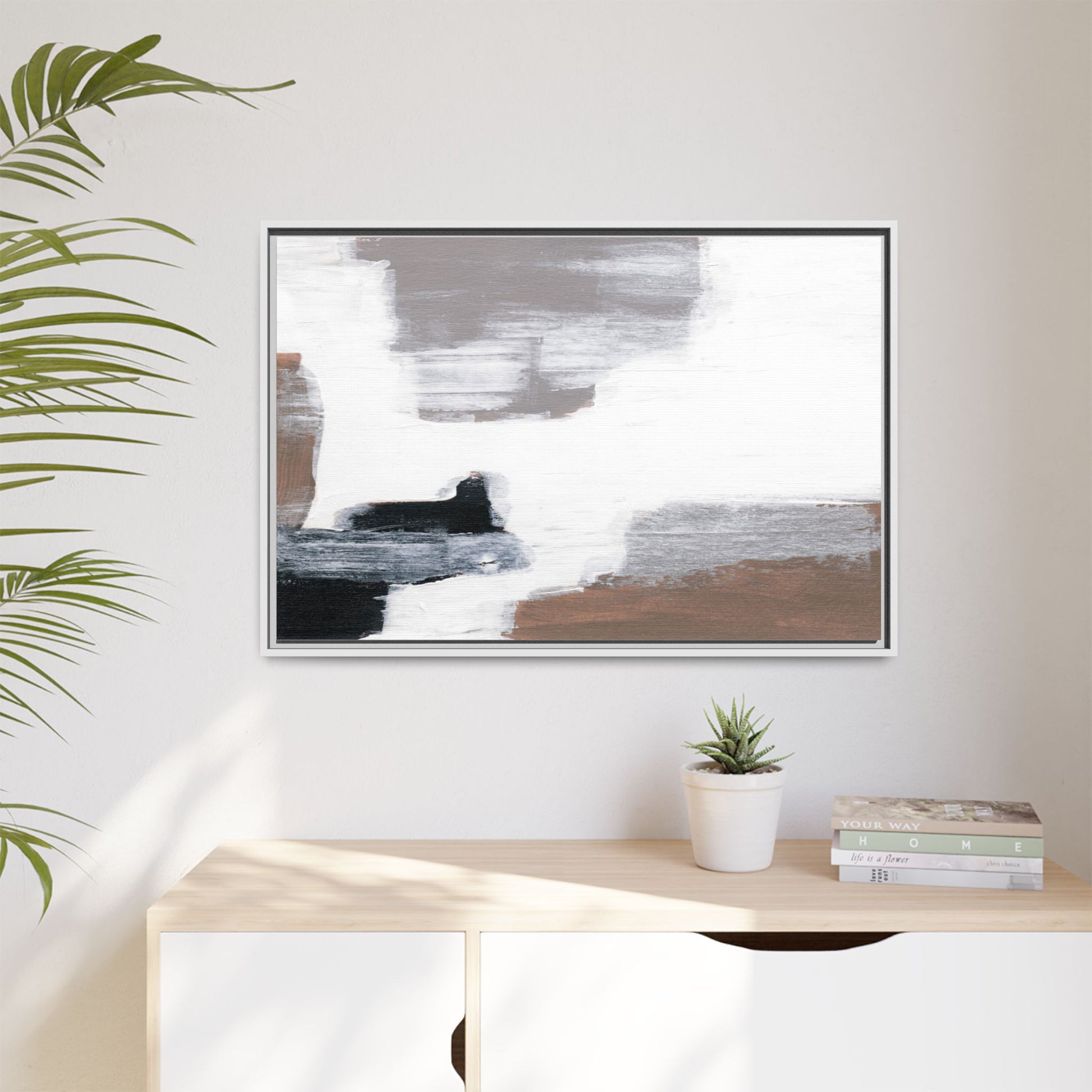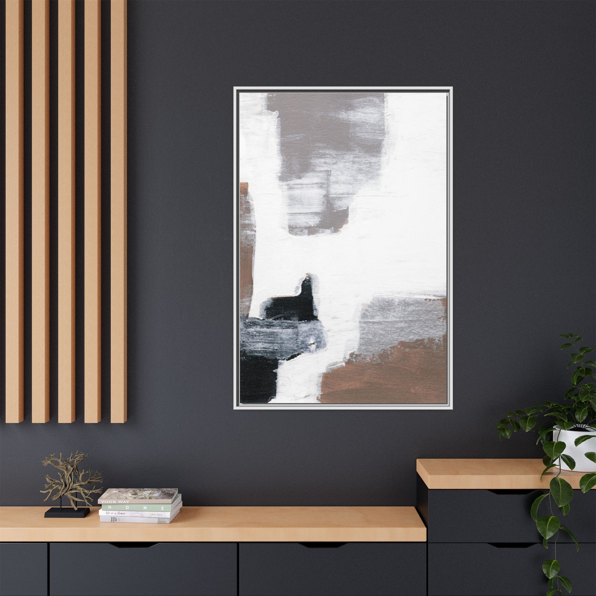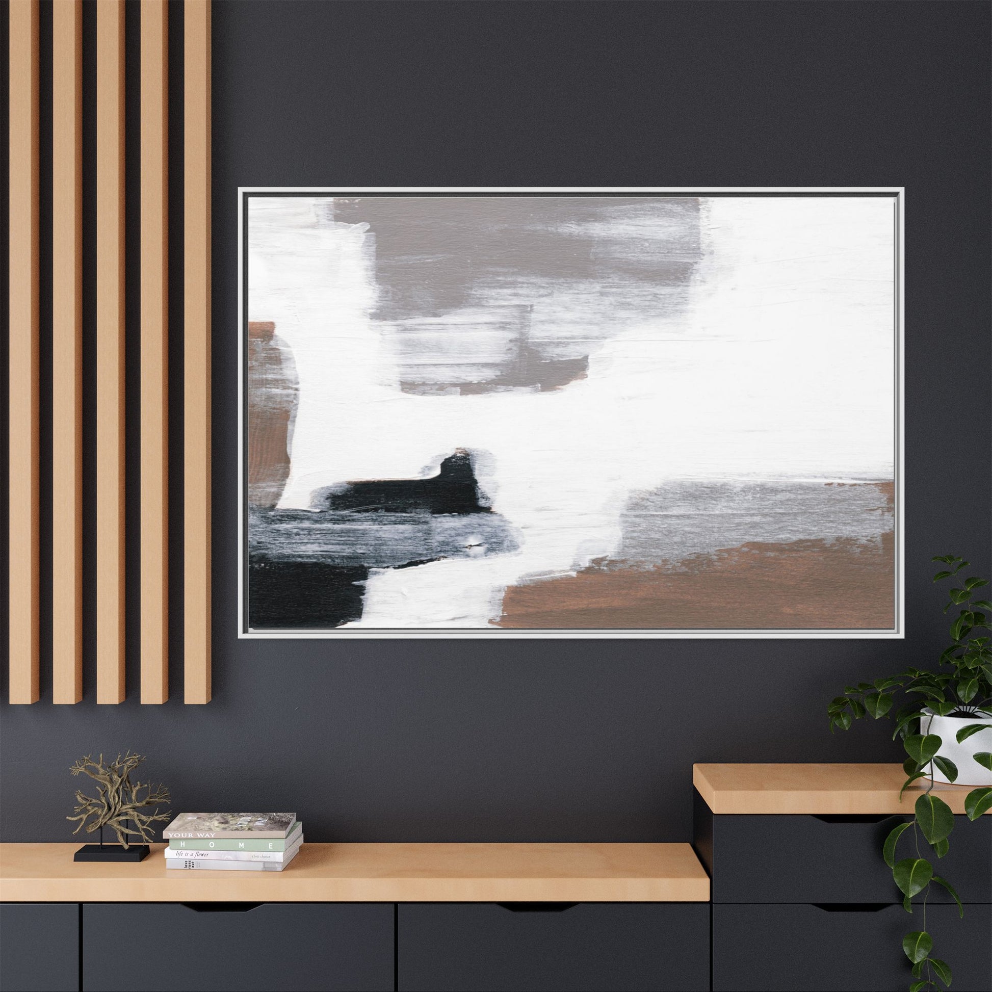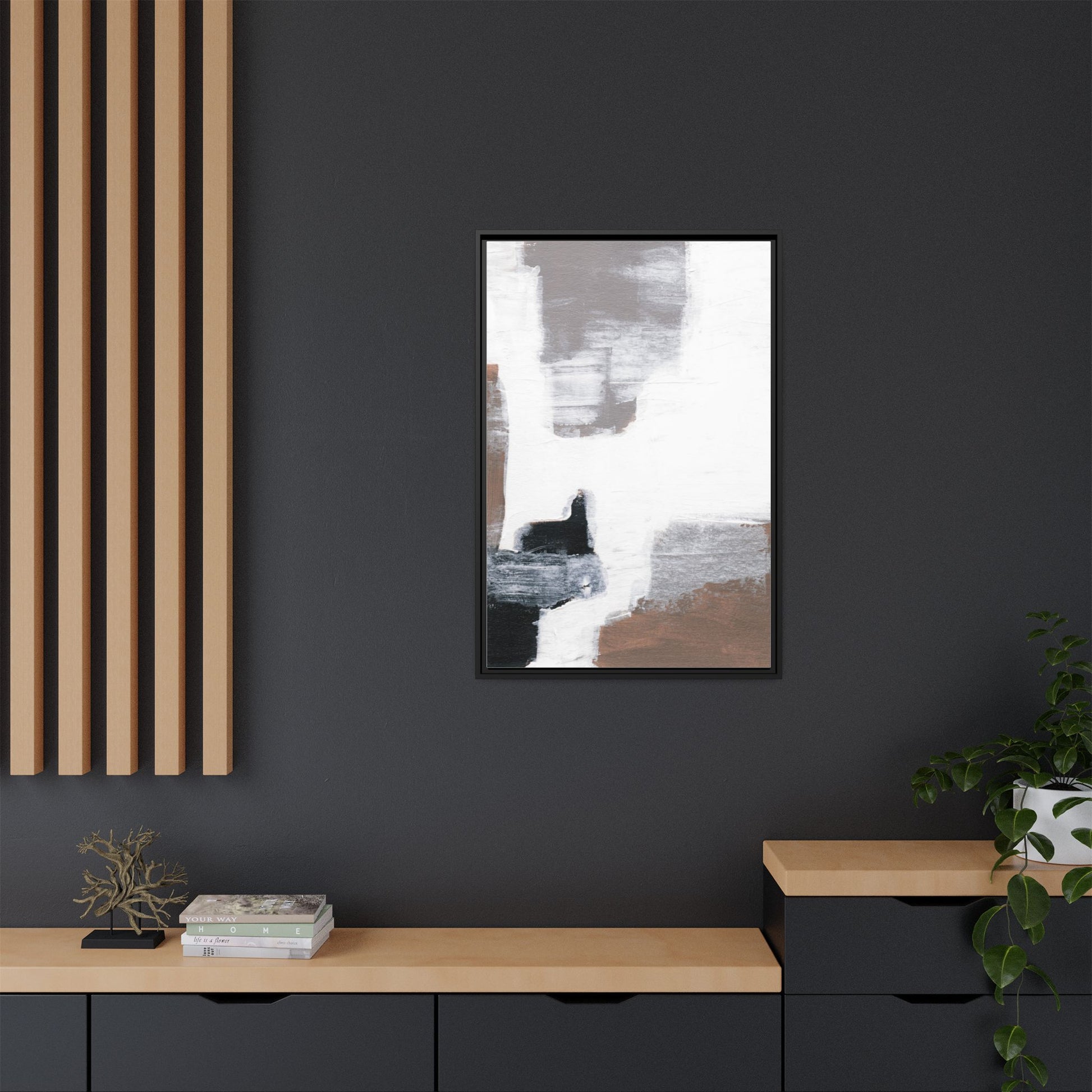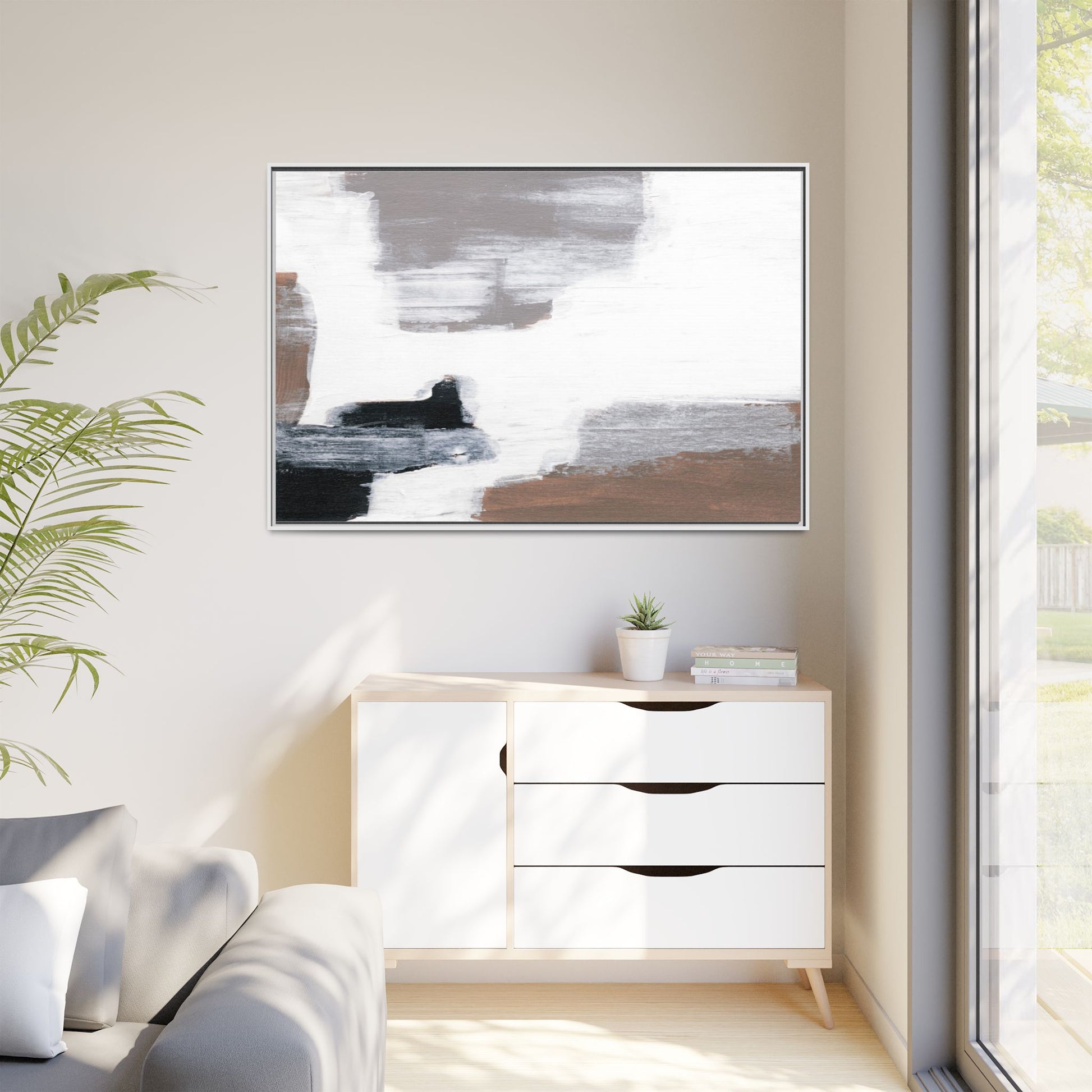 This abstract painting features a minimalist composition of gray, white, and rusty brown tones. Broad, textured brushstrokes create a layered and atmospheric effect across the canvas. A stark black brushstroke cuts through the center of the image, providing a bold contrast to the softer, more muted background colors. The painting appears to be created with acrylic or oil paint, showcasing a gestural and expressive technique. The artwork evokes a sense of depth and movement through its dynamic brush techniques and carefully balanced color palette.