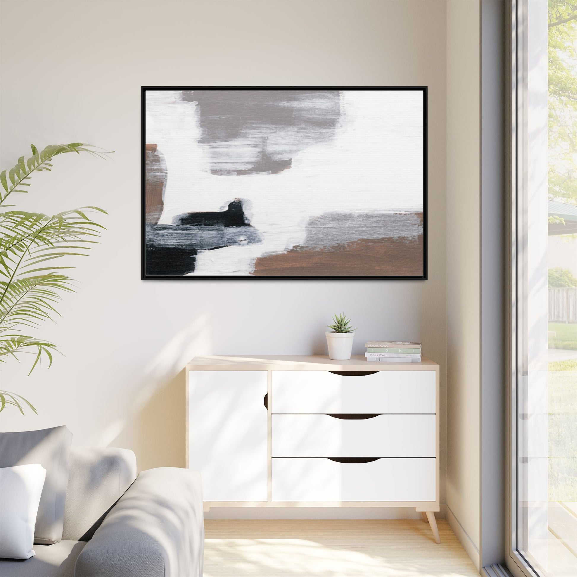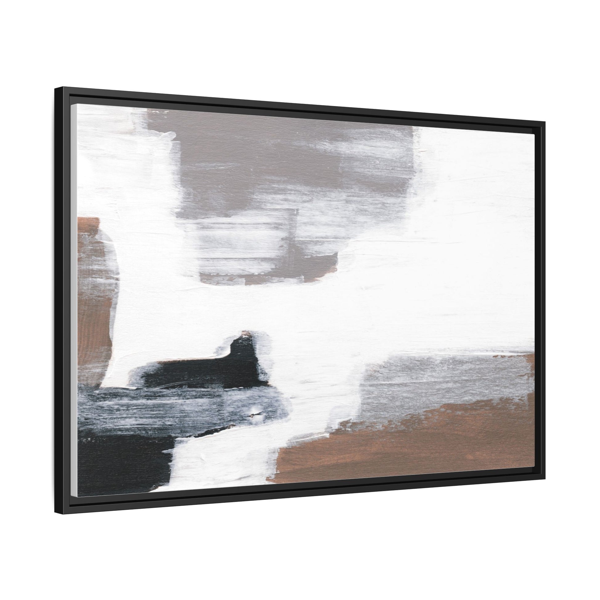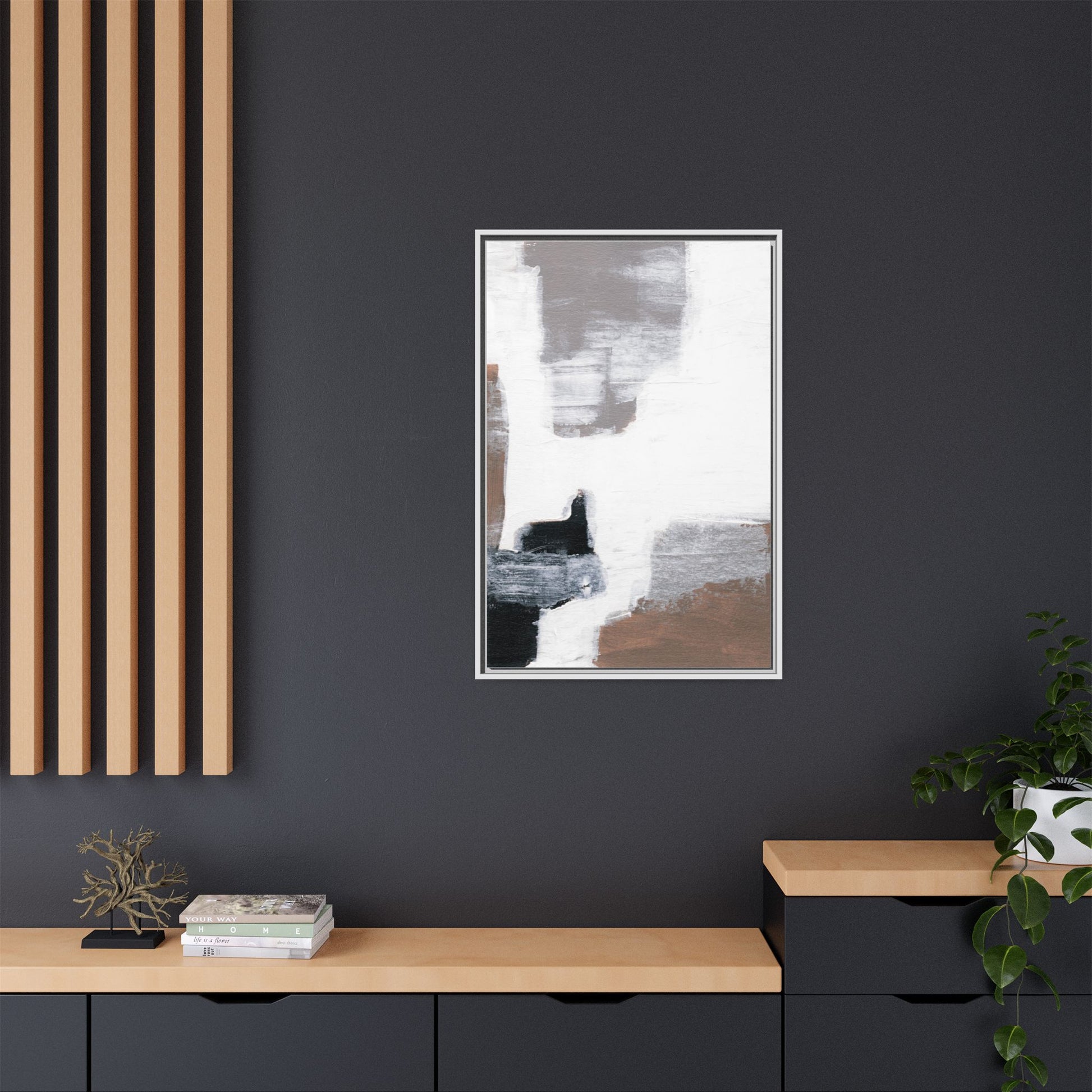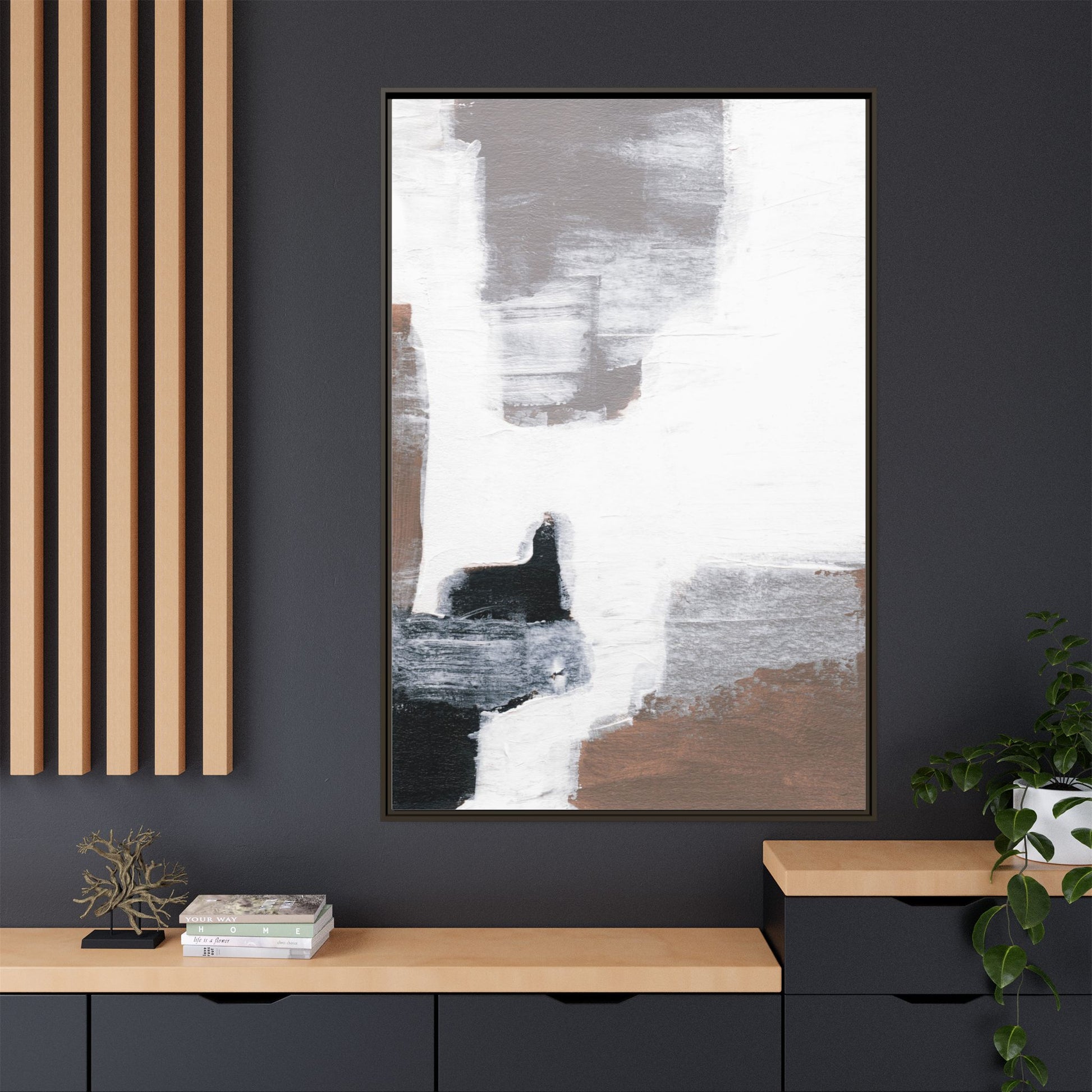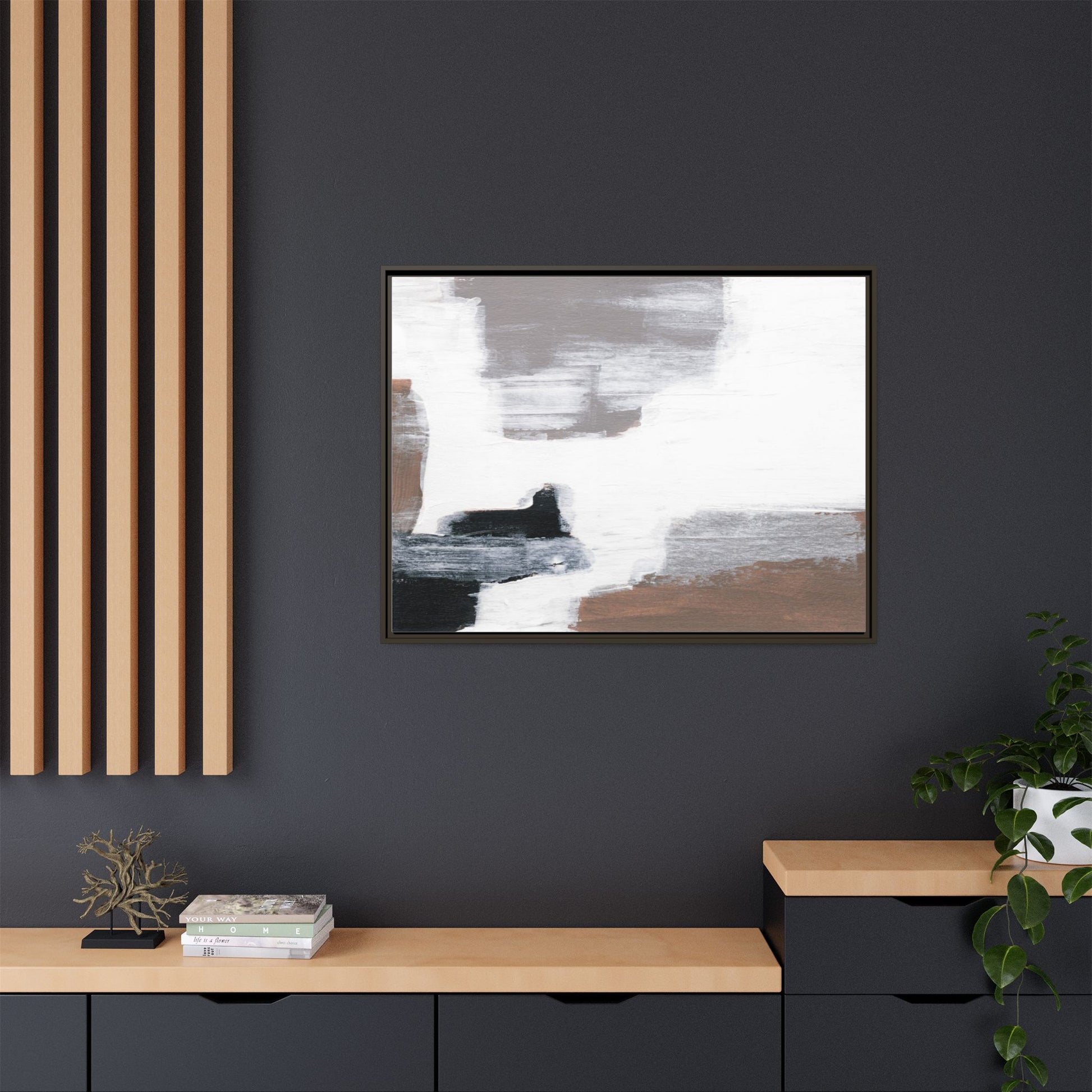 This abstract painting features a minimalist composition of gray, white, and rusty brown tones. Broad, textured brushstrokes create a layered and atmospheric effect across the canvas. A stark black brushstroke cuts through the center of the image, providing a bold contrast to the softer, more muted background colors. The painting appears to be created with acrylic or oil paint, showcasing a gestural and expressive technique. The artwork evokes a sense of depth and movement through its dynamic brush techniques and carefully balanced color palette.