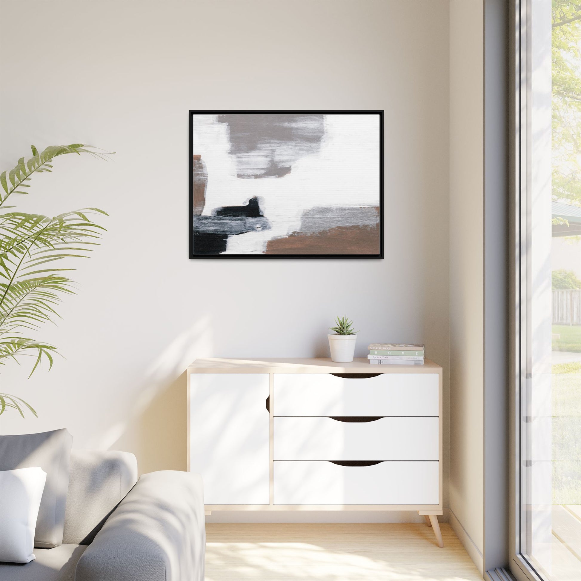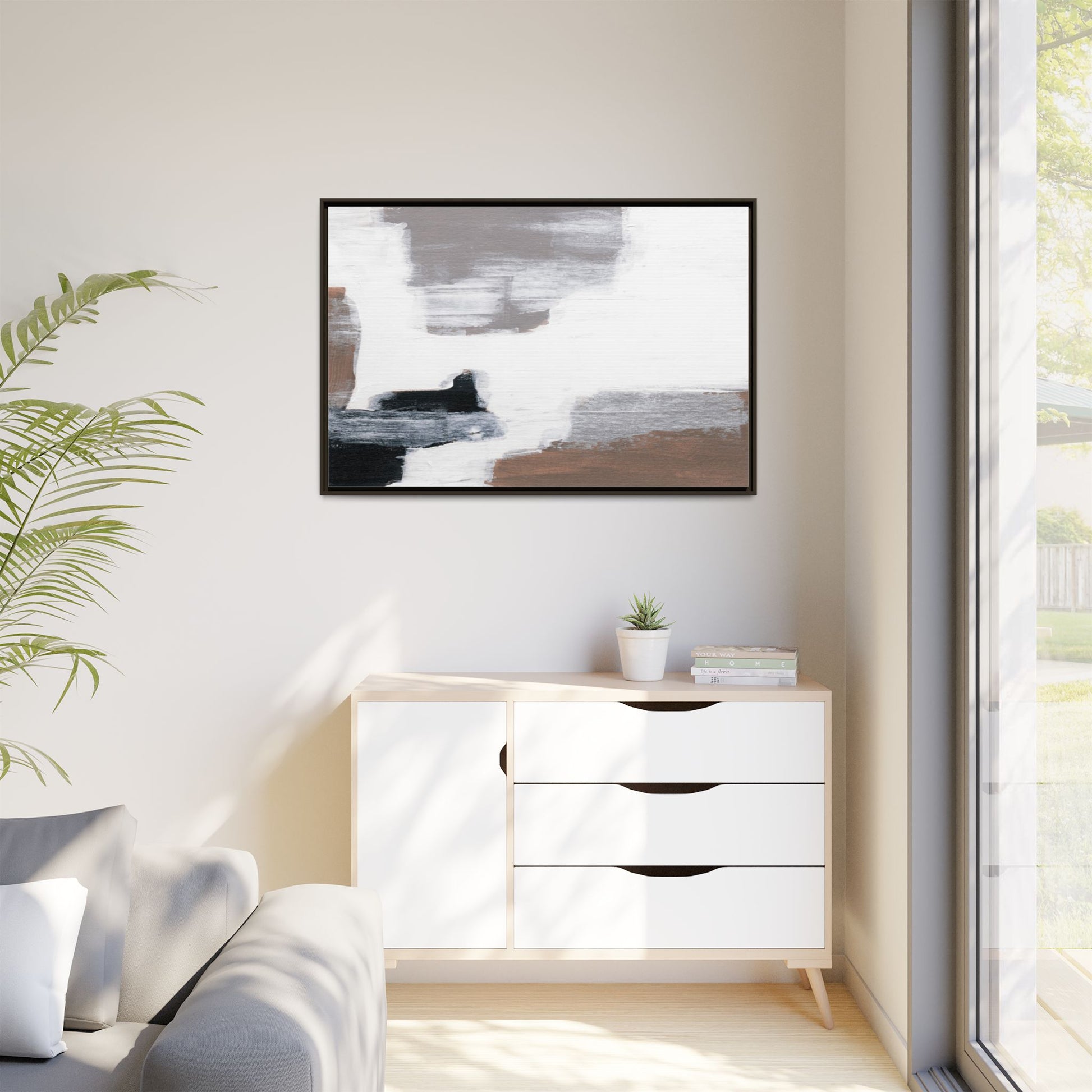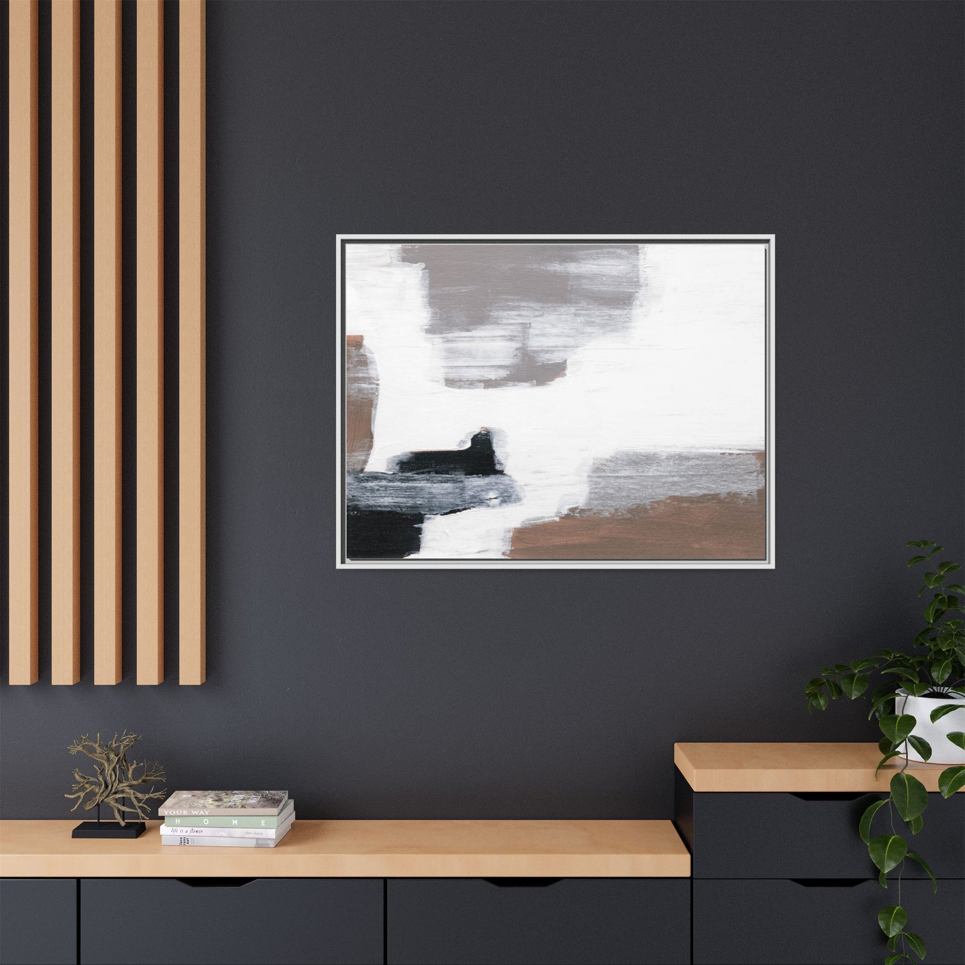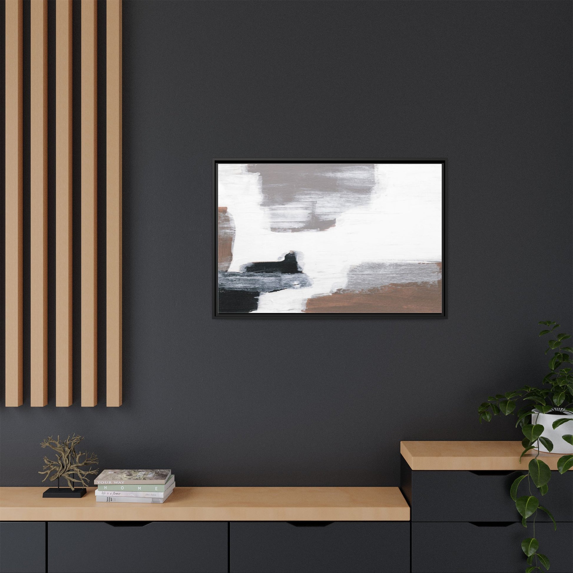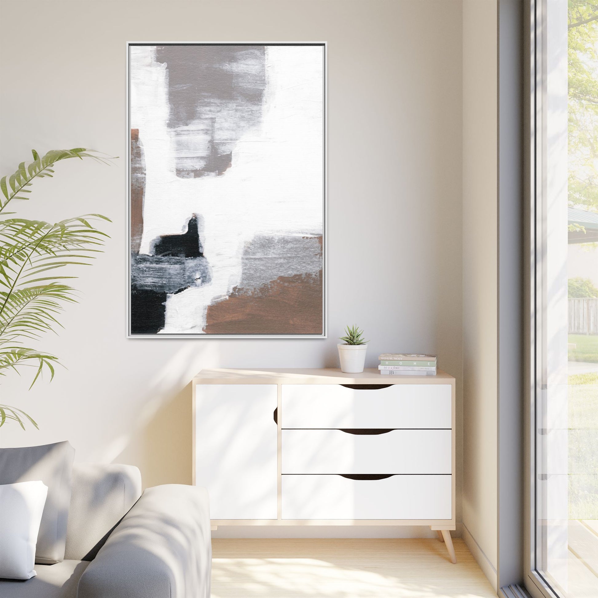 This abstract painting features a minimalist composition of gray, white, and rusty brown tones. Broad, textured brushstrokes create a layered and atmospheric effect across the canvas. A stark black brushstroke cuts through the center of the image, providing a bold contrast to the softer, more muted background colors. The painting appears to be created with acrylic or oil paint, showcasing a gestural and expressive technique. The artwork evokes a sense of depth and movement through its dynamic brush techniques and carefully balanced color palette.