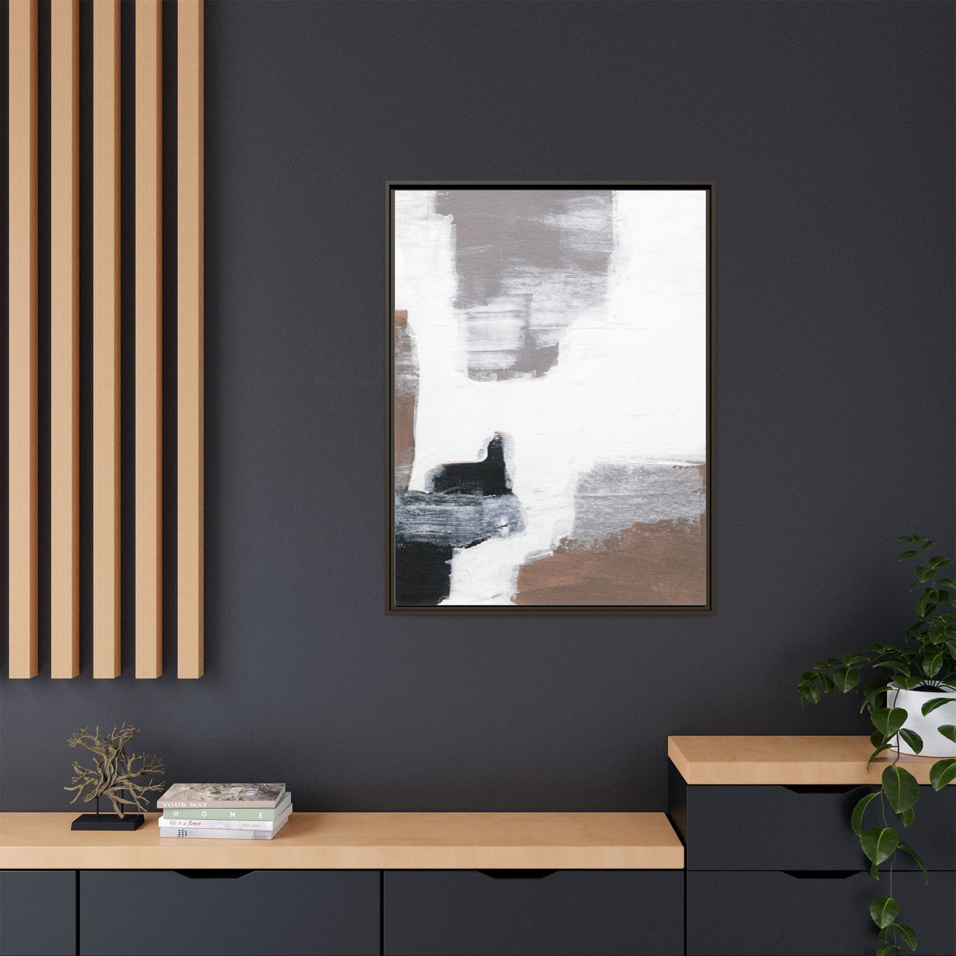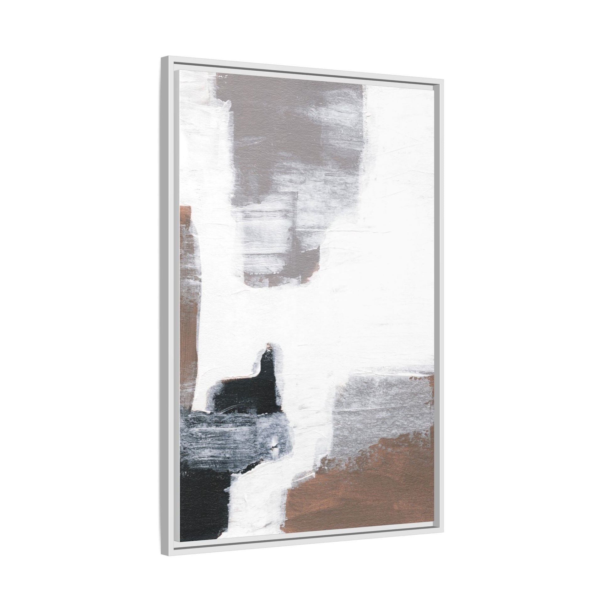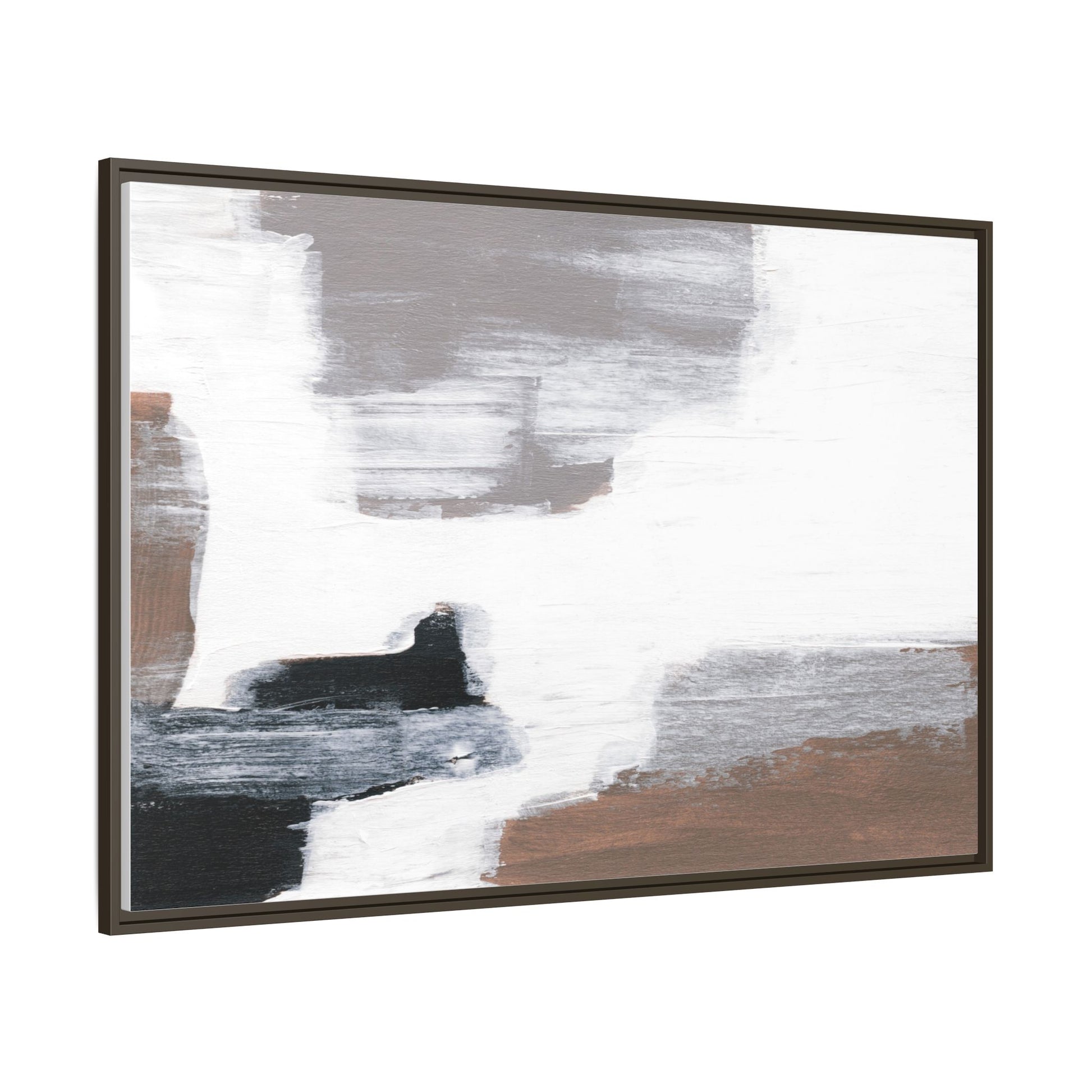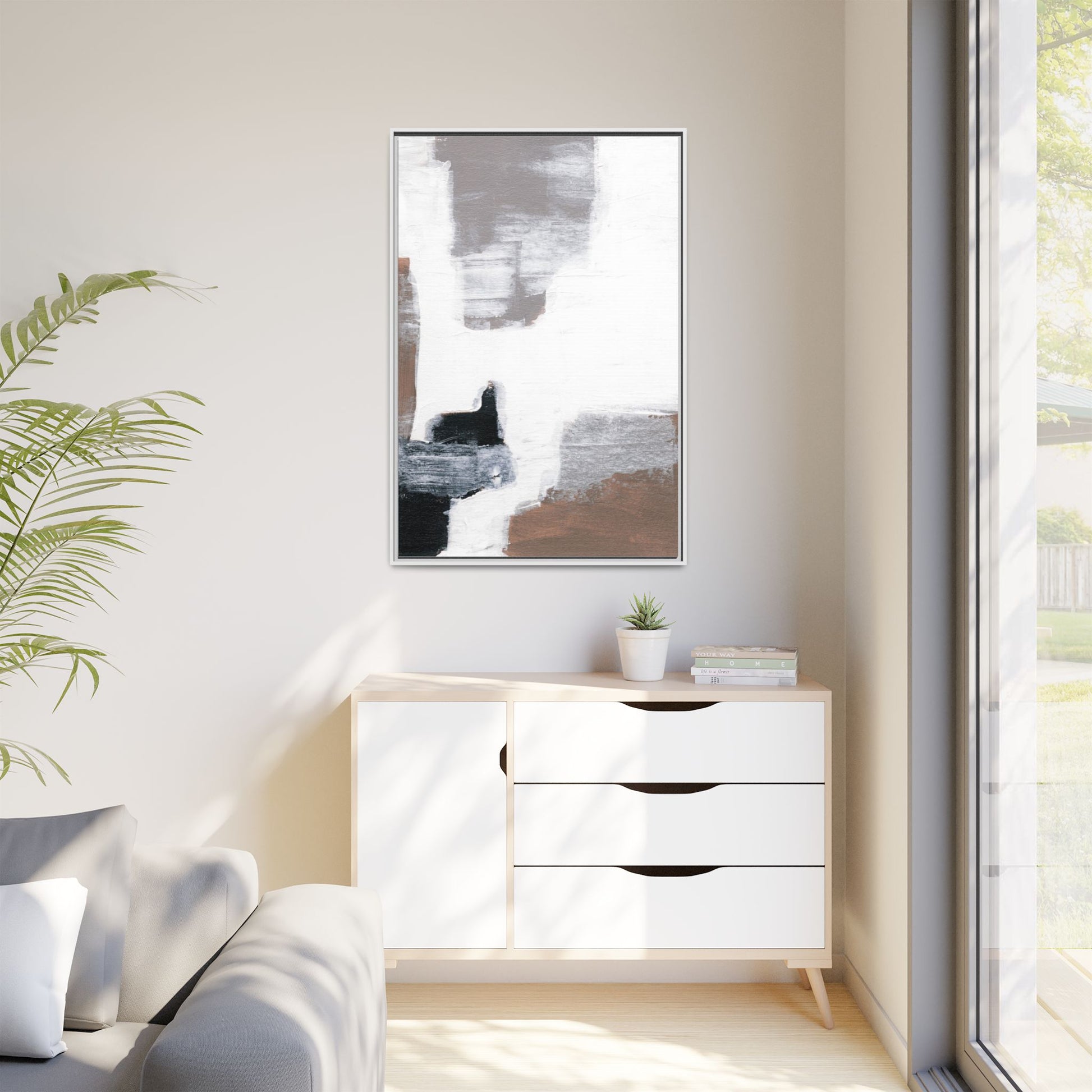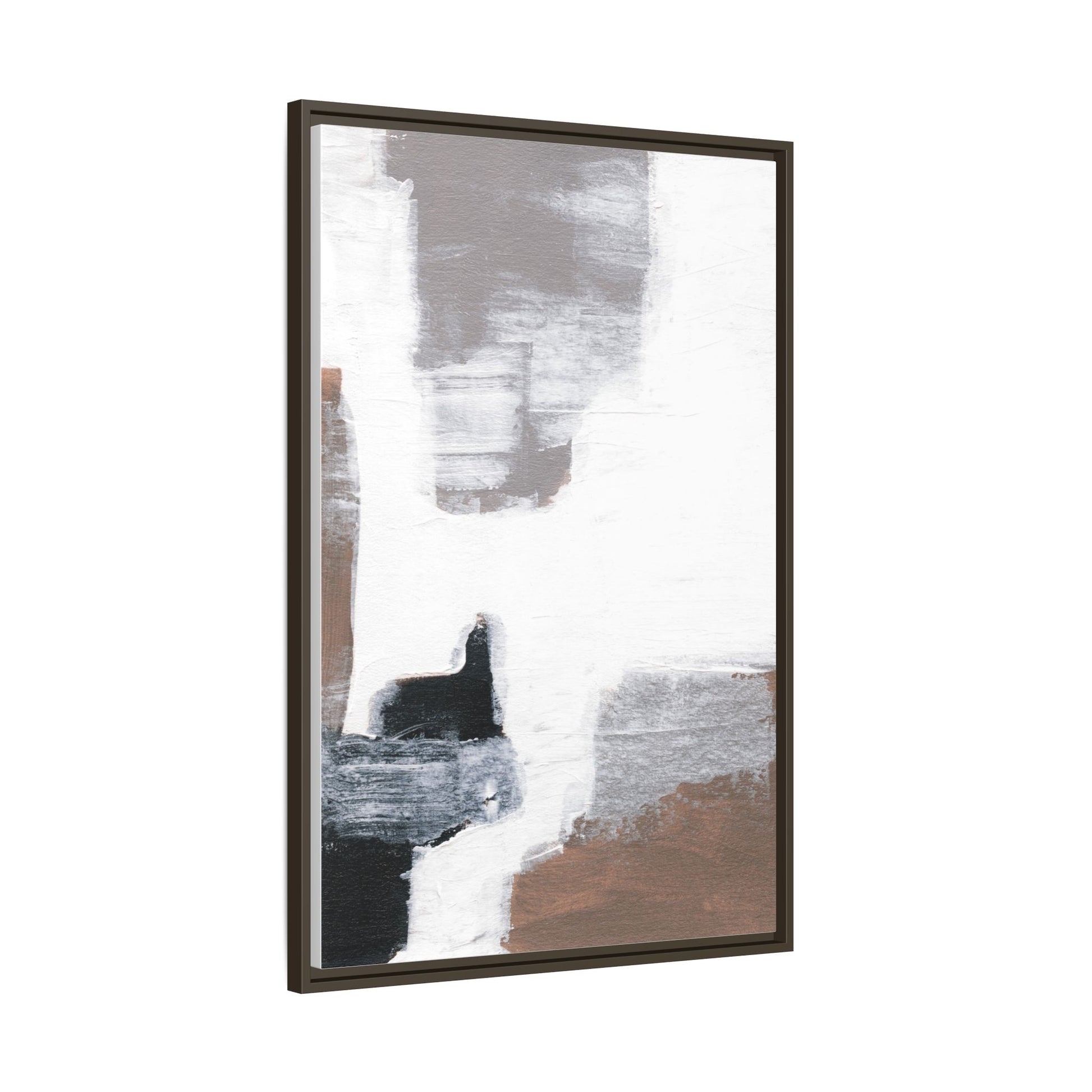 This abstract painting features a minimalist composition of gray, white, and rusty brown tones. Broad, textured brushstrokes create a layered and atmospheric effect across the canvas. A stark black brushstroke cuts through the center of the image, providing a bold contrast to the softer, more muted background colors. The painting appears to be created with acrylic or oil paint, showcasing a gestural and expressive technique. The artwork evokes a sense of depth and movement through its dynamic brush techniques and carefully balanced color palette.