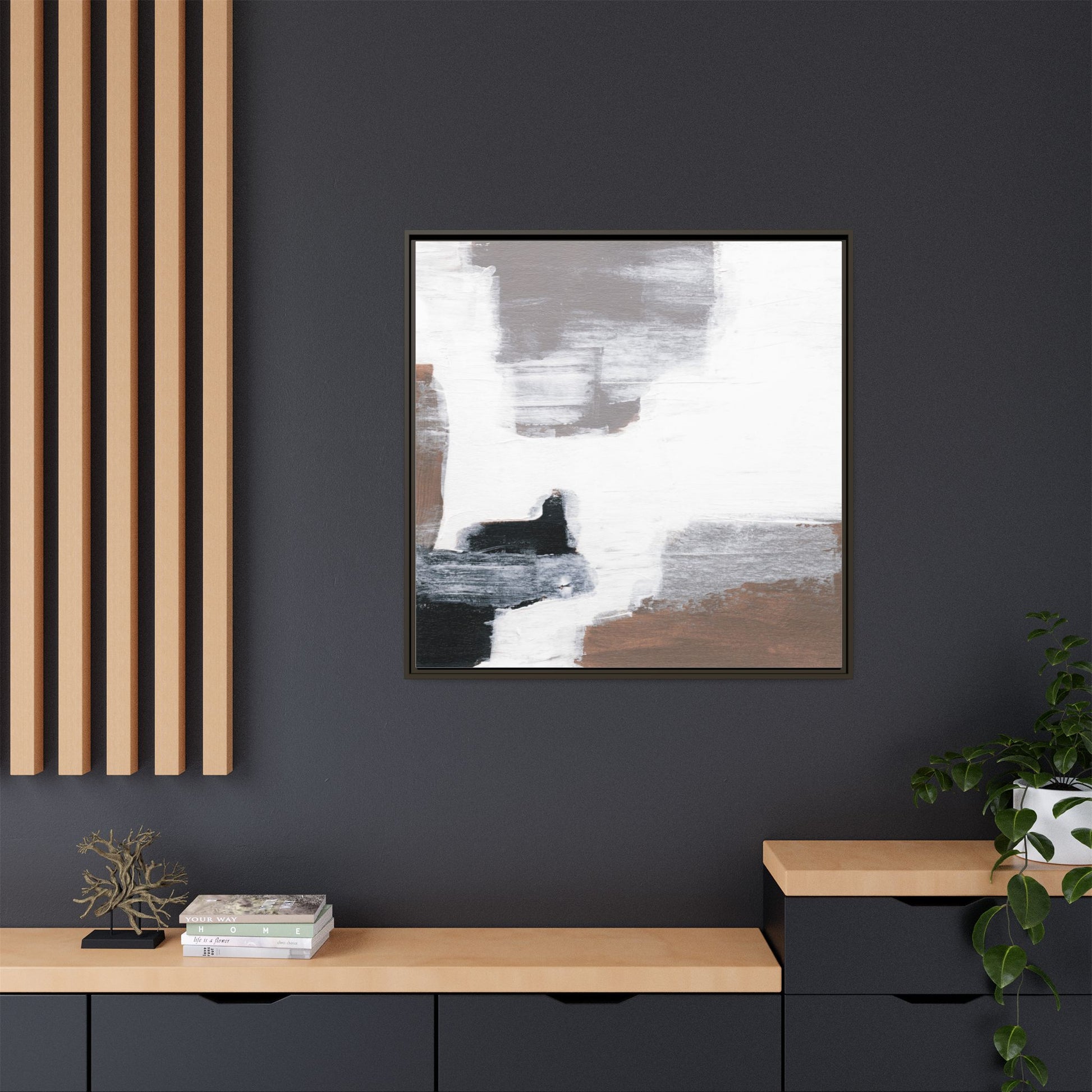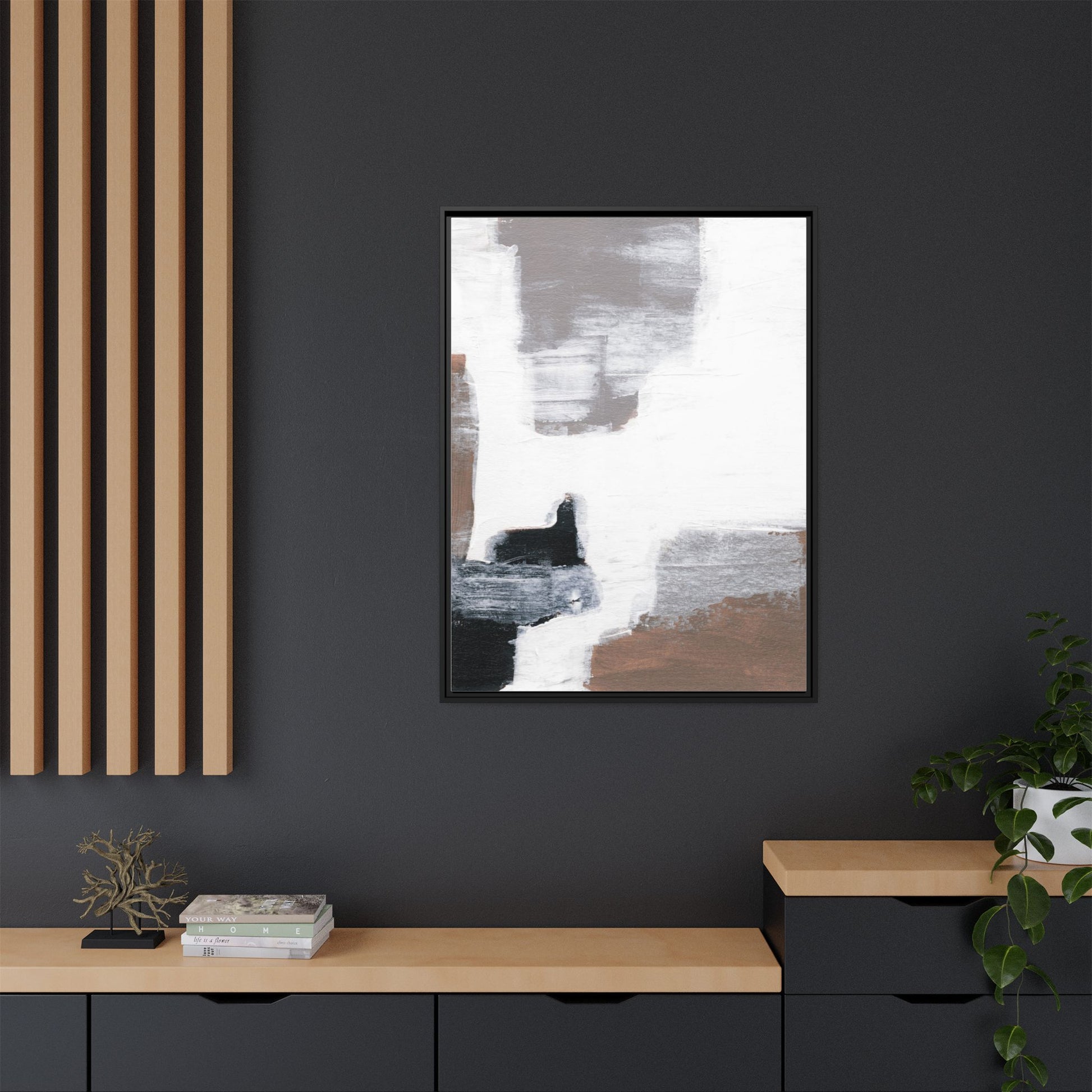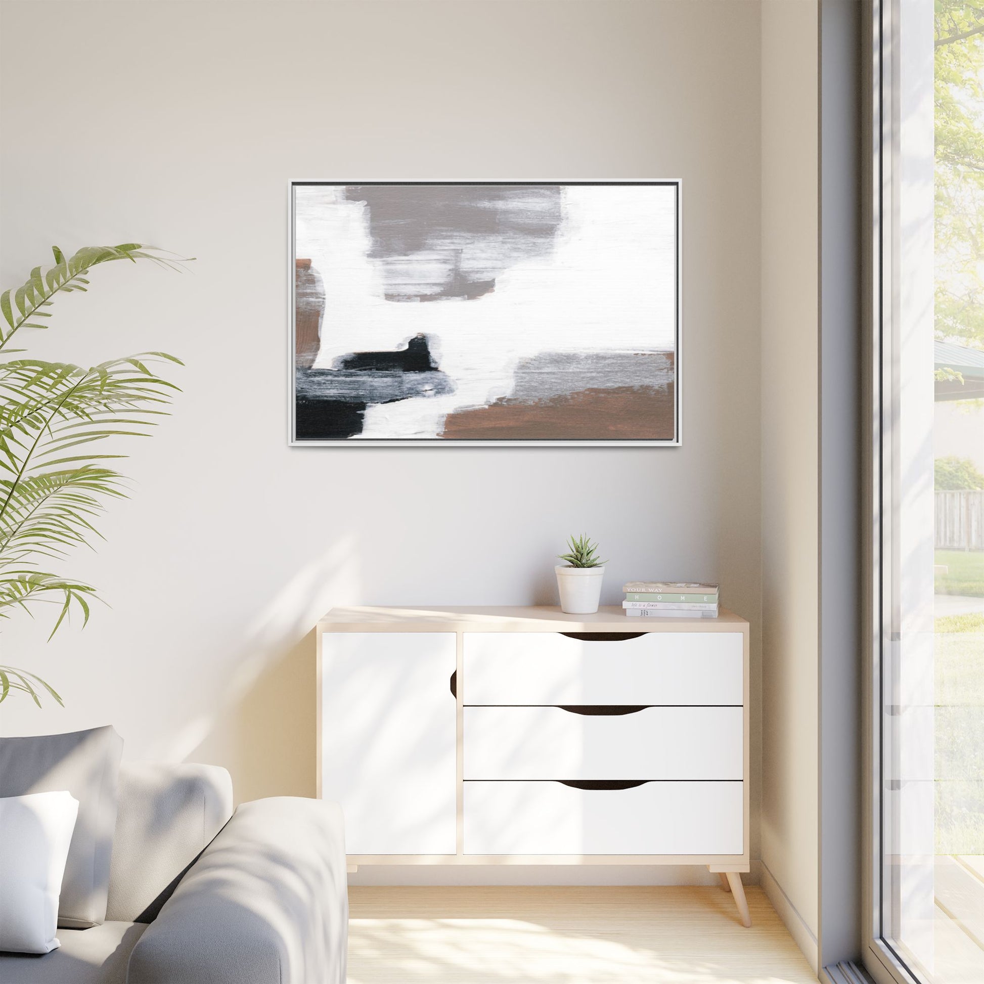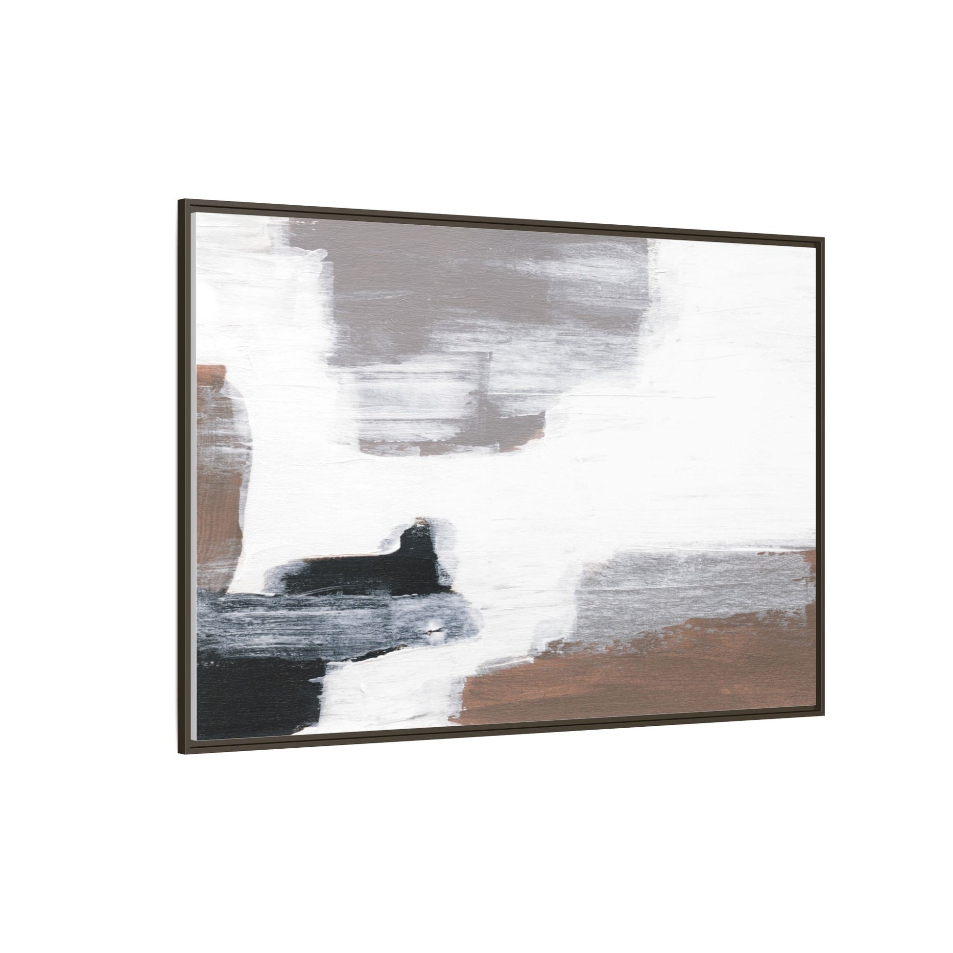 This abstract painting features a minimalist composition of gray, white, and rusty brown tones. Broad, textured brushstrokes create a layered and atmospheric effect across the canvas. A stark black brushstroke cuts through the center of the image, providing a bold contrast to the softer, more muted background colors. The painting appears to be created with acrylic or oil paint, showcasing a gestural and expressive technique. The artwork evokes a sense of depth and movement through its dynamic brush techniques and carefully balanced color palette.