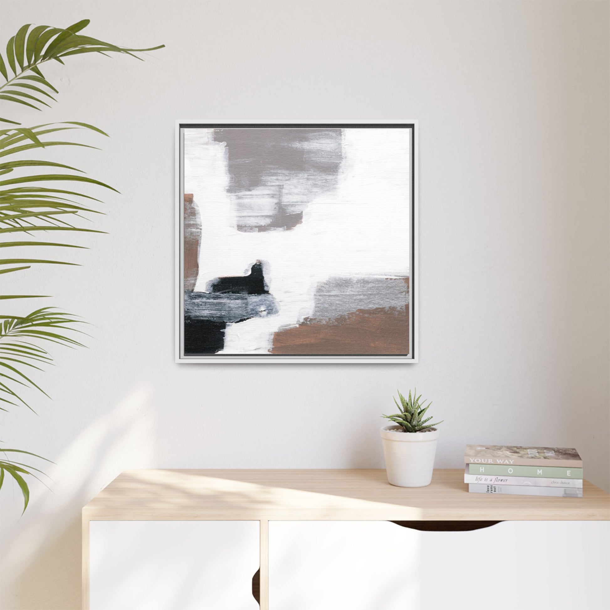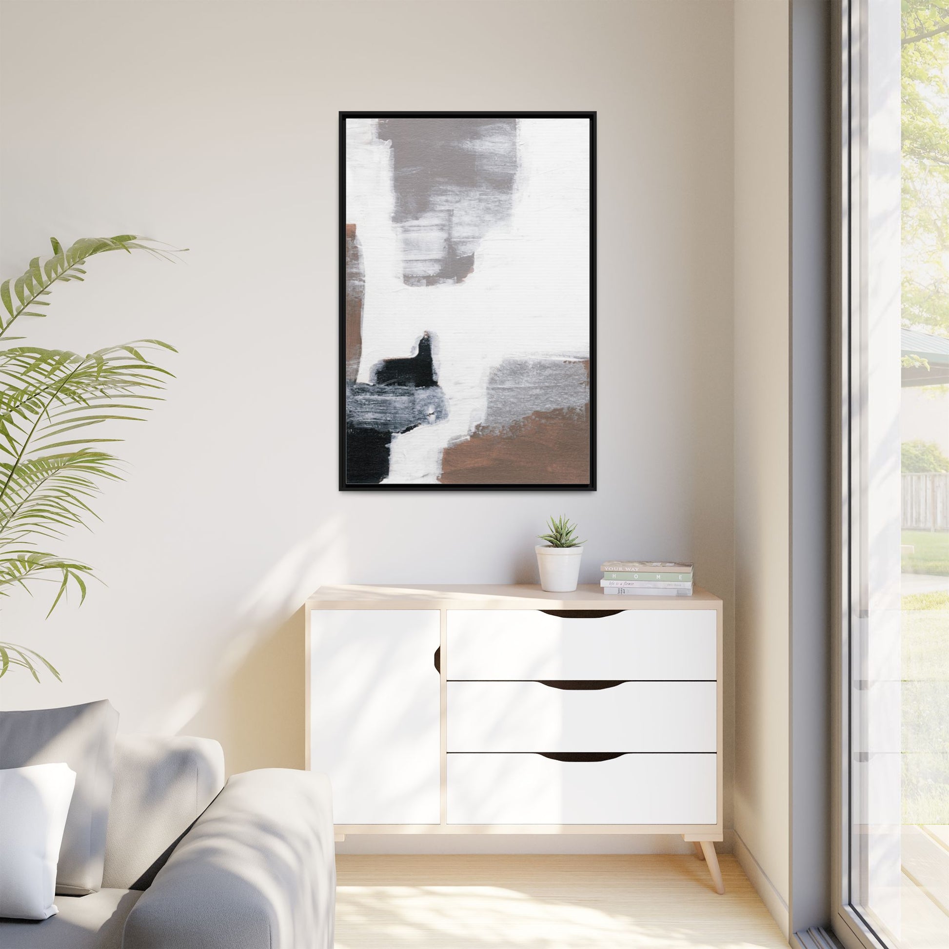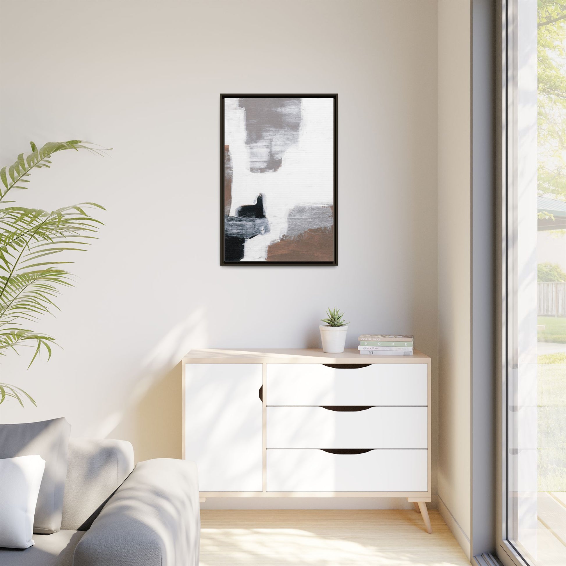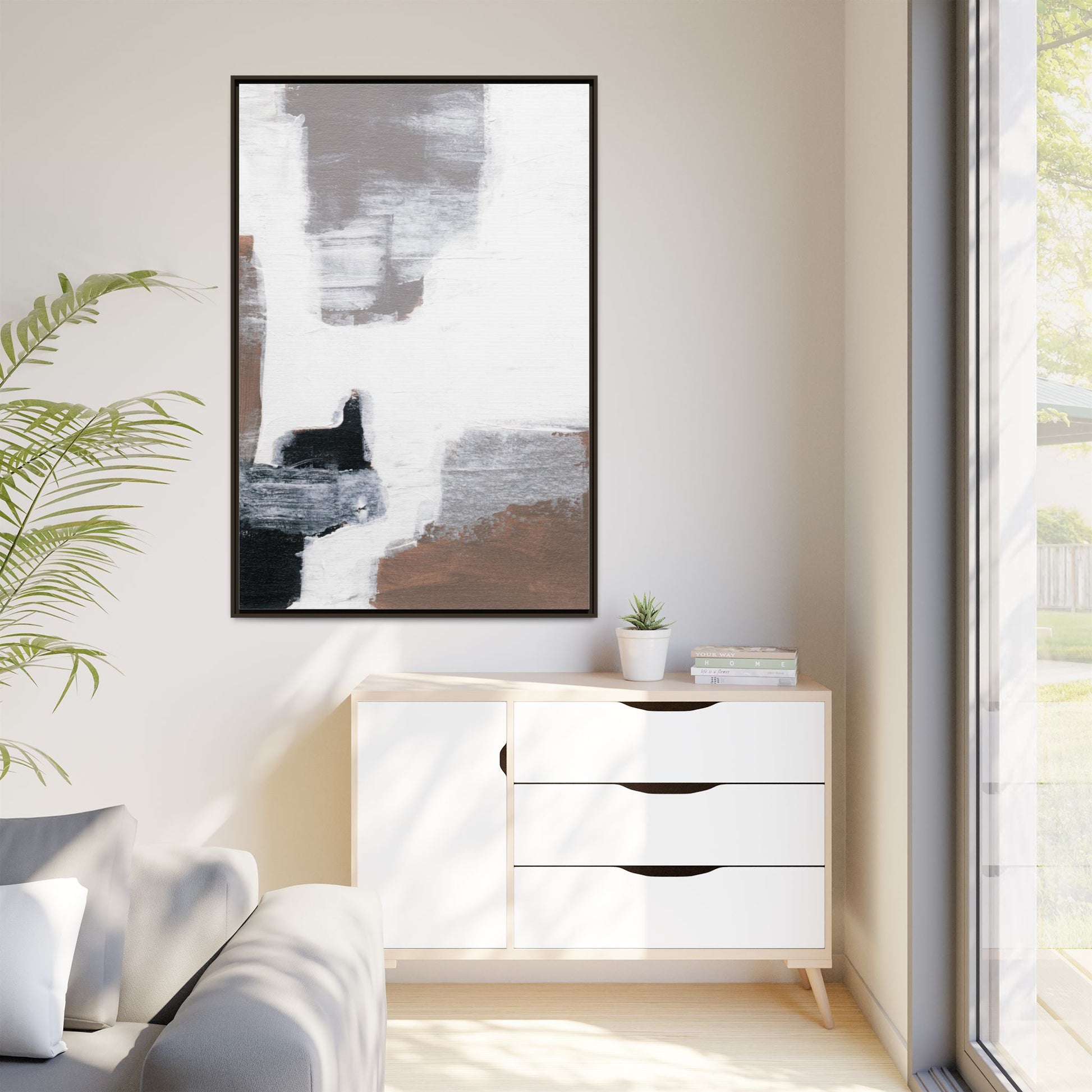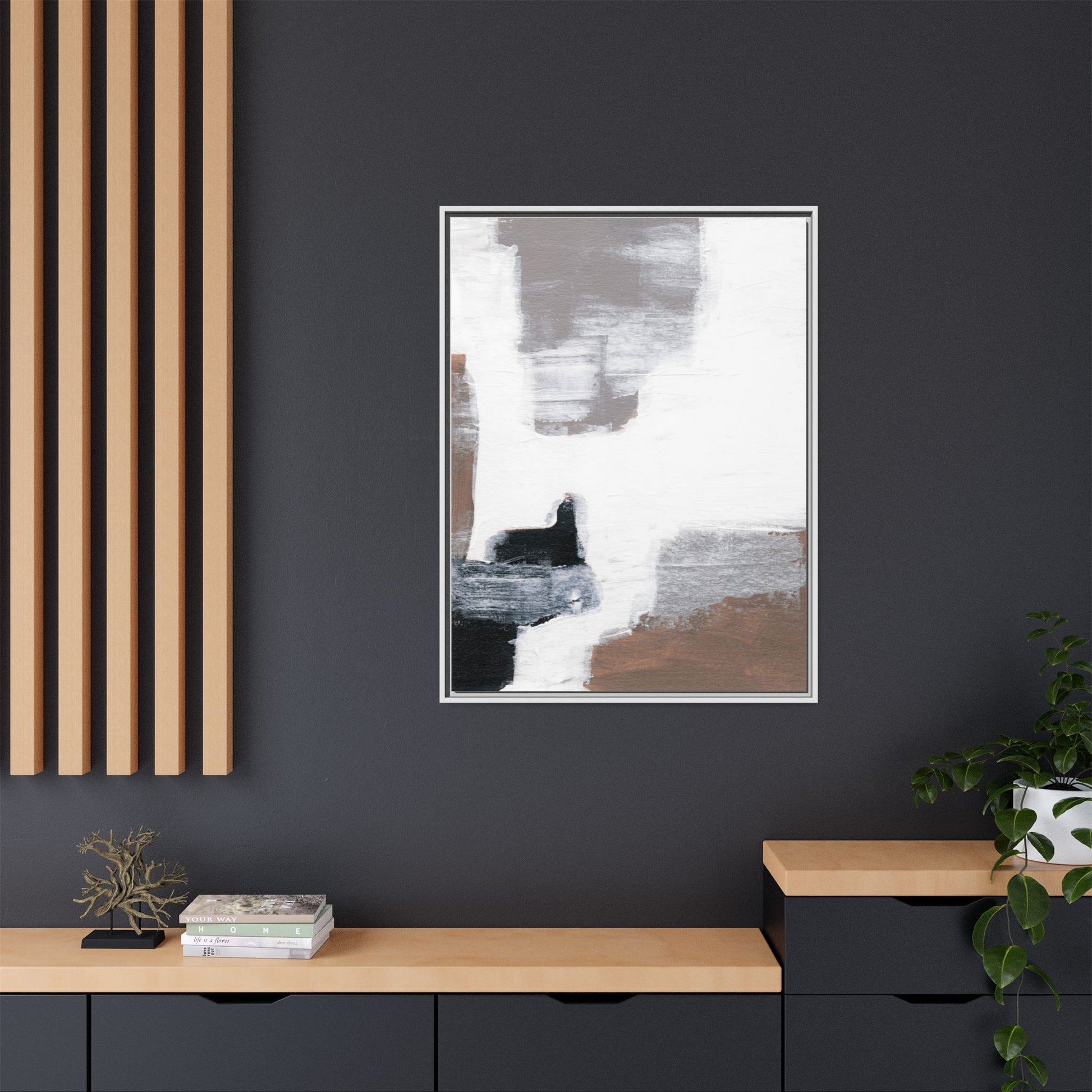 This abstract painting features a minimalist composition of gray, white, and rusty brown tones. Broad, textured brushstrokes create a layered and atmospheric effect across the canvas. A stark black brushstroke cuts through the center of the image, providing a bold contrast to the softer, more muted background colors. The painting appears to be created with acrylic or oil paint, showcasing a gestural and expressive technique. The artwork evokes a sense of depth and movement through its dynamic brush techniques and carefully balanced color palette.