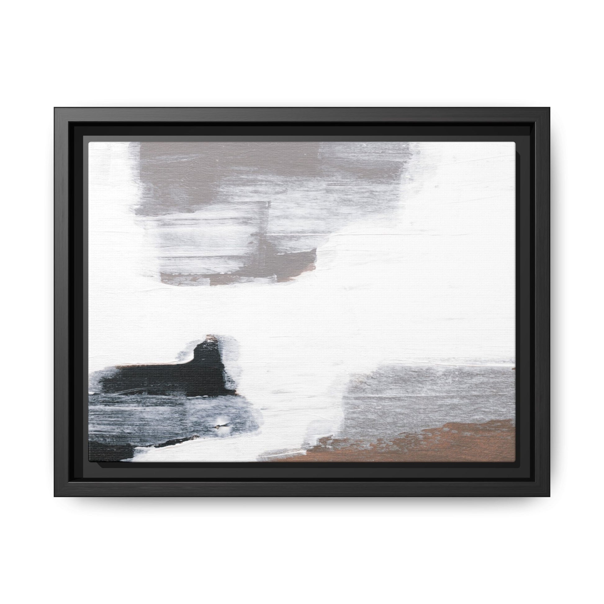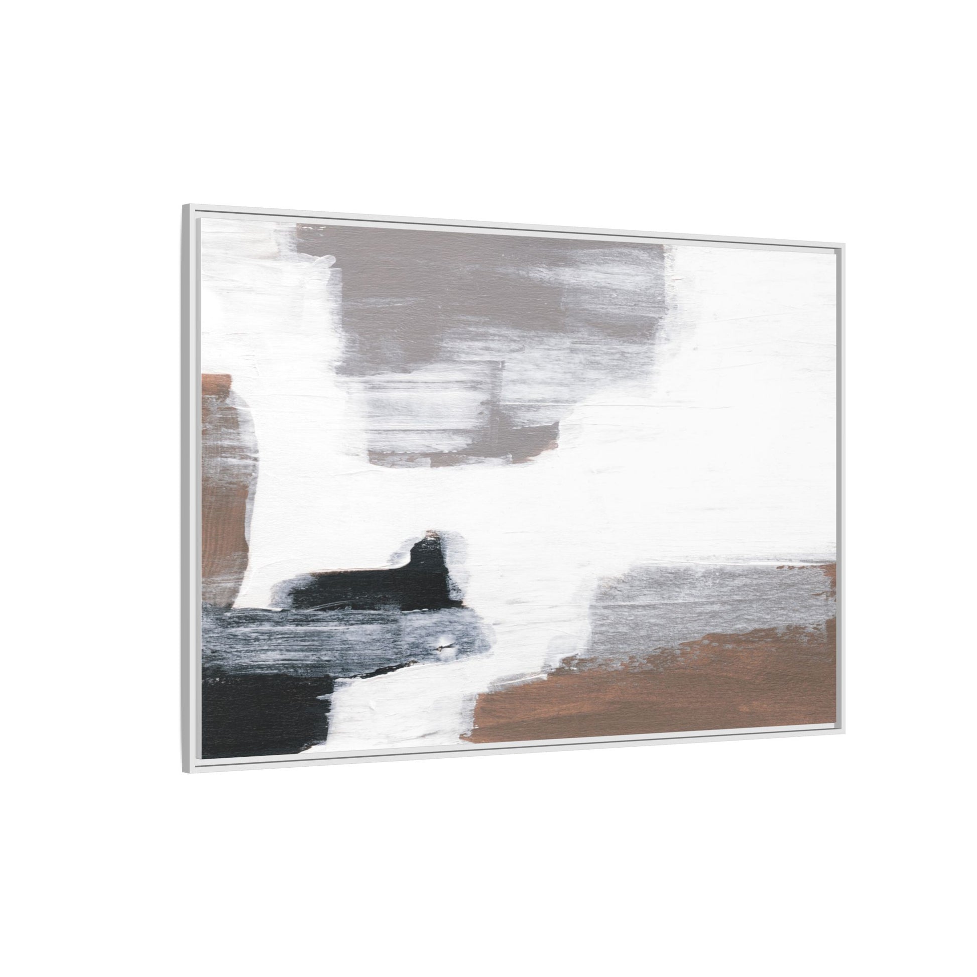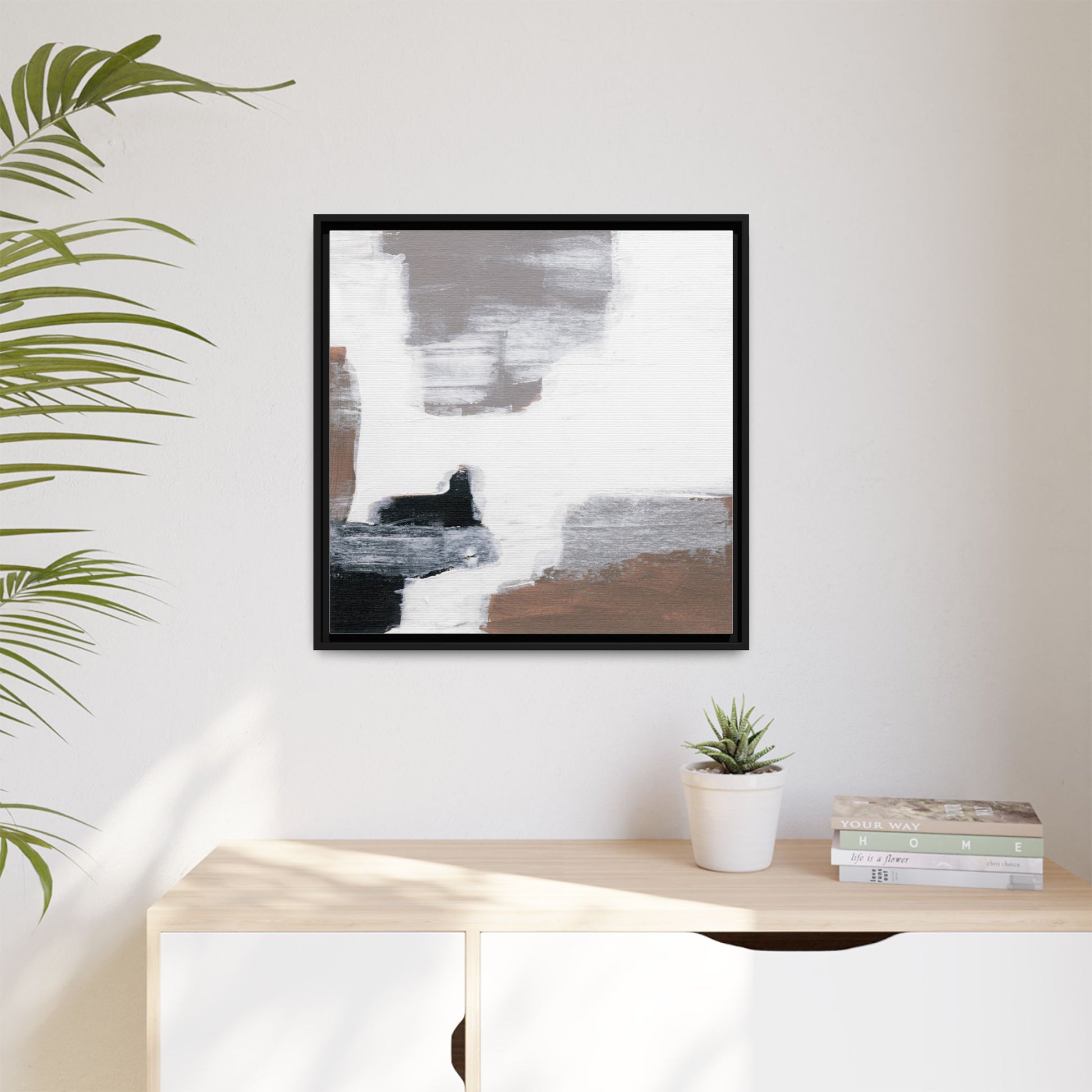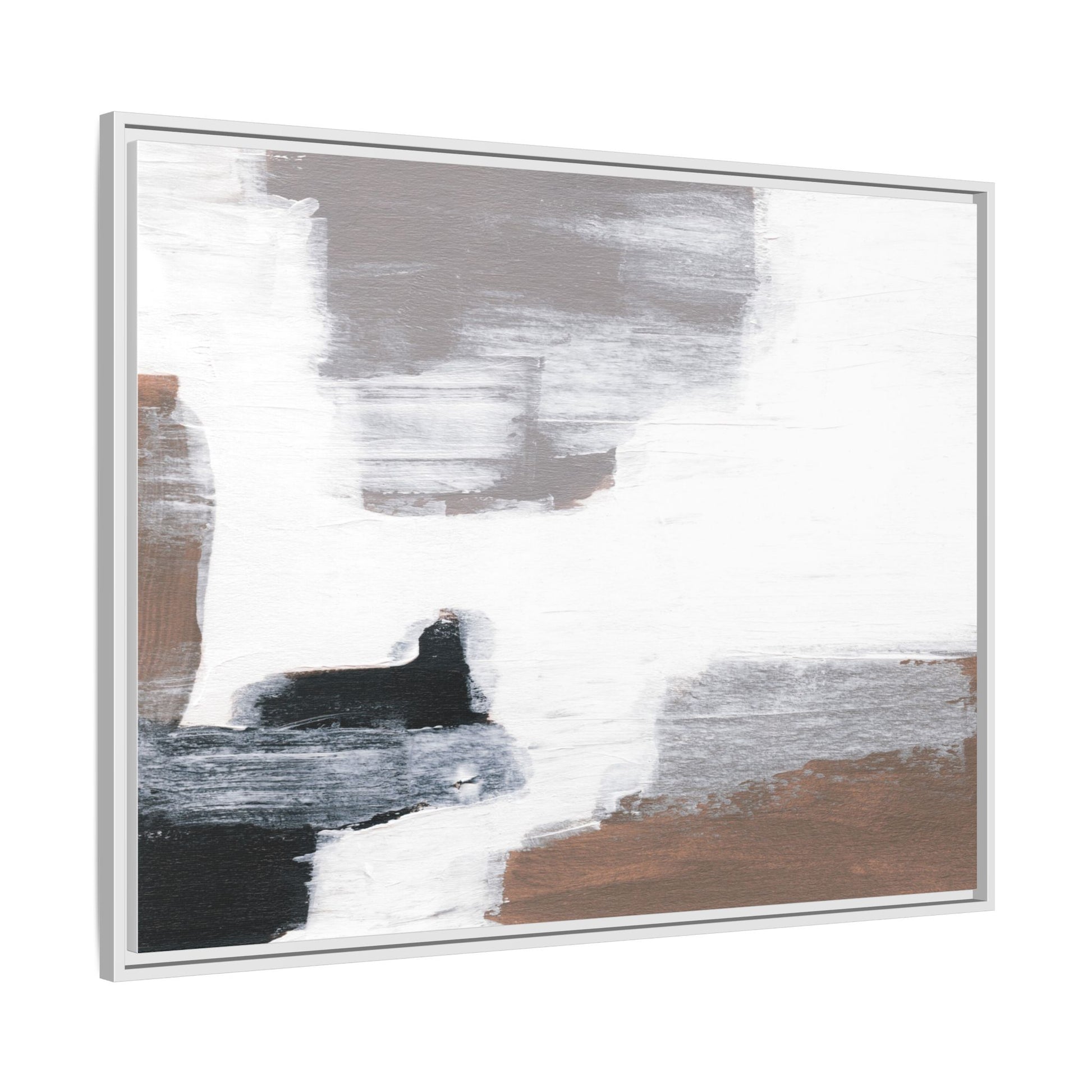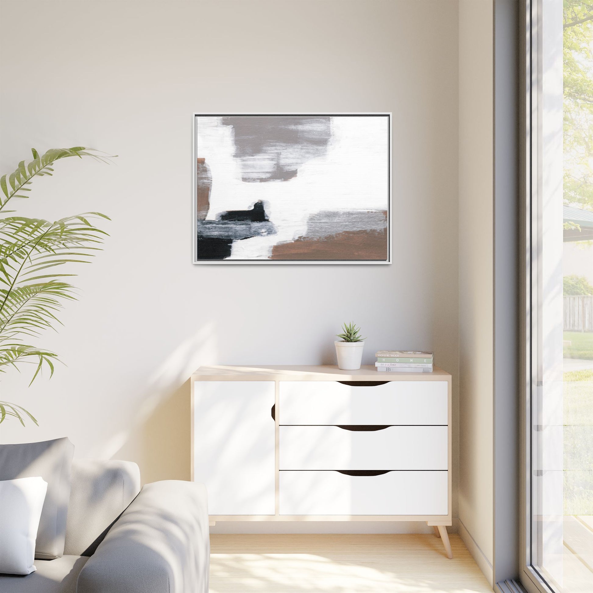 This abstract painting features a minimalist composition of gray, white, and rusty brown tones. Broad, textured brushstrokes create a layered and atmospheric effect across the canvas. A stark black brushstroke cuts through the center of the image, providing a bold contrast to the softer, more muted background colors. The painting appears to be created with acrylic or oil paint, showcasing a gestural and expressive technique. The artwork evokes a sense of depth and movement through its dynamic brush techniques and carefully balanced color palette.