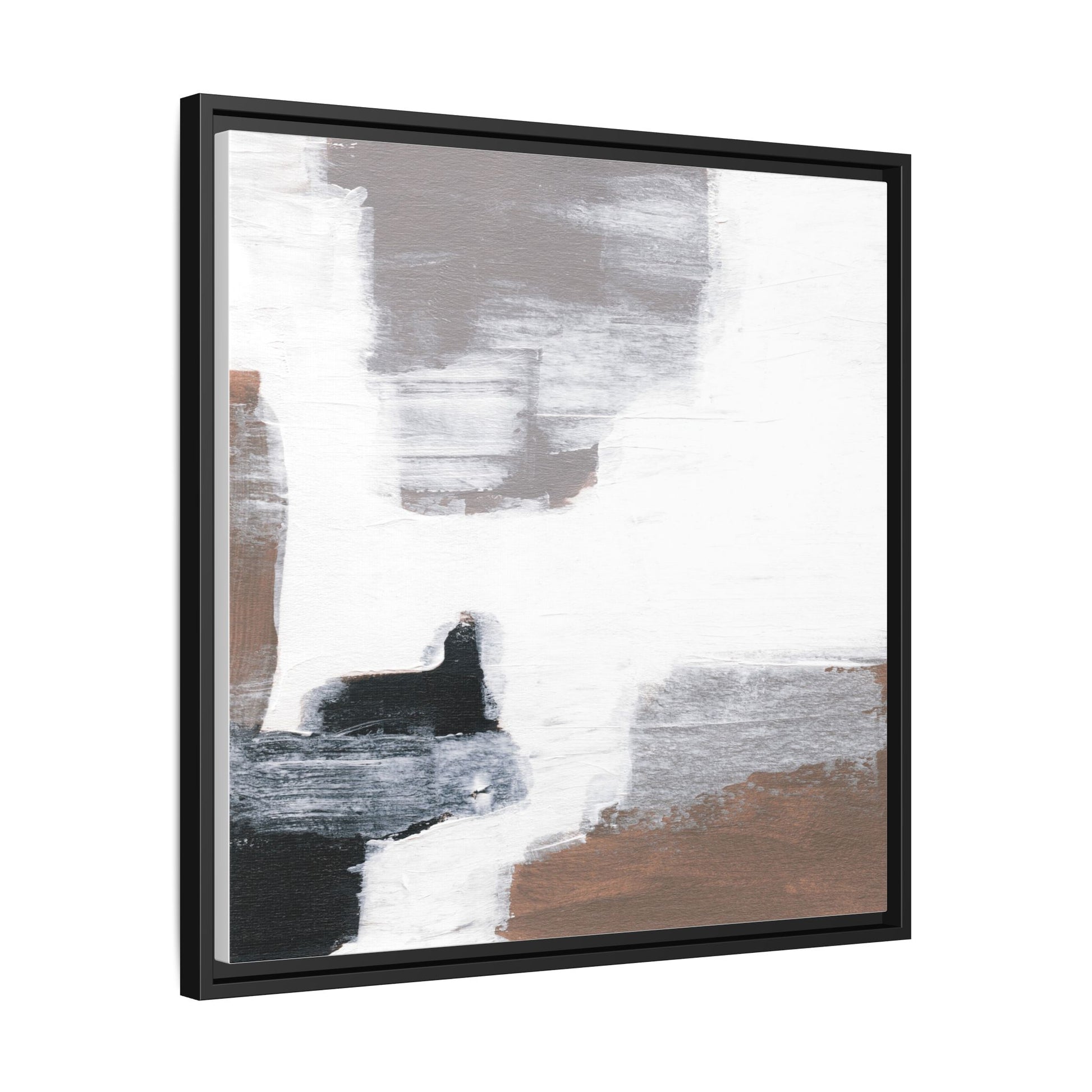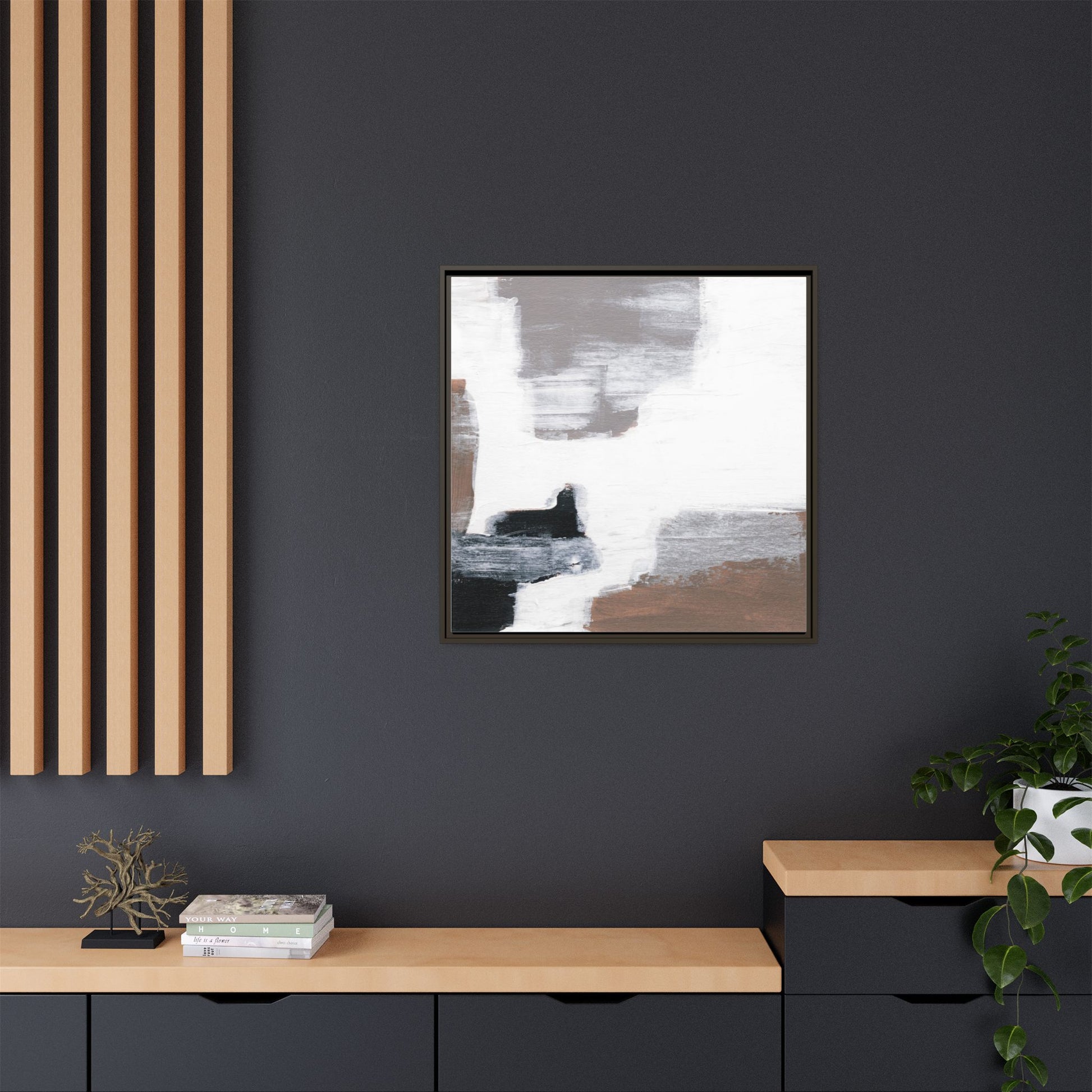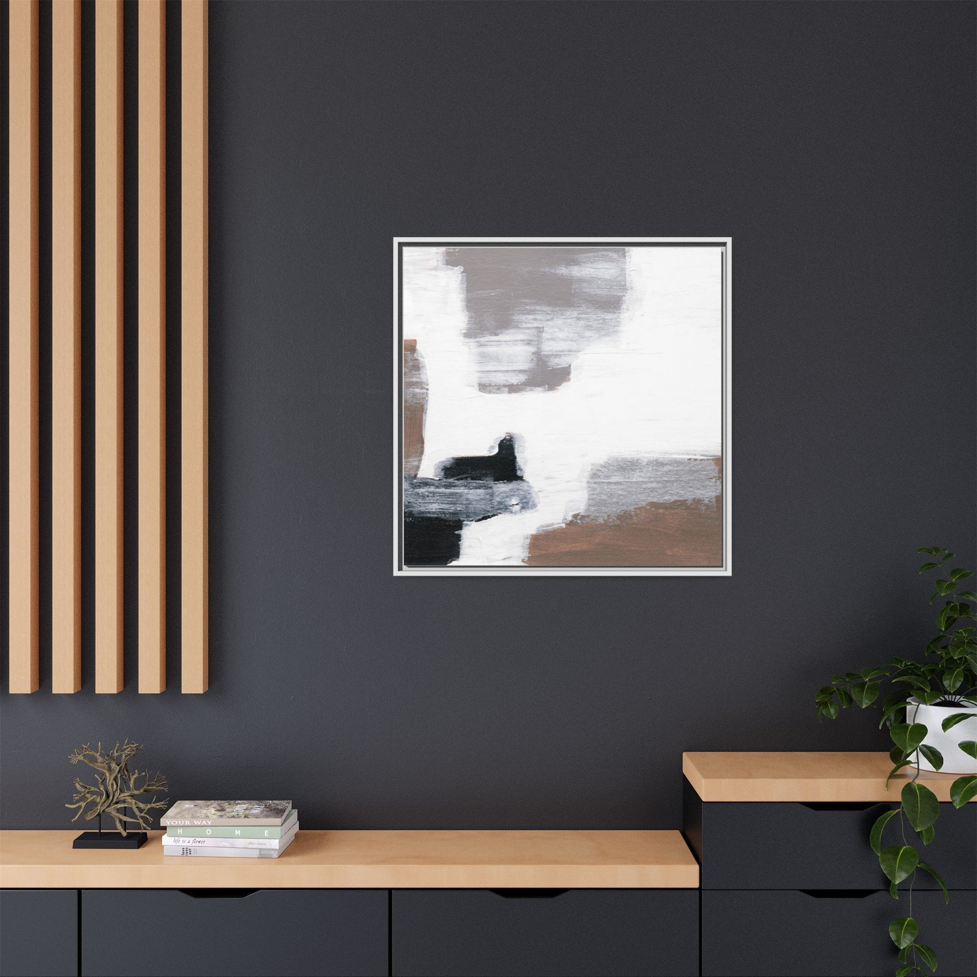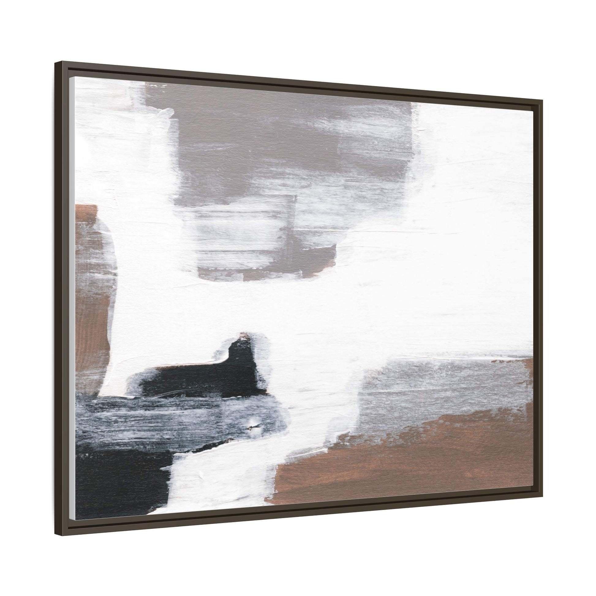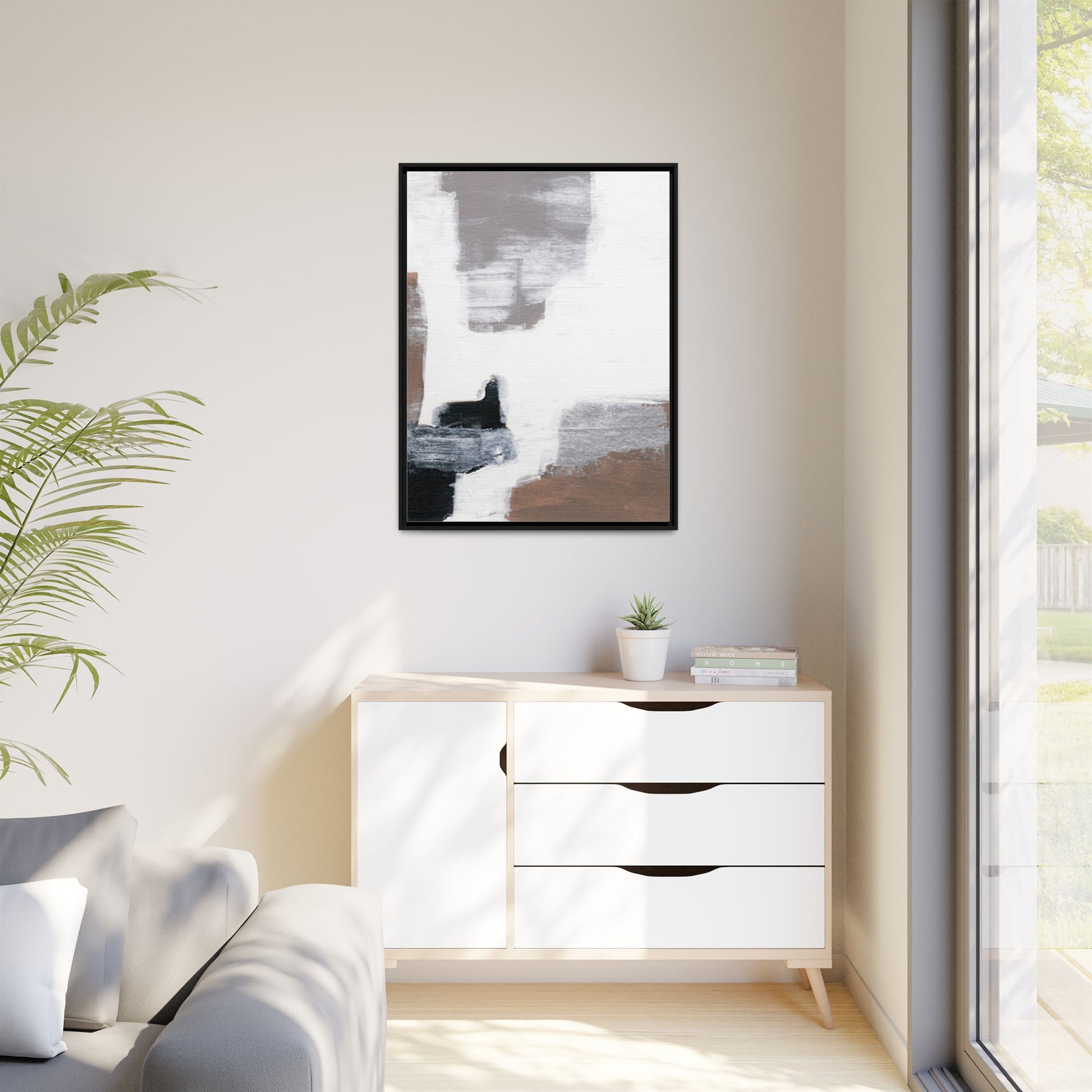 This abstract painting features a minimalist composition of gray, white, and rusty brown tones. Broad, textured brushstrokes create a layered and atmospheric effect across the canvas. A stark black brushstroke cuts through the center of the image, providing a bold contrast to the softer, more muted background colors. The painting appears to be created with acrylic or oil paint, showcasing a gestural and expressive technique. The artwork evokes a sense of depth and movement through its dynamic brush techniques and carefully balanced color palette.
