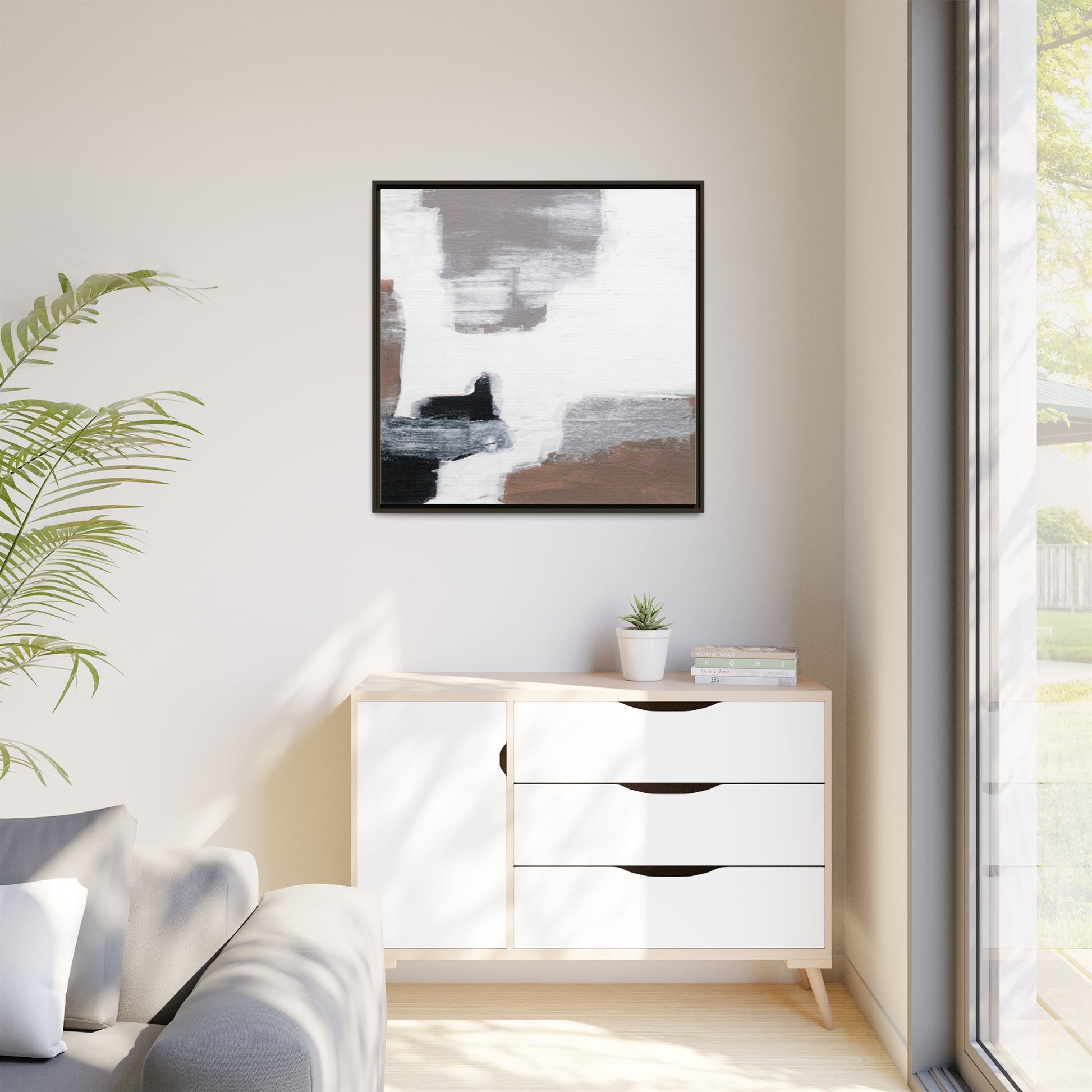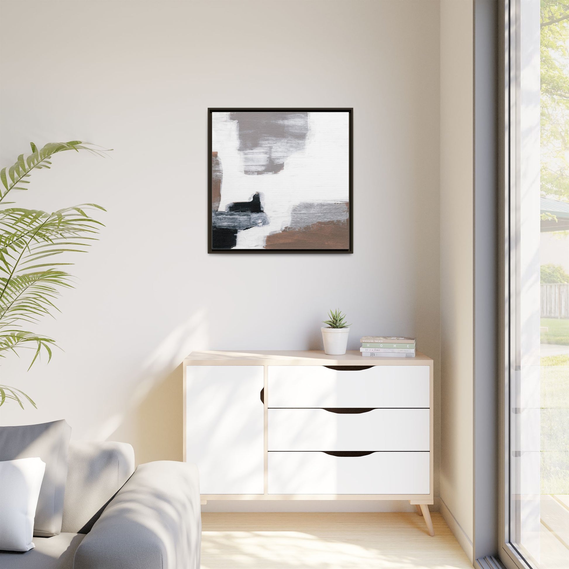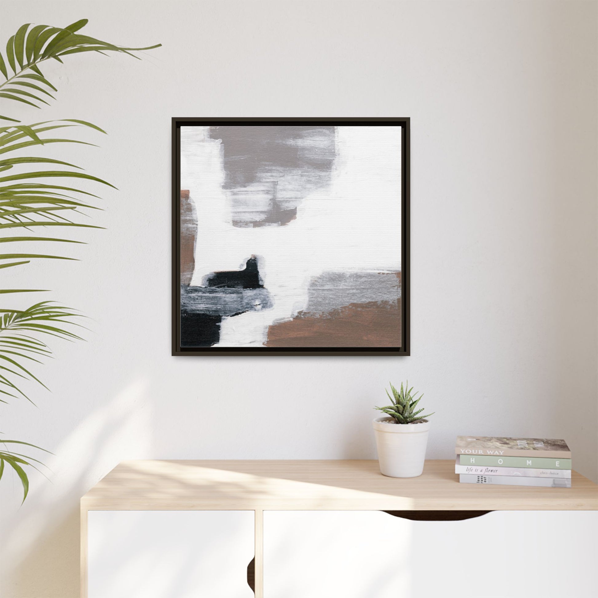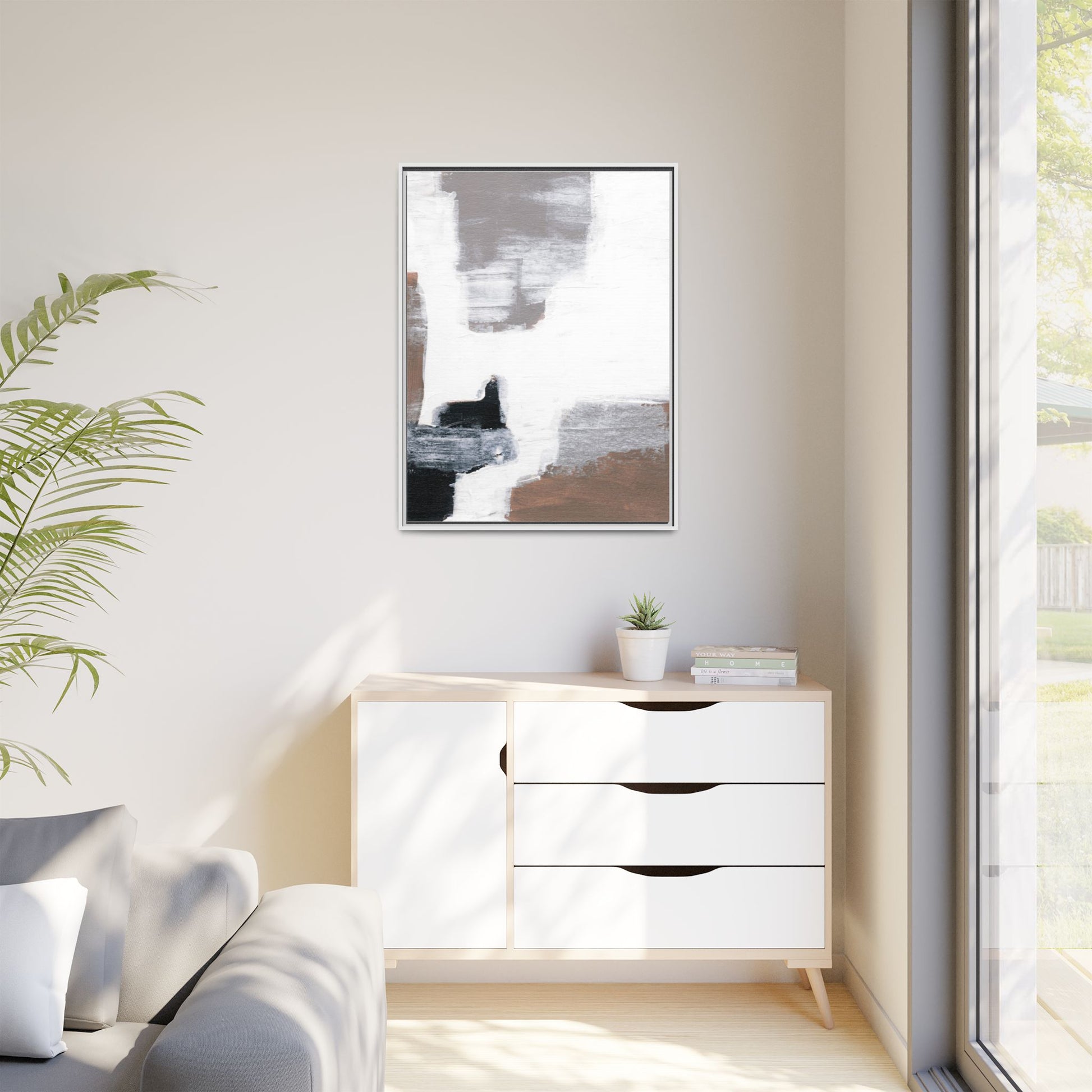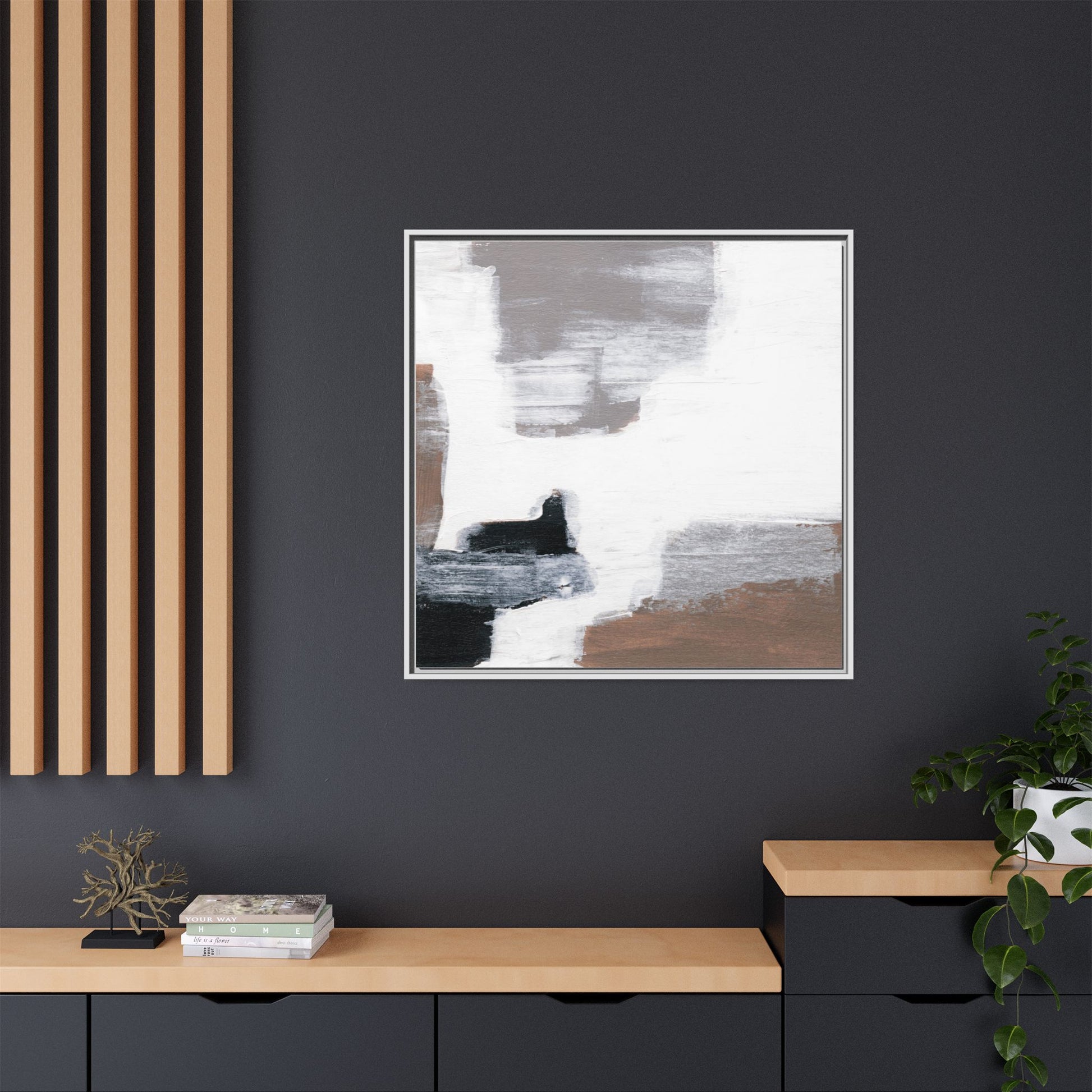 This abstract painting features a minimalist composition of gray, white, and rusty brown tones. Broad, textured brushstrokes create a layered and atmospheric effect across the canvas. A stark black brushstroke cuts through the center of the image, providing a bold contrast to the softer, more muted background colors. The painting appears to be created with acrylic or oil paint, showcasing a gestural and expressive technique. The artwork evokes a sense of depth and movement through its dynamic brush techniques and carefully balanced color palette.