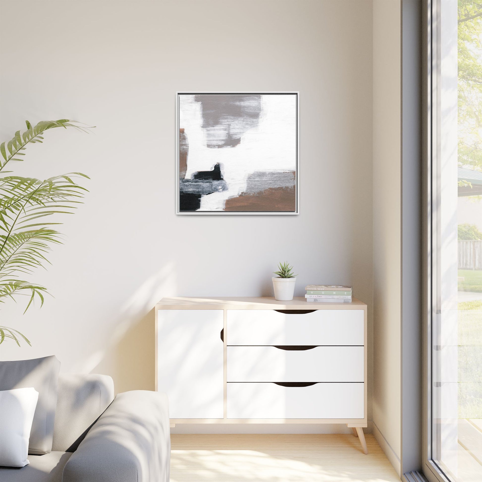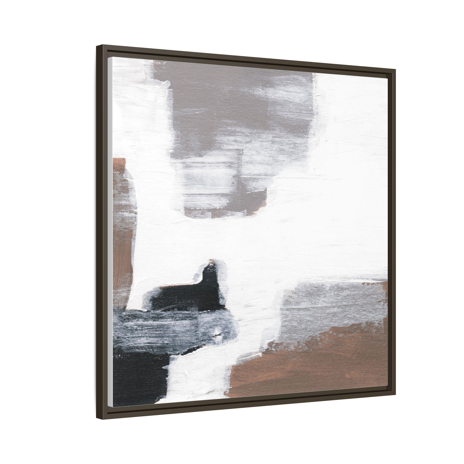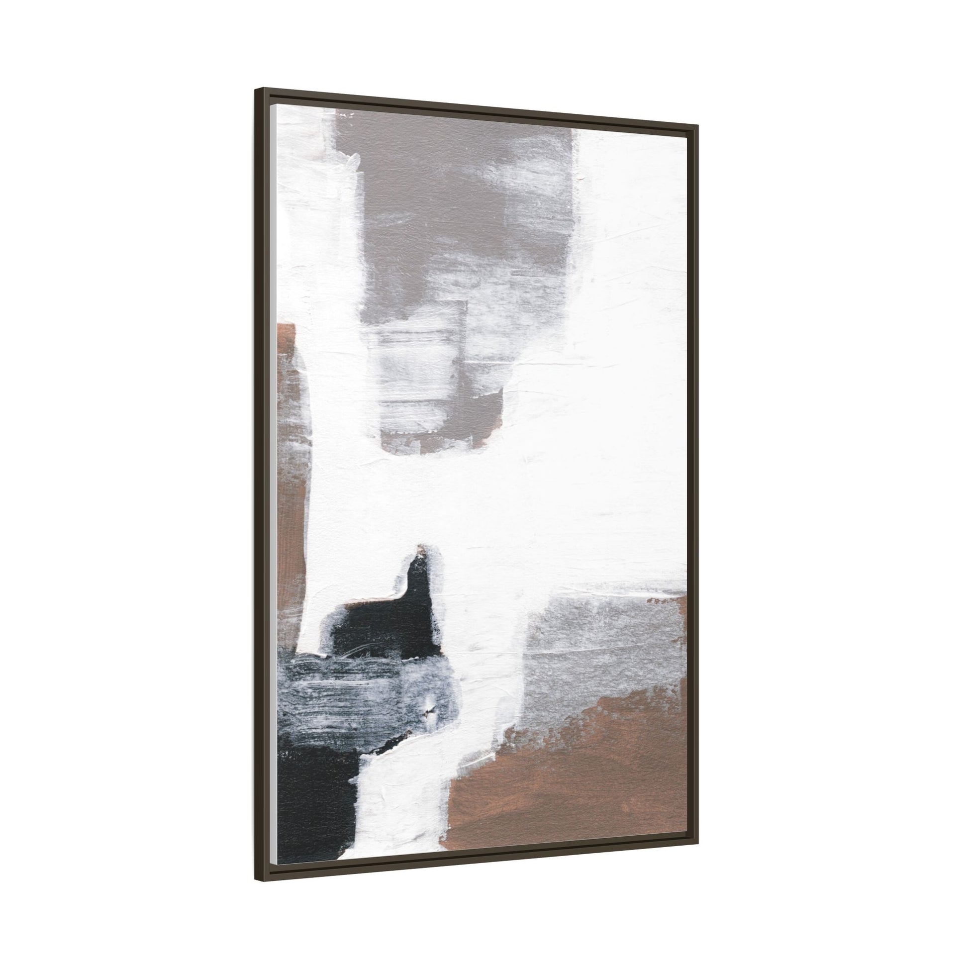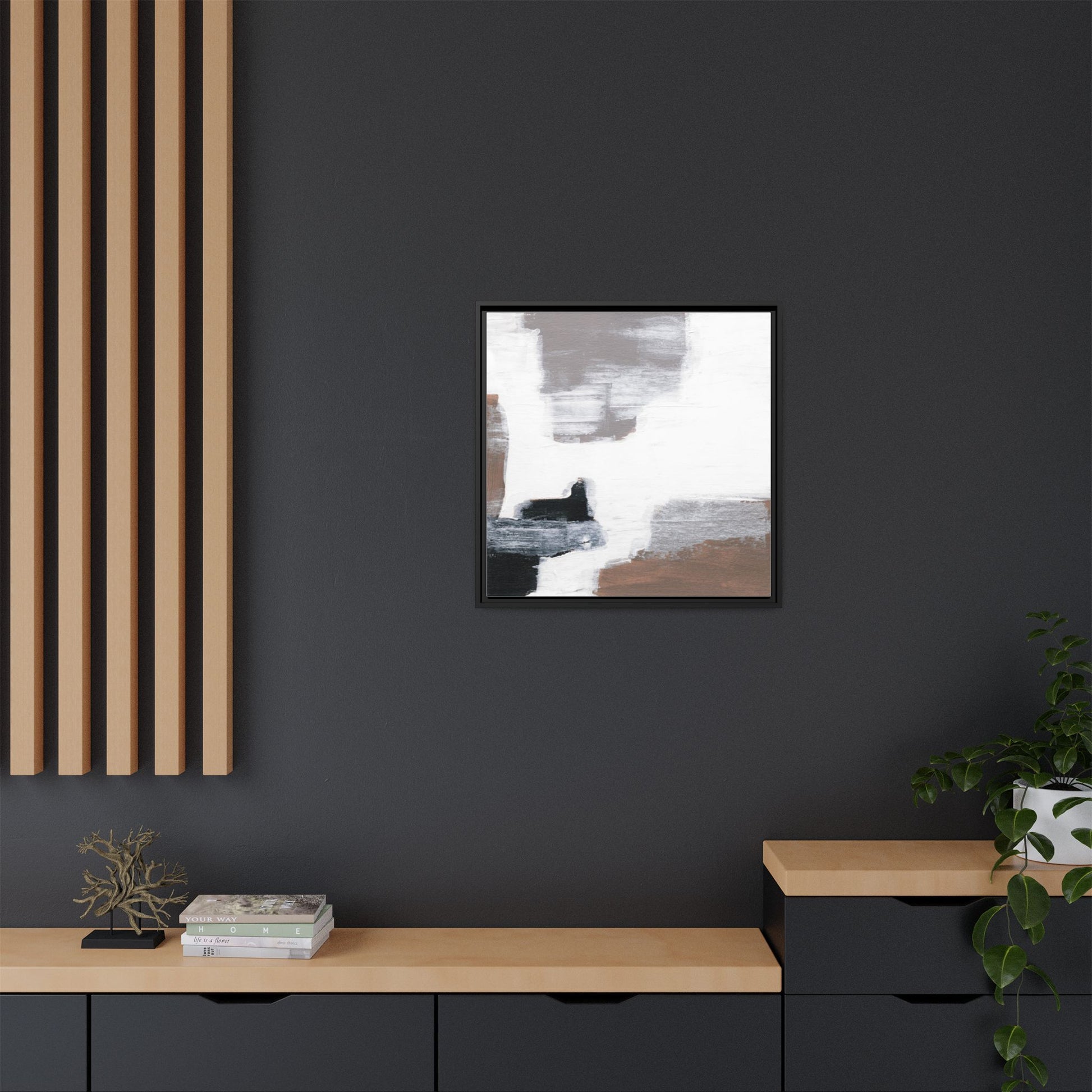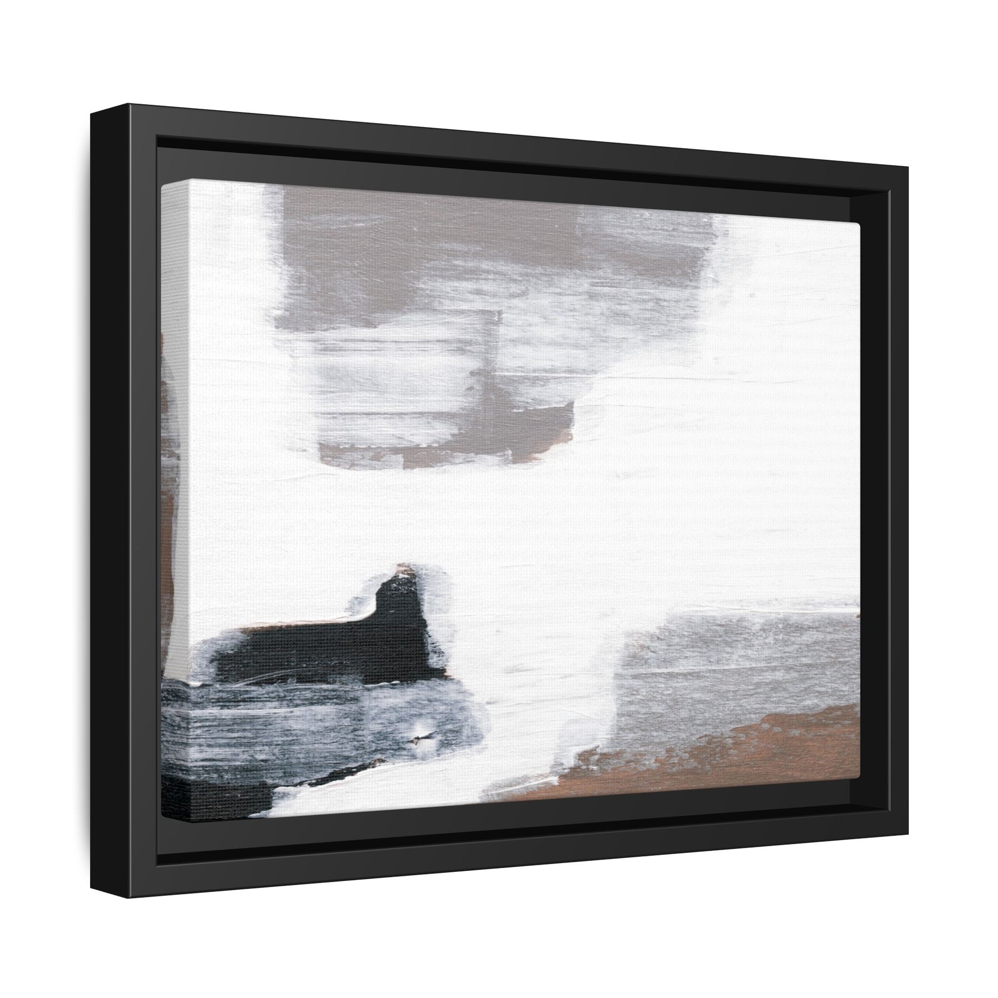 This abstract painting features a minimalist composition of gray, white, and rusty brown tones. Broad, textured brushstrokes create a layered and atmospheric effect across the canvas. A stark black brushstroke cuts through the center of the image, providing a bold contrast to the softer, more muted background colors. The painting appears to be created with acrylic or oil paint, showcasing a gestural and expressive technique. The artwork evokes a sense of depth and movement through its dynamic brush techniques and carefully balanced color palette.