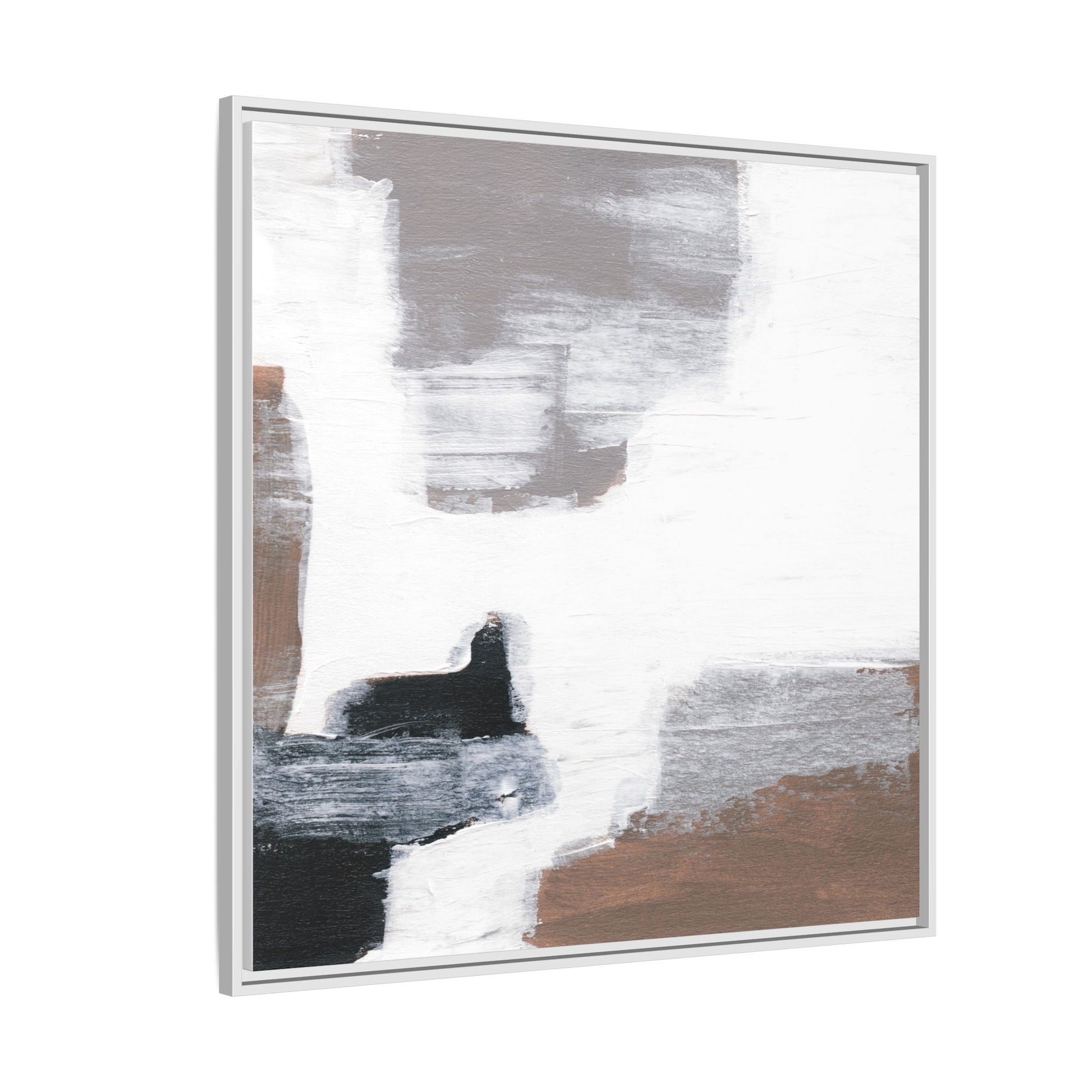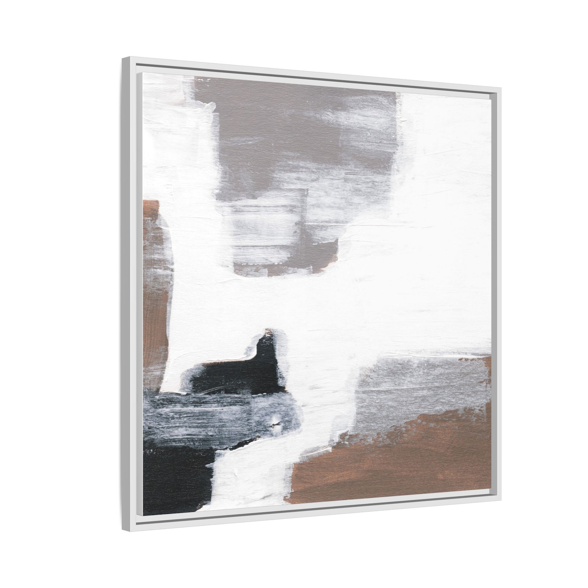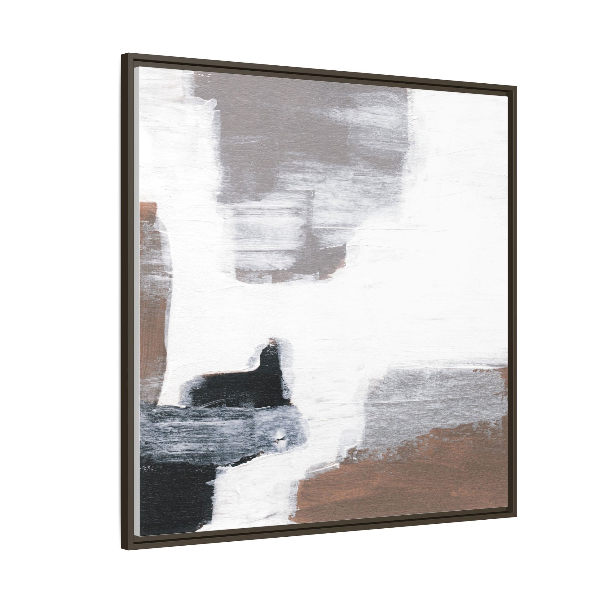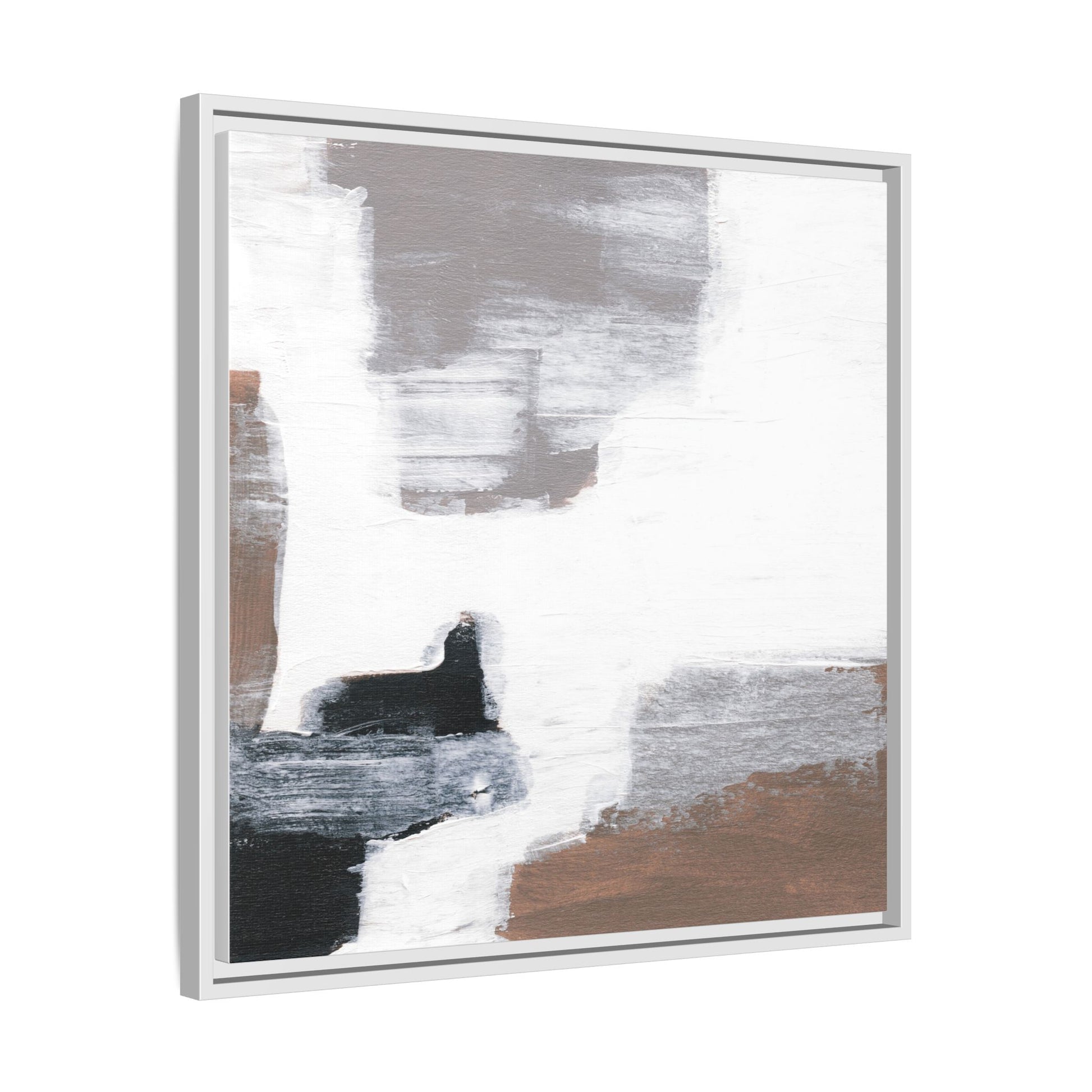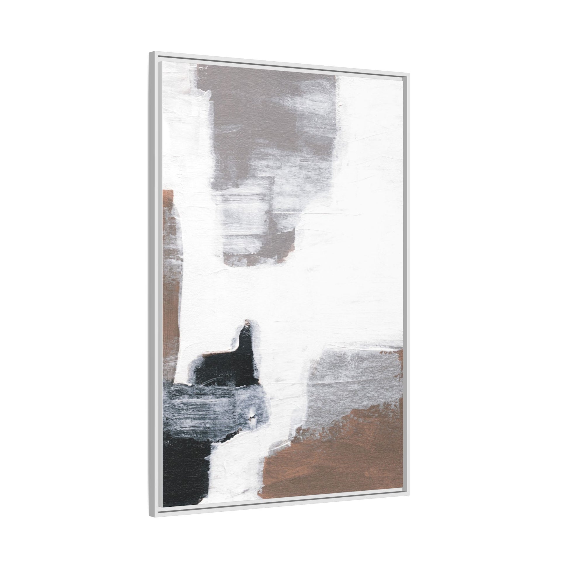 This abstract painting features a minimalist composition of gray, white, and rusty brown tones. Broad, textured brushstrokes create a layered and atmospheric effect across the canvas. A stark black brushstroke cuts through the center of the image, providing a bold contrast to the softer, more muted background colors. The painting appears to be created with acrylic or oil paint, showcasing a gestural and expressive technique. The artwork evokes a sense of depth and movement through its dynamic brush techniques and carefully balanced color palette.