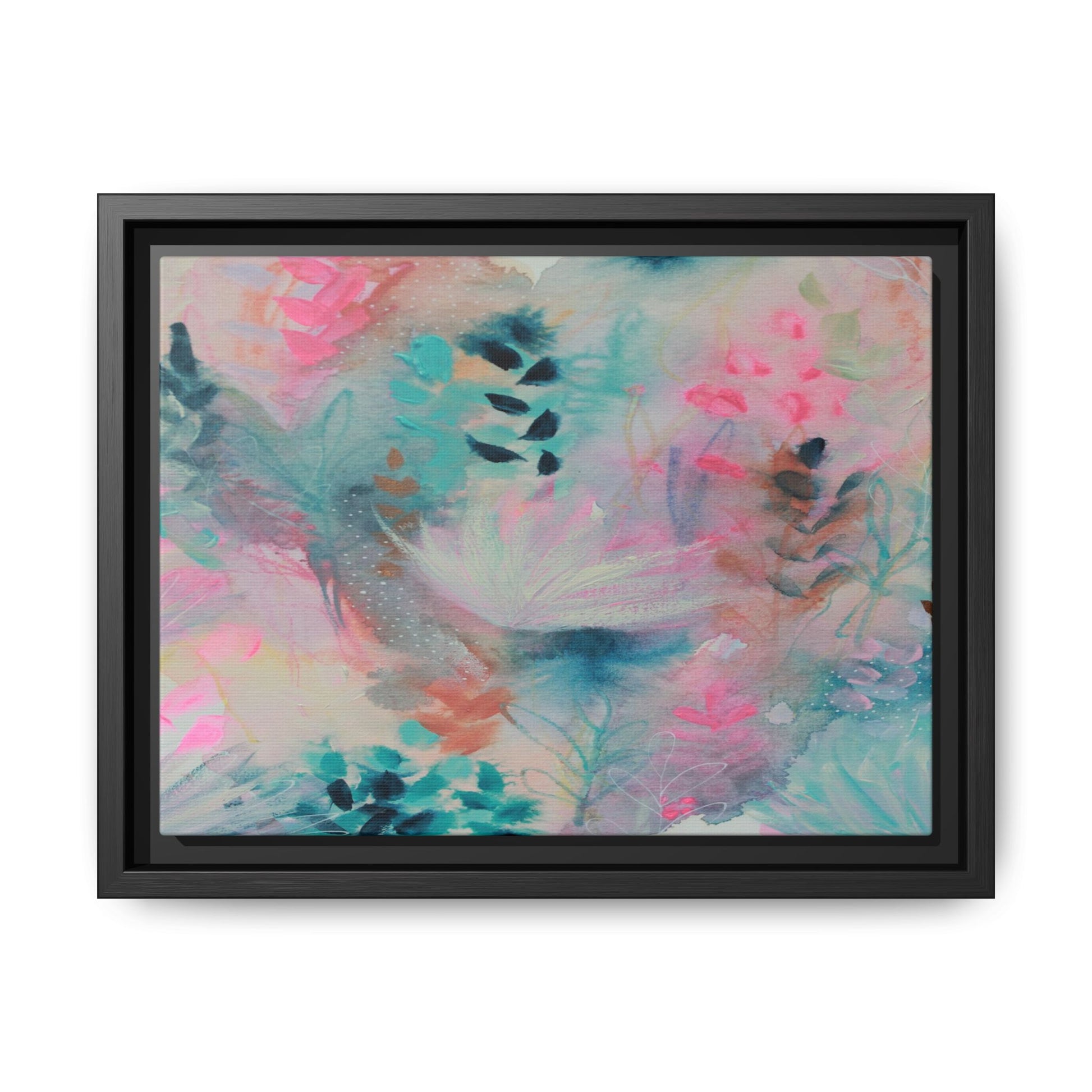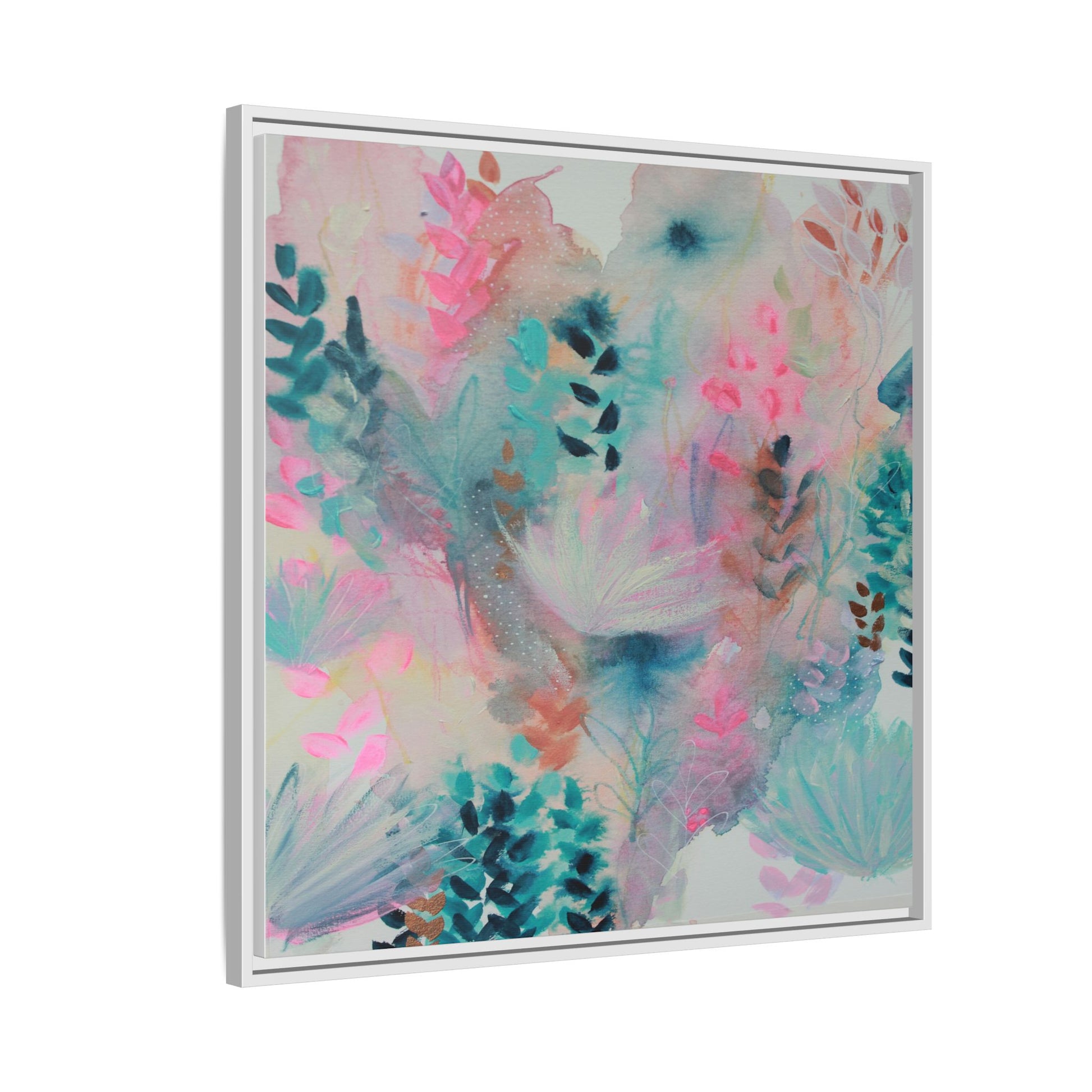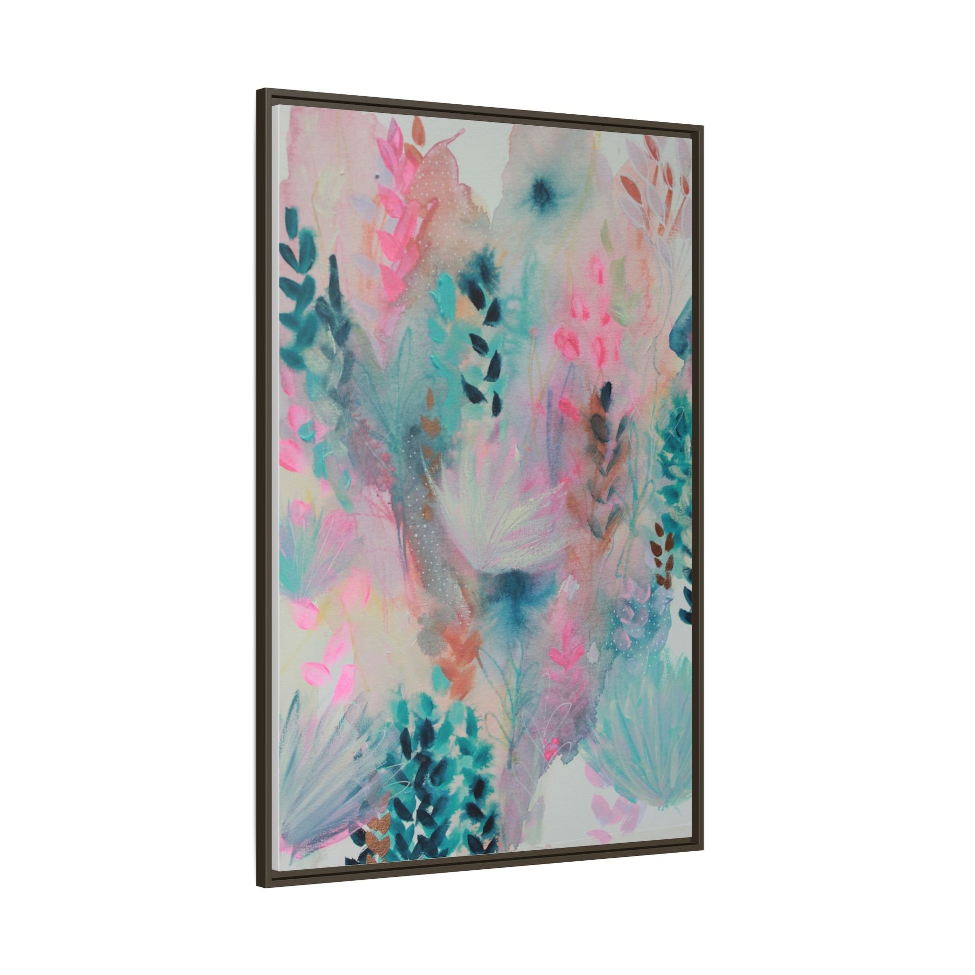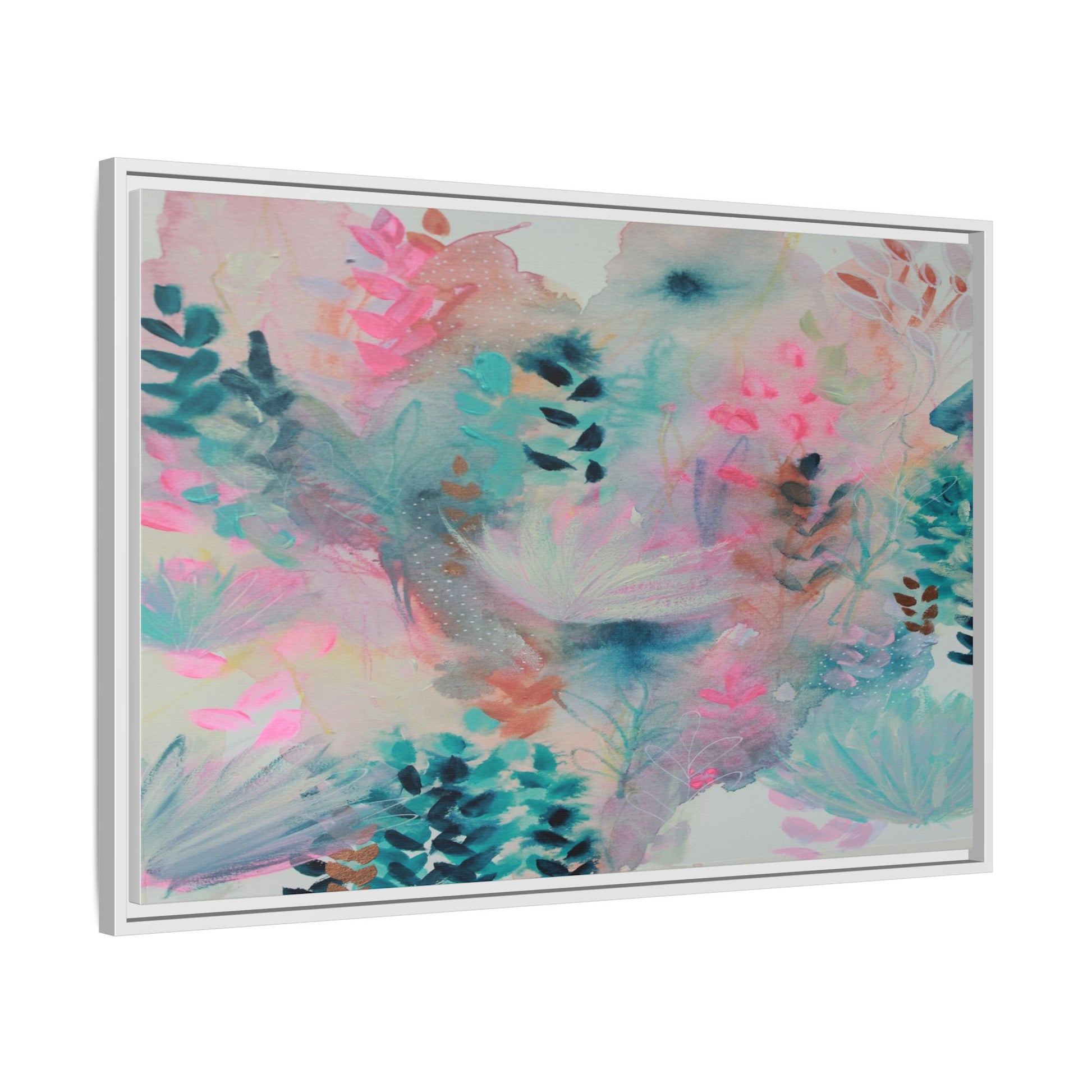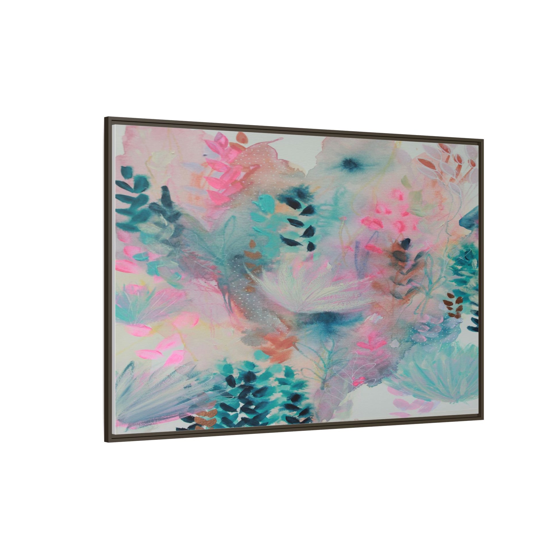 This vibrant abstract watercolor painting is a delicate symphony of soft pink, turquoise, and teal hues blending seamlessly across the canvas. Ethereal botanical shapes and organic forms emerge and dissolve throughout the composition, suggesting delicate leaves, feathery plants, and abstract floral elements. The artwork displays a dreamy, fluid technique characteristic of watercolor painting, with colors bleeding and merging into one another in gentle, translucent layers. Subtle dotted textures and varied brush strokes add depth and intrigue to the piece, creating a sense of movement and ethereal lightness. The overall effect is a harmonious, almost lyrical exploration of color and form that evokes the subtle beauty of a misty, impressionistic landscape.
