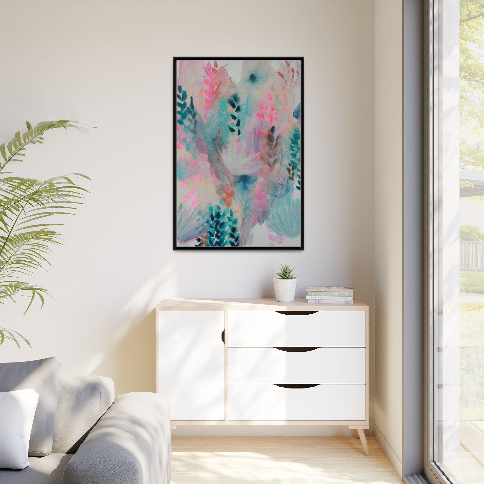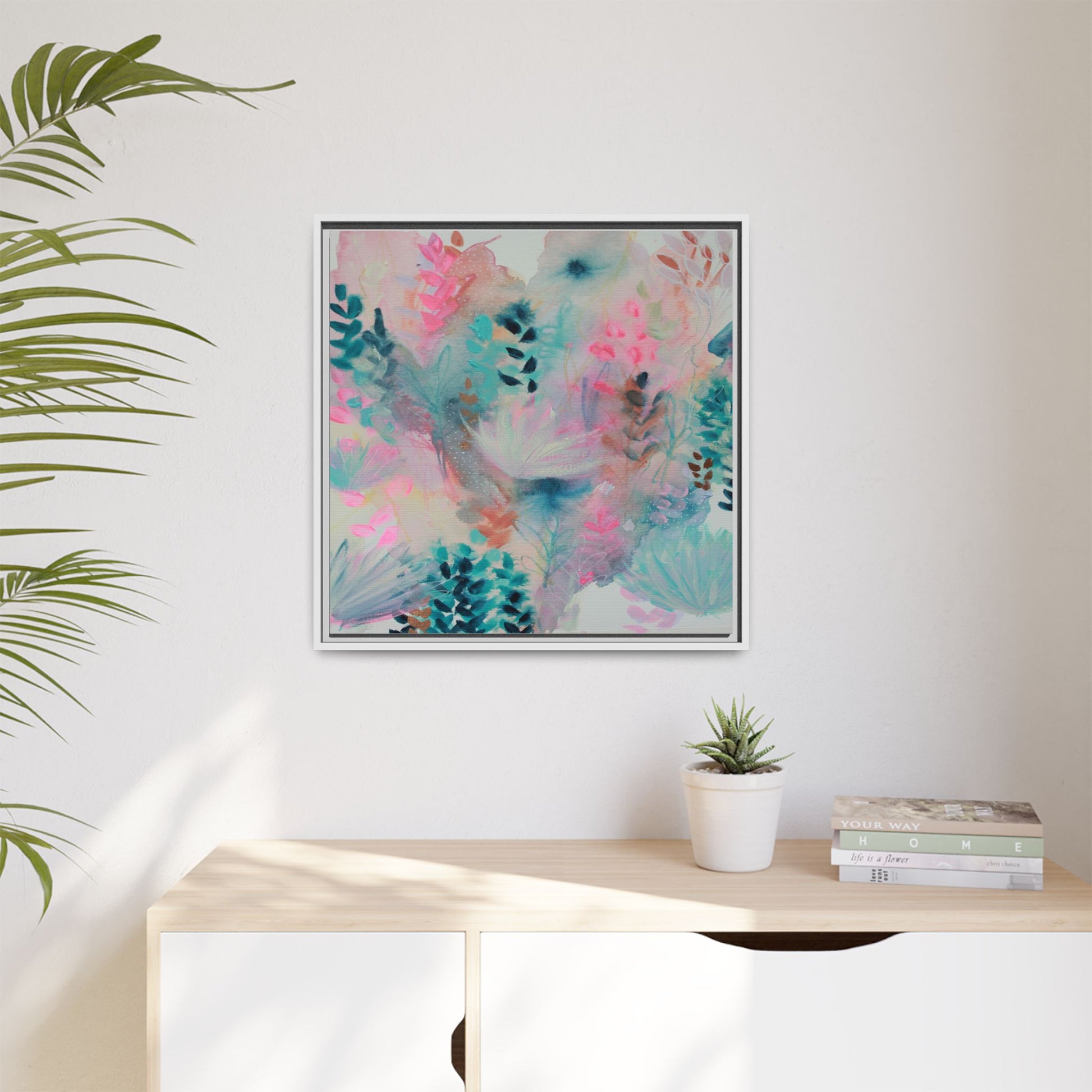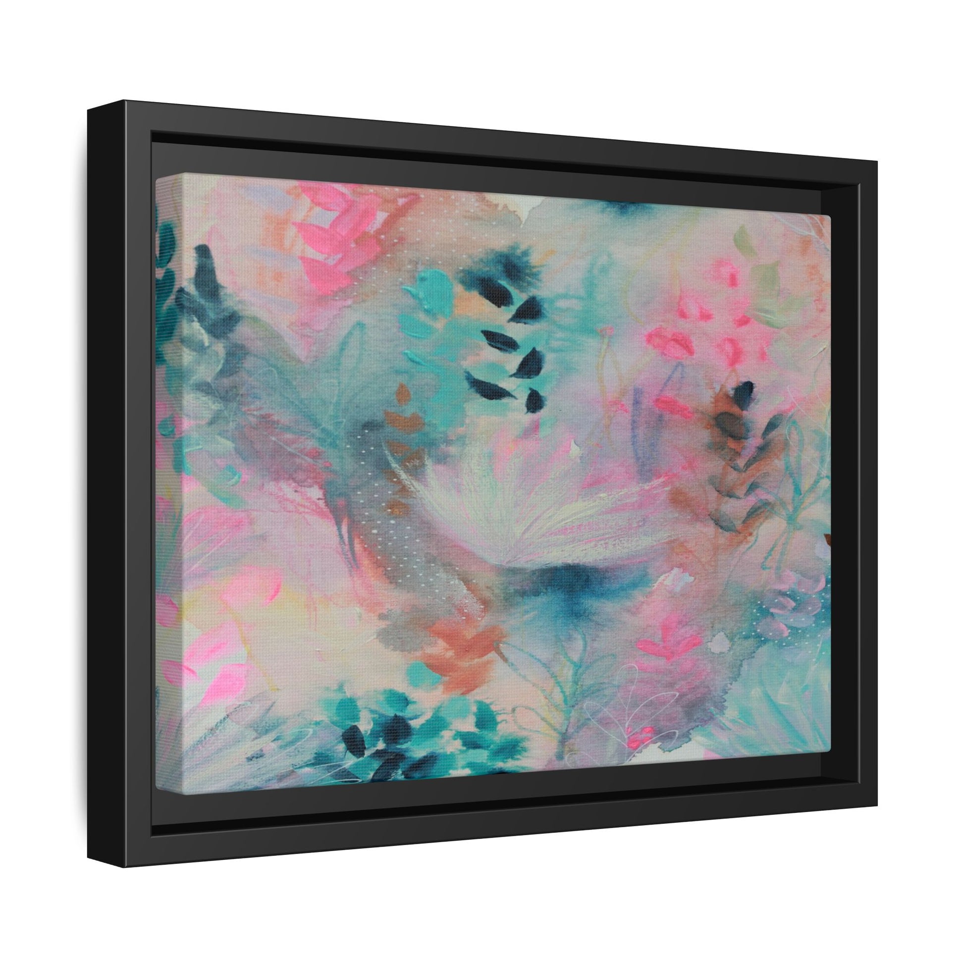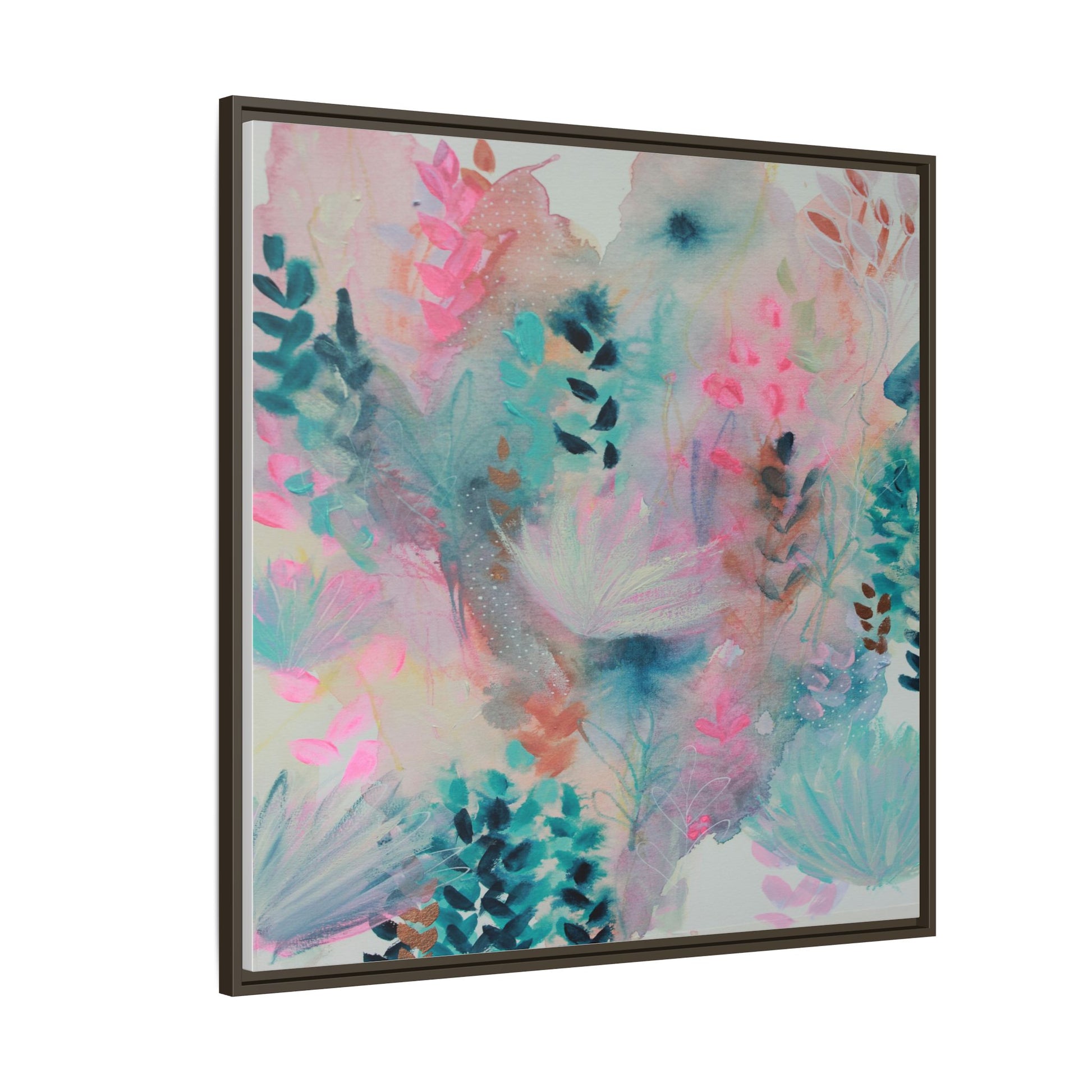 This vibrant abstract watercolor painting is a delicate symphony of soft pink, turquoise, and teal hues blending seamlessly across the canvas. Ethereal botanical shapes and organic forms emerge and dissolve throughout the composition, suggesting delicate leaves, feathery plants, and abstract floral elements. The artwork displays a dreamy, fluid technique characteristic of watercolor painting, with colors bleeding and merging into one another in gentle, translucent layers. Subtle dotted textures and varied brush strokes add depth and intrigue to the piece, creating a sense of movement and ethereal lightness. The overall effect is a harmonious, almost lyrical exploration of color and form that evokes the subtle beauty of a misty, impressionistic landscape.
