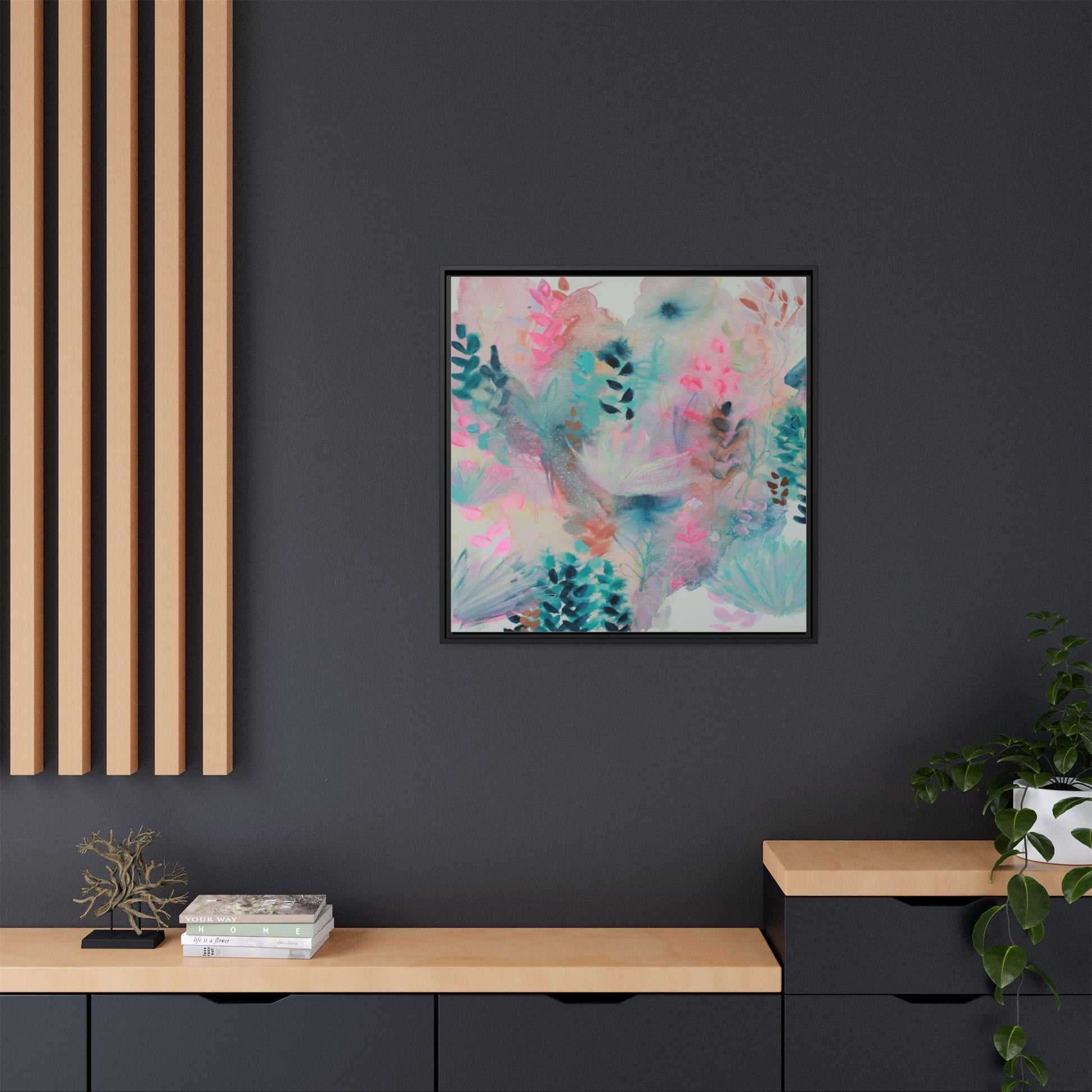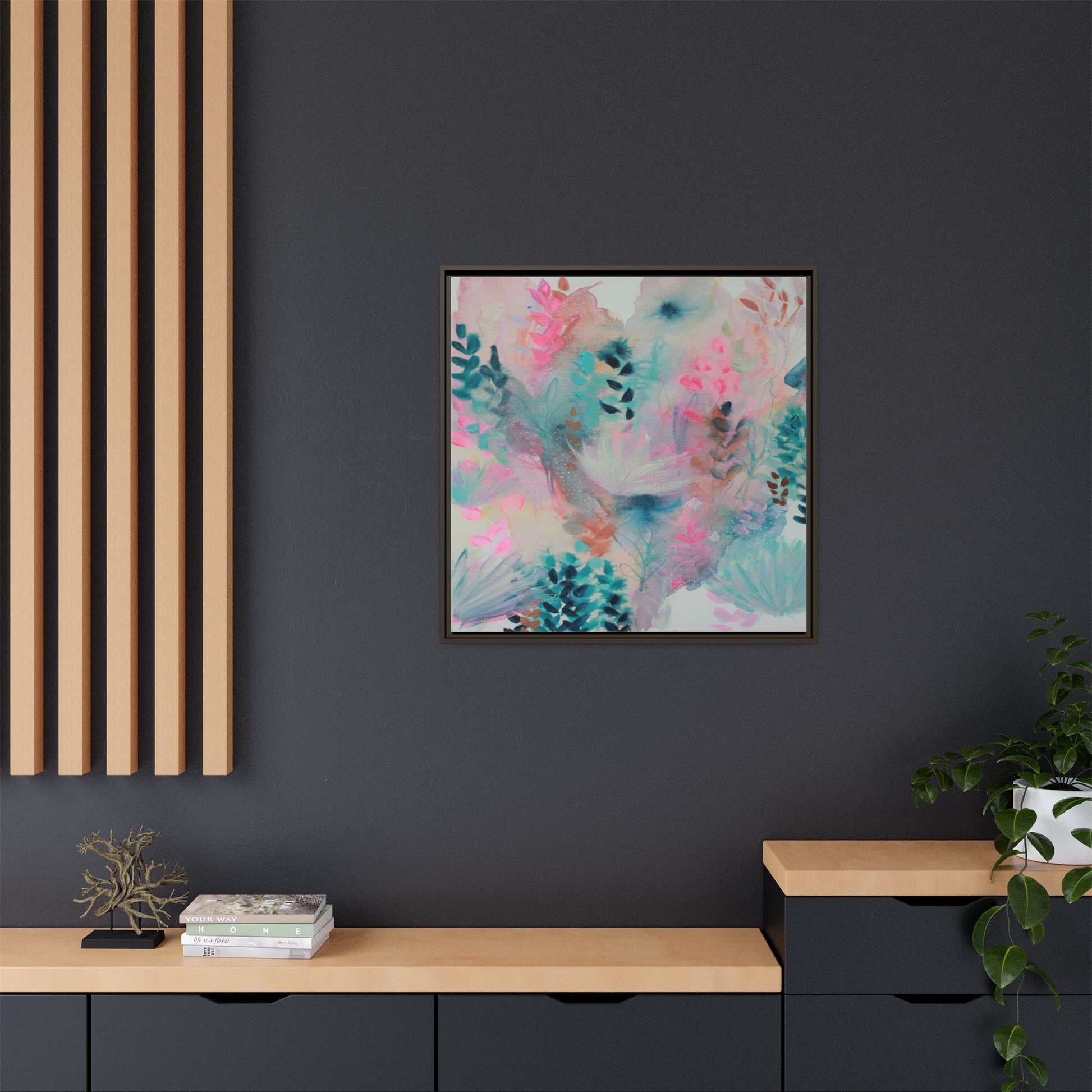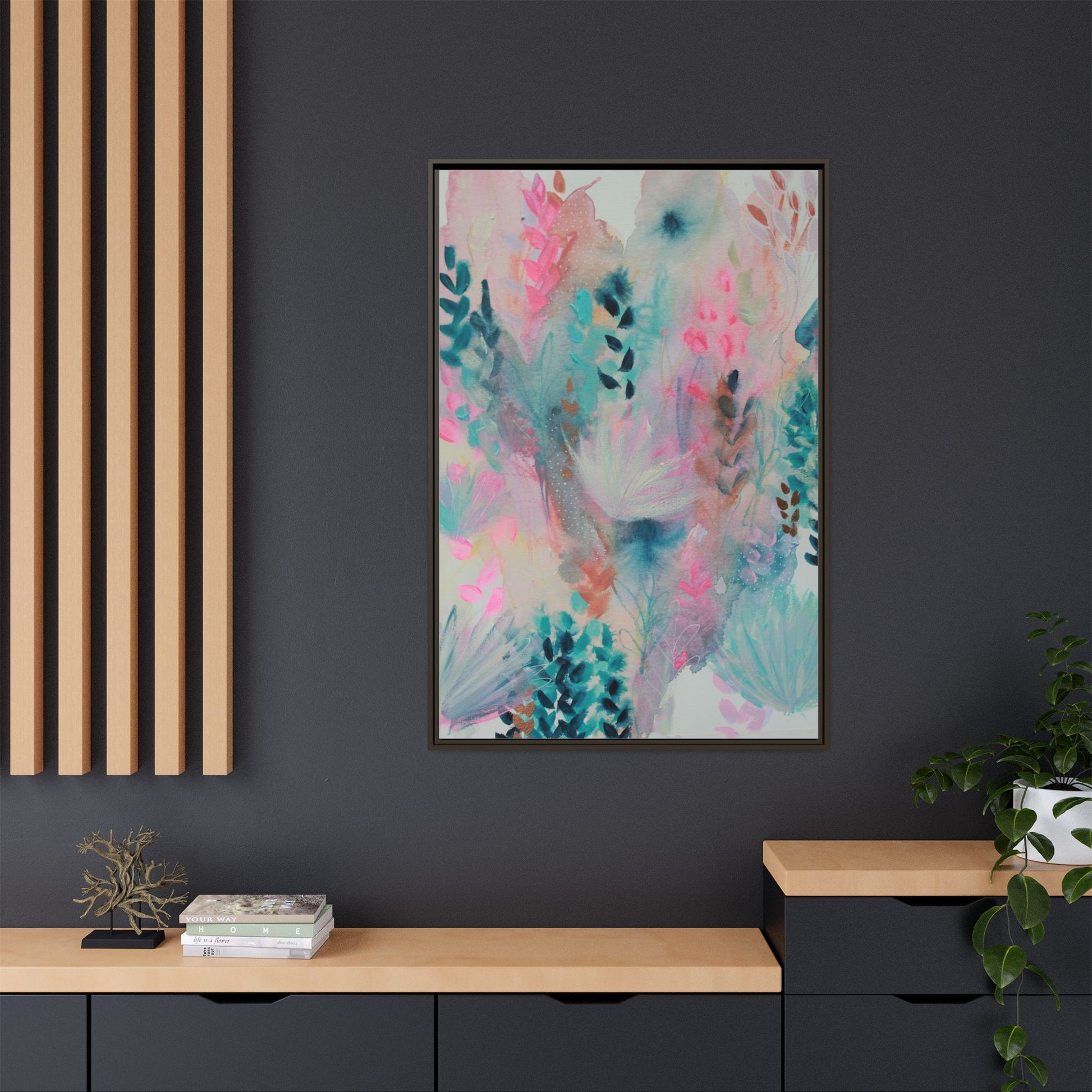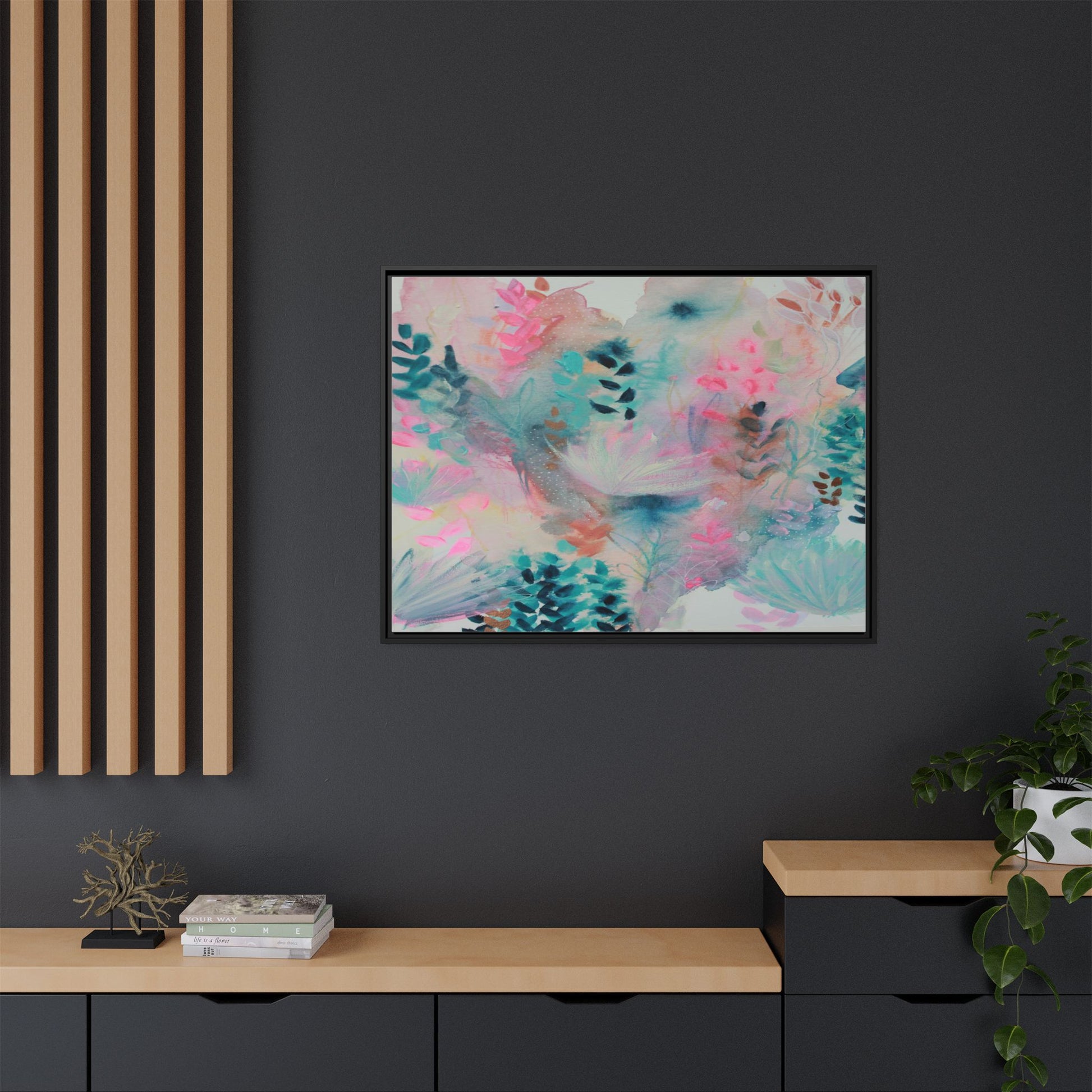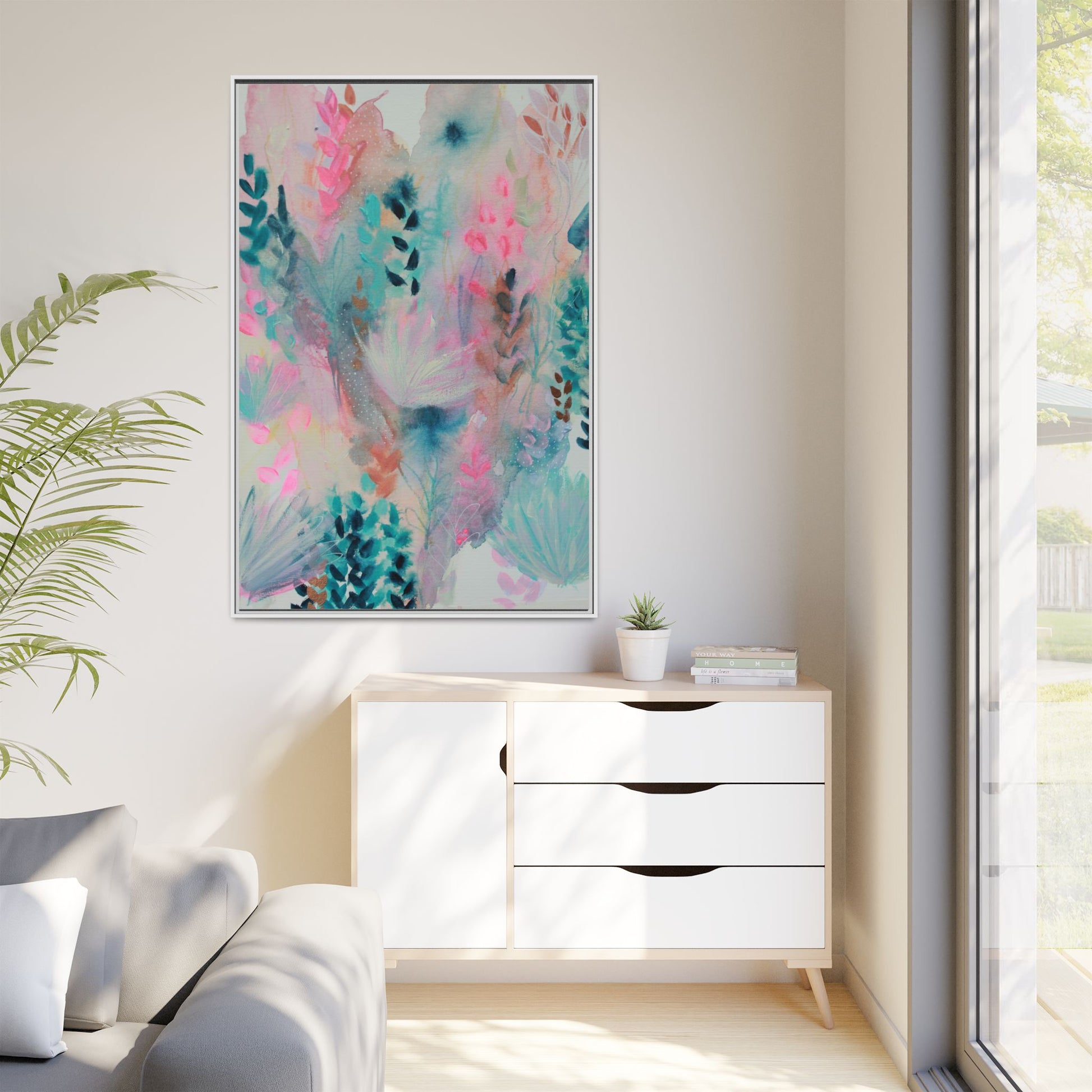 This vibrant abstract watercolor painting is a delicate symphony of soft pink, turquoise, and teal hues blending seamlessly across the canvas. Ethereal botanical shapes and organic forms emerge and dissolve throughout the composition, suggesting delicate leaves, feathery plants, and abstract floral elements. The artwork displays a dreamy, fluid technique characteristic of watercolor painting, with colors bleeding and merging into one another in gentle, translucent layers. Subtle dotted textures and varied brush strokes add depth and intrigue to the piece, creating a sense of movement and ethereal lightness. The overall effect is a harmonious, almost lyrical exploration of color and form that evokes the subtle beauty of a misty, impressionistic landscape.