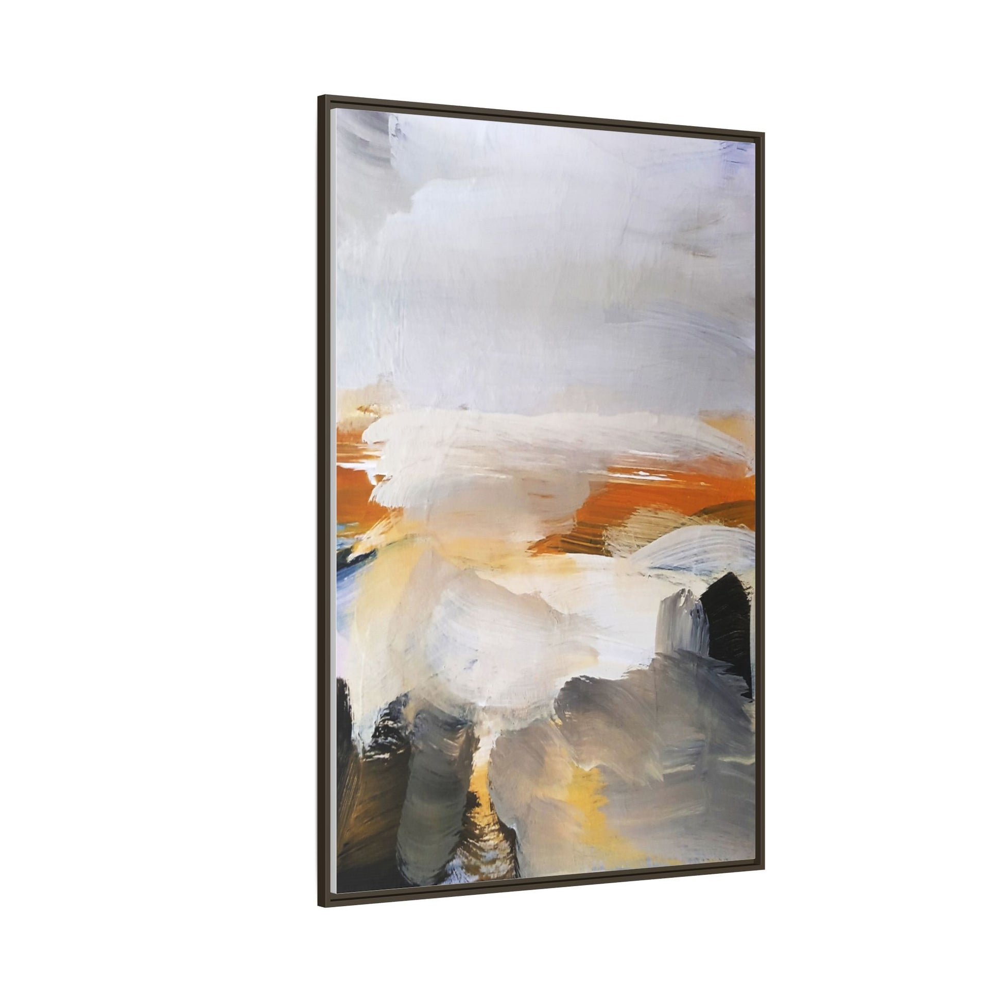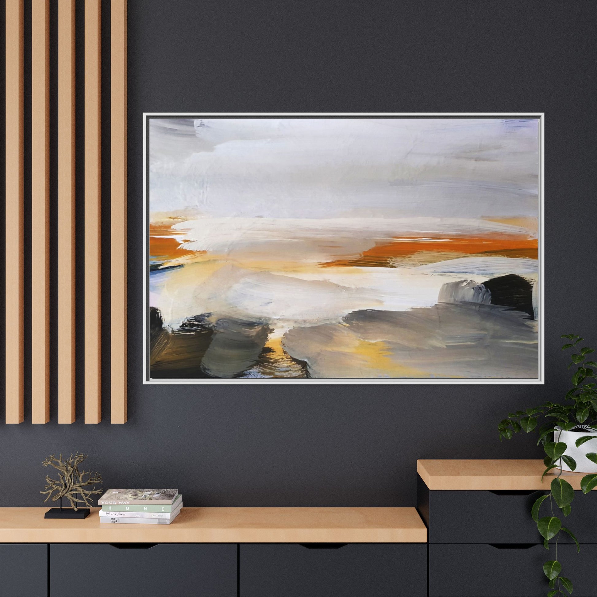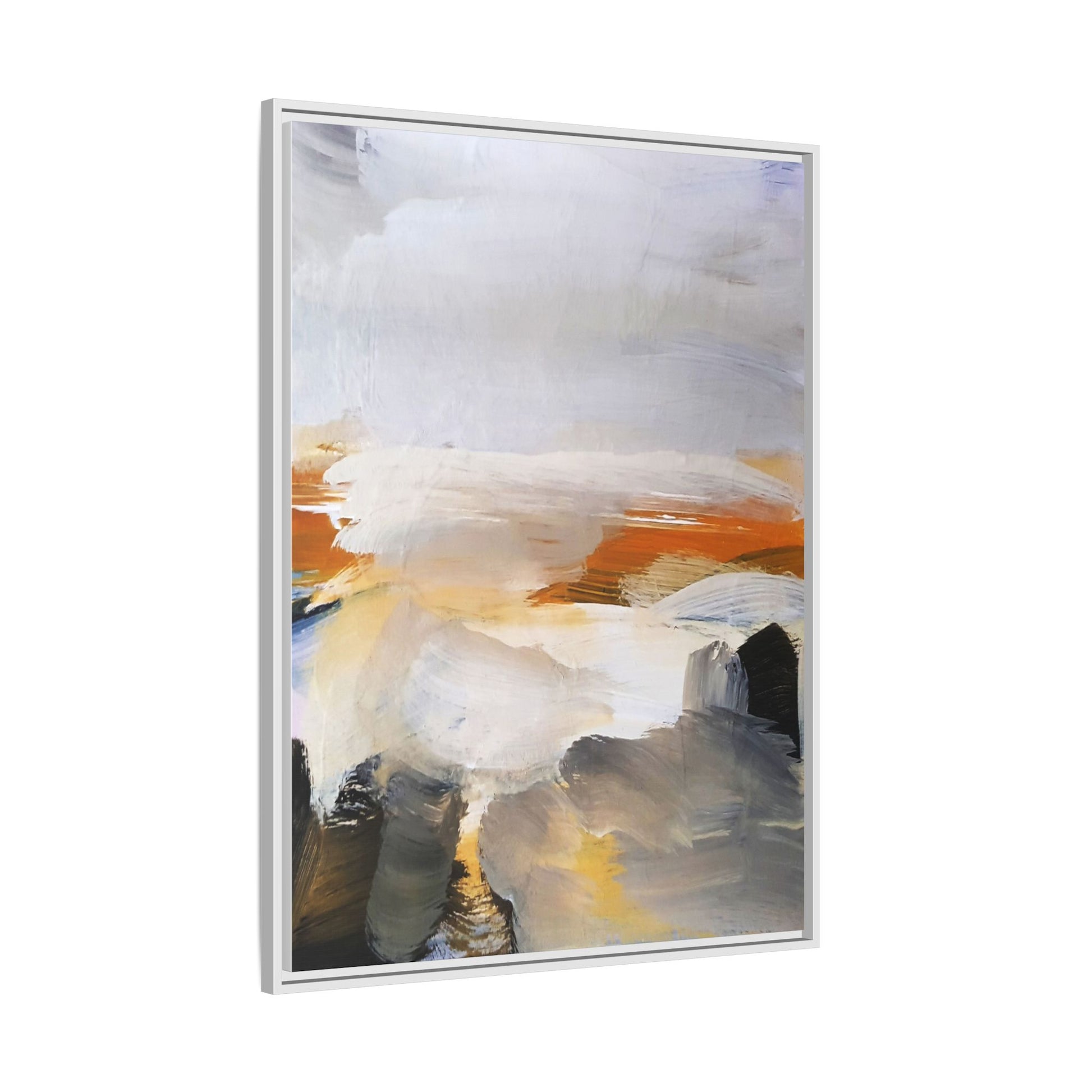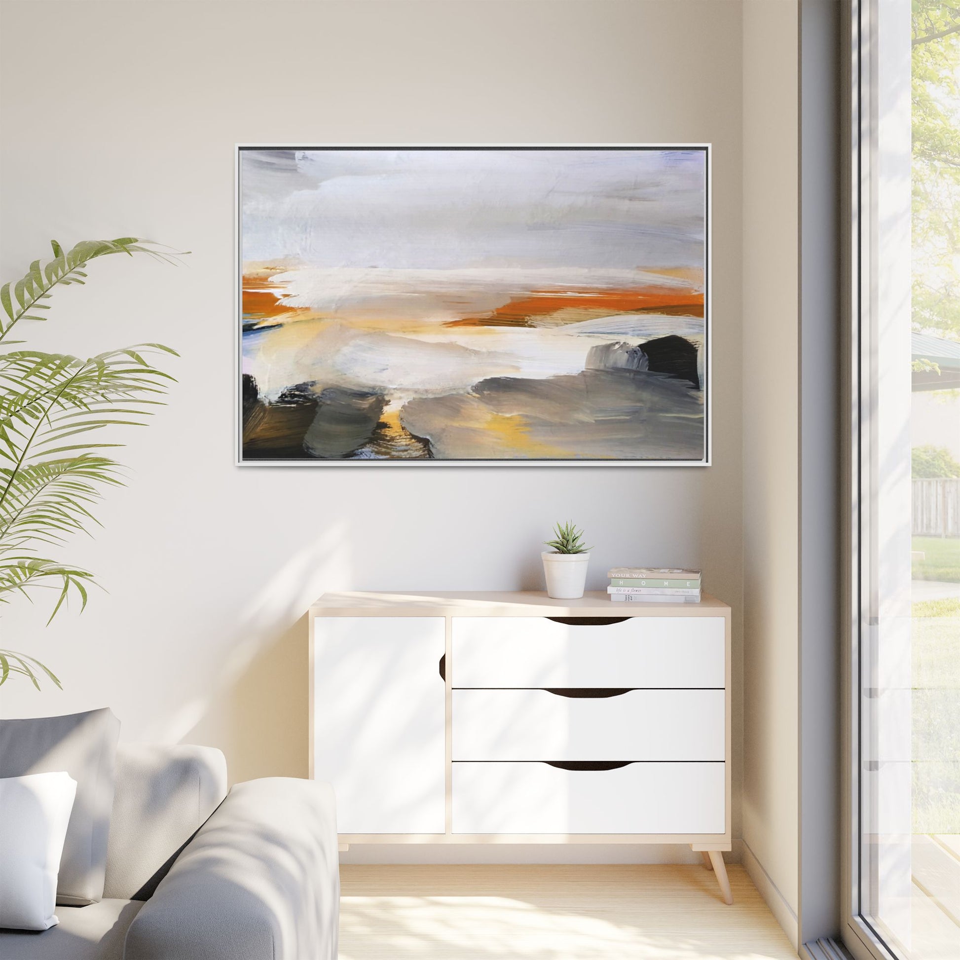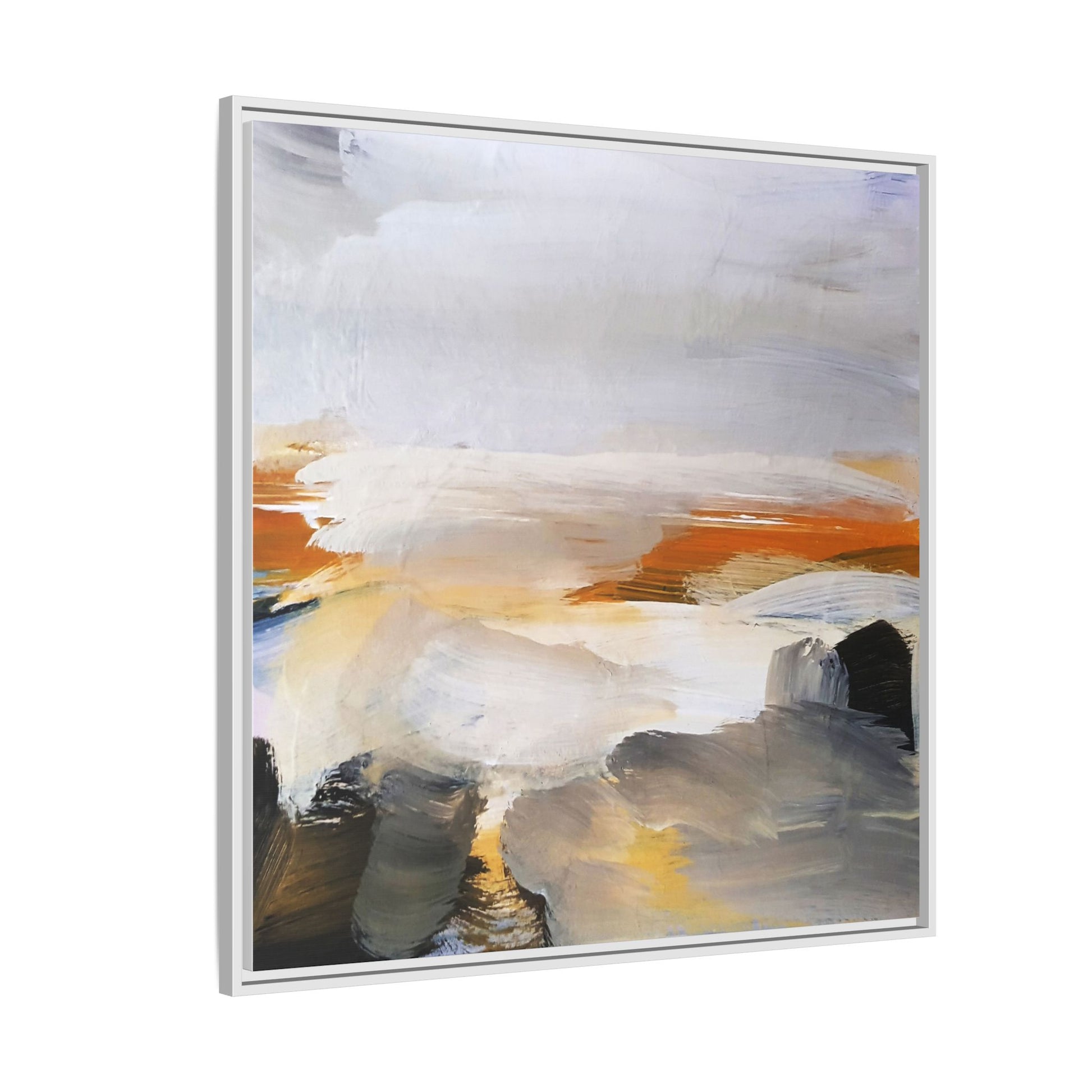 This captivating abstract landscape painting features a dynamic interplay of muted colors and sweeping brushstrokes, creating a sense of expansive depth and movement. The composition is dominated by soft whites, warm oranges, and cool grays that blend seamlessly across the canvas, evoking the atmospheric qualities of a distant horizon or ethereal landscape. Bold, textured brushwork gives the painting a sense of energy and motion, with horizontal streaks suggesting a windswept terrain or a distant seascape. The color palette transitions from bright, golden yellows on the edges to more subdued, silvery whites and grays in the central area, creating a luminous and contemplative mood. The painting's abstract style allows viewers to interpret the scene freely, inviting personal reflection on the interplay of light, space, and natural forms.