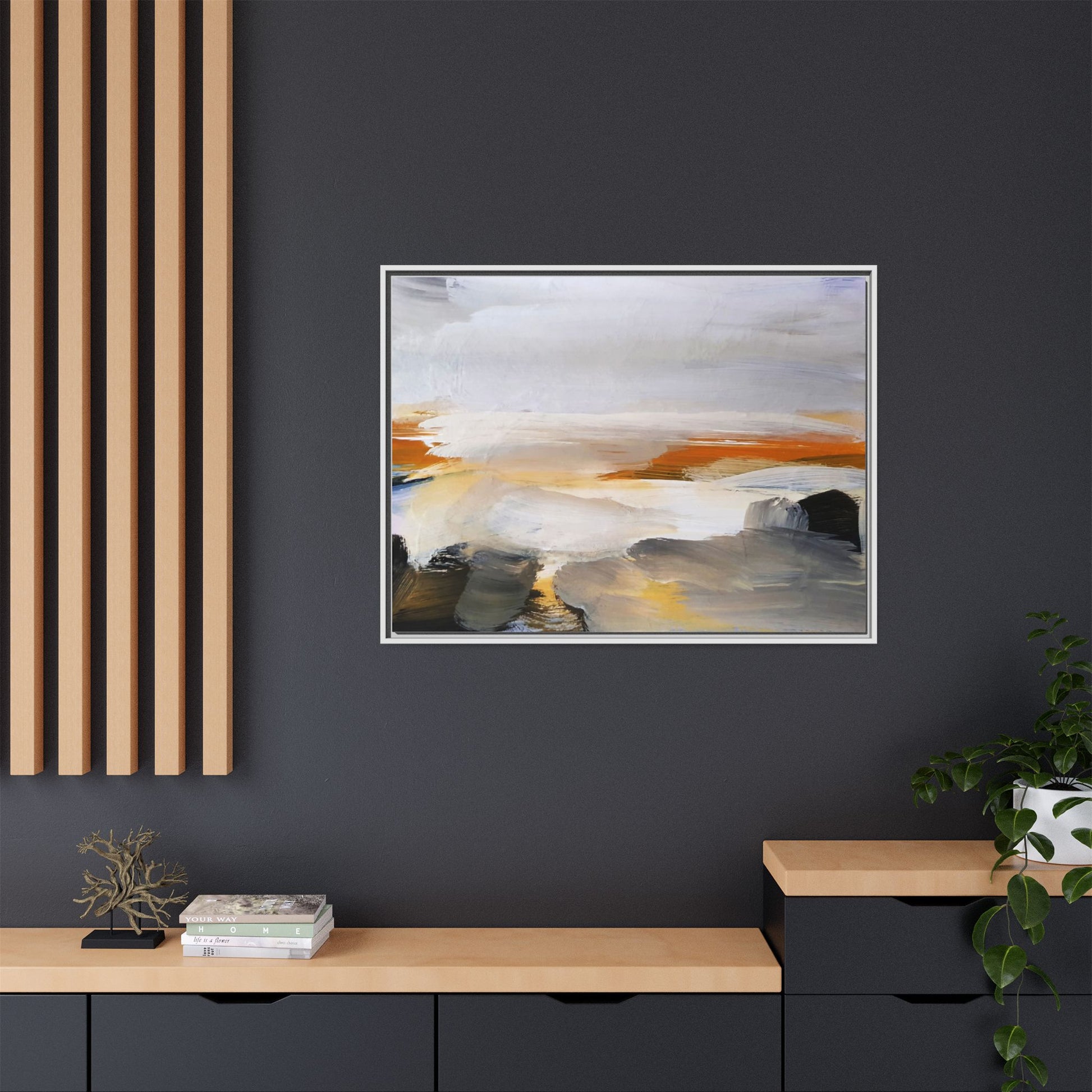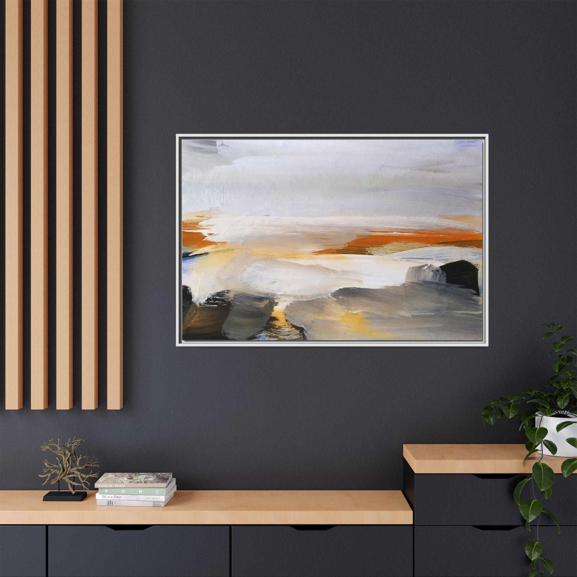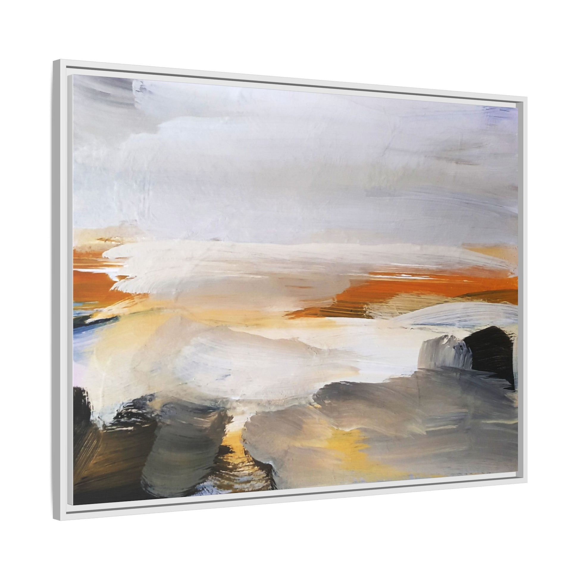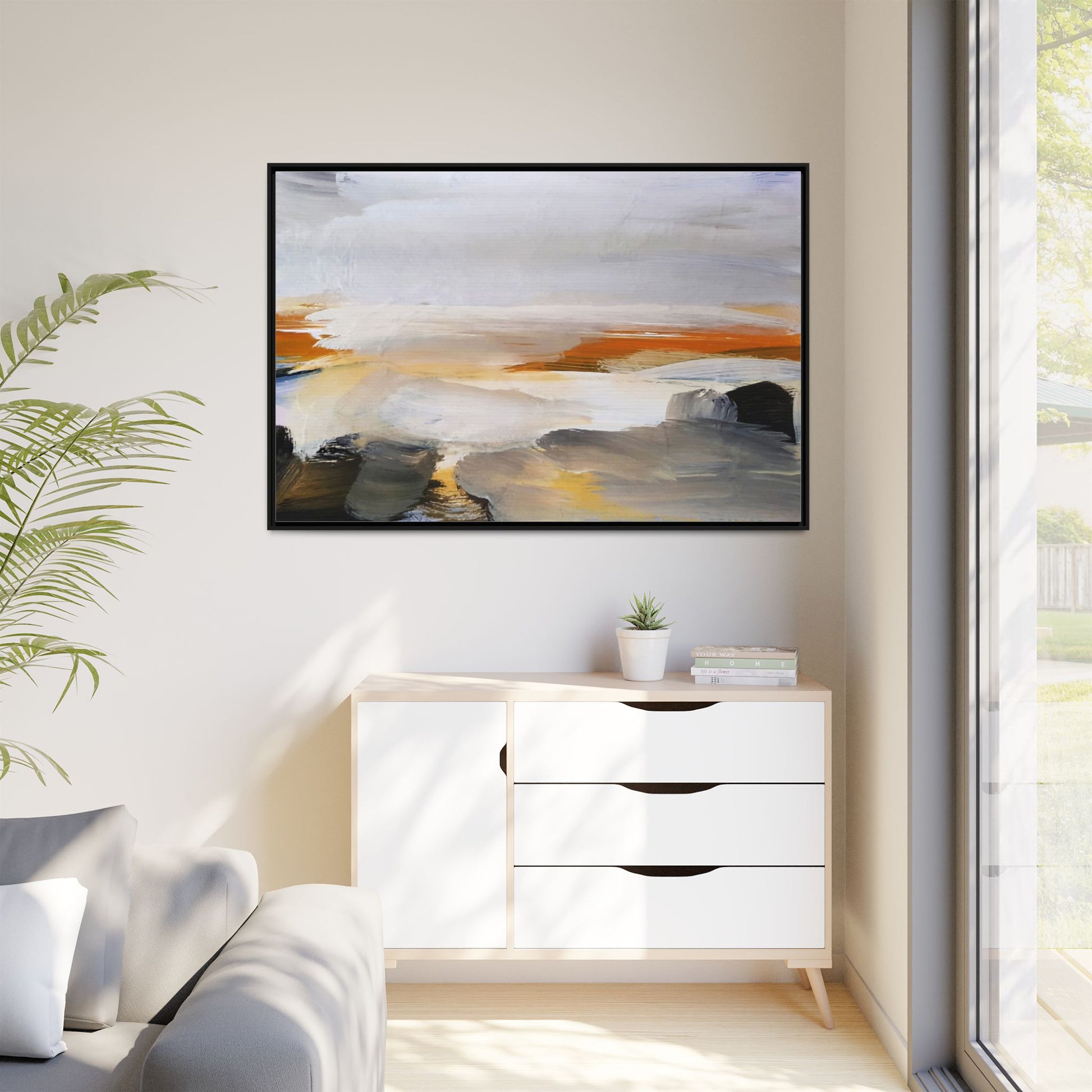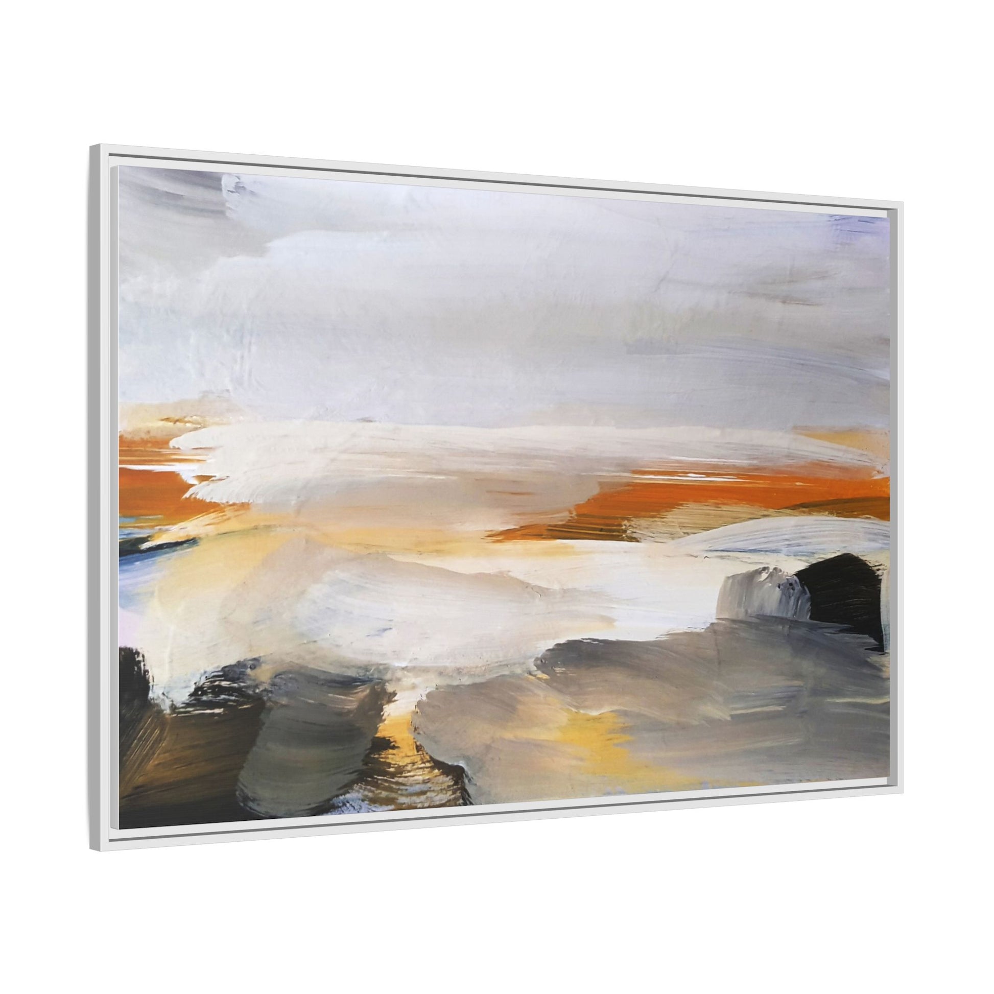 This captivating abstract landscape painting features a dynamic interplay of muted colors and sweeping brushstrokes, creating a sense of expansive depth and movement. The composition is dominated by soft whites, warm oranges, and cool grays that blend seamlessly across the canvas, evoking the atmospheric qualities of a distant horizon or ethereal landscape. Bold, textured brushwork gives the painting a sense of energy and motion, with horizontal streaks suggesting a windswept terrain or a distant seascape. The color palette transitions from bright, golden yellows on the edges to more subdued, silvery whites and grays in the central area, creating a luminous and contemplative mood. The painting's abstract style allows viewers to interpret the scene freely, inviting personal reflection on the interplay of light, space, and natural forms.