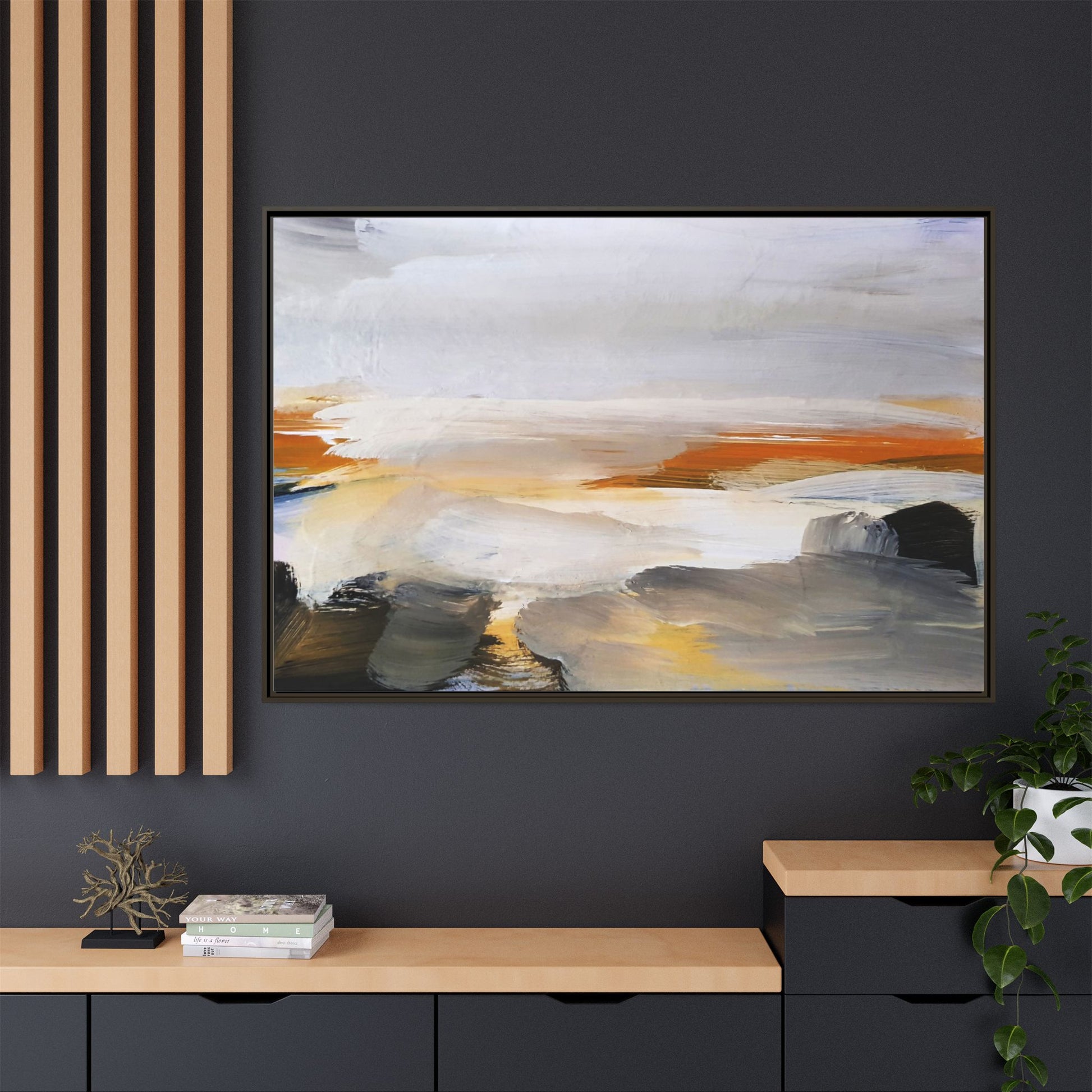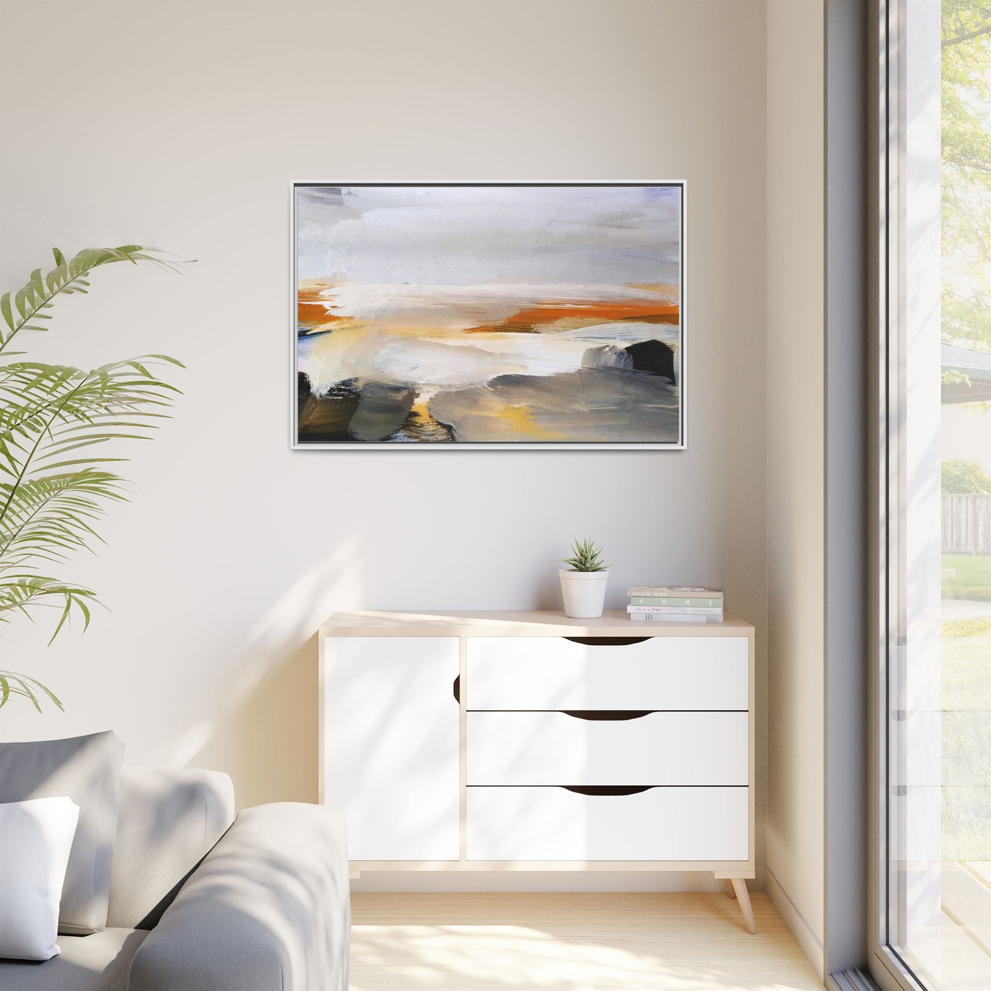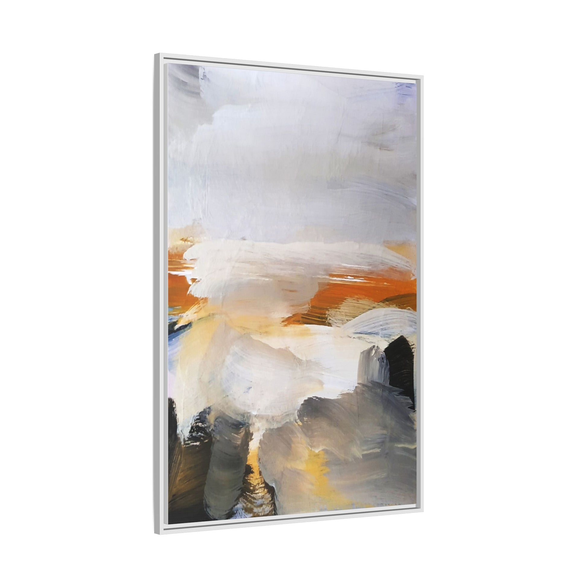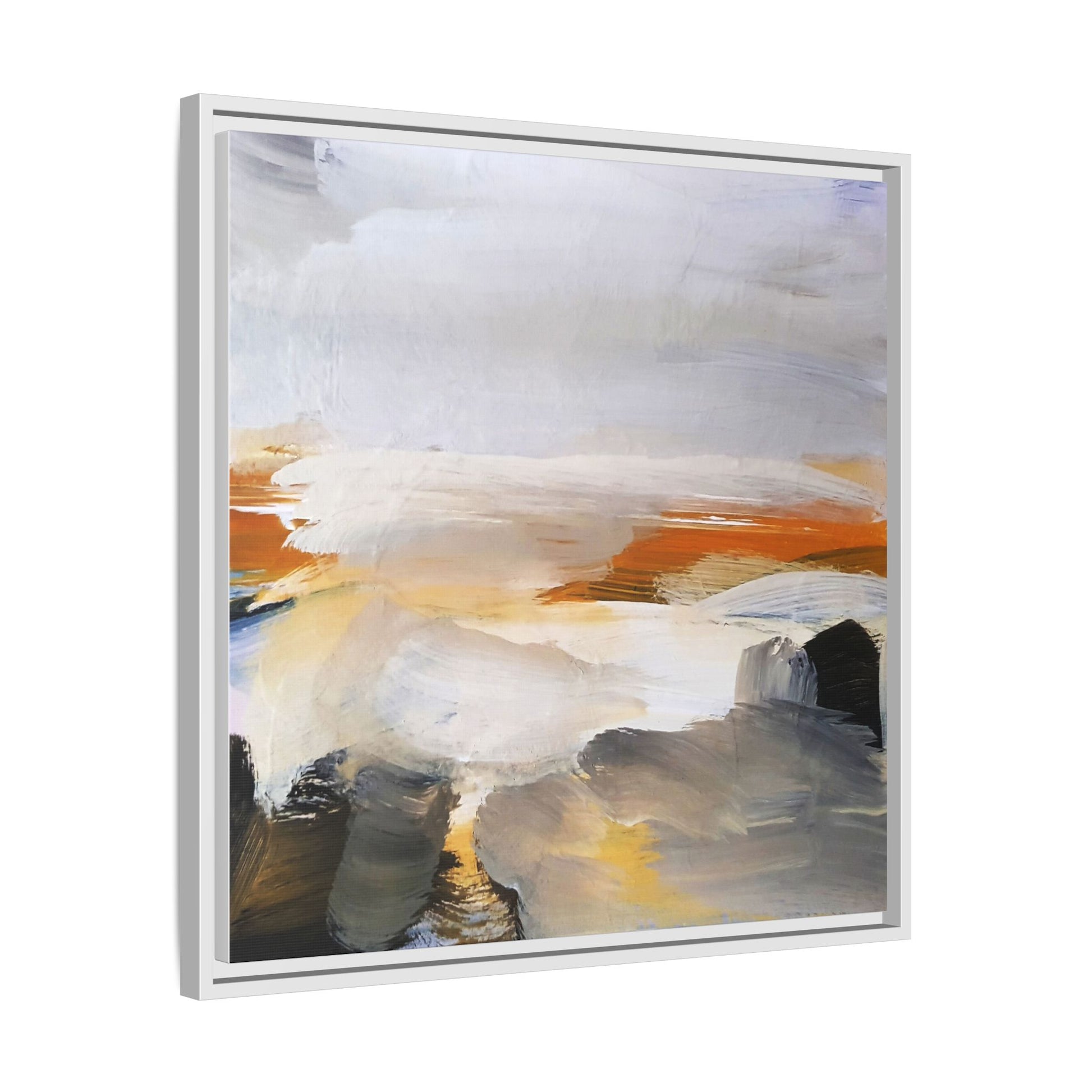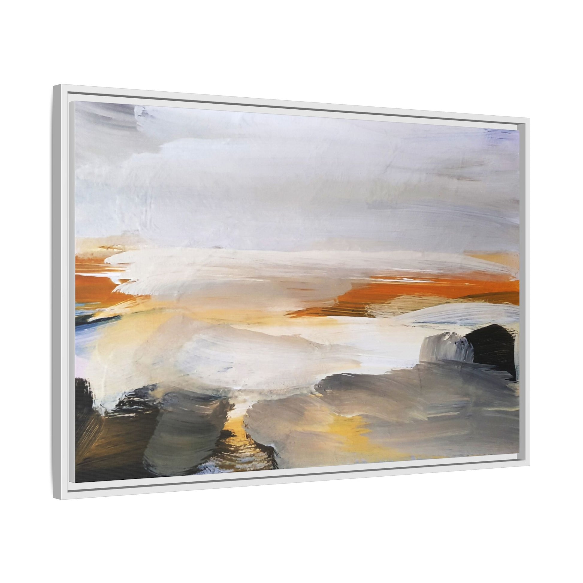 This captivating abstract landscape painting features a dynamic interplay of muted colors and sweeping brushstrokes, creating a sense of expansive depth and movement. The composition is dominated by soft whites, warm oranges, and cool grays that blend seamlessly across the canvas, evoking the atmospheric qualities of a distant horizon or ethereal landscape. Bold, textured brushwork gives the painting a sense of energy and motion, with horizontal streaks suggesting a windswept terrain or a distant seascape. The color palette transitions from bright, golden yellows on the edges to more subdued, silvery whites and grays in the central area, creating a luminous and contemplative mood. The painting's abstract style allows viewers to interpret the scene freely, inviting personal reflection on the interplay of light, space, and natural forms.