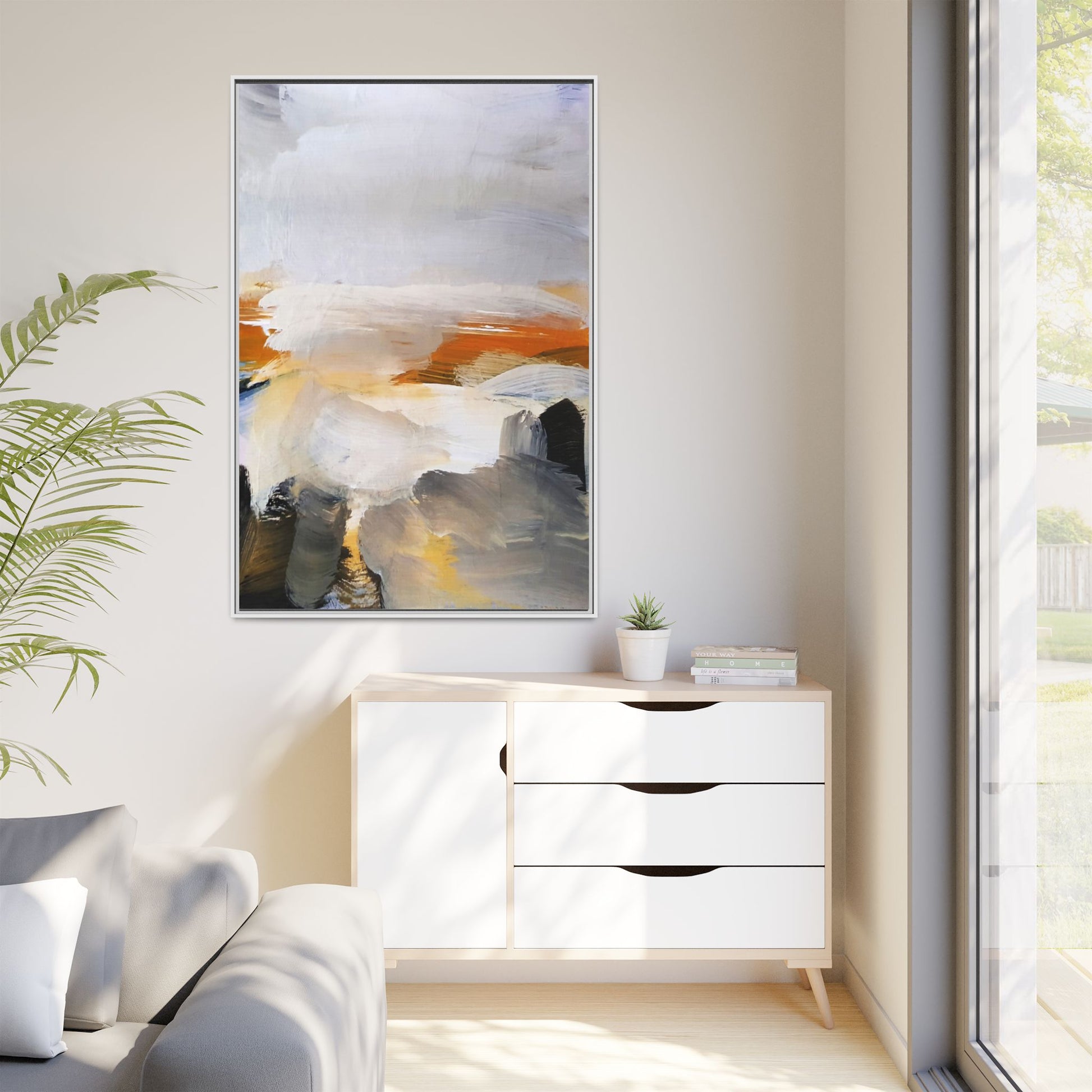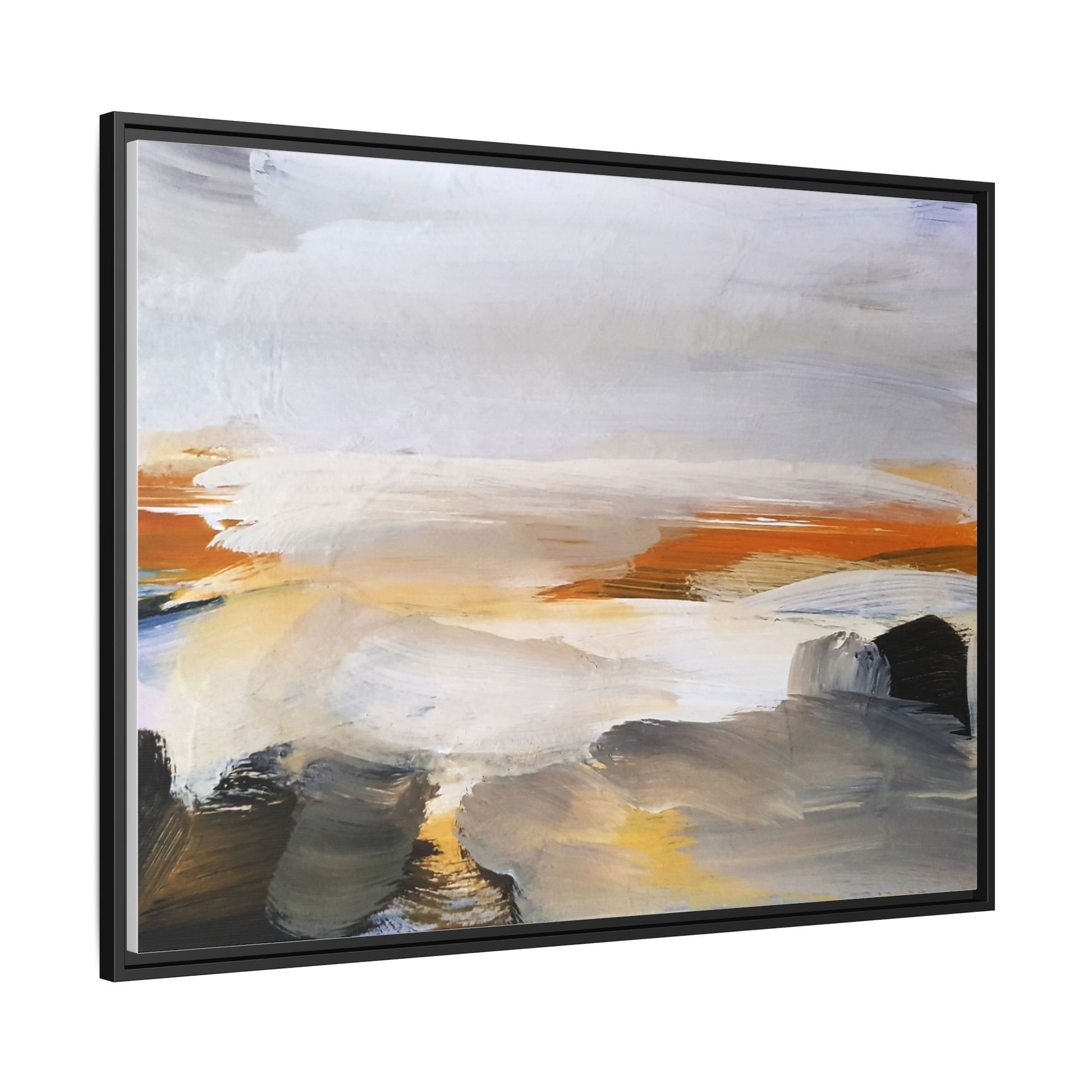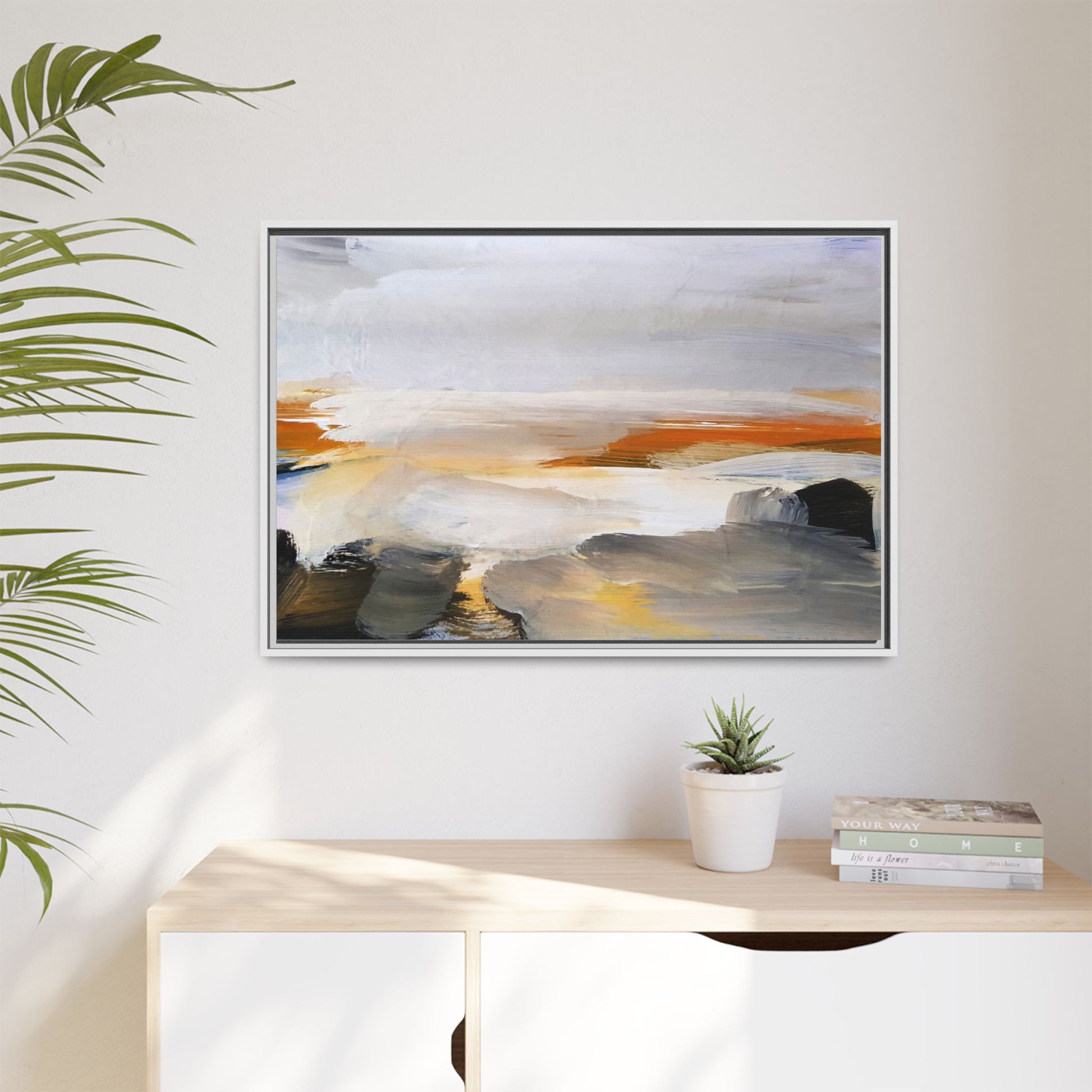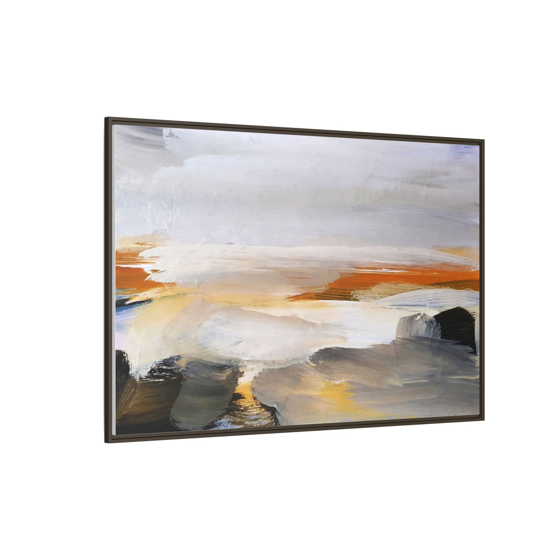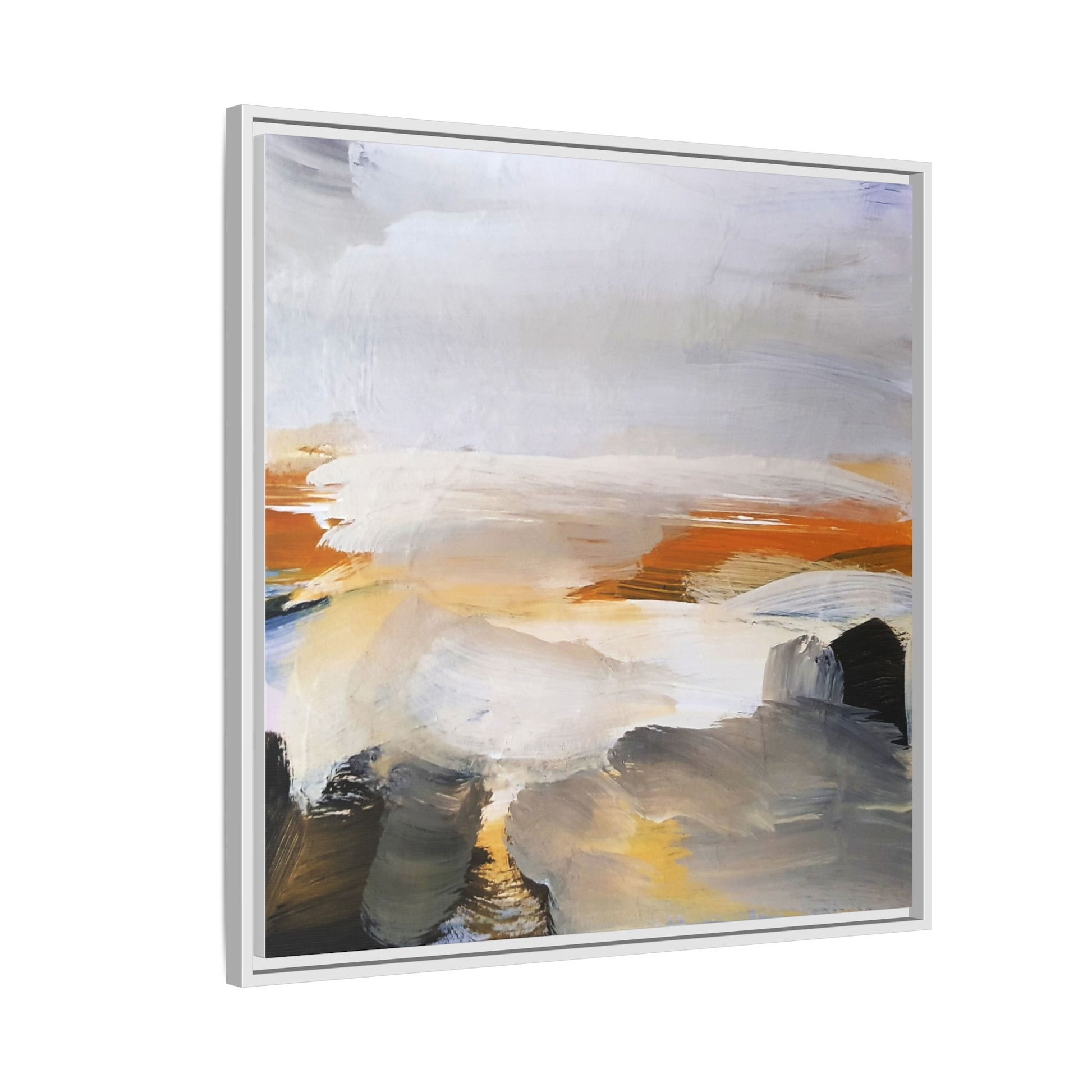 This captivating abstract landscape painting features a dynamic interplay of muted colors and sweeping brushstrokes, creating a sense of expansive depth and movement. The composition is dominated by soft whites, warm oranges, and cool grays that blend seamlessly across the canvas, evoking the atmospheric qualities of a distant horizon or ethereal landscape. Bold, textured brushwork gives the painting a sense of energy and motion, with horizontal streaks suggesting a windswept terrain or a distant seascape. The color palette transitions from bright, golden yellows on the edges to more subdued, silvery whites and grays in the central area, creating a luminous and contemplative mood. The painting's abstract style allows viewers to interpret the scene freely, inviting personal reflection on the interplay of light, space, and natural forms.
