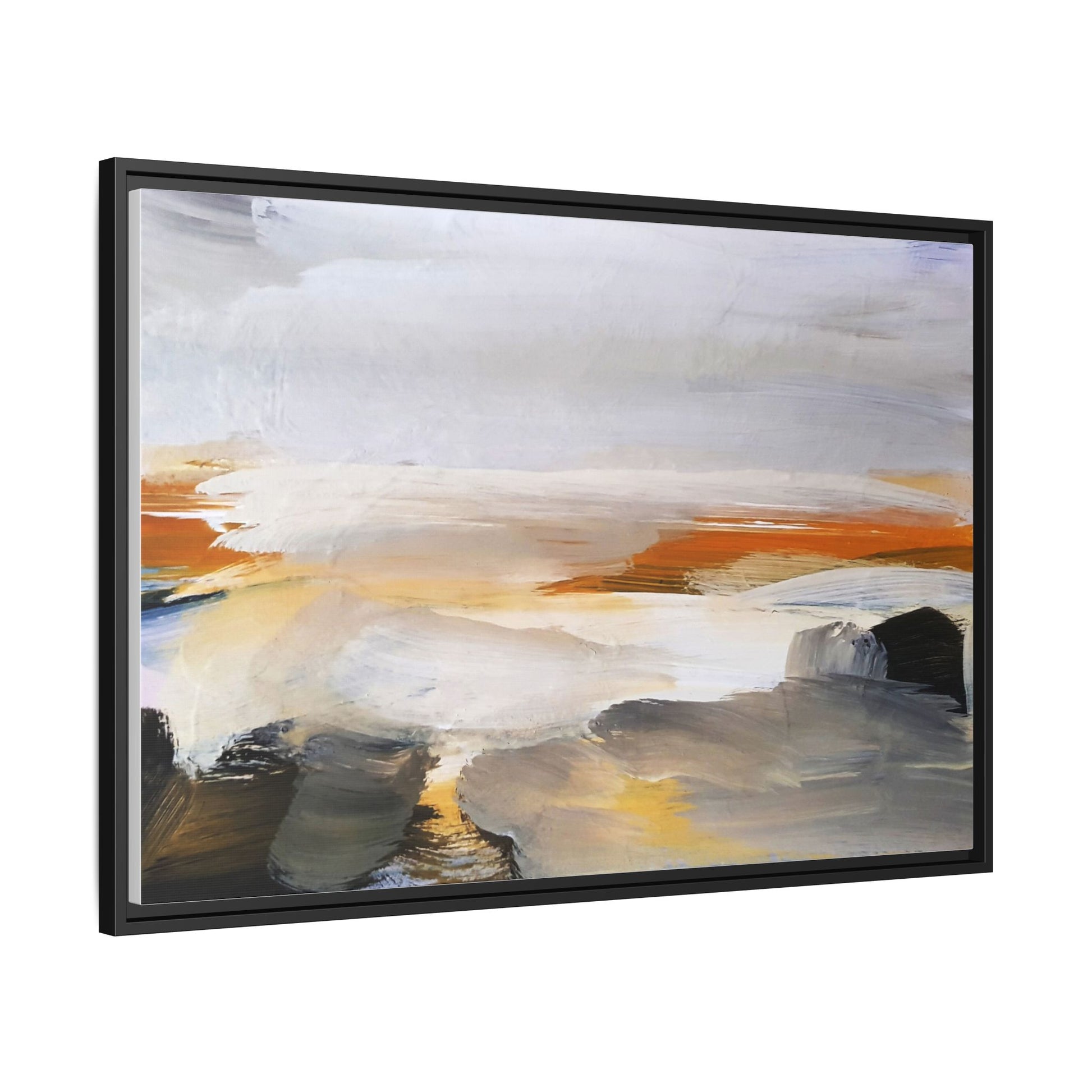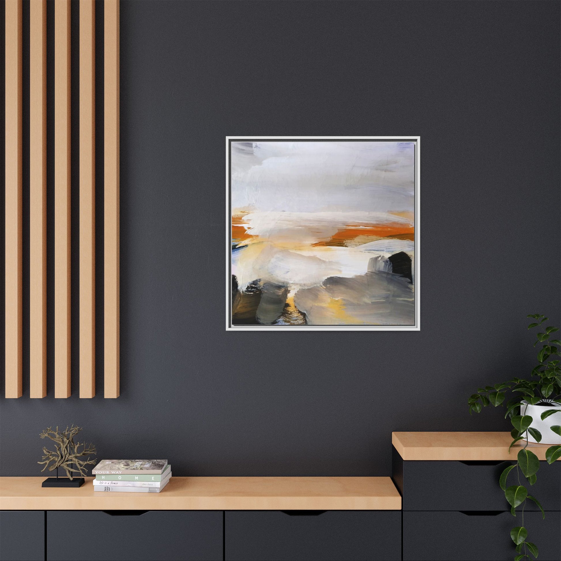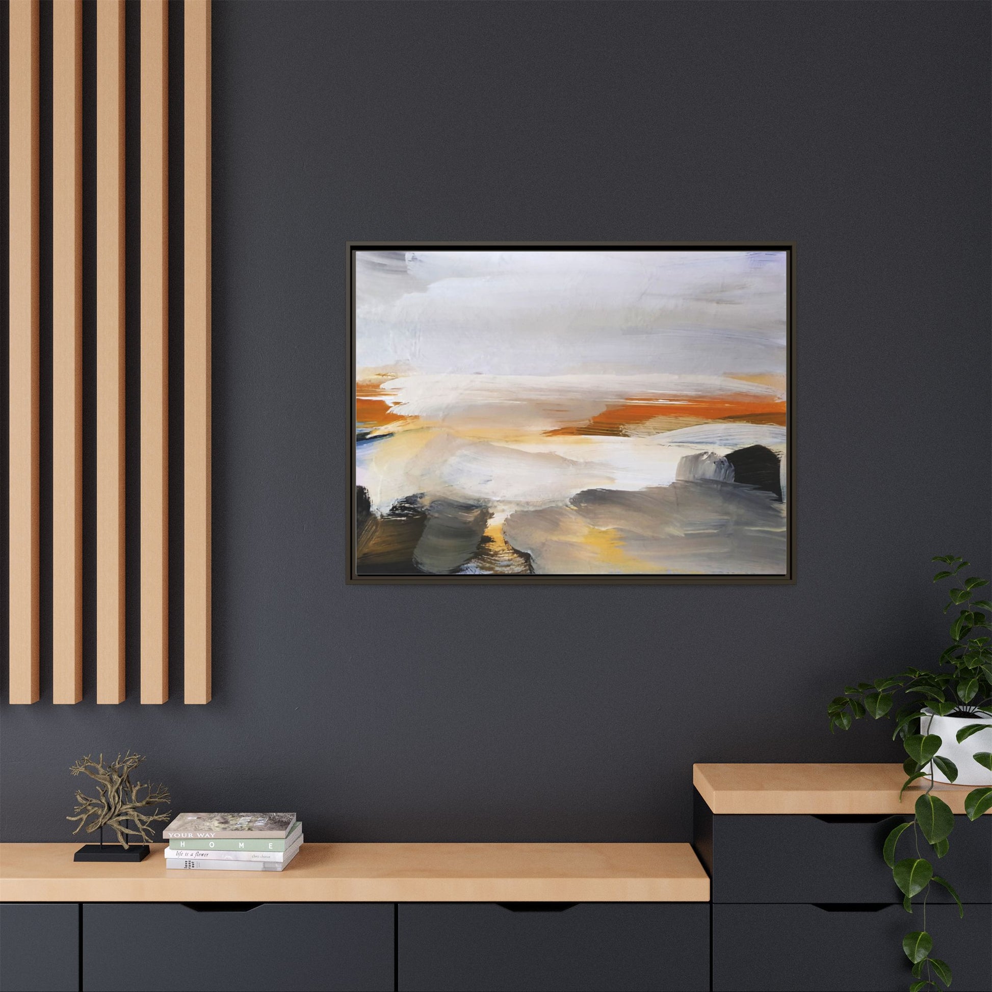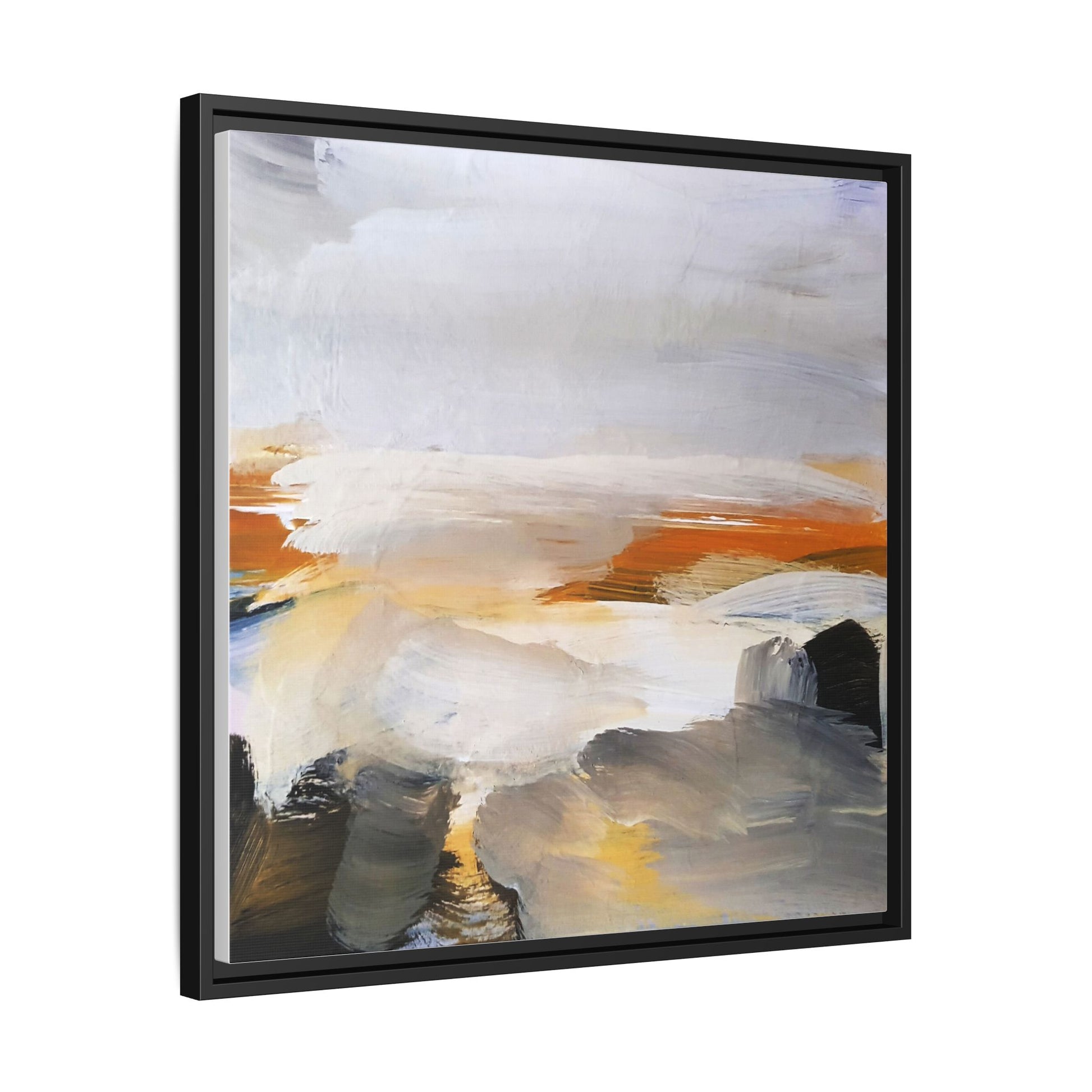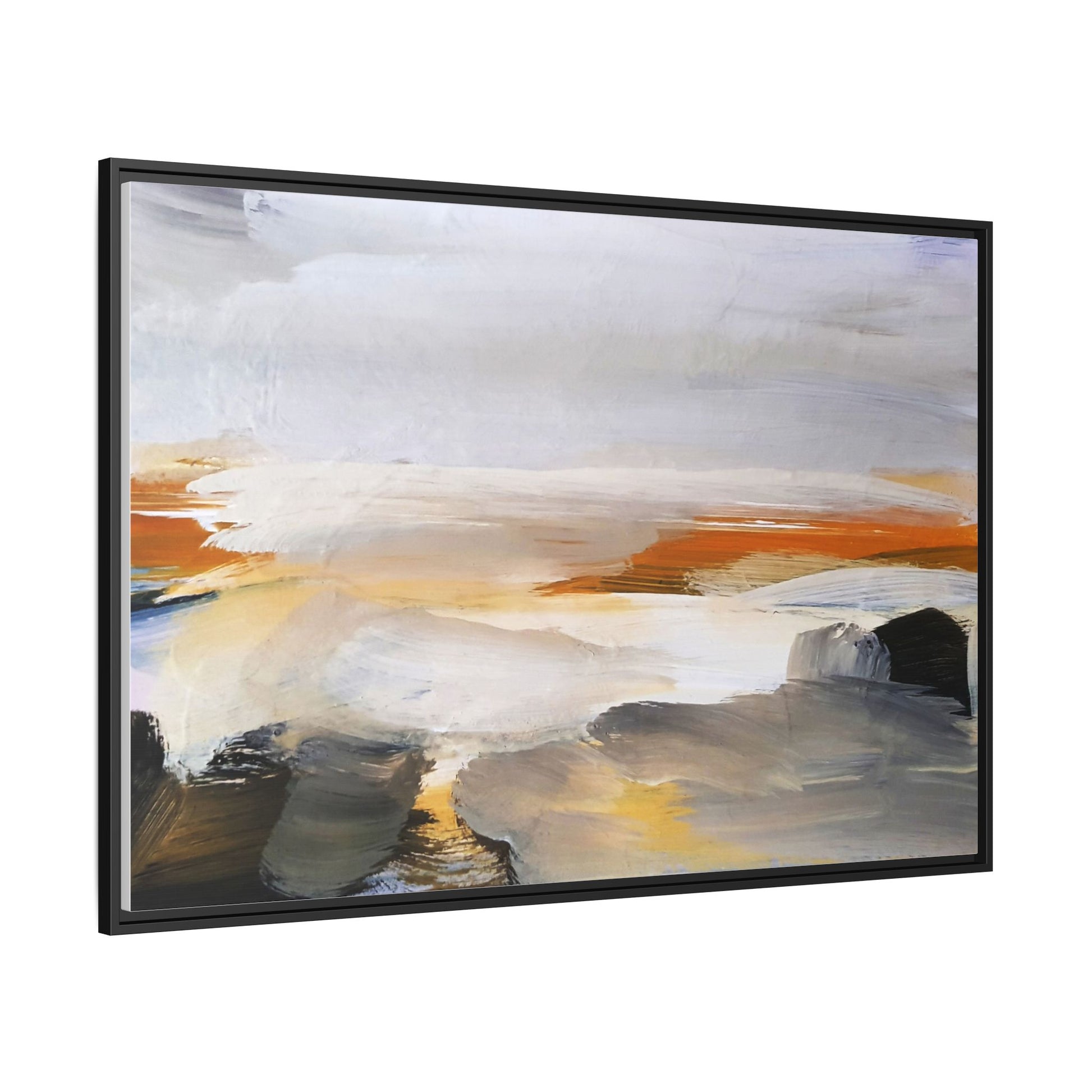 This captivating abstract landscape painting features a dynamic interplay of muted colors and sweeping brushstrokes, creating a sense of expansive depth and movement. The composition is dominated by soft whites, warm oranges, and cool grays that blend seamlessly across the canvas, evoking the atmospheric qualities of a distant horizon or ethereal landscape. Bold, textured brushwork gives the painting a sense of energy and motion, with horizontal streaks suggesting a windswept terrain or a distant seascape. The color palette transitions from bright, golden yellows on the edges to more subdued, silvery whites and grays in the central area, creating a luminous and contemplative mood. The painting's abstract style allows viewers to interpret the scene freely, inviting personal reflection on the interplay of light, space, and natural forms.
